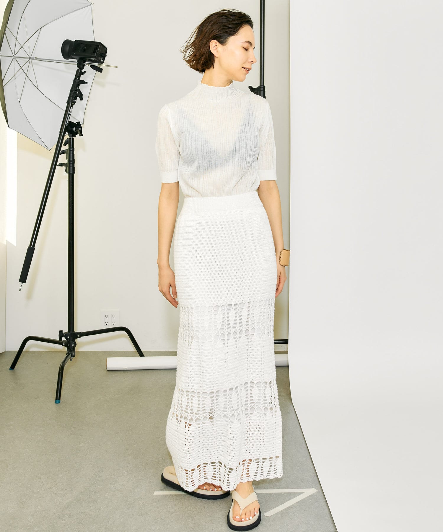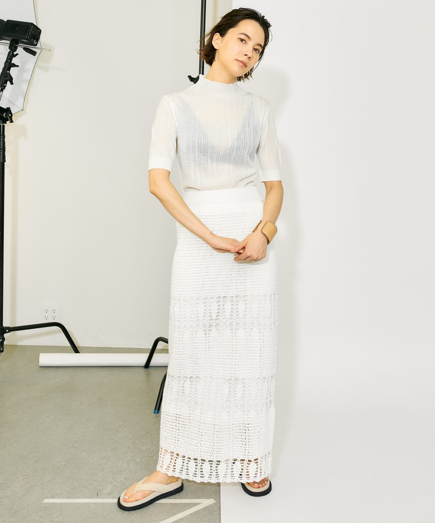 ■程よい透け感が上品なハーフスリーブニットプルオーバー。