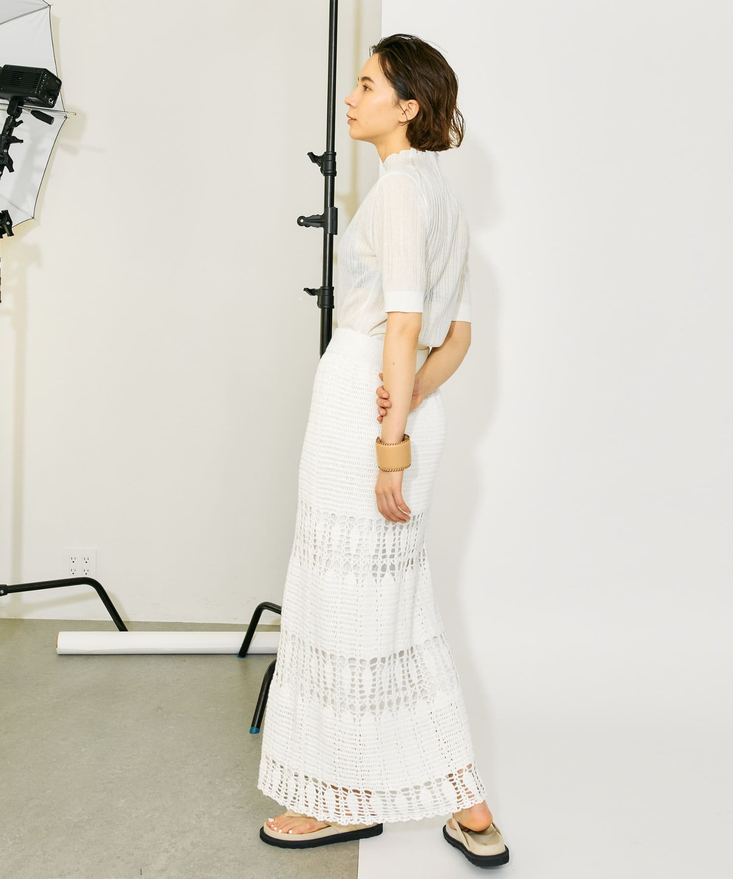 暑いシーズンにもストレスフリーな着心地を楽しめる、ドライなタッチがうれしい薄手のニット素材。