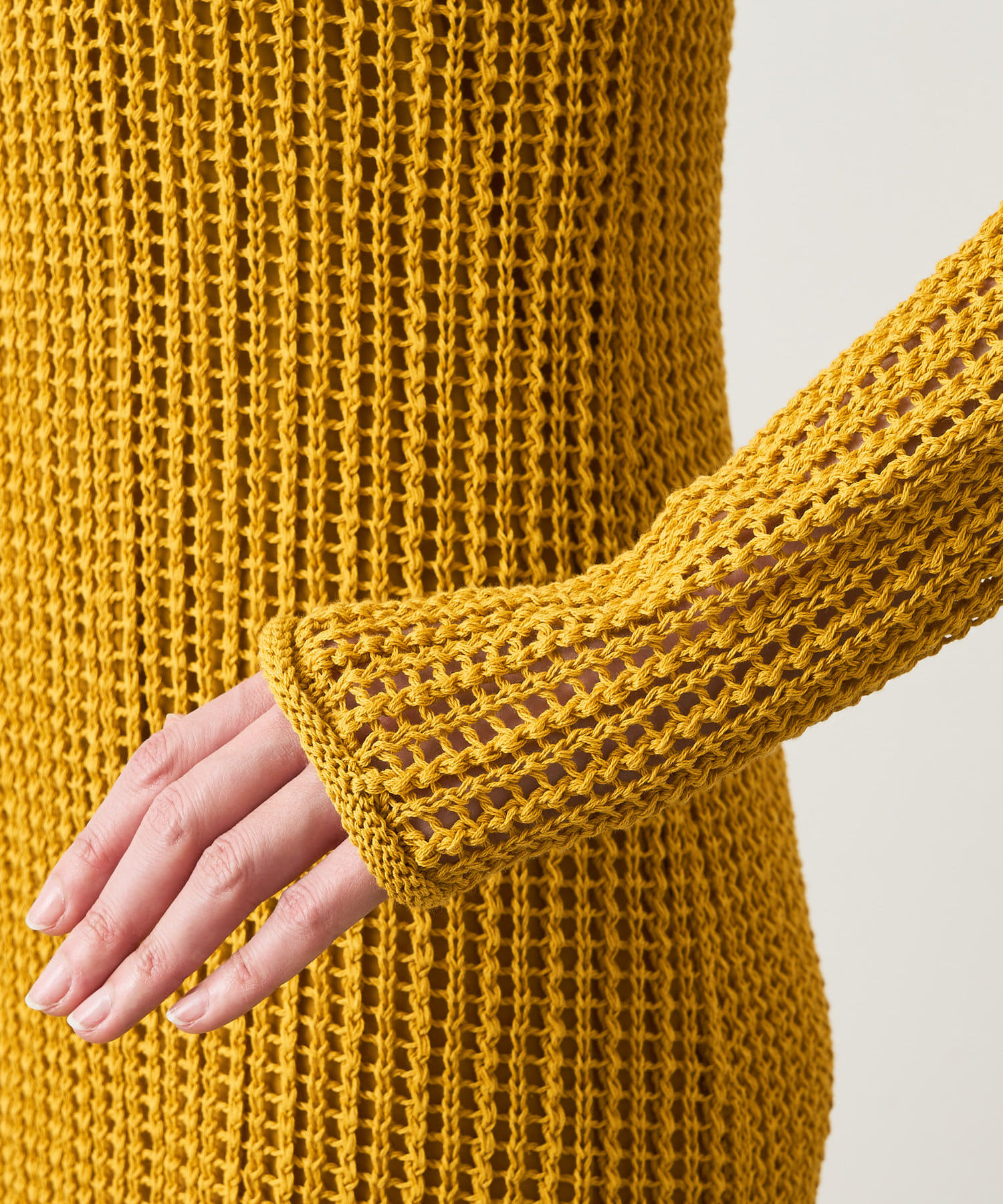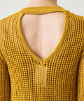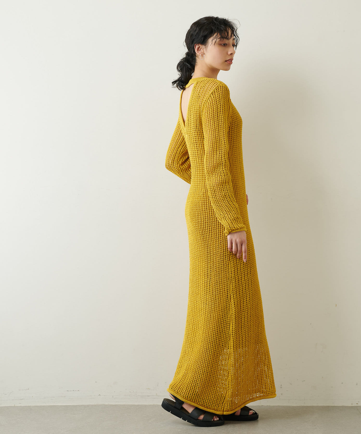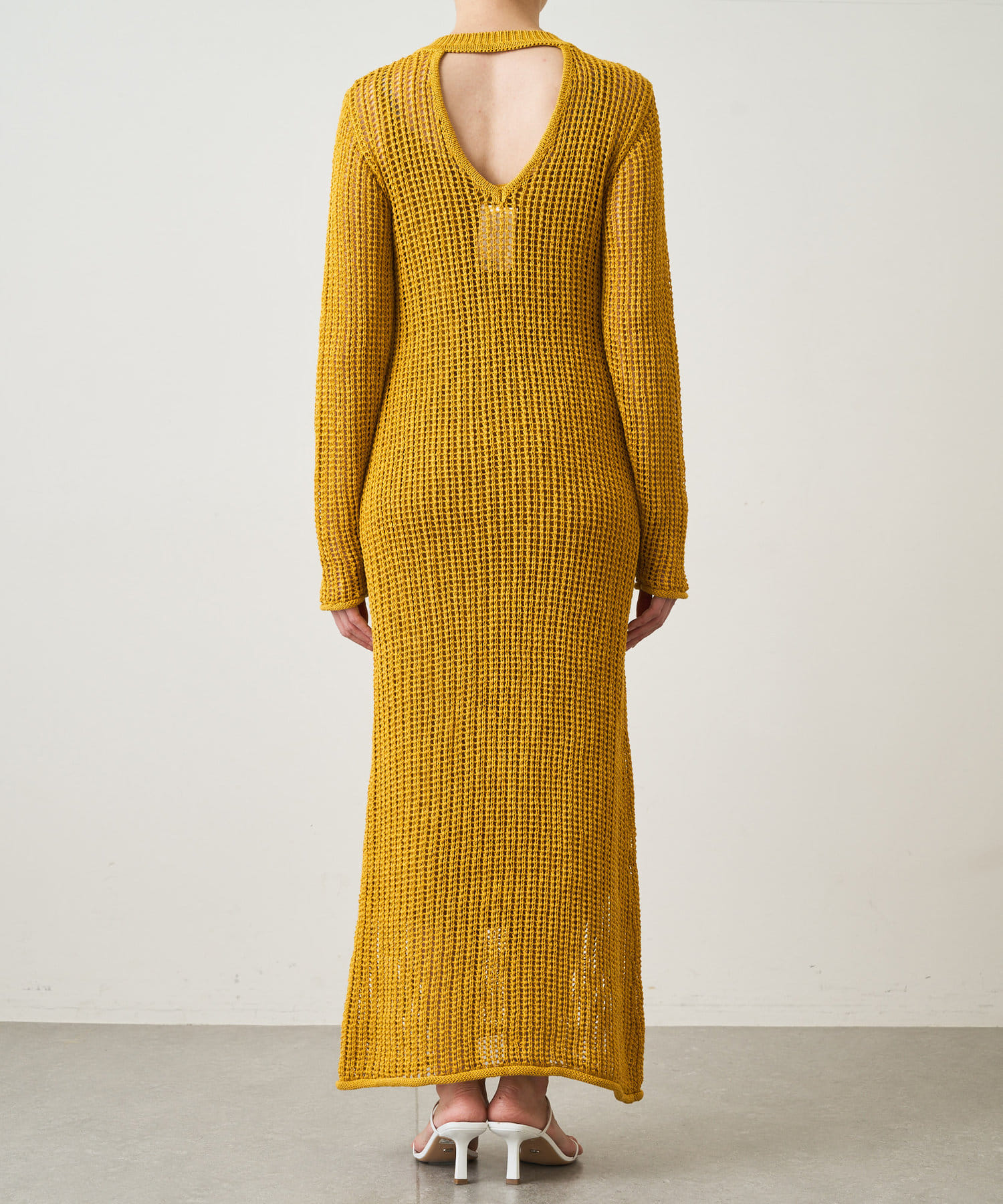 ■メッシュ編みの上品な透け感とバックスタイルのネック開きがヘルシーな印象。