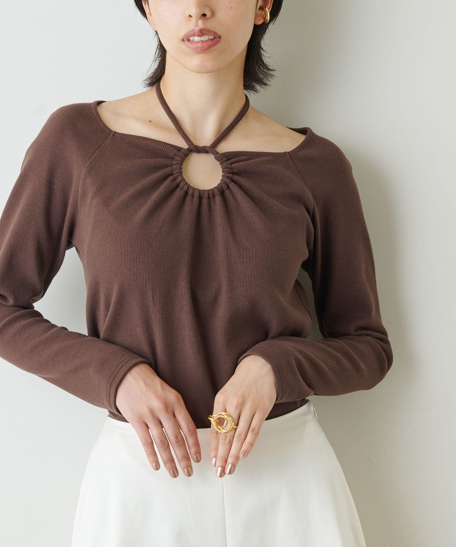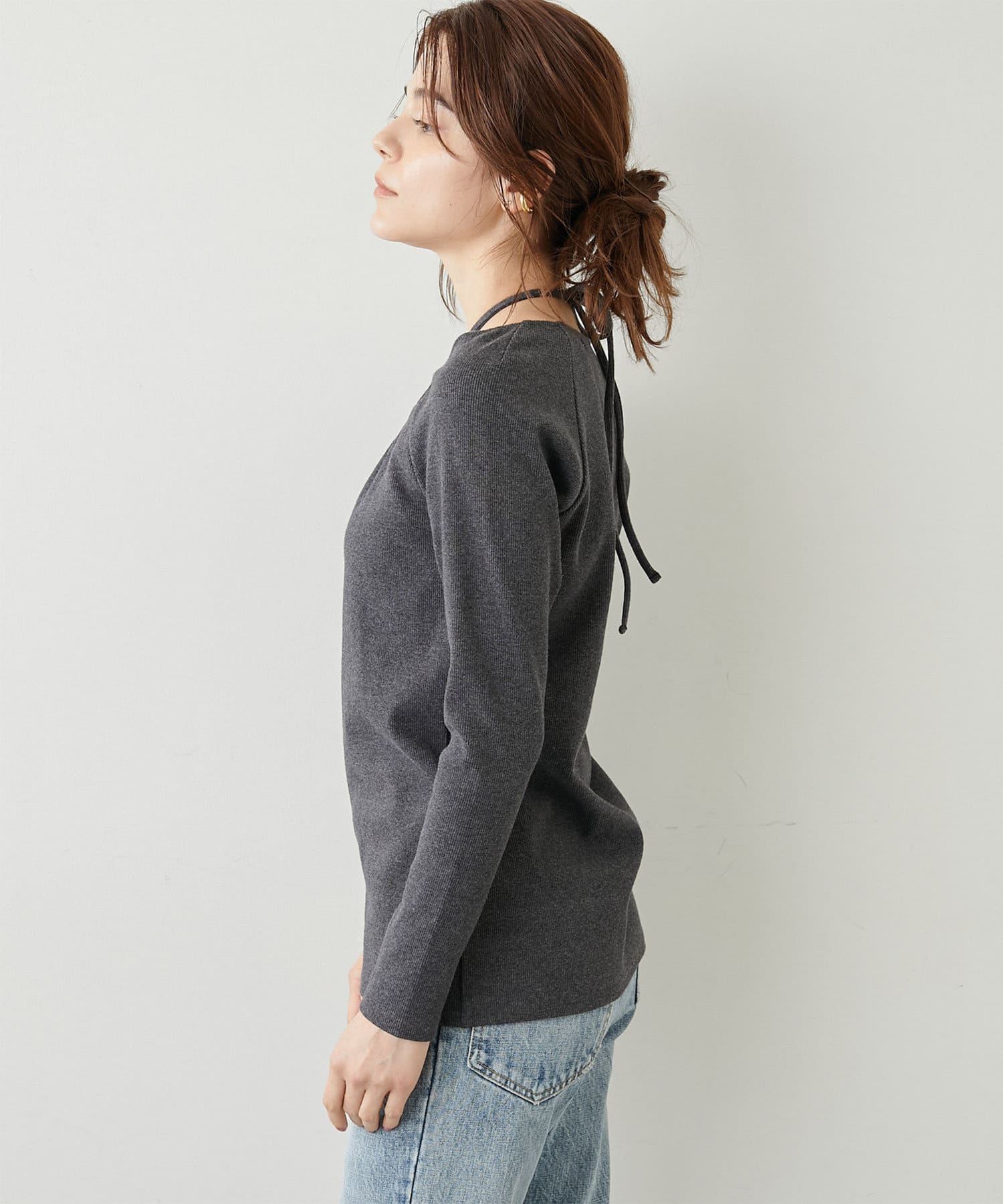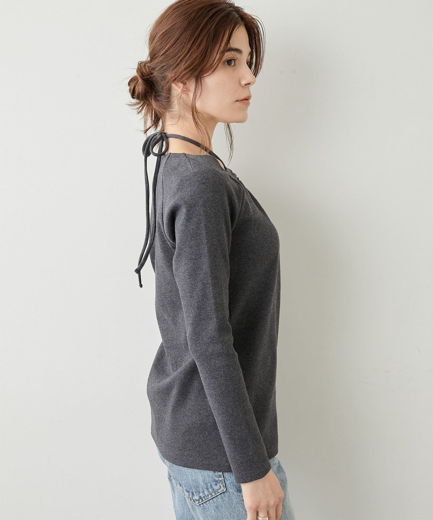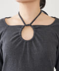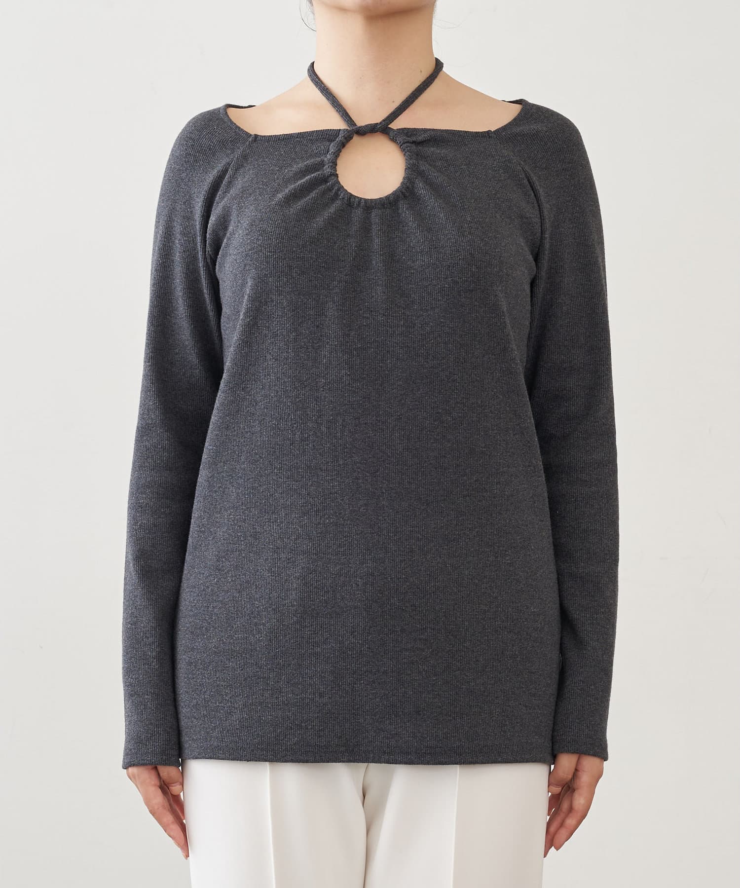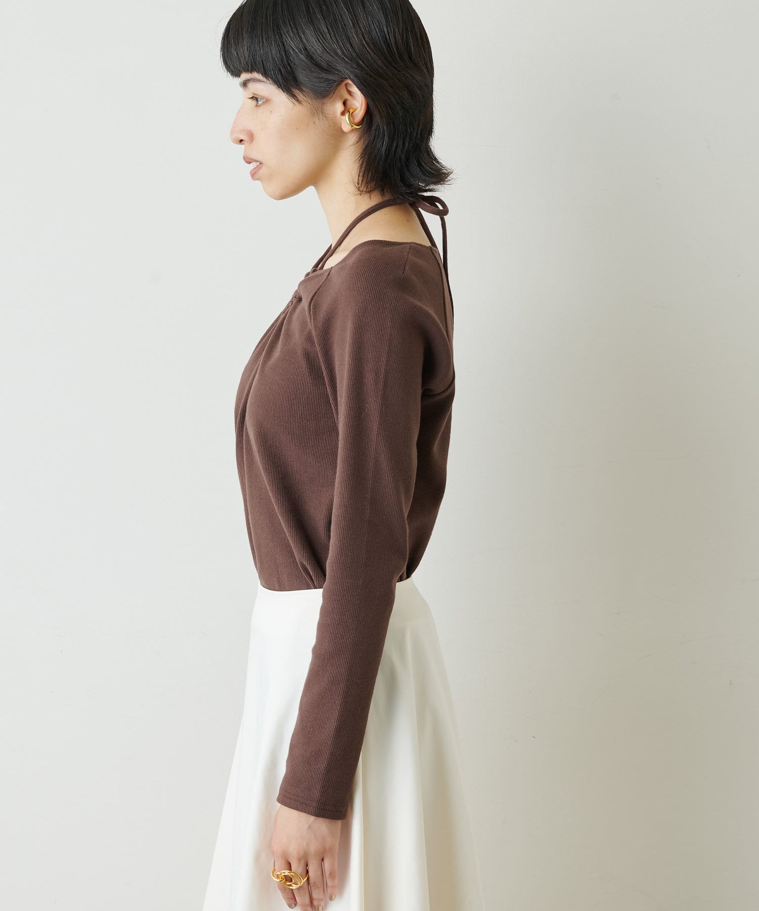 ■ホルターネックを楽しめる紐の付いたデザインカットソー。