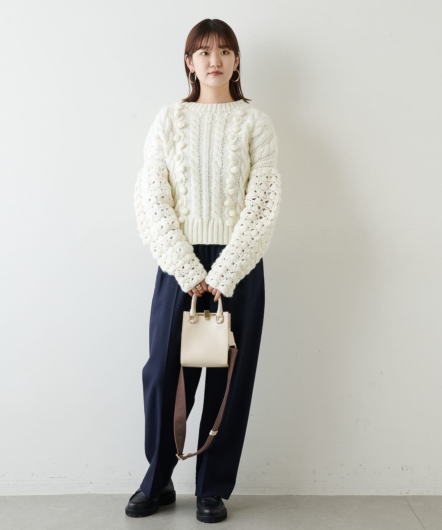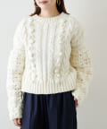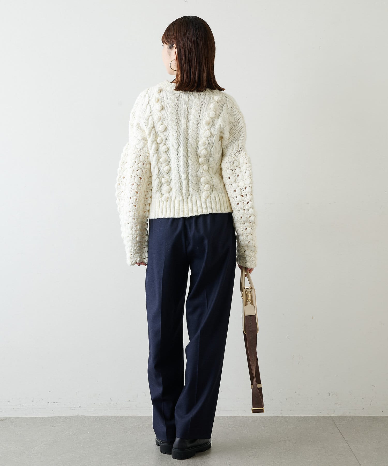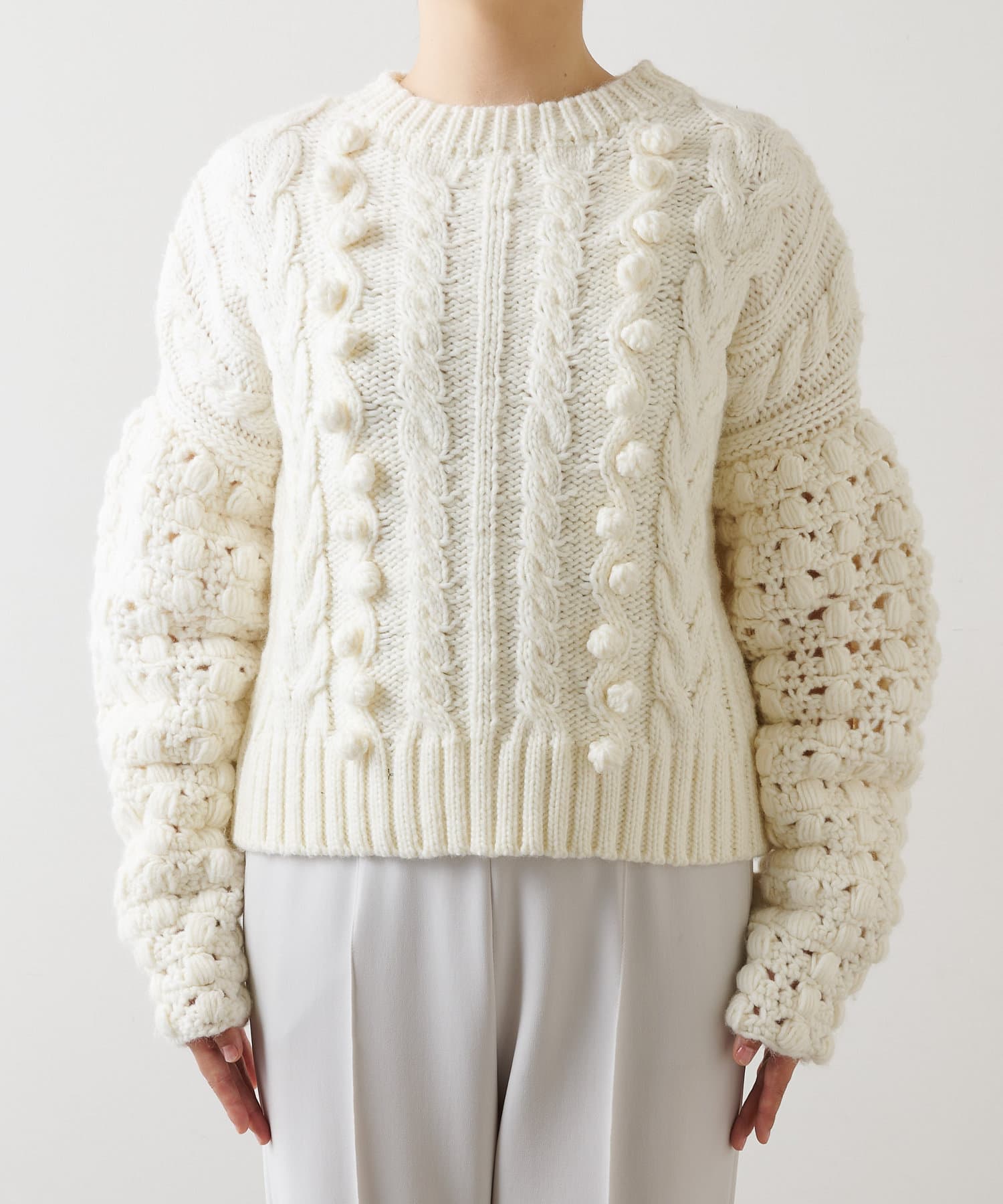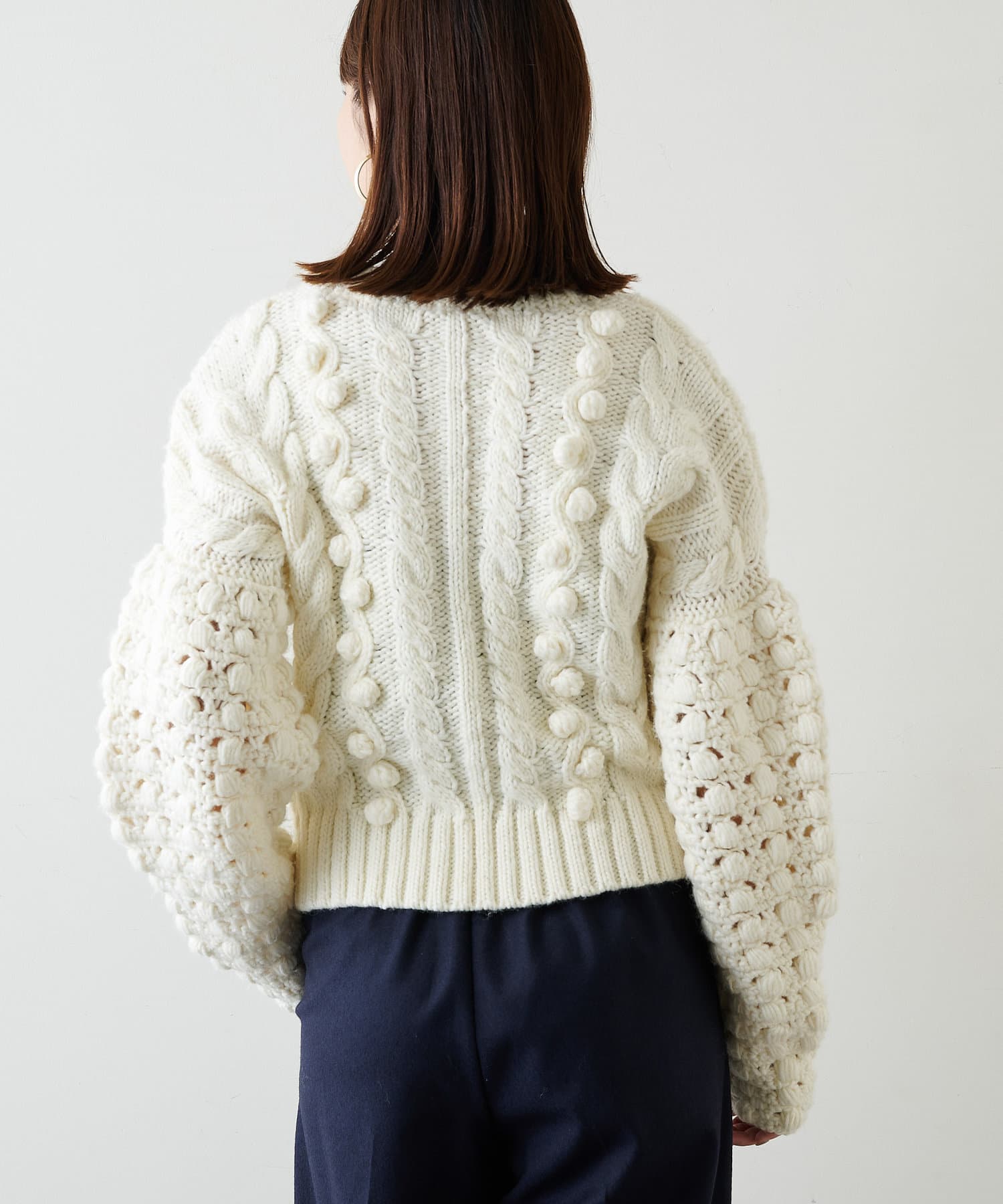 ■ボリュームたっぷりの袖シルエットと立体的なケーブルが目を惹くハンドニット。