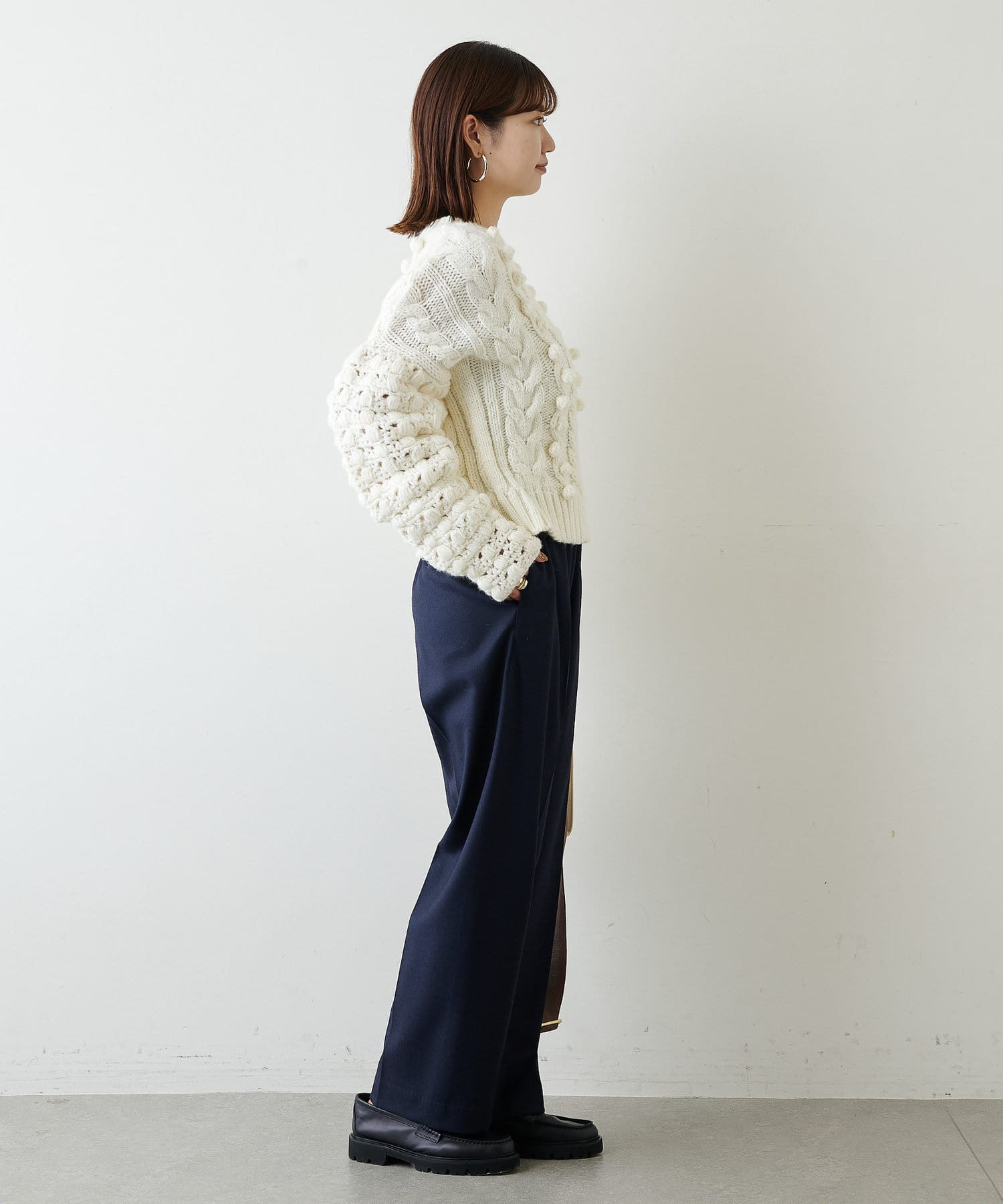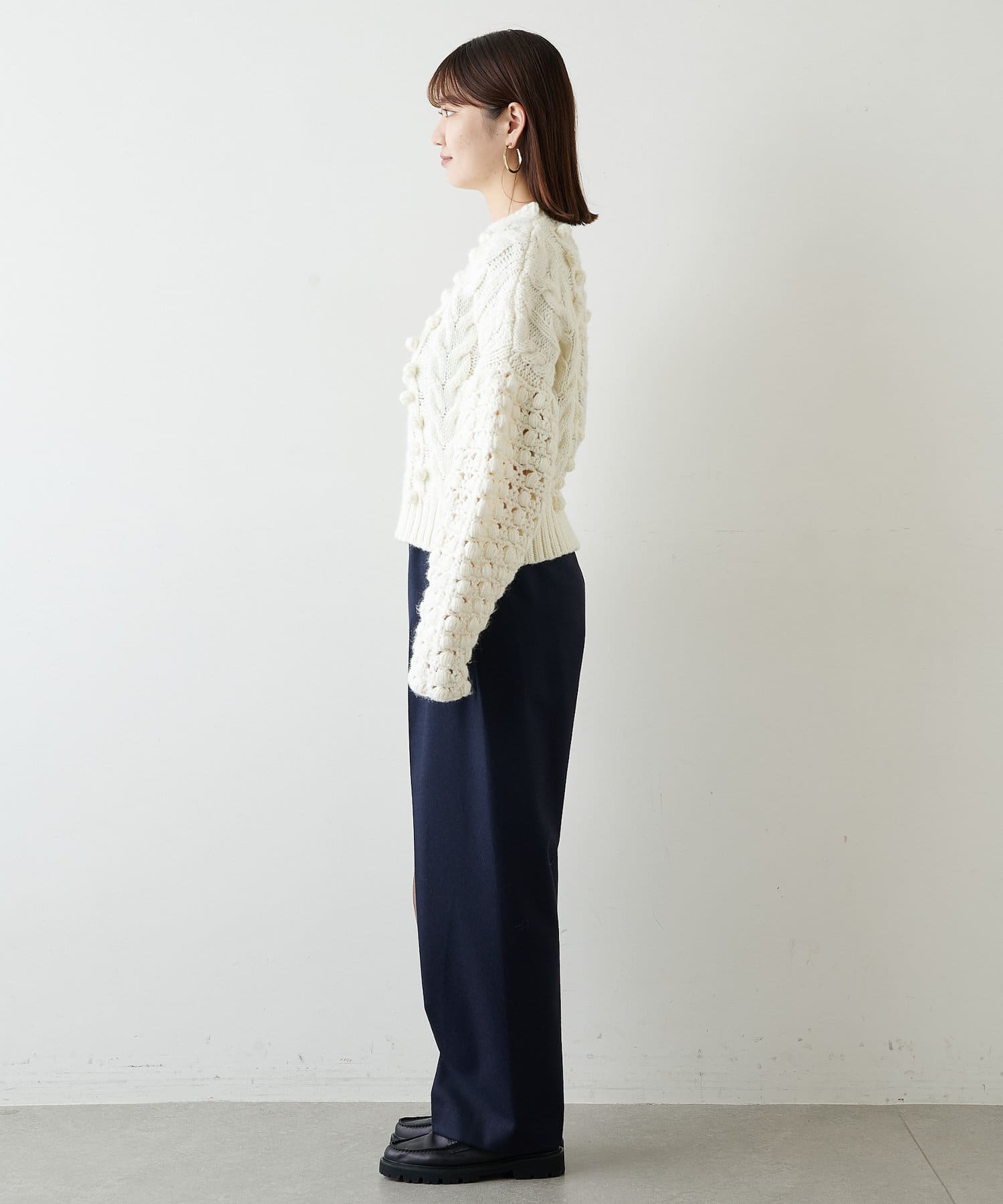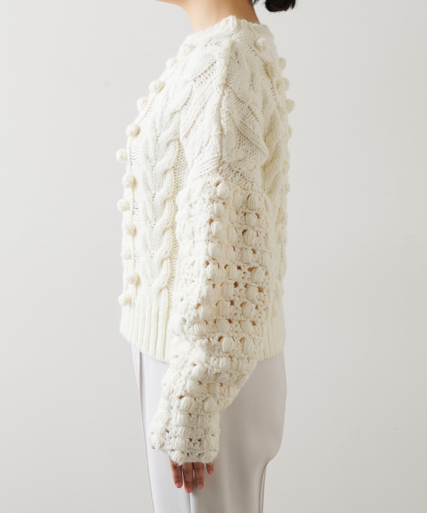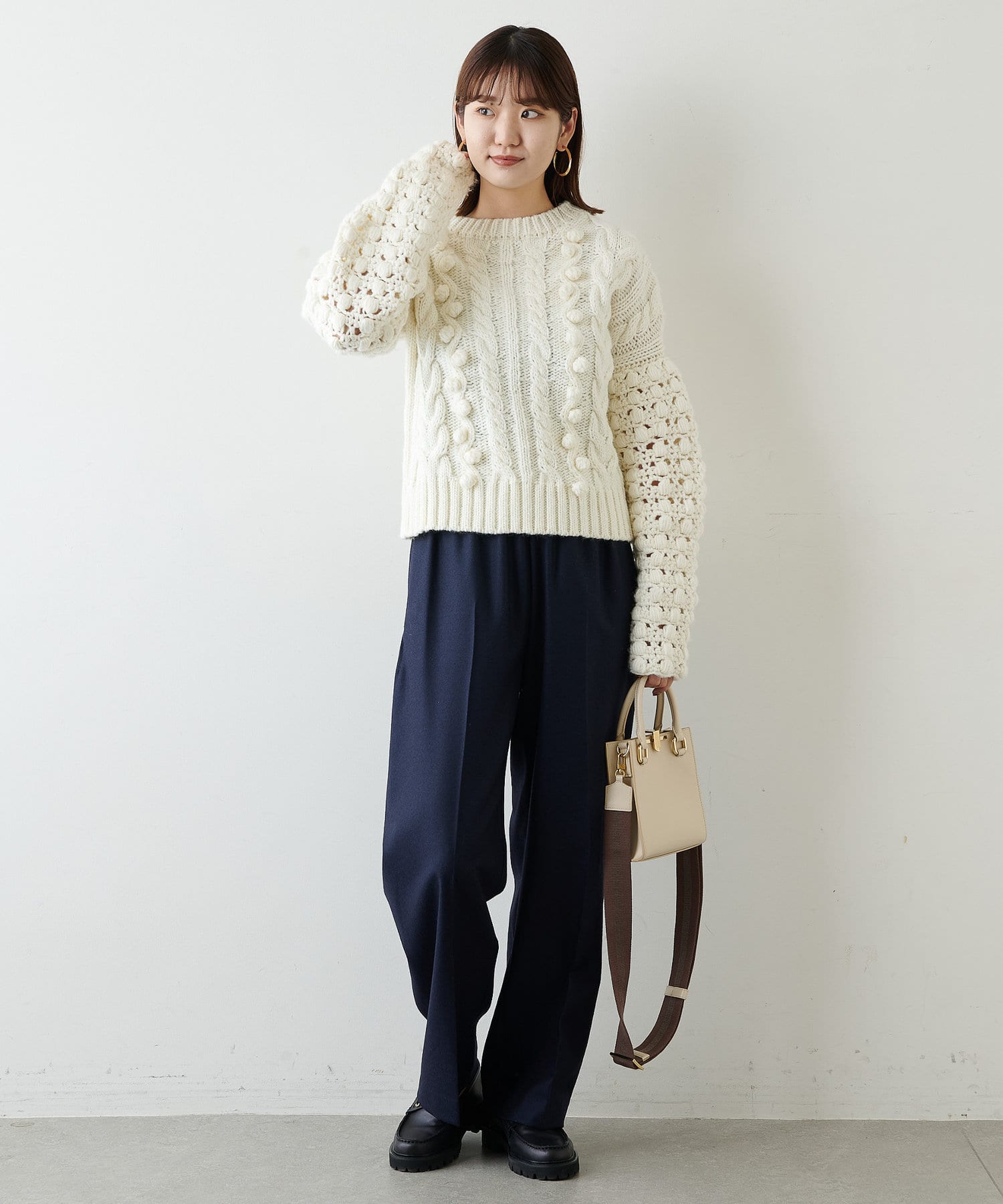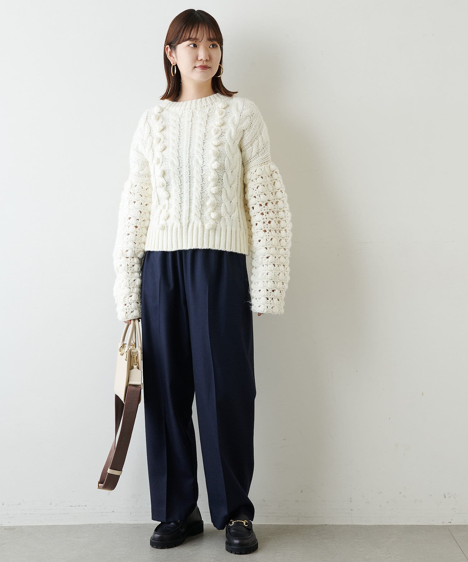 ■ボリュームたっぷりの袖シルエットと立体的なケーブルが目を惹くハンドニット。