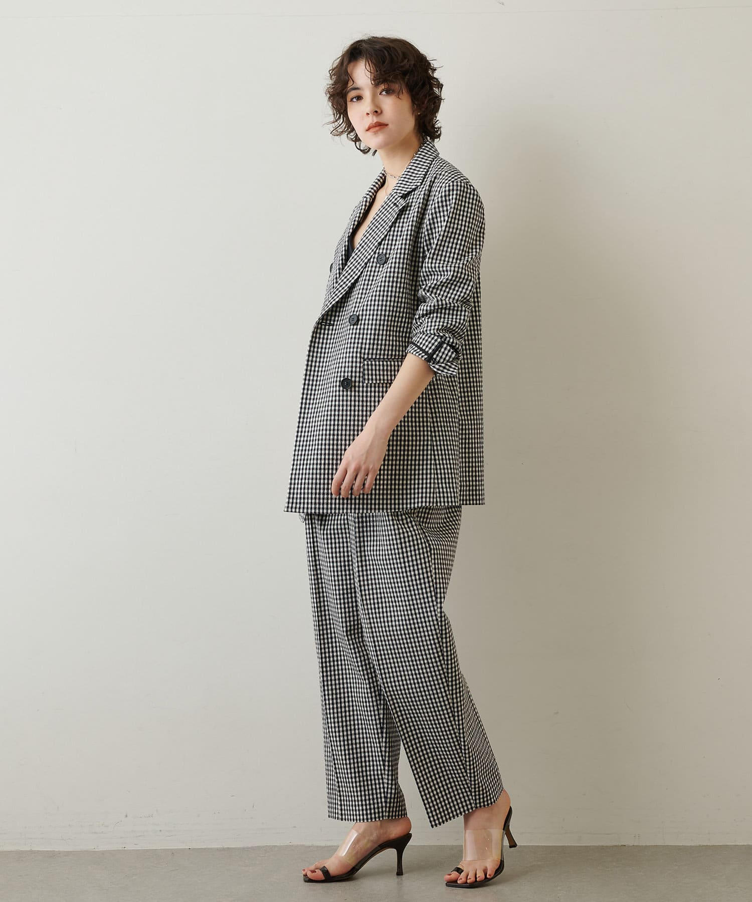 ■同素材のギンガムチェックダブルジャケット(ブランド品番:WGZ1031207A0006)とセットアップで楽しむのもおすすめ。