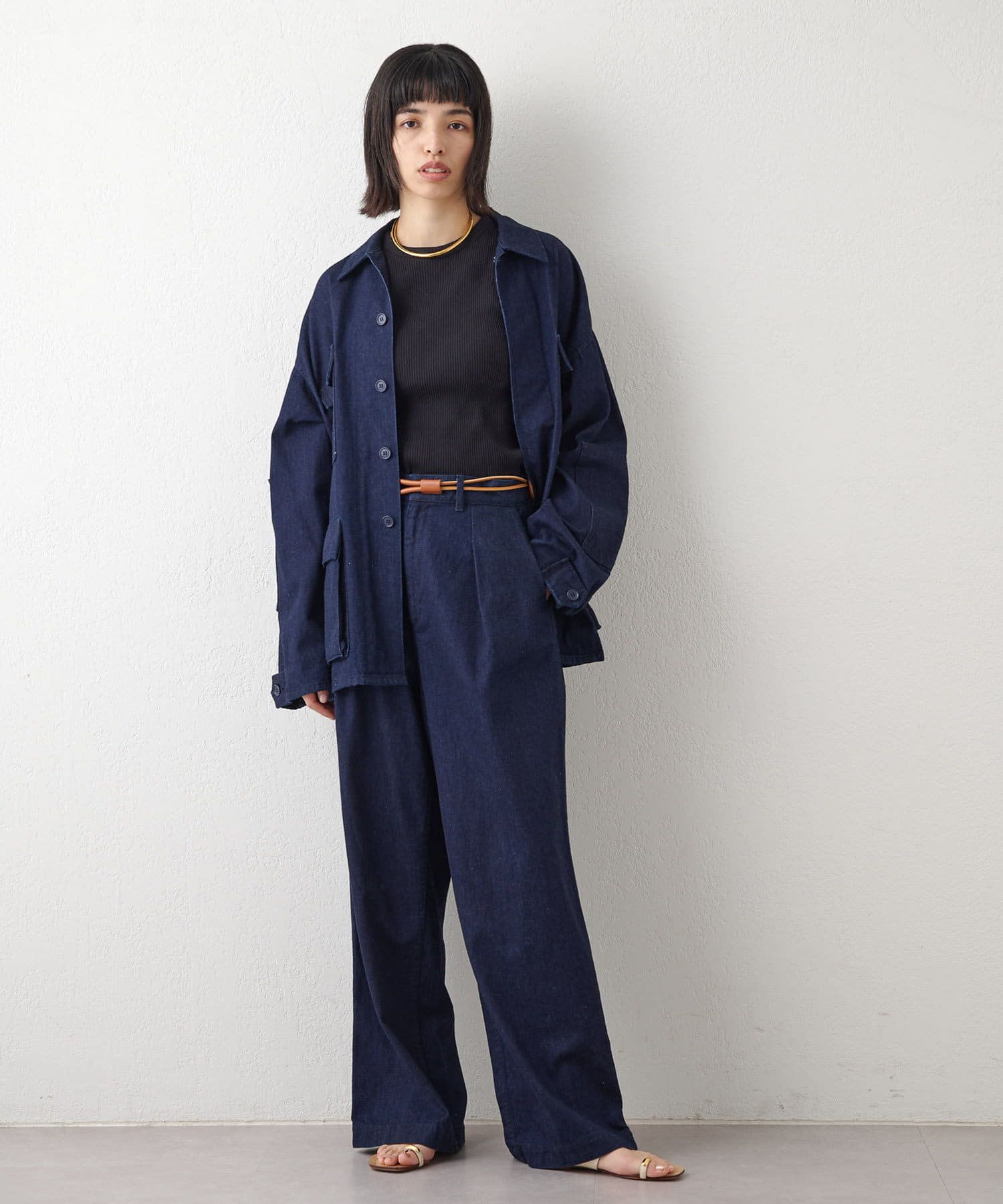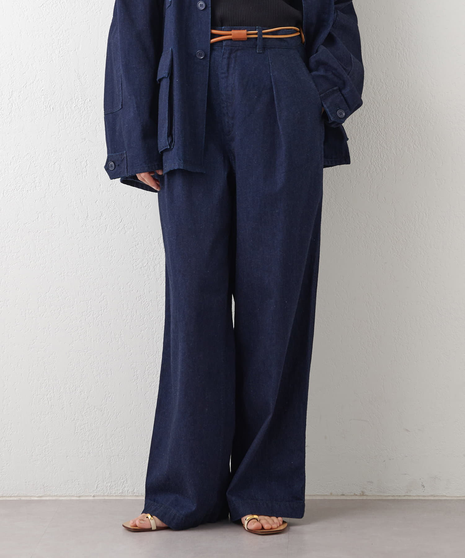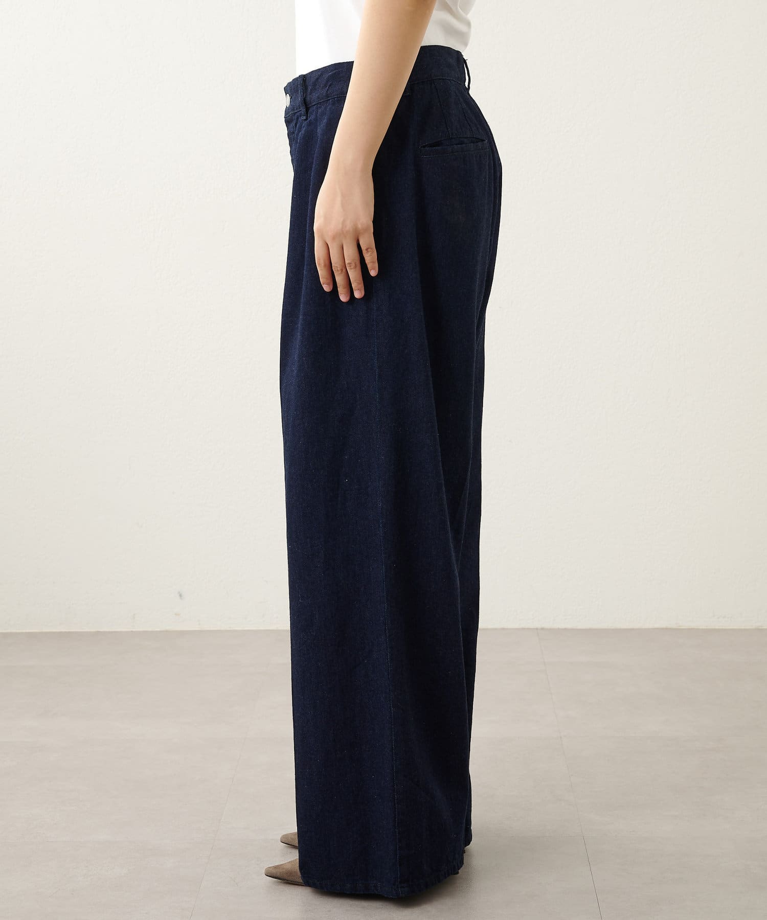 ■ウエストから裾にかけてきれいなワイドストレートに仕上げ、足が長く見えるよう股上を細かく調整。