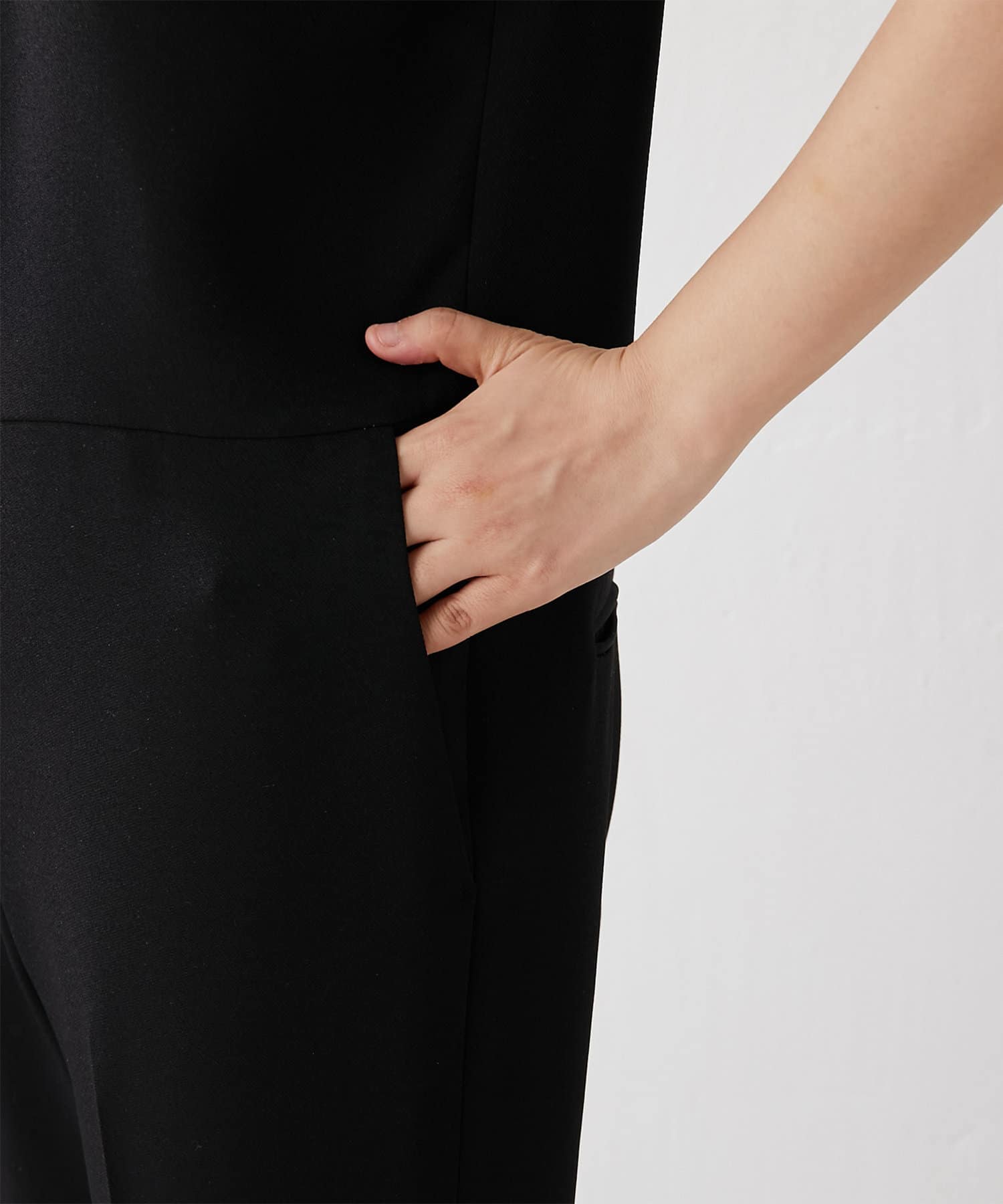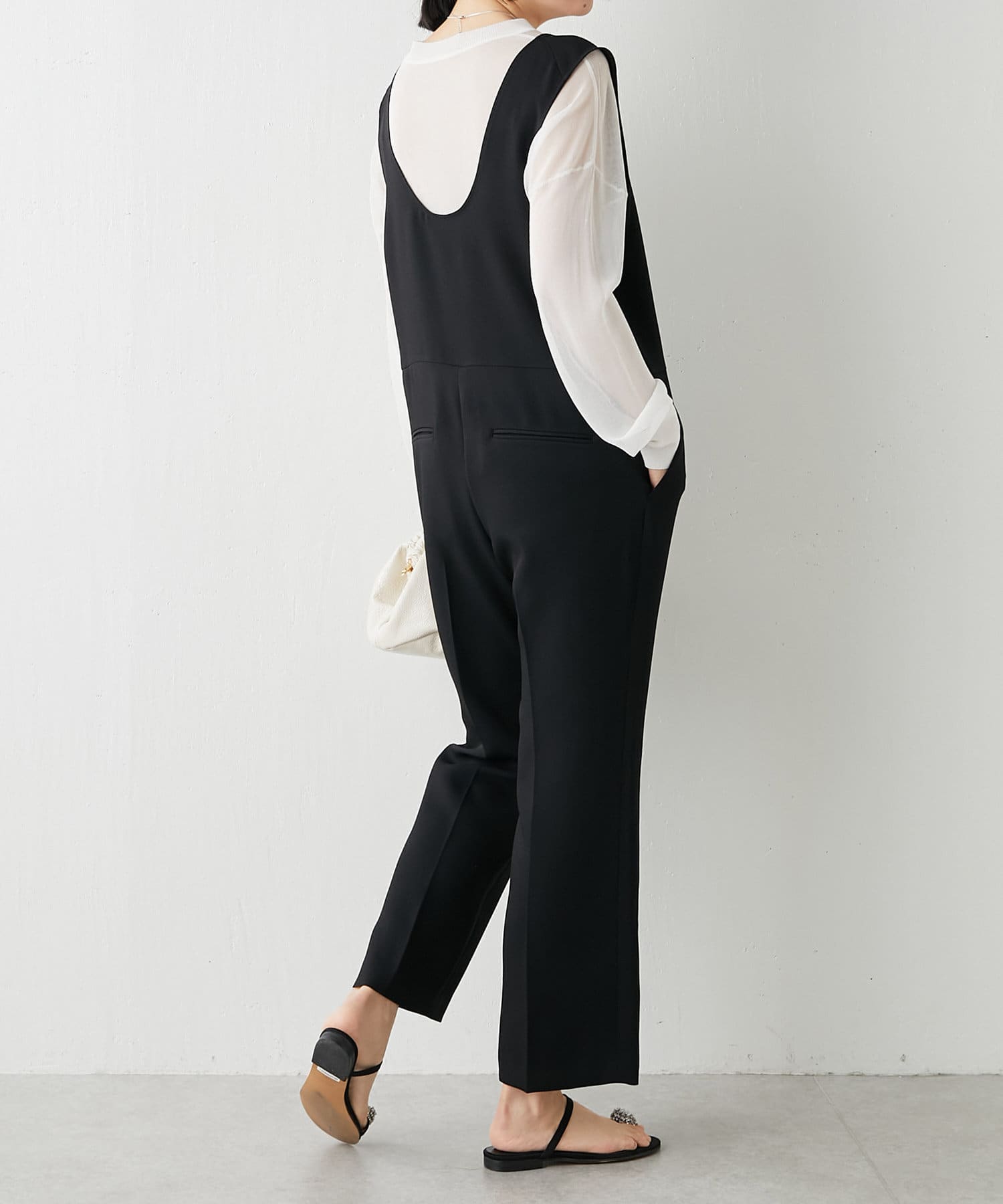 上品な素材感なので、ジャケット合わせのオフィスカジュアルにもおすすめ。腰回りは比較的ゆったり、脚部分はスッキリとしています。深めのVネックが抜け感を作ってくれるので、スタイルアップ効果も期待できます。