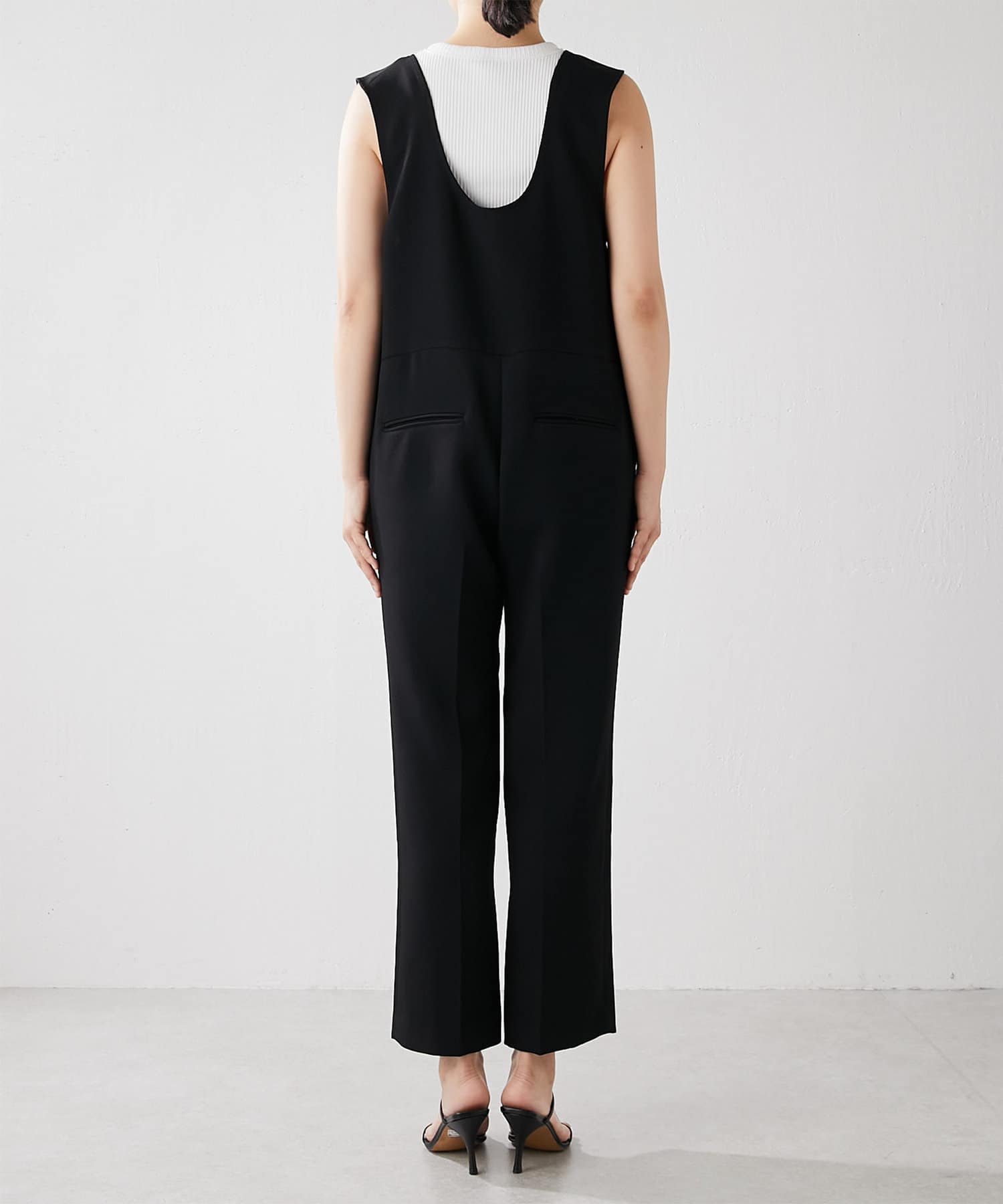 足元に向かってテーパードラインが綺麗なサロペット。162cmの身長で股上がちょうどいいです。私はフラットサンダルでも着られる丈でした。旅行やランチにも出かけられるきちんと感が良い。
