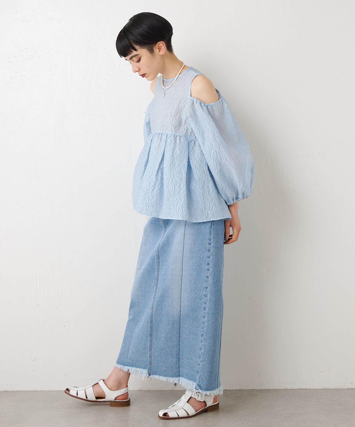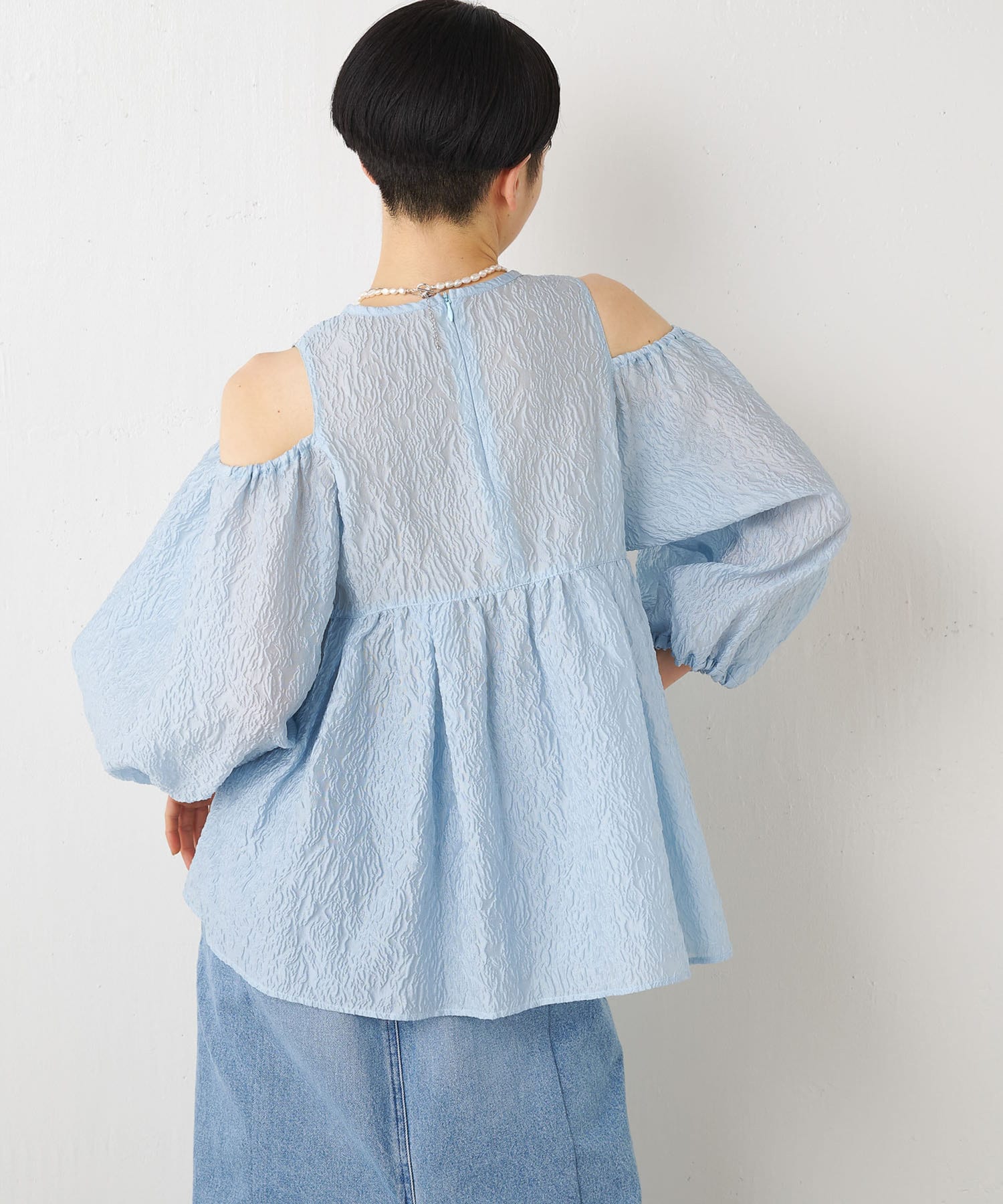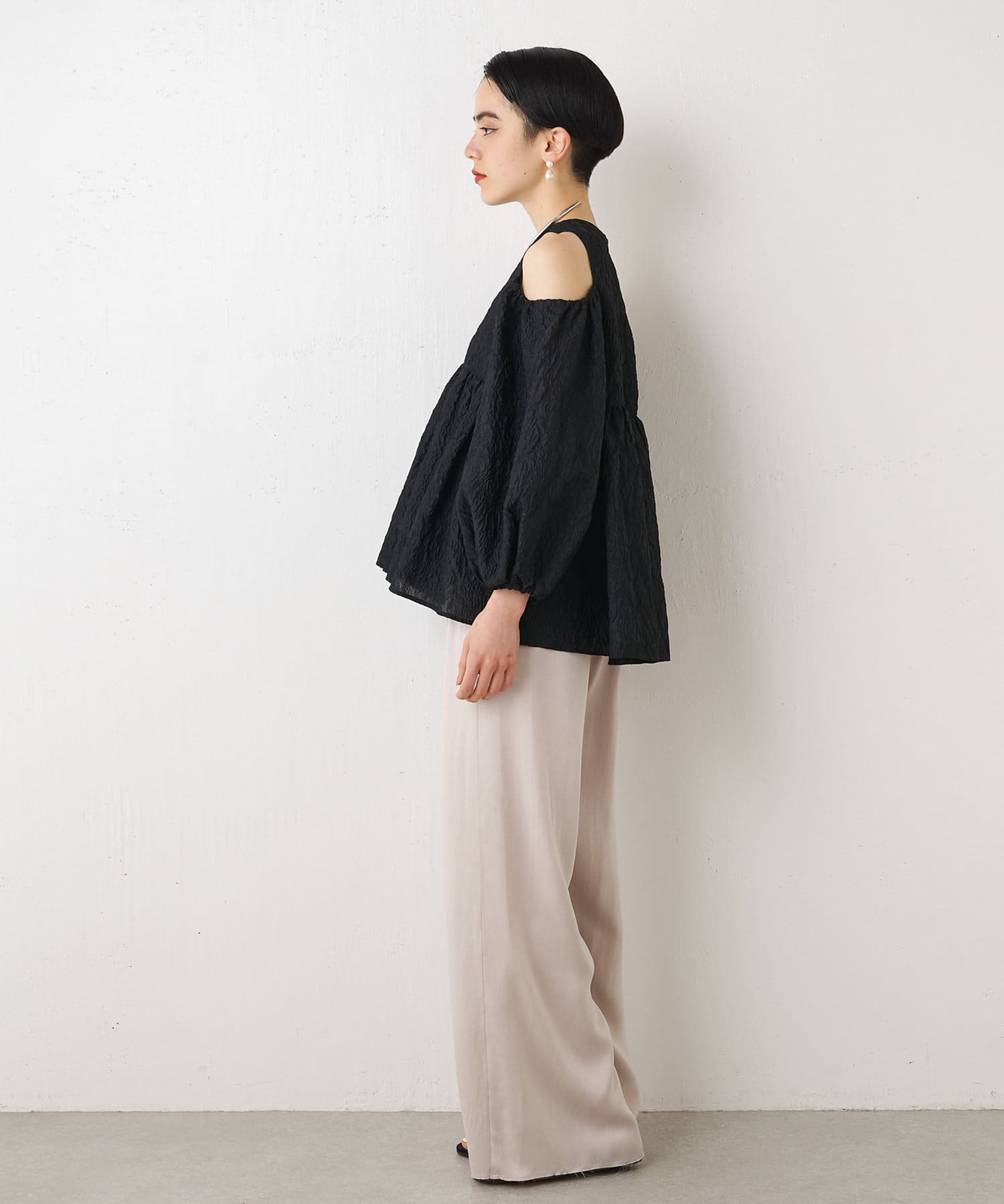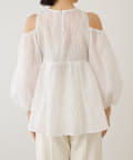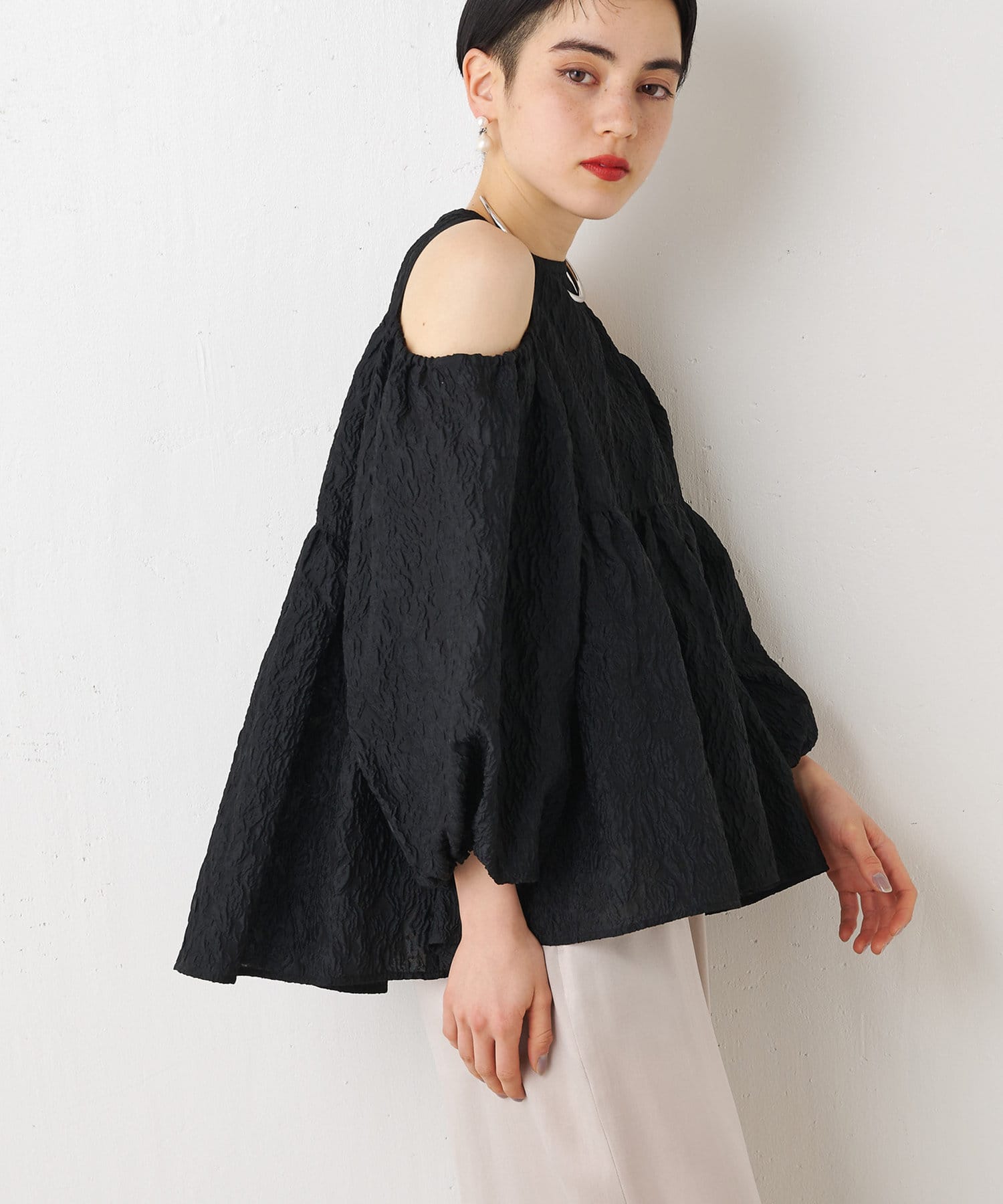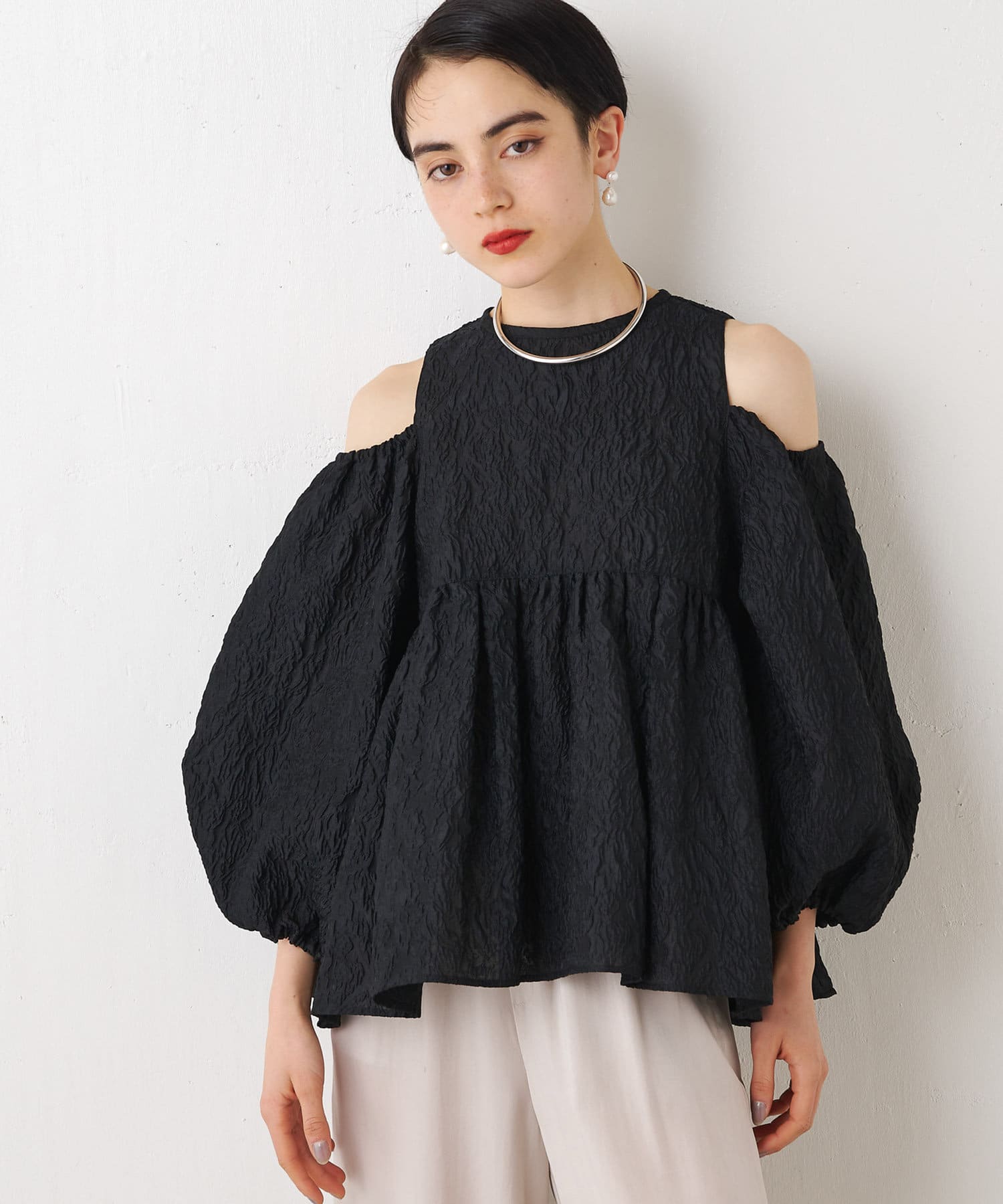 上品な肌見せスタイルを楽しめる、ガーリーな肩開きブラウス