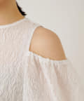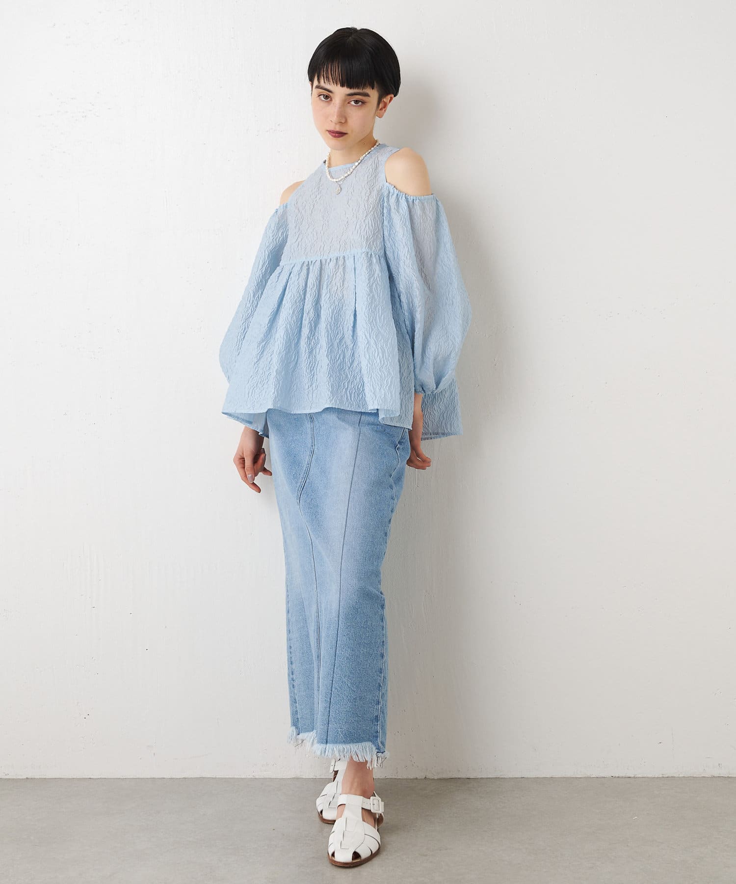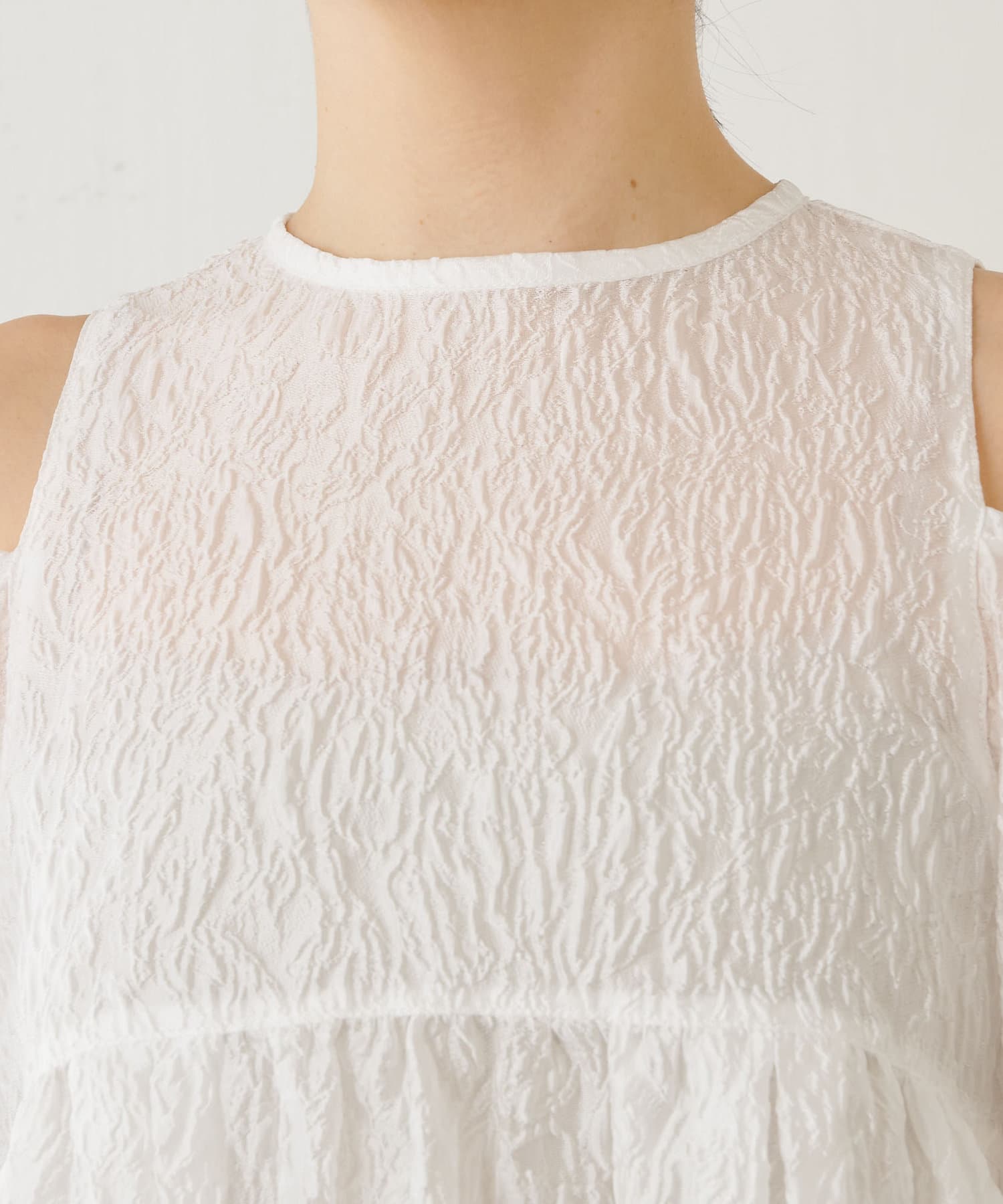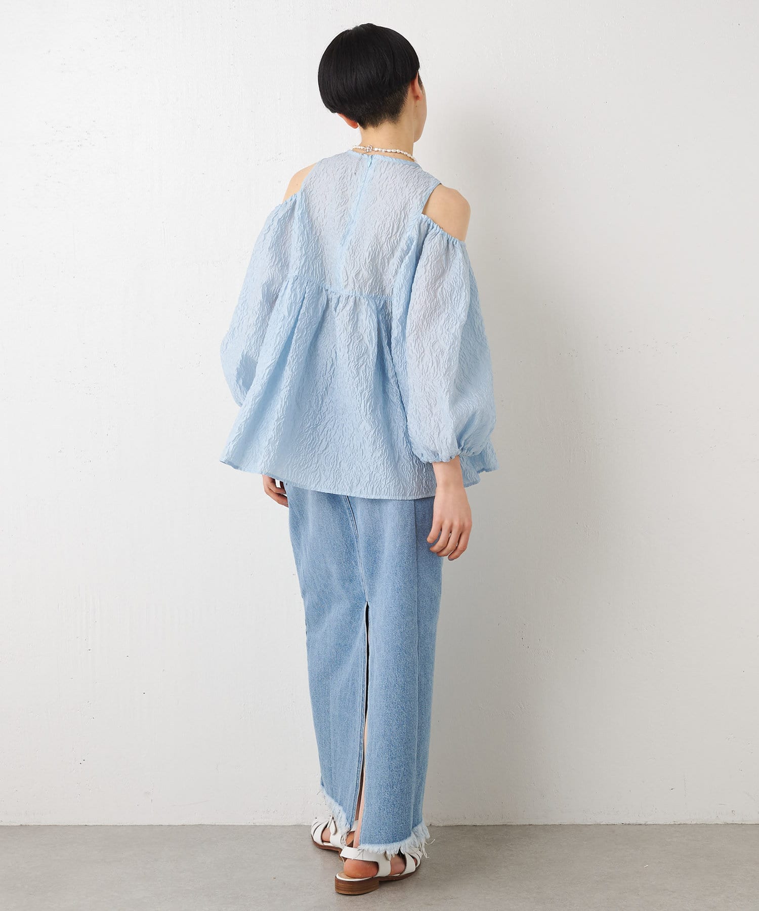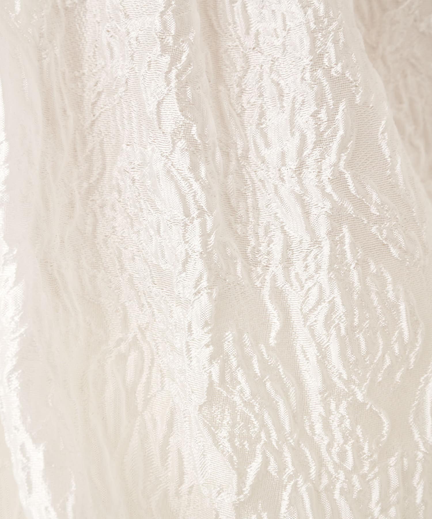 上品な肩の肌見せがポイントです。ジャガード柄で透けすぎず、程よいシアー感が楽しめます。