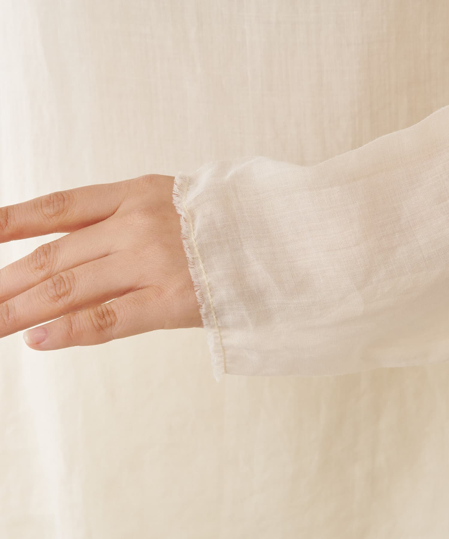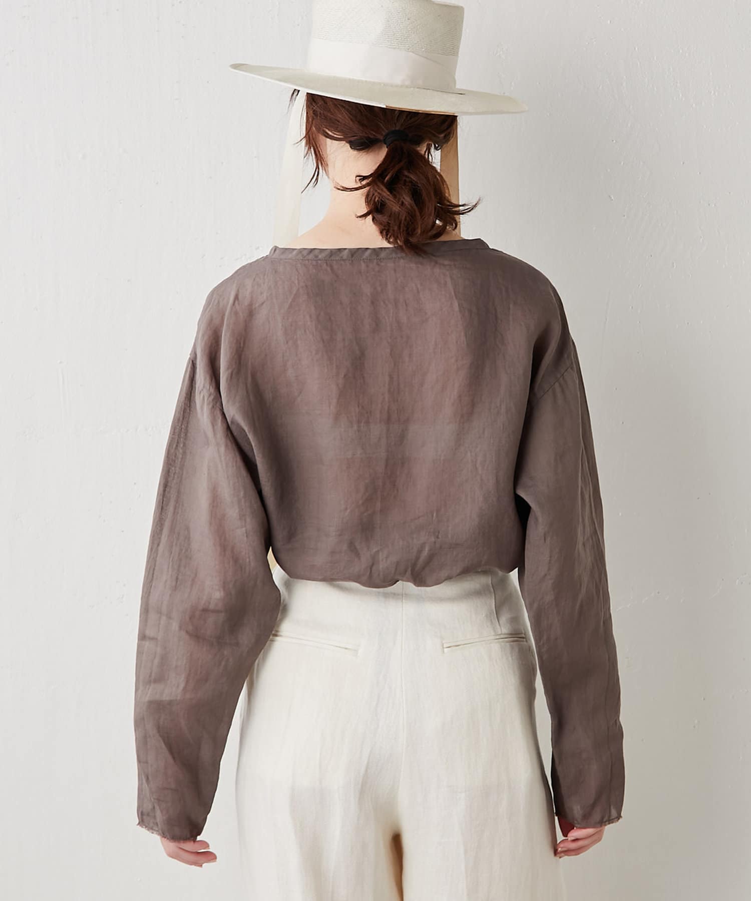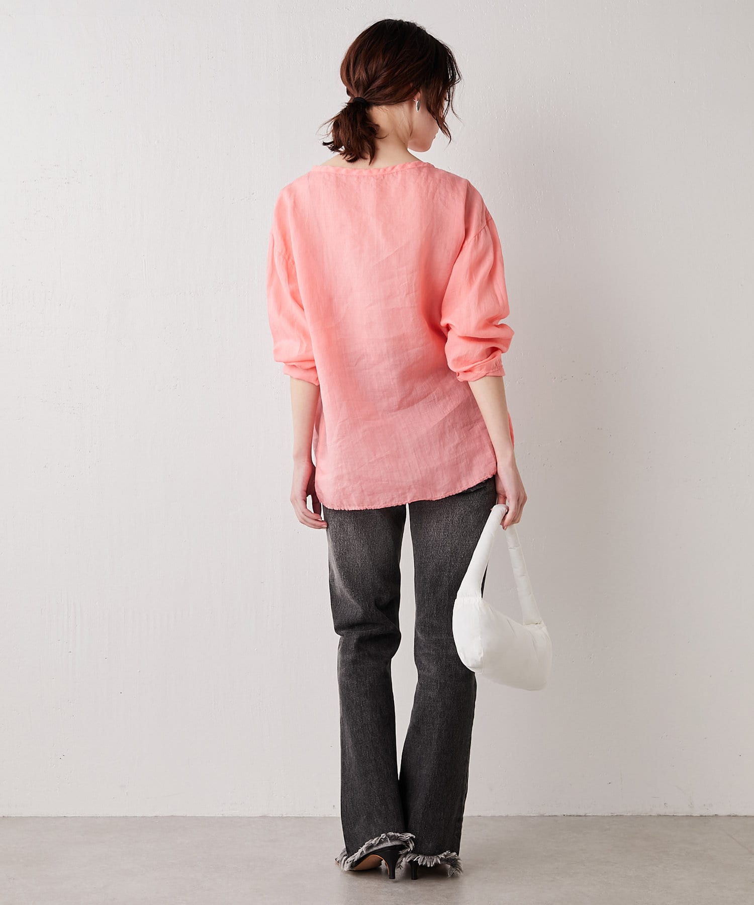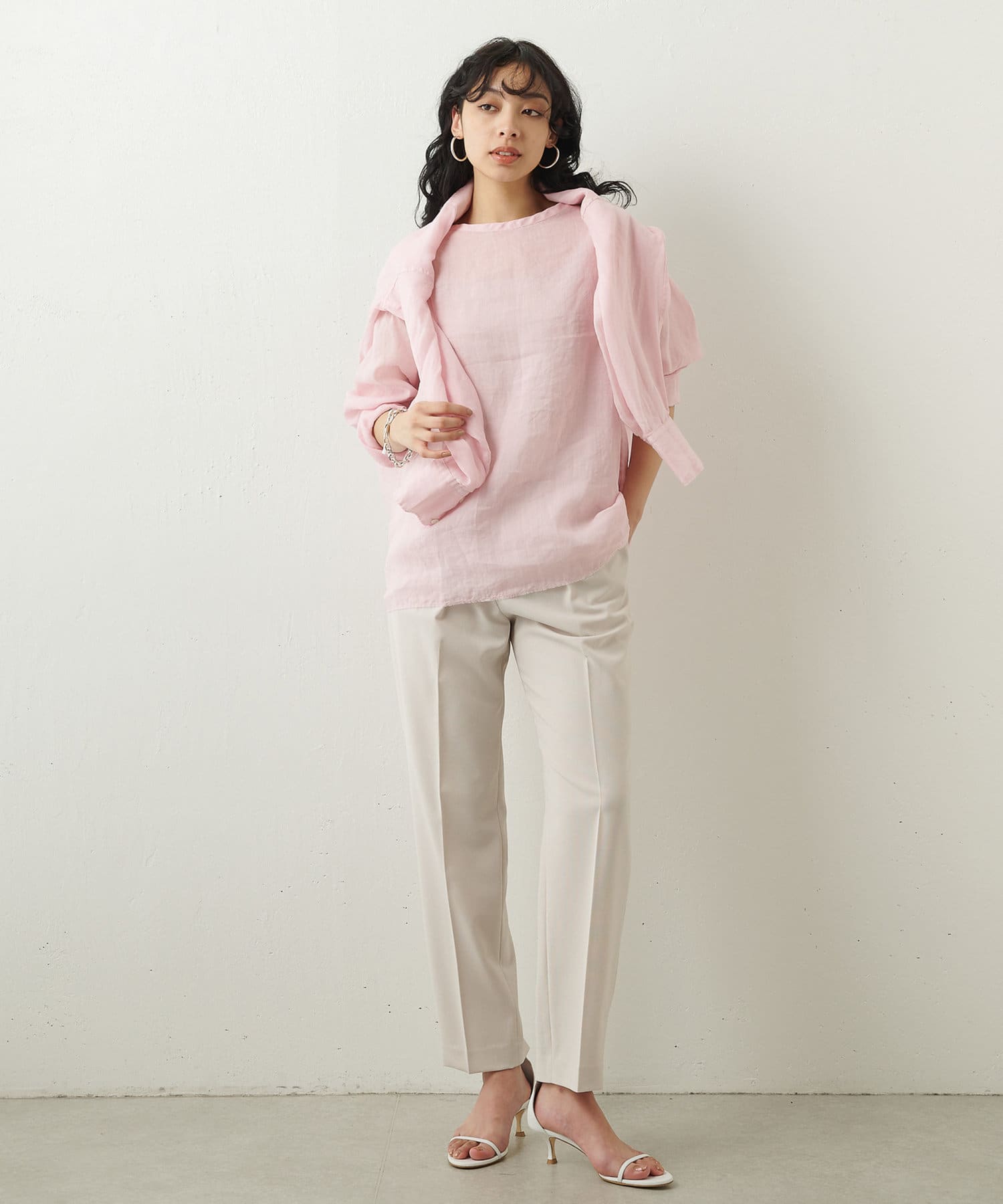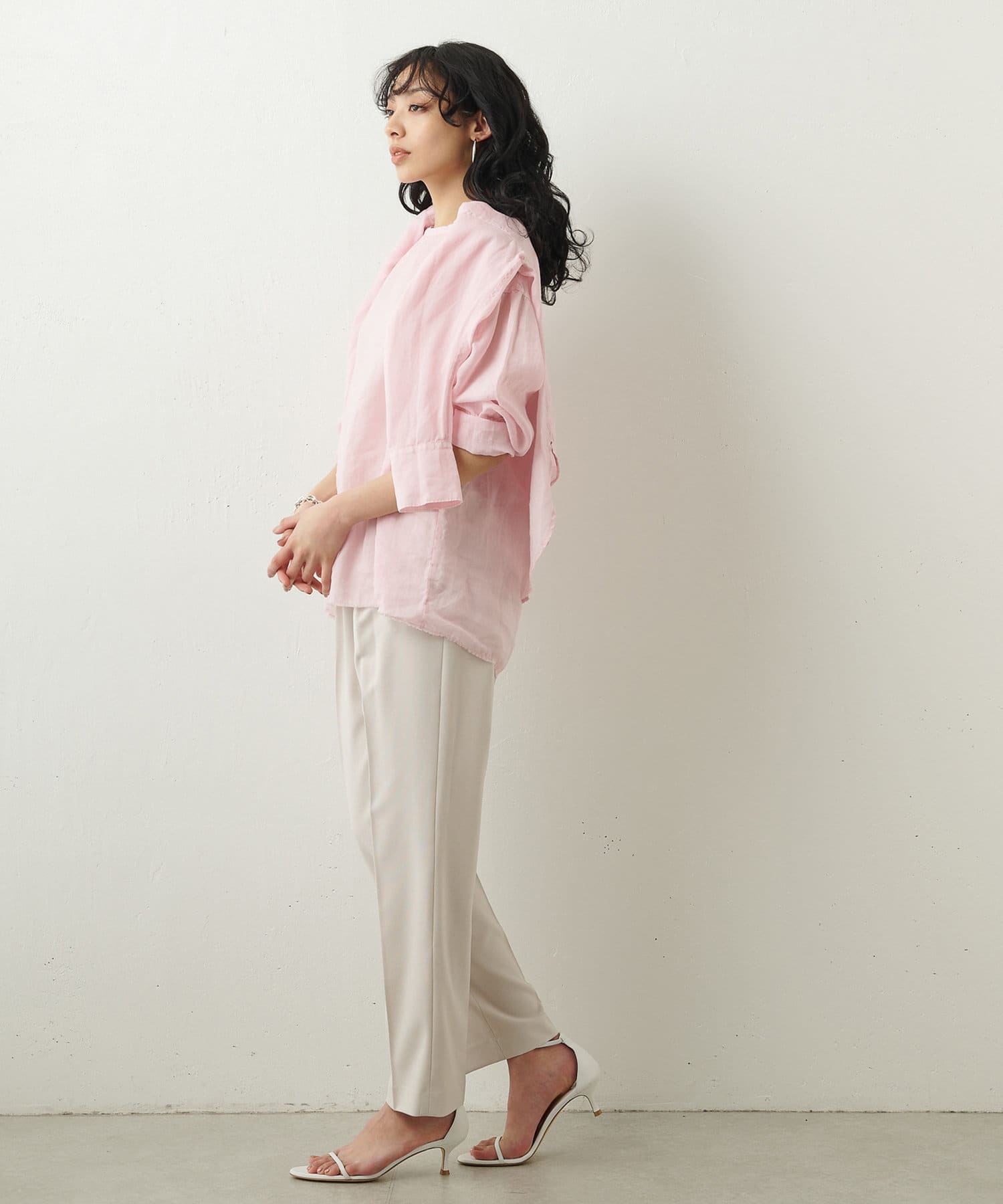 麻というとチクチクしたりするイメージもありますが、このブラウスはくたっとした加工が施されていて柔らかく、肌触りもとても優しいです!春や秋はインナーに長袖をレイヤードすれば長いシーズン使えるのも魅力です!