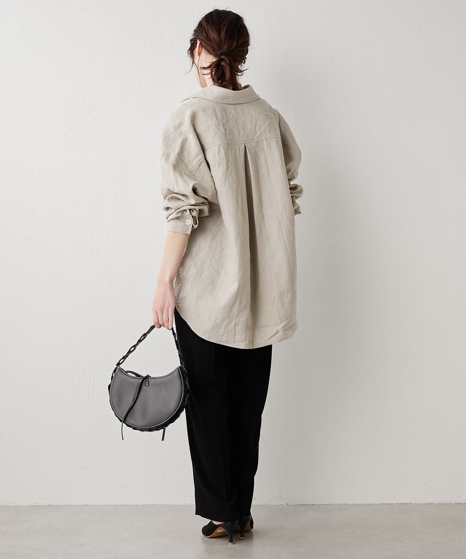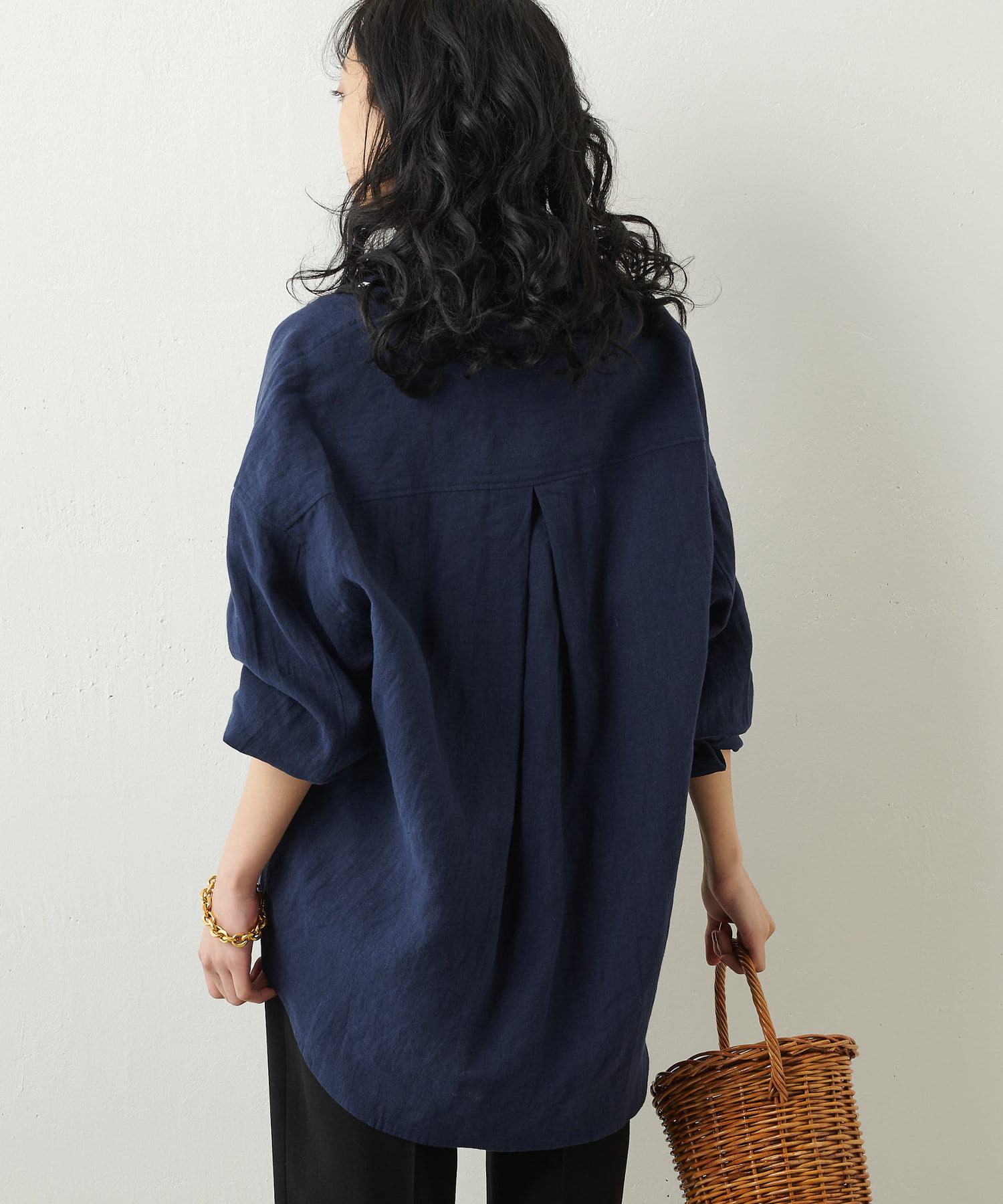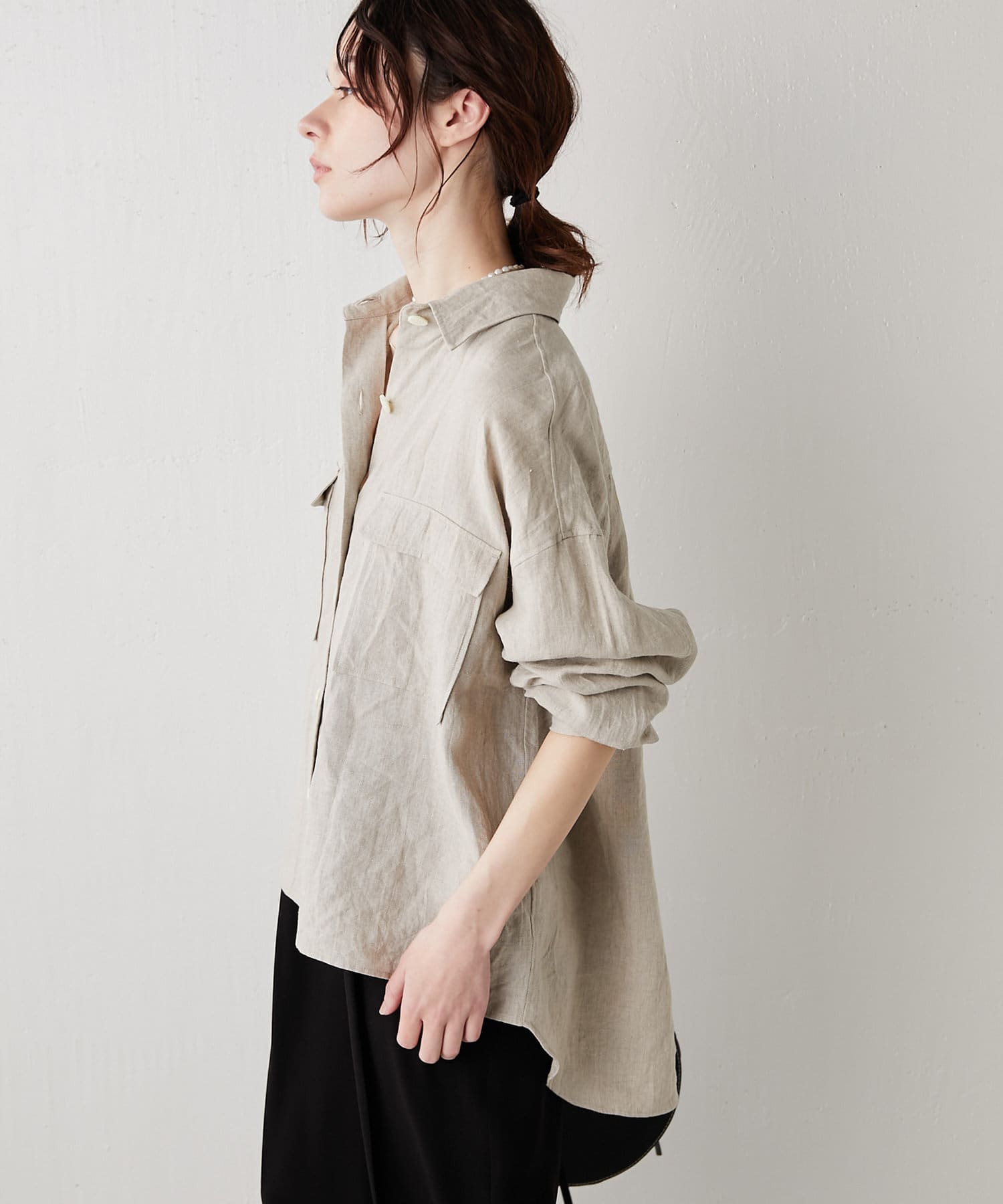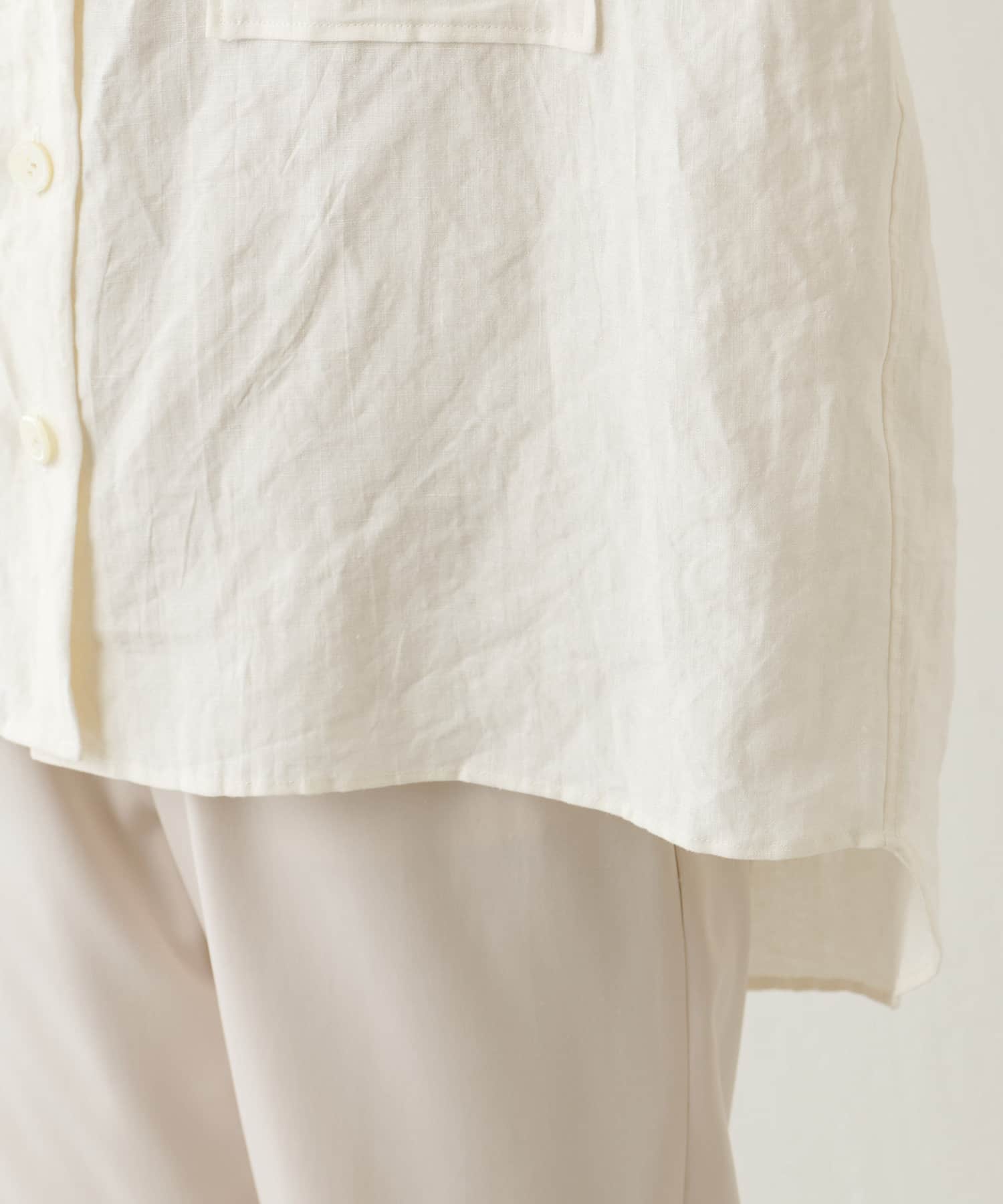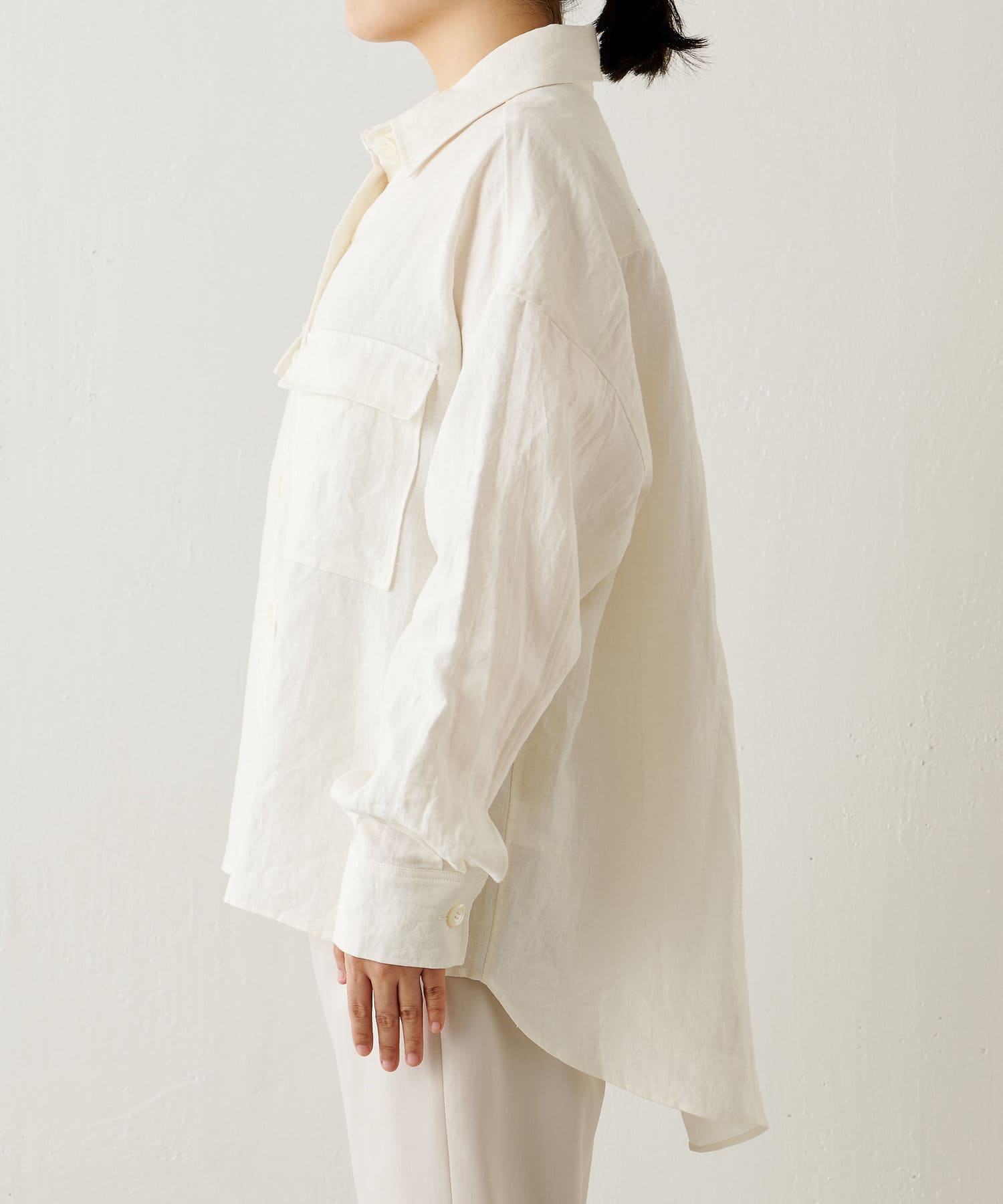 前と後ろでシャツの長さが変わりますので、美しいシルエットを楽しめるアイテム。きちんと感よりこなれ感が前に出るリネンシャツです。