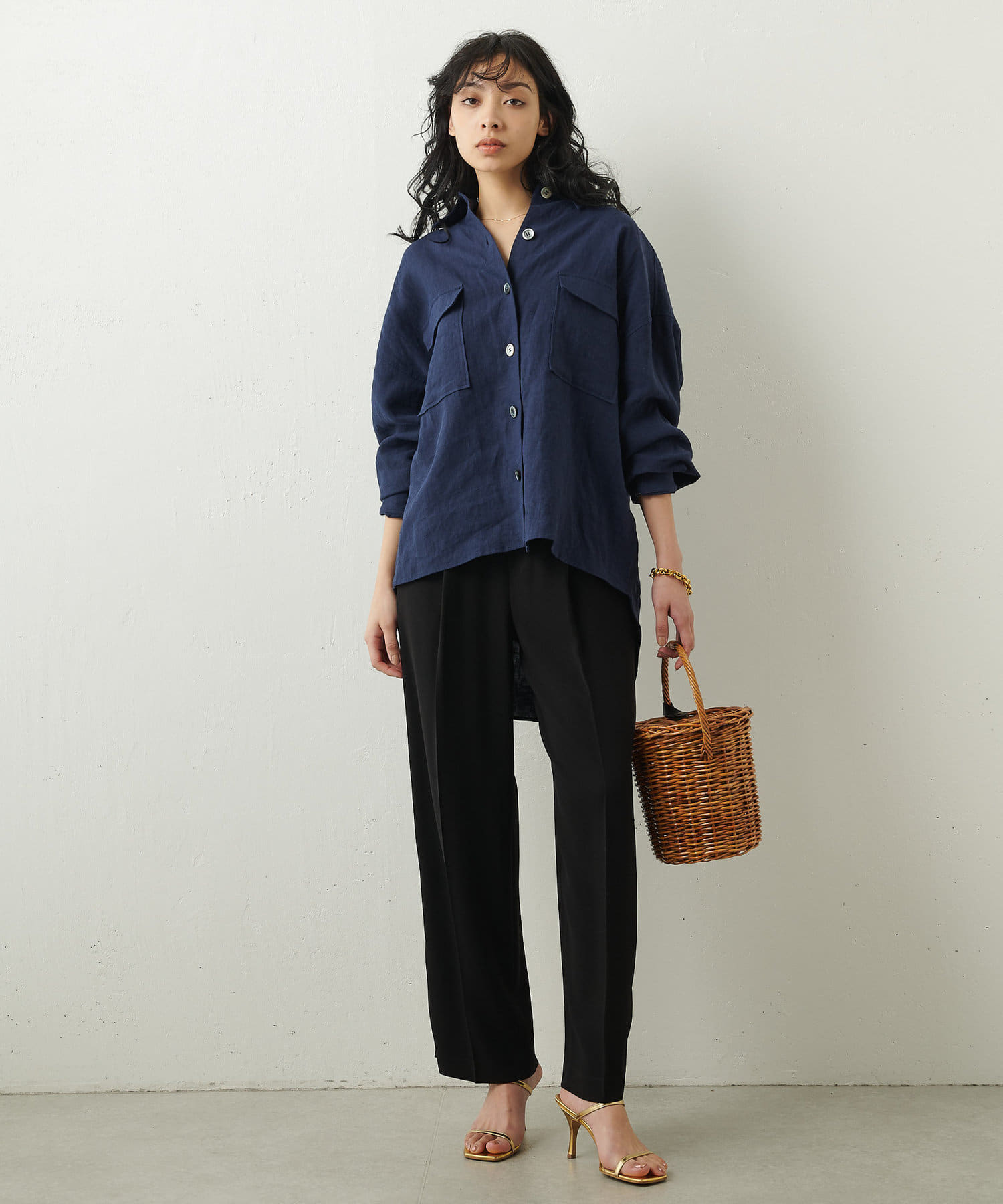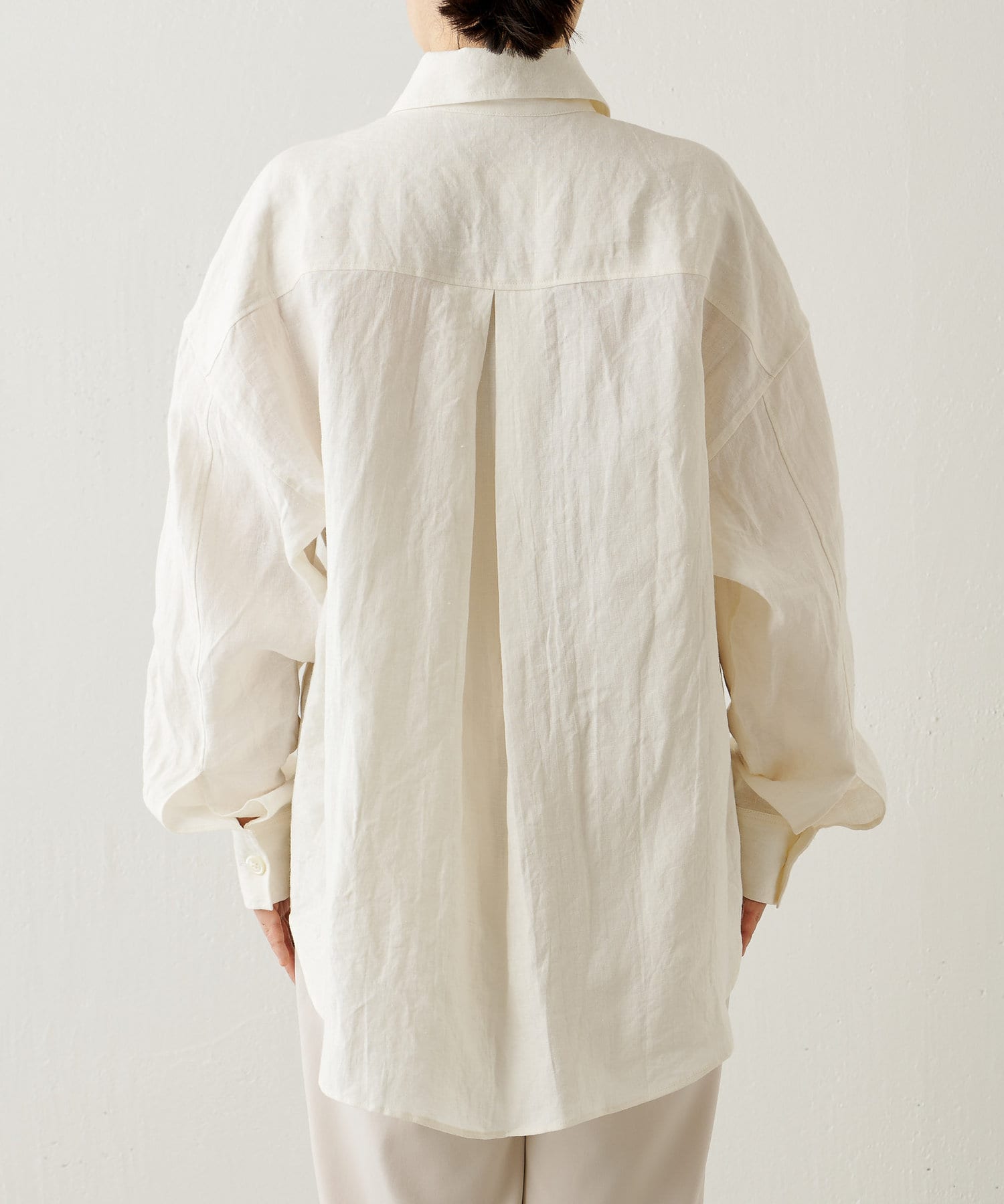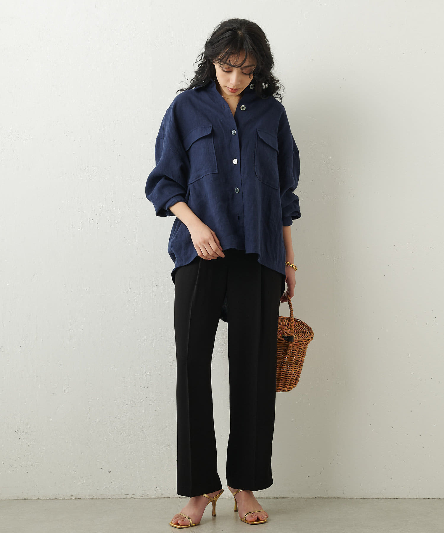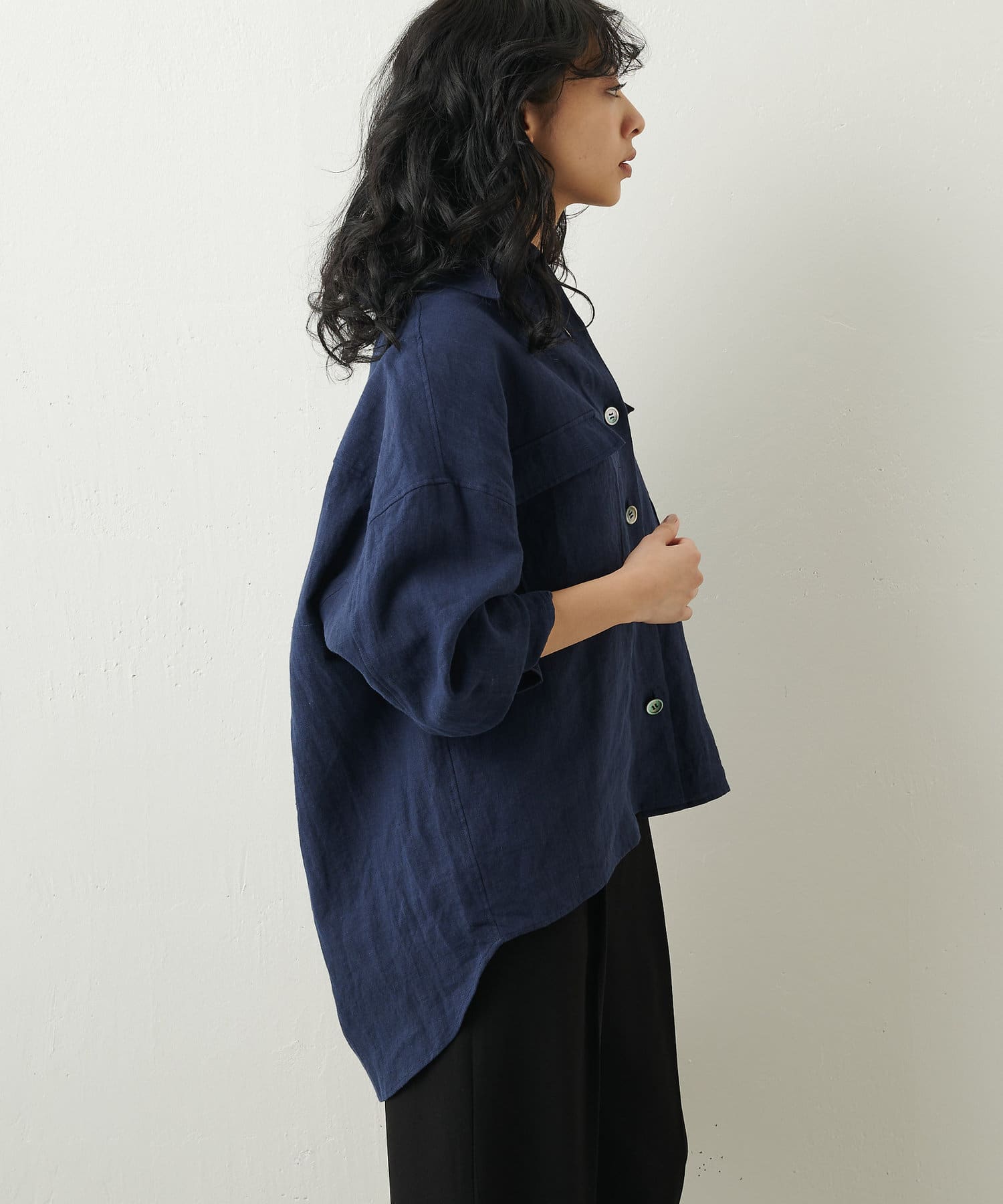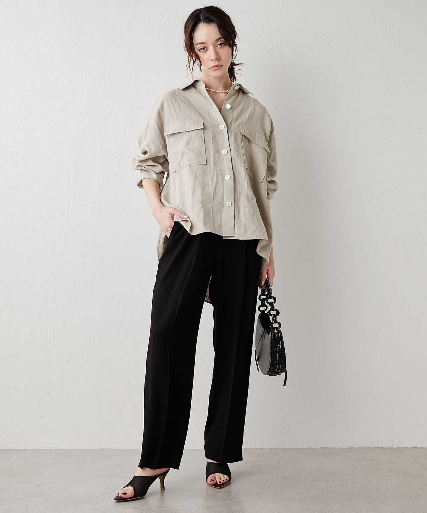 前と後ろでシャツの長さが変わりますので、美しいシルエットを楽しめるアイテム。きちんと感よりこなれ感が前に出るリネンシャツです。