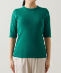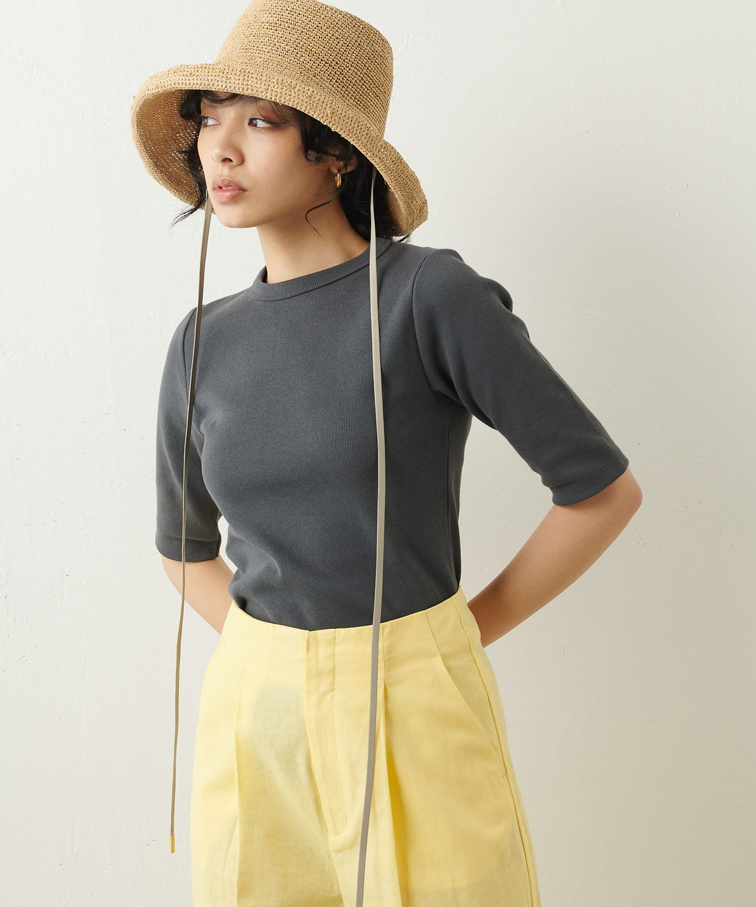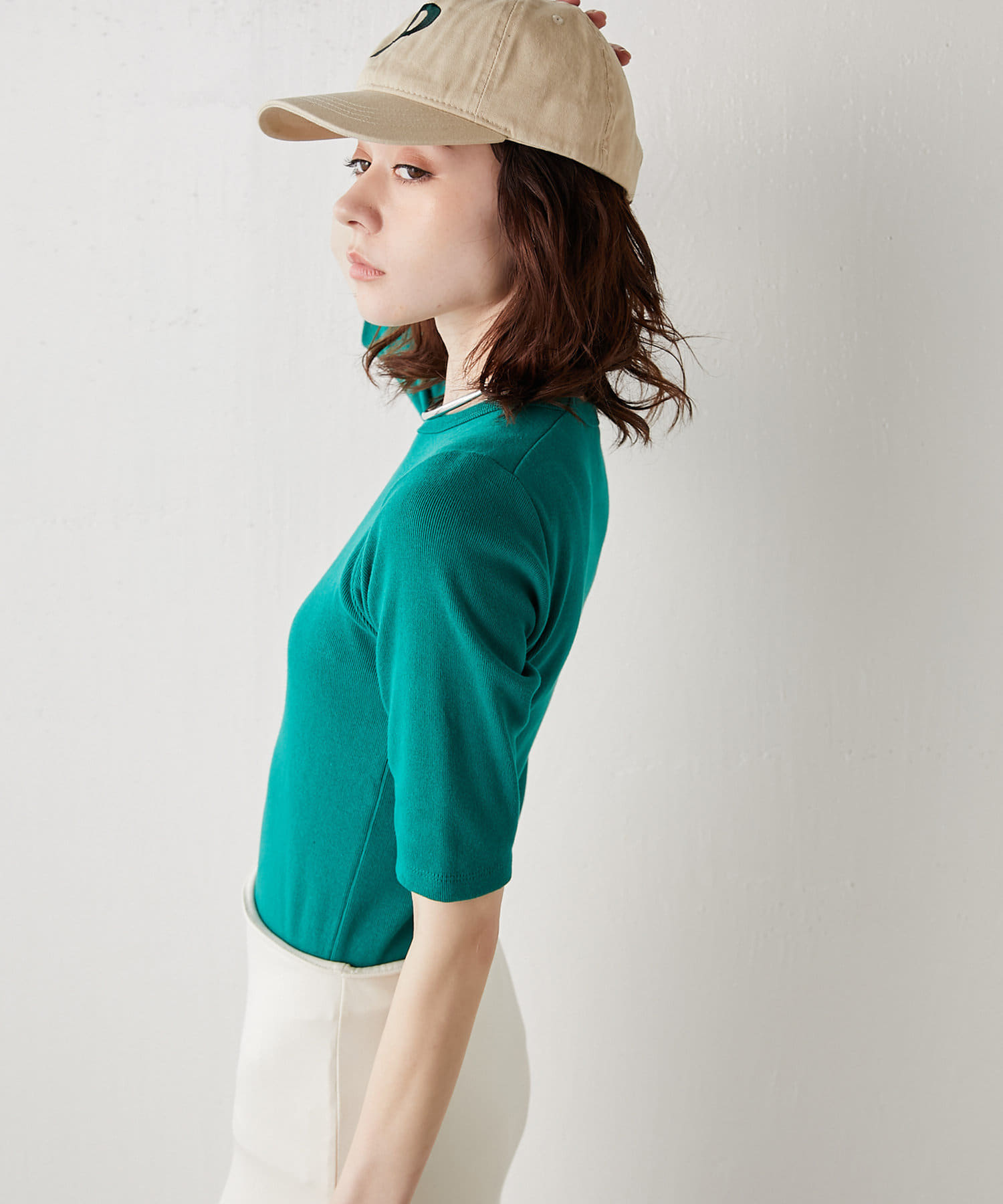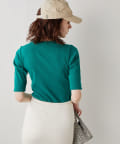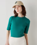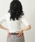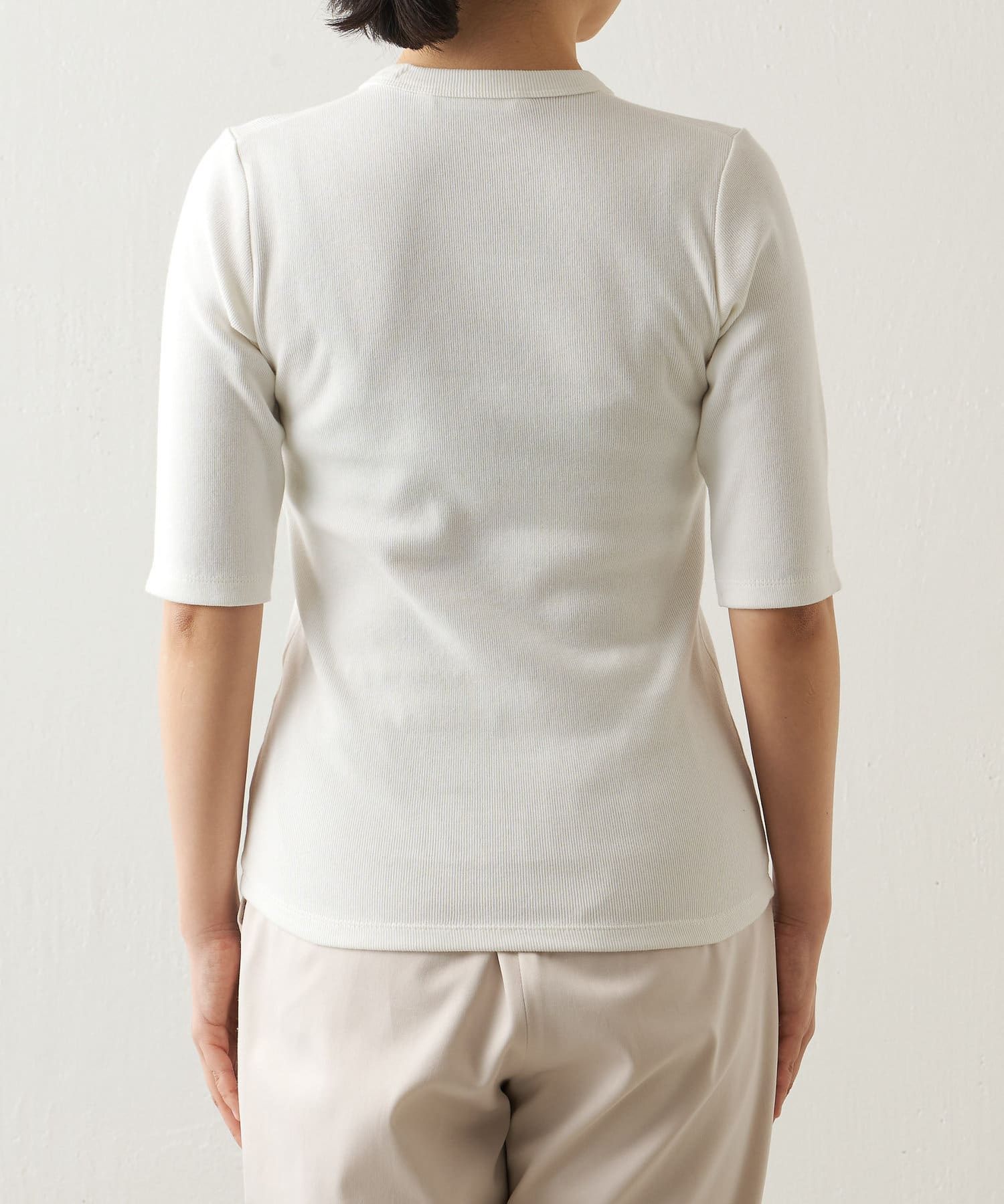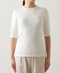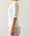 ■やや長めのハーフスリーブや、程よくフィットするすっきりとしたシルエットで女性らしいバランスに。
