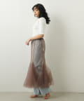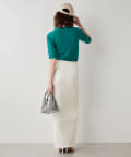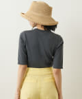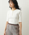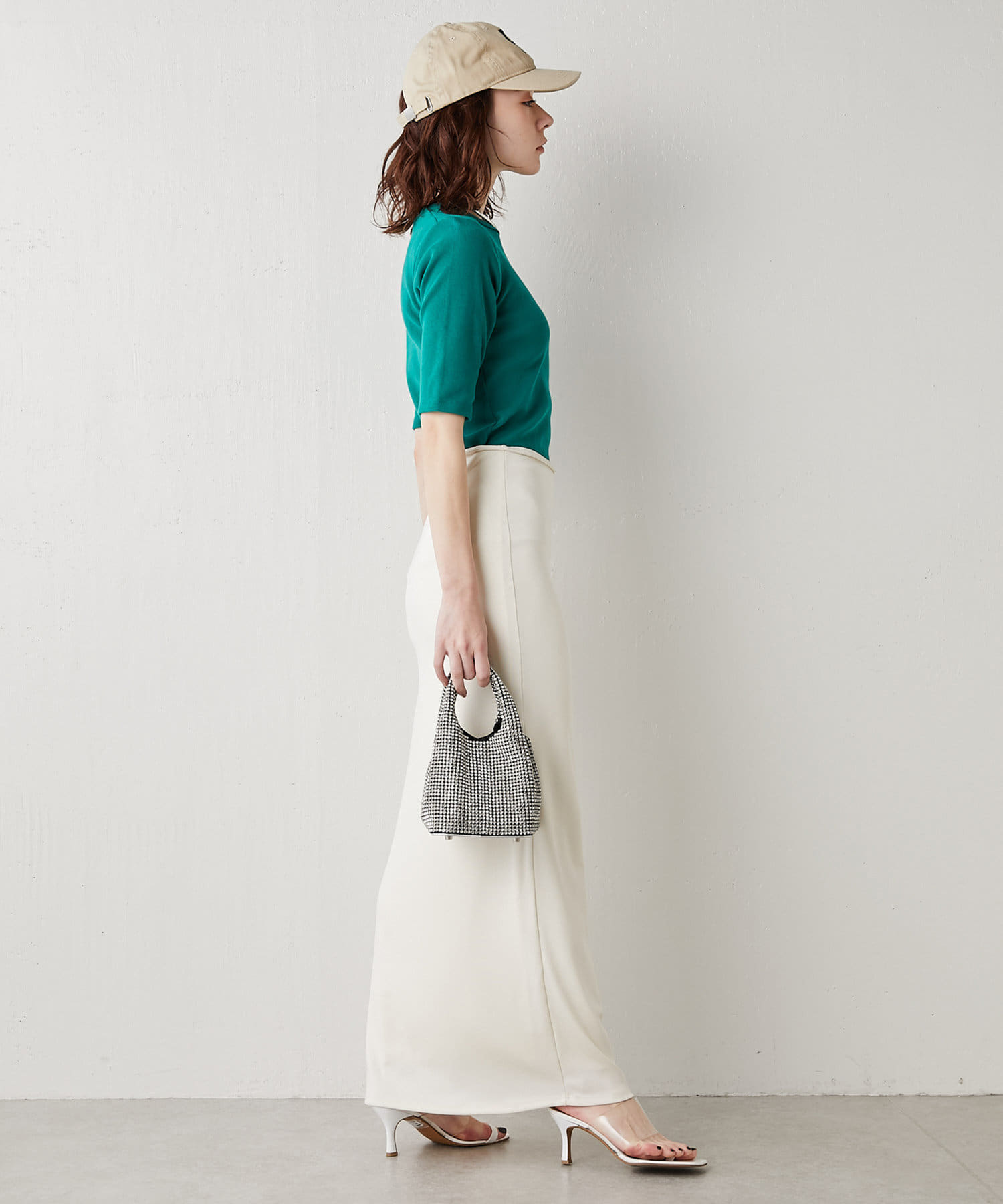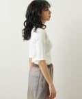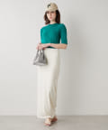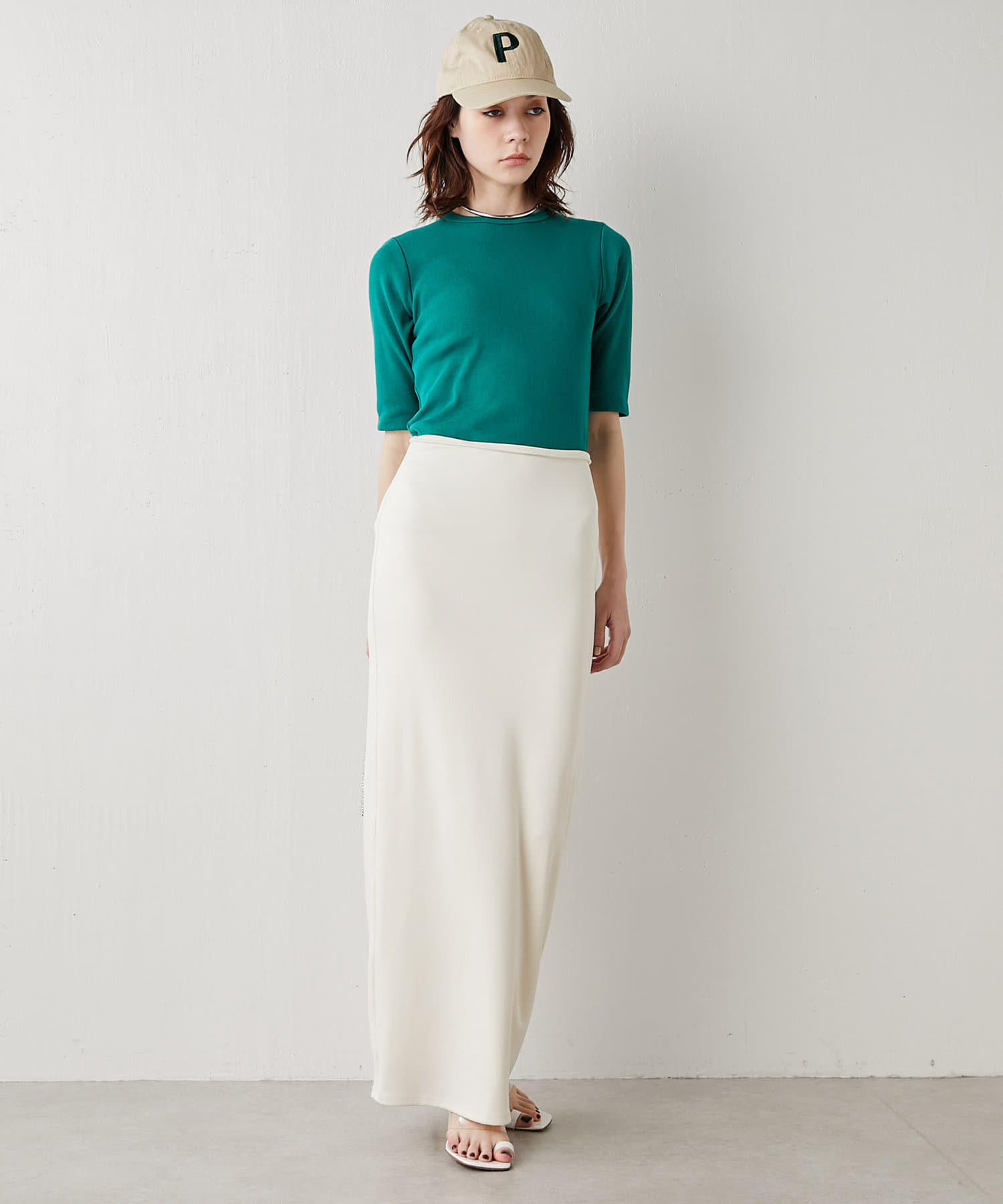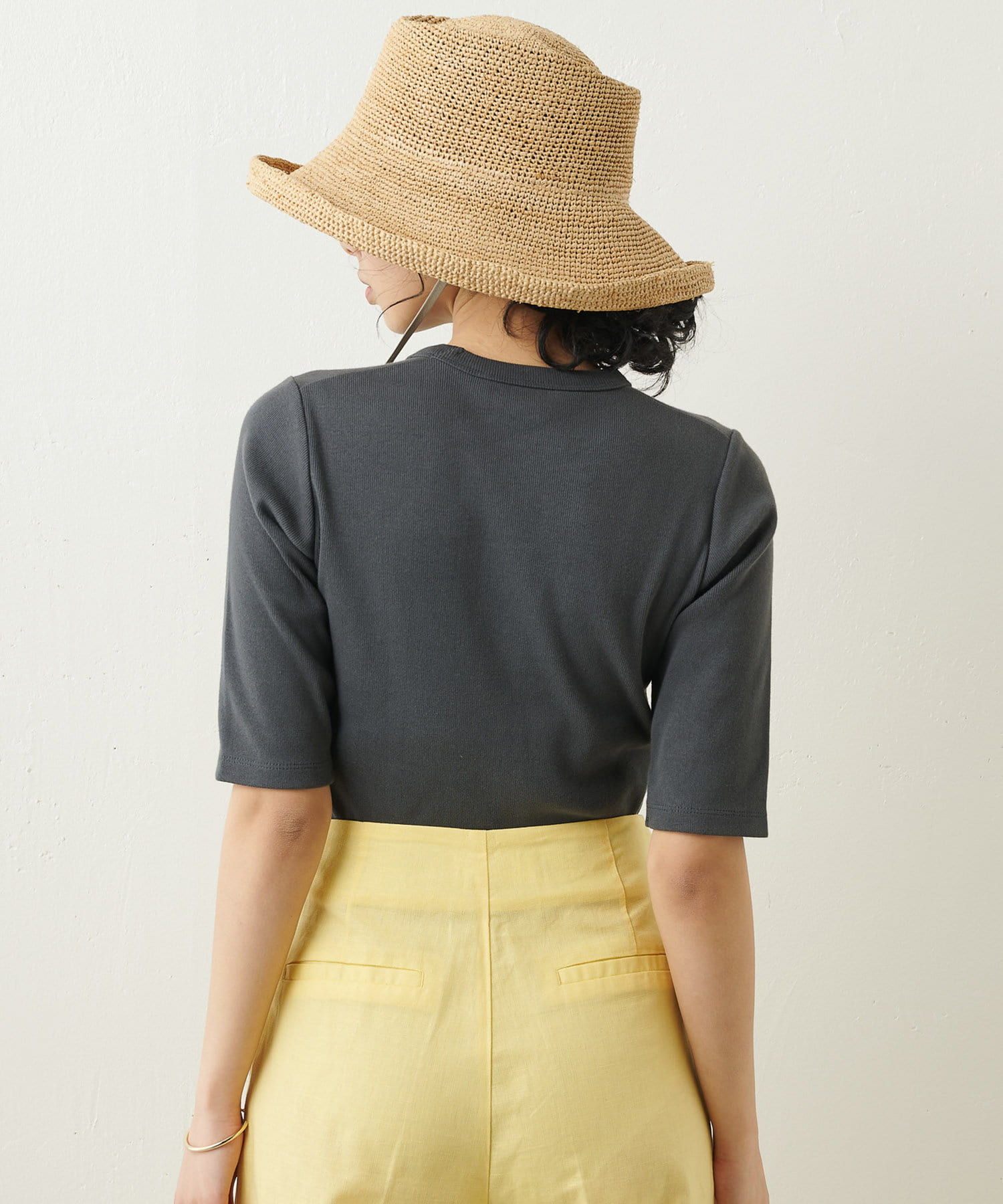 ■やや長めのハーフスリーブや、程よくフィットするすっきりとしたシルエットで女性らしいバランスに。