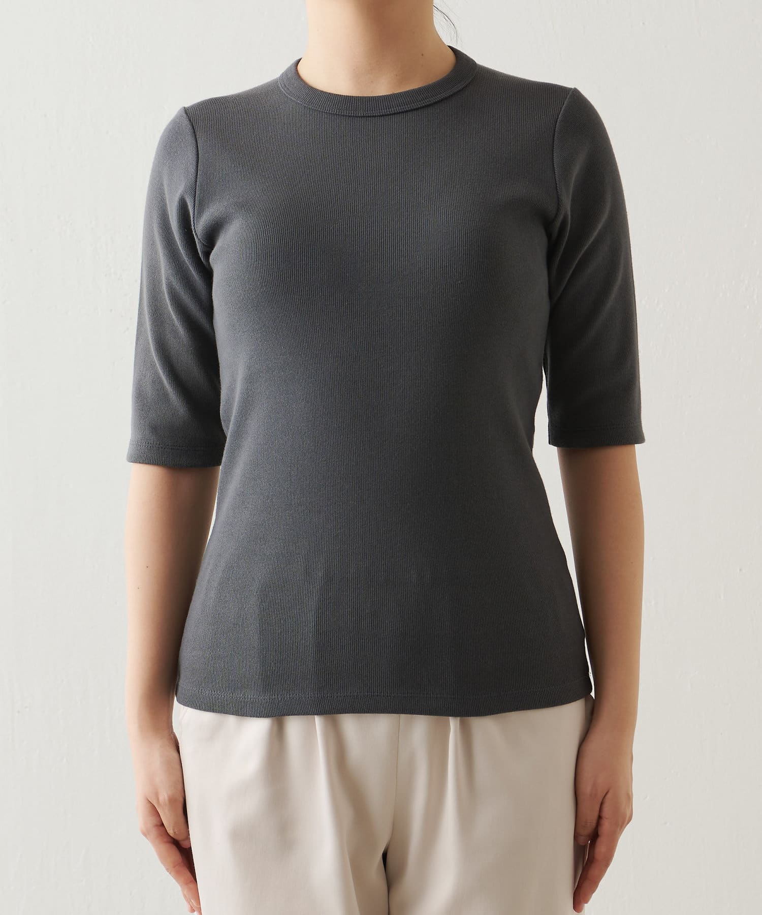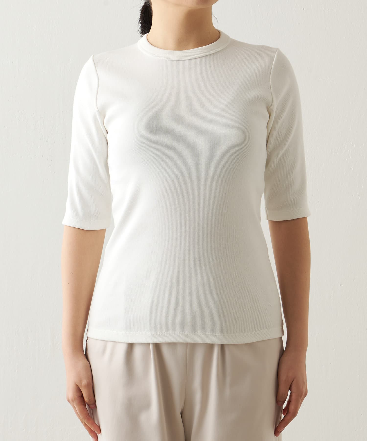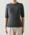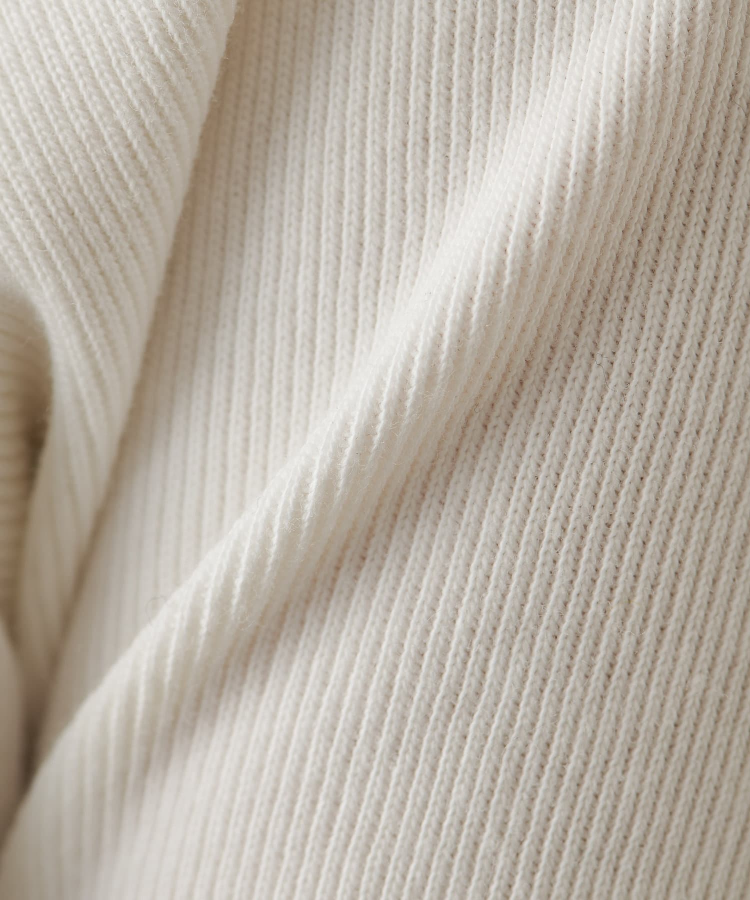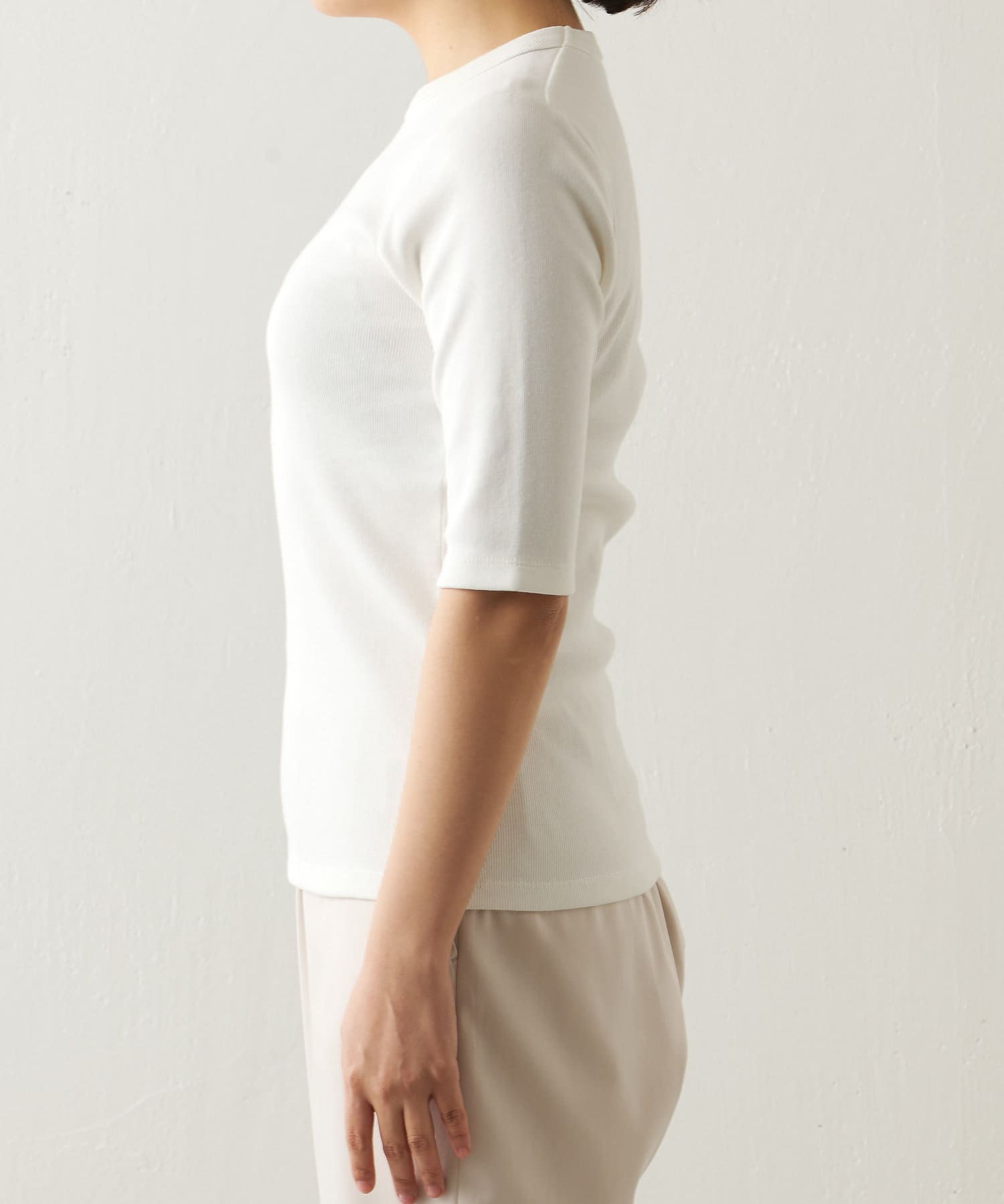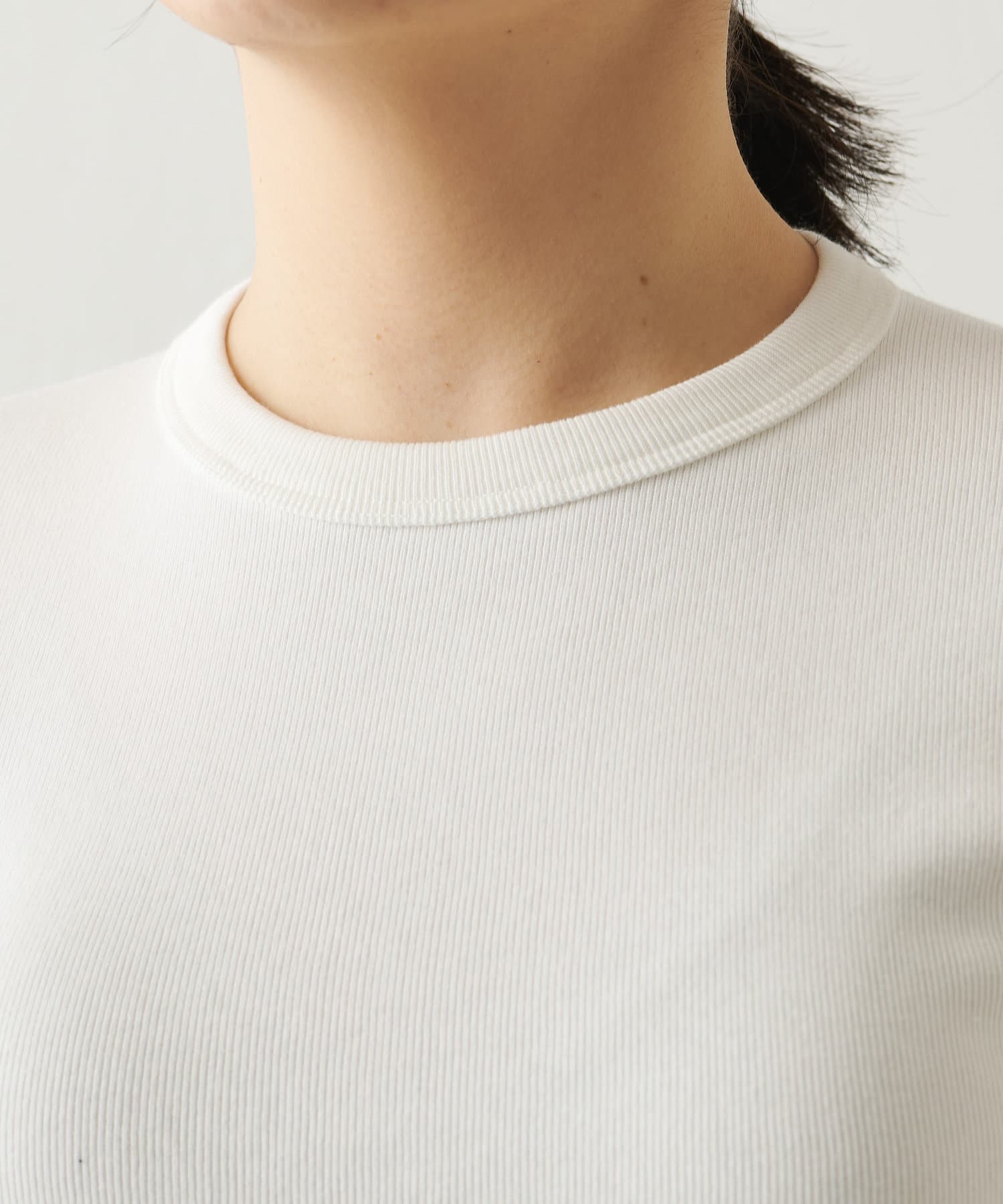 コンパクトで体に添うデザイン。ボリュームのあるボトムとの合わせもおすすめです。肌のあたりも柔らかく、着心地よし。ジャケットのインナーとしてもおすすめです。