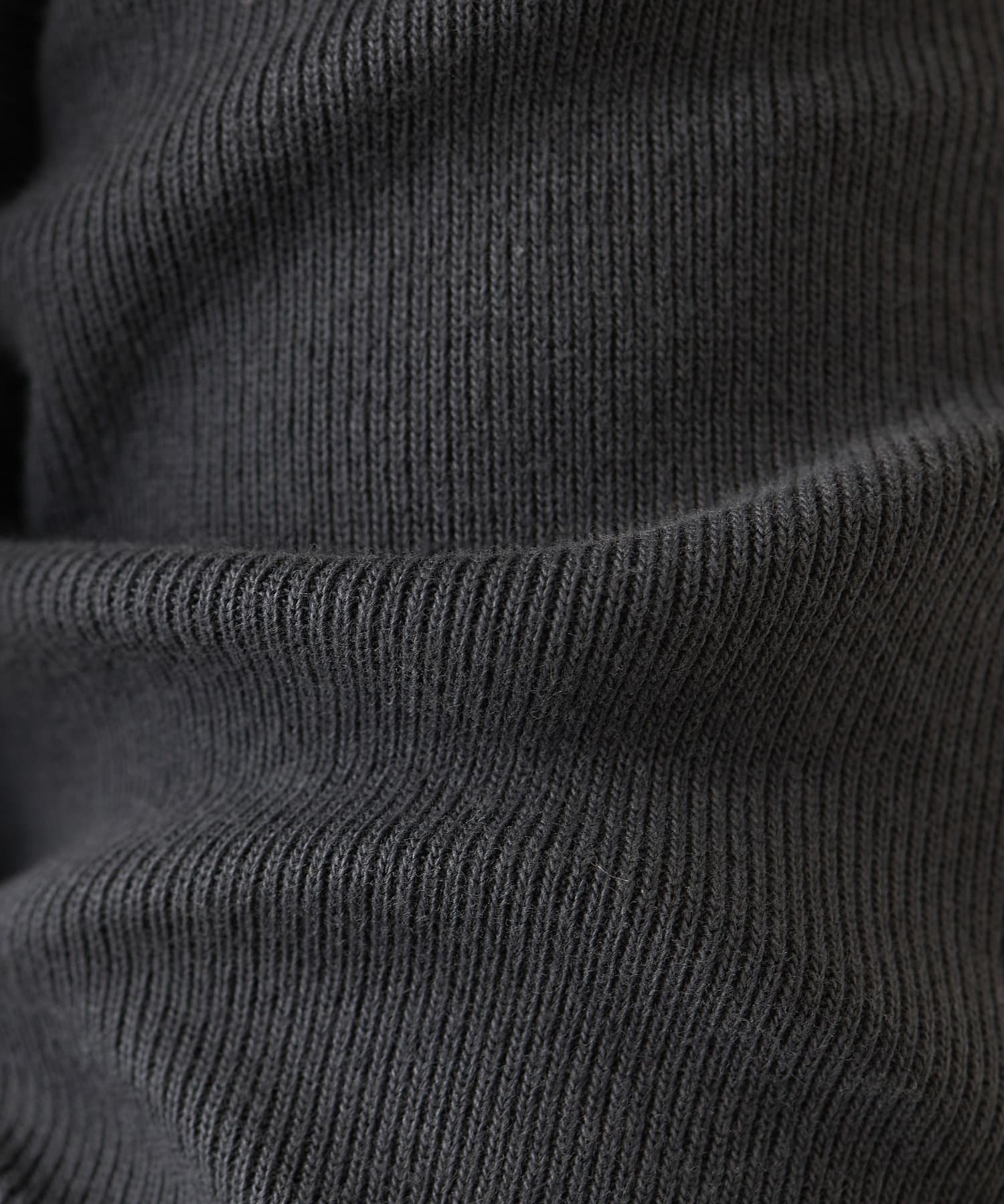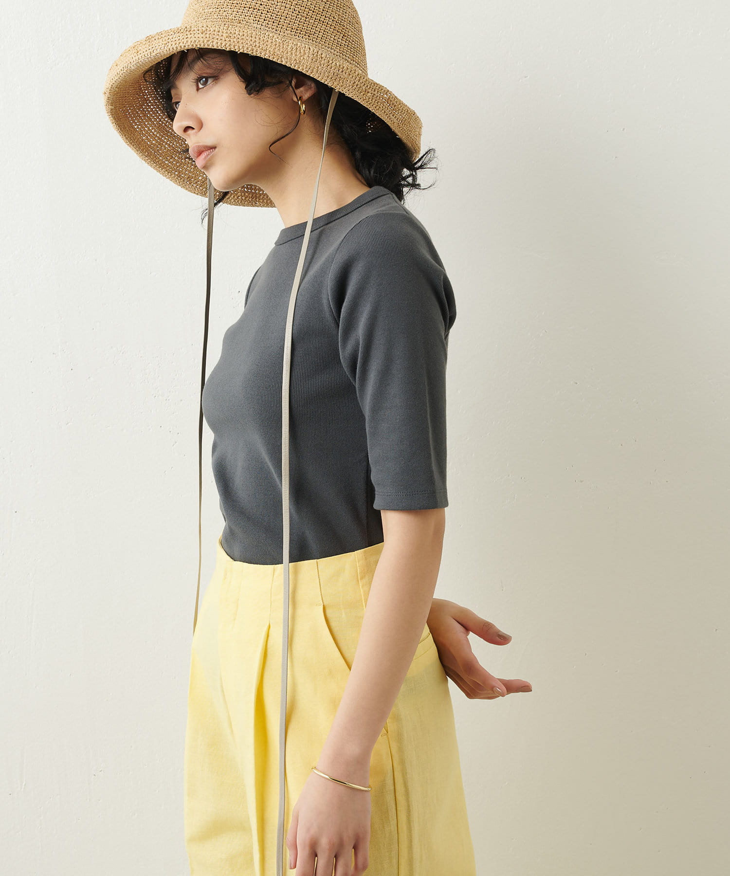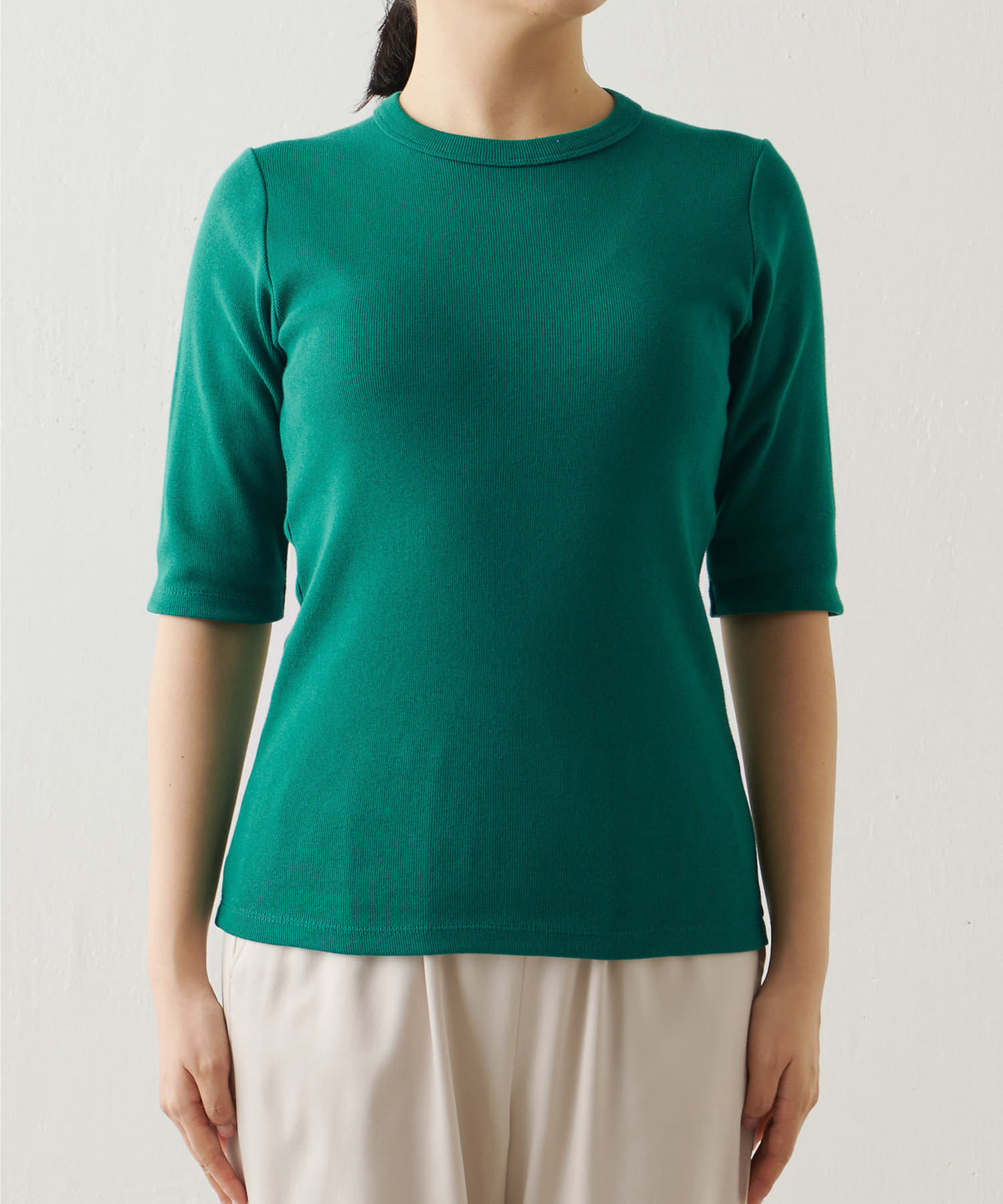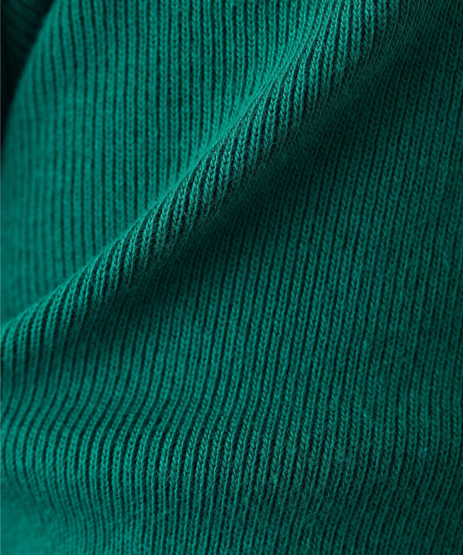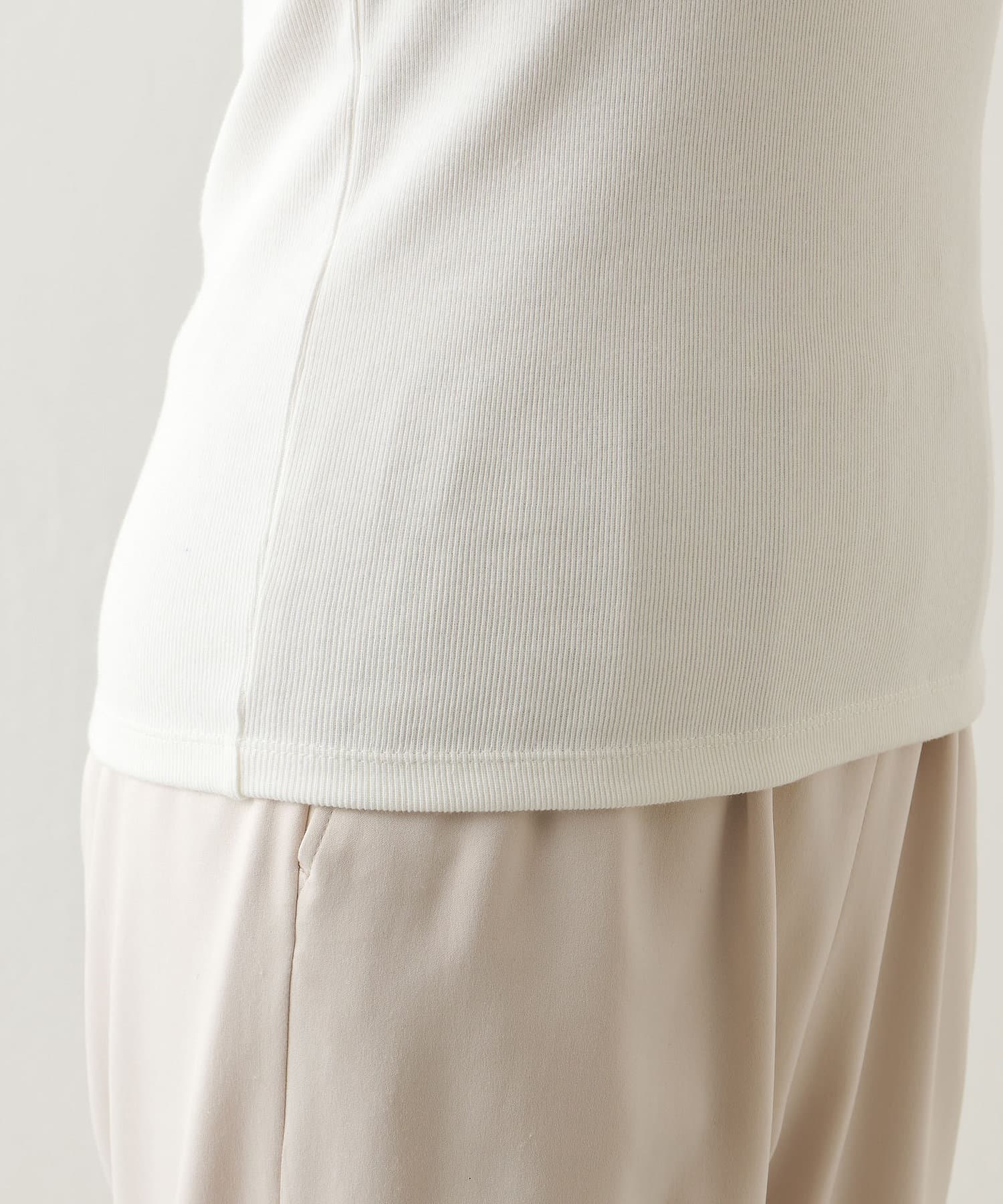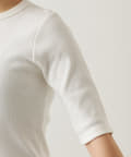 コンパクトで体に添うデザイン。ボリュームのあるボトムとの合わせもおすすめです。肌のあたりも柔らかく、着心地よし。ジャケットのインナーとしてもおすすめです。
