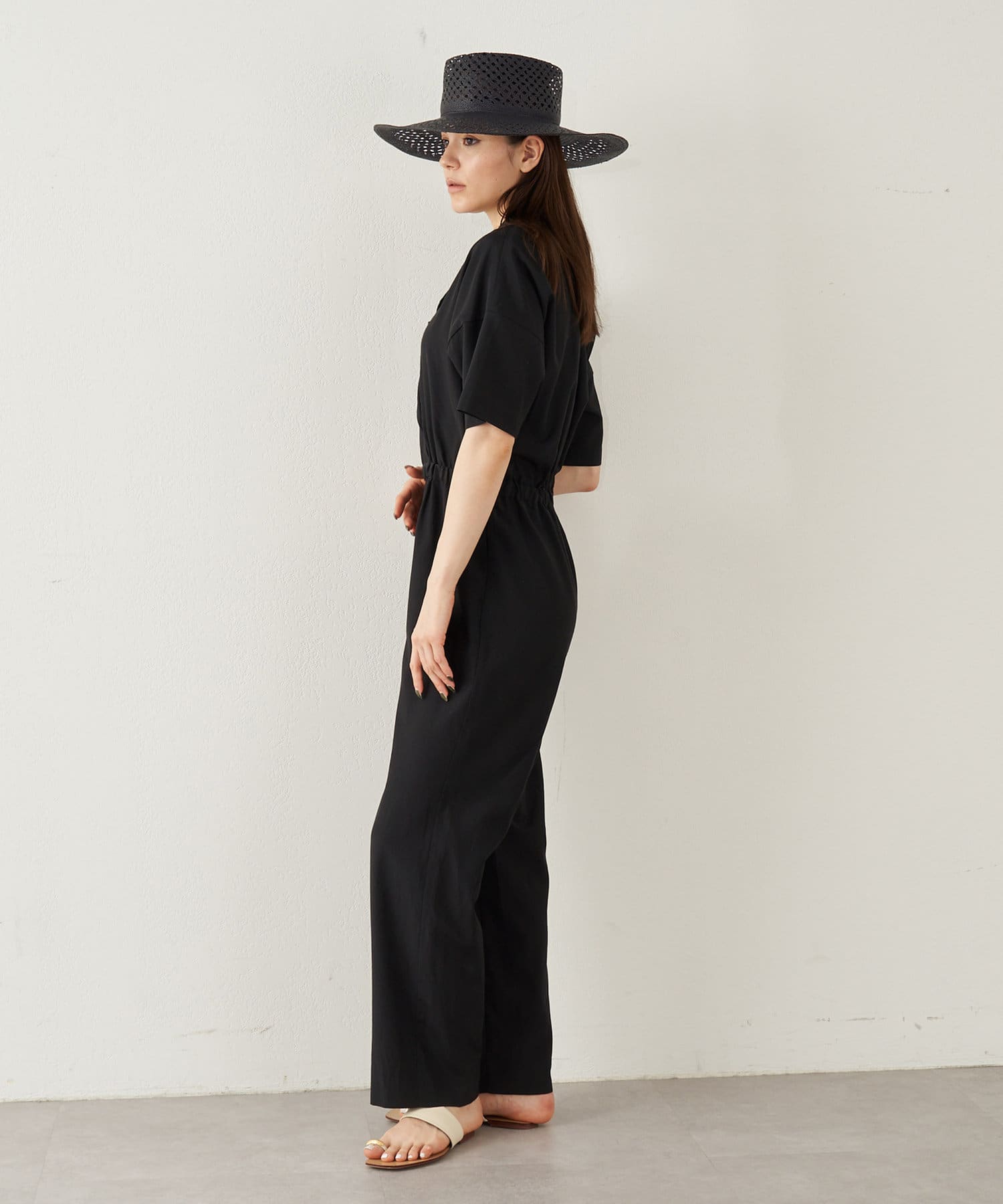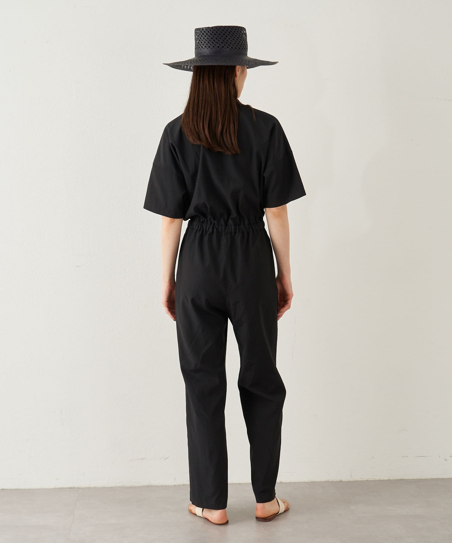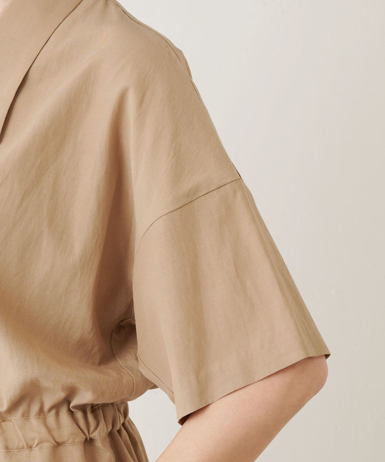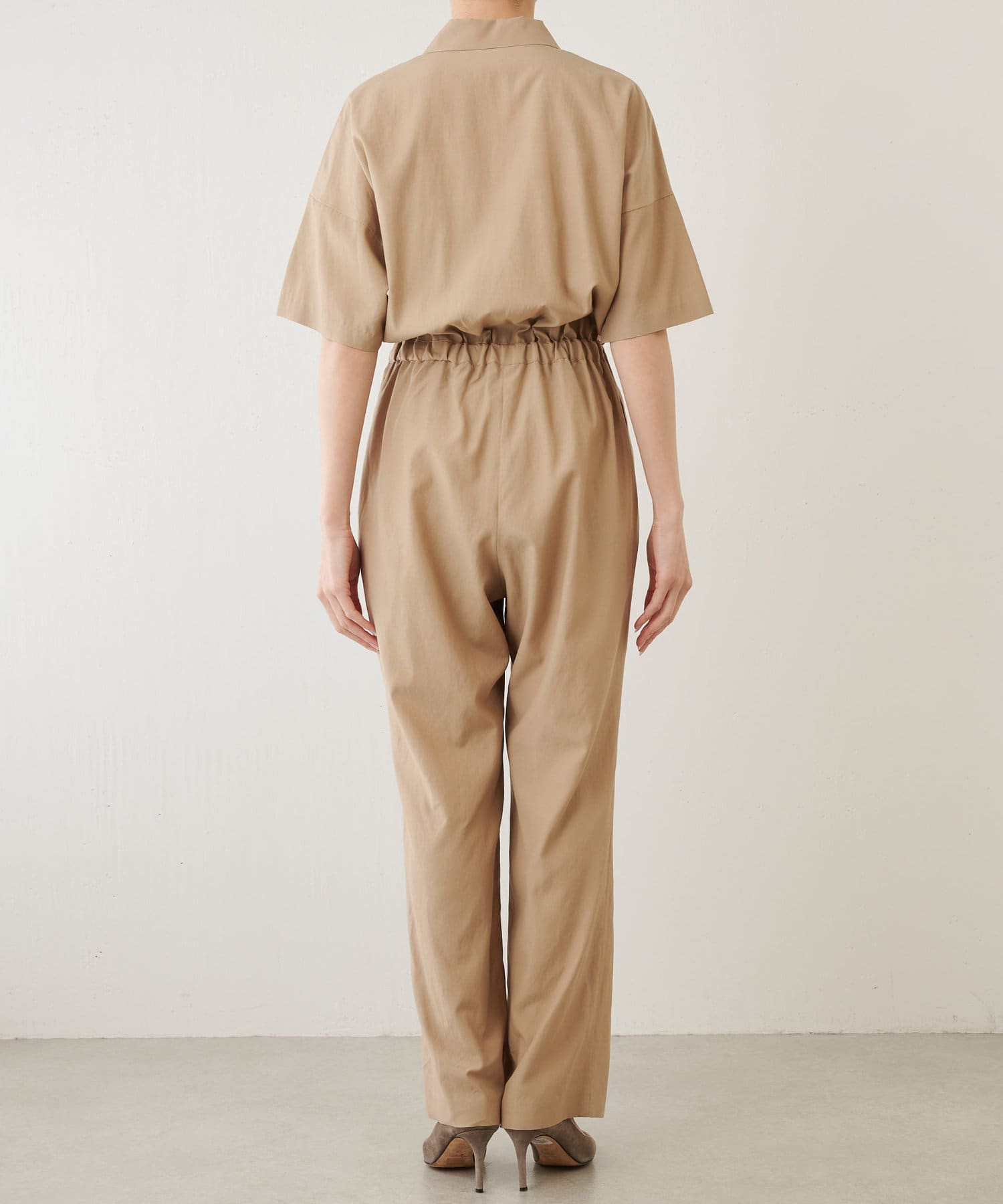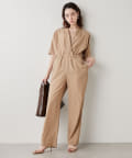 開襟のデザインがメンズっぽい雰囲気ながら、胸元の開きは女性らしさもあります。ウエスト位置は多少ゴムで調整していただけますが、少し上にしていただくとスタイルアップして見えますよ。足元をヒールにすればきれいめな雰囲気も楽しめます。