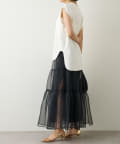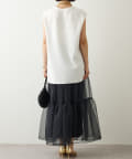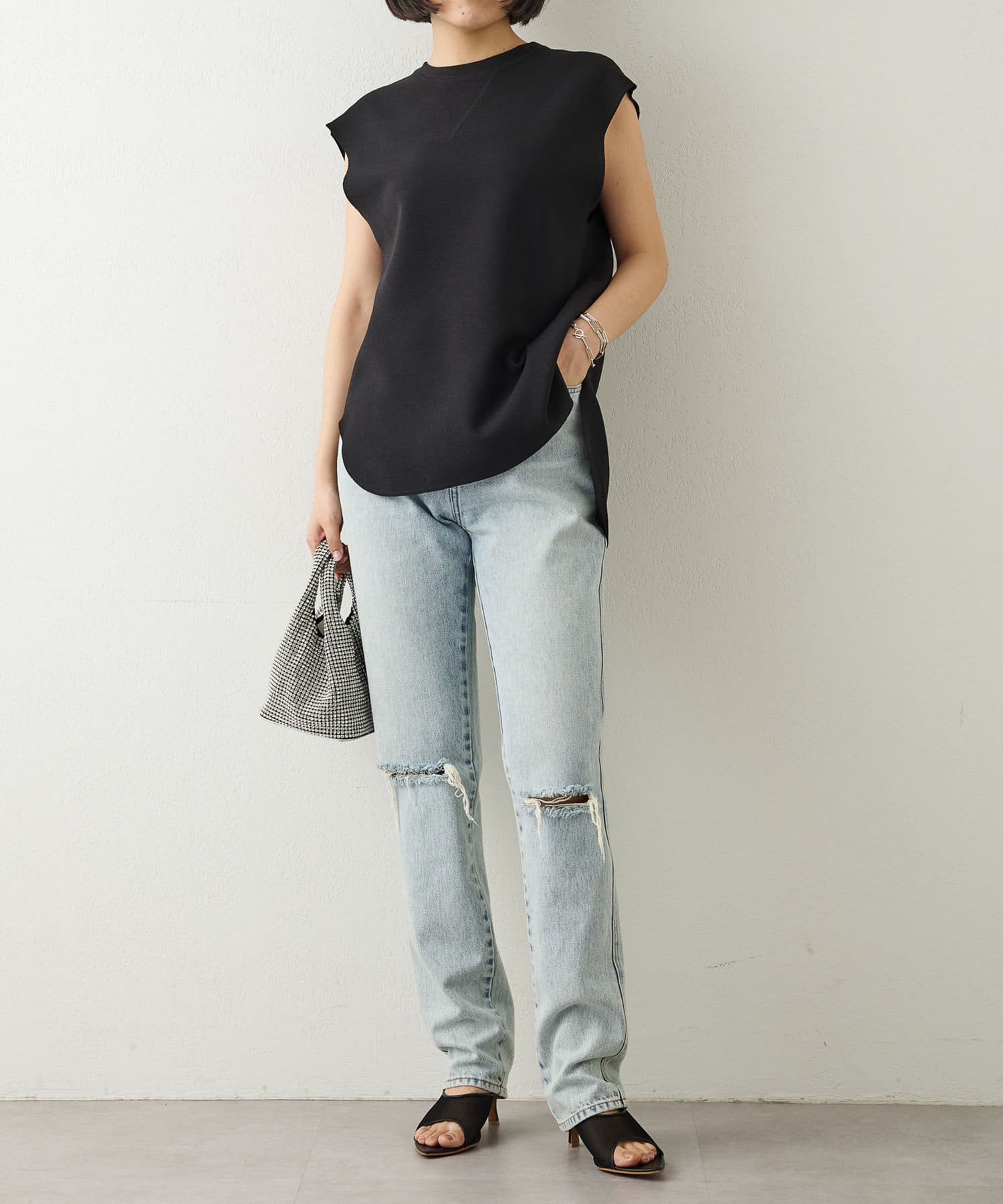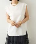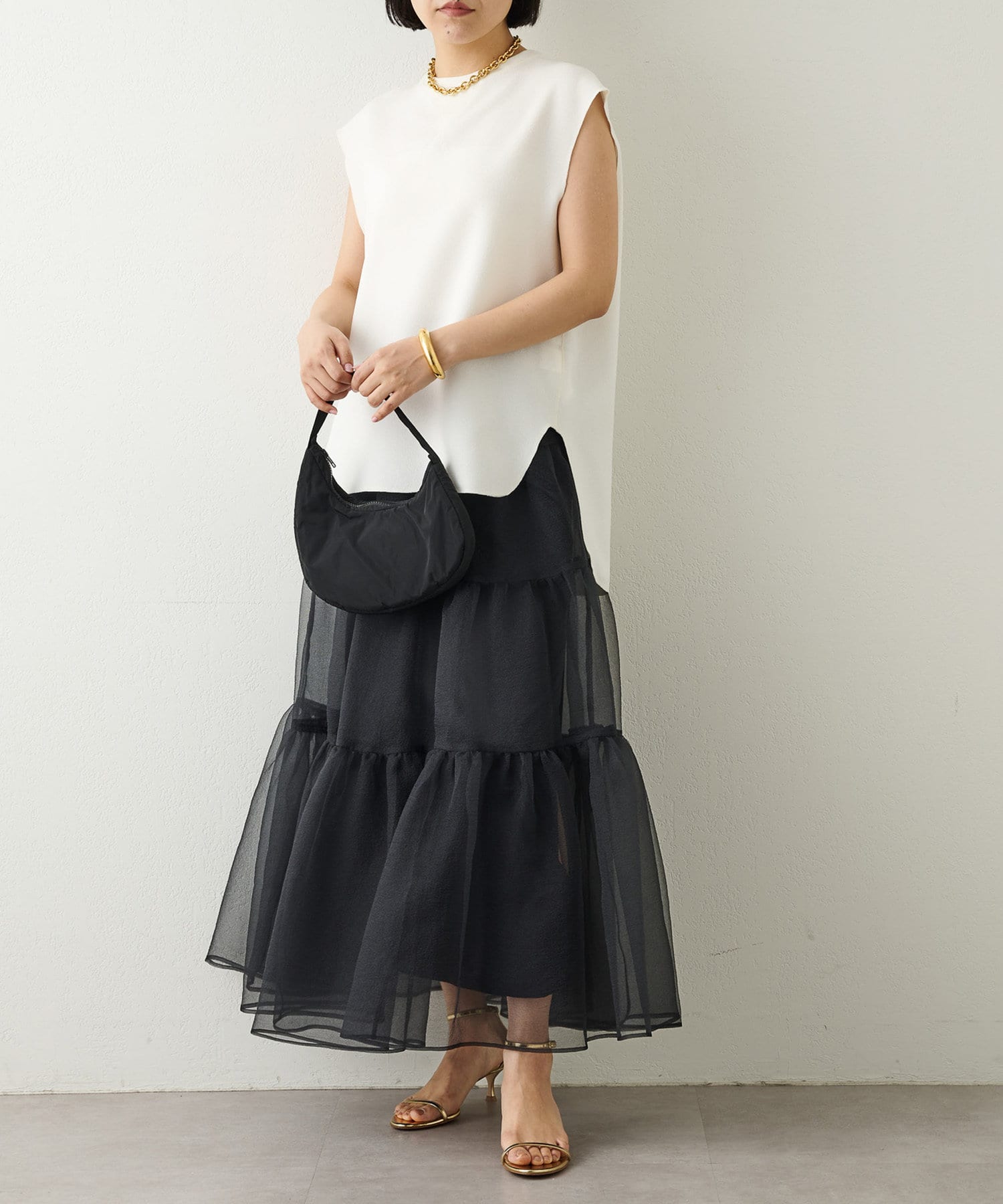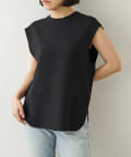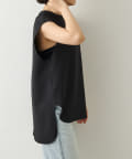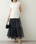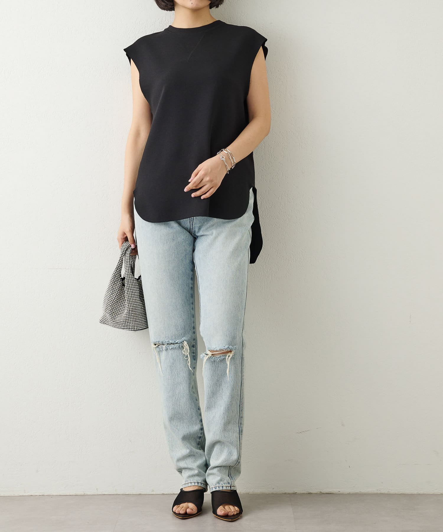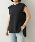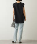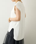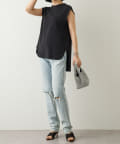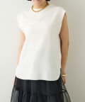 絶妙なオーバーシルエットに、肩をさりげなく覆うフレンチスリーブのようなデザインは体型カバーにもなり、一枚でも楽しみやすいですよ。前後差があるのでフロントだけボトムインするのも◎。