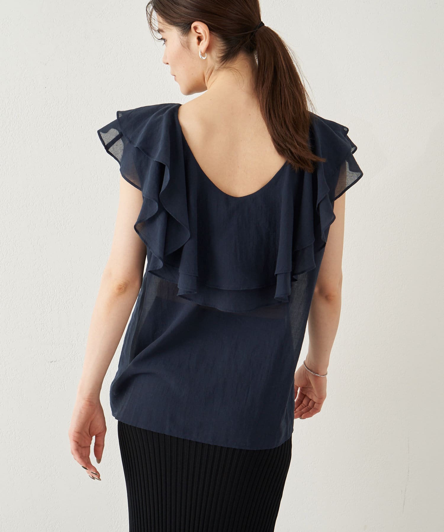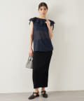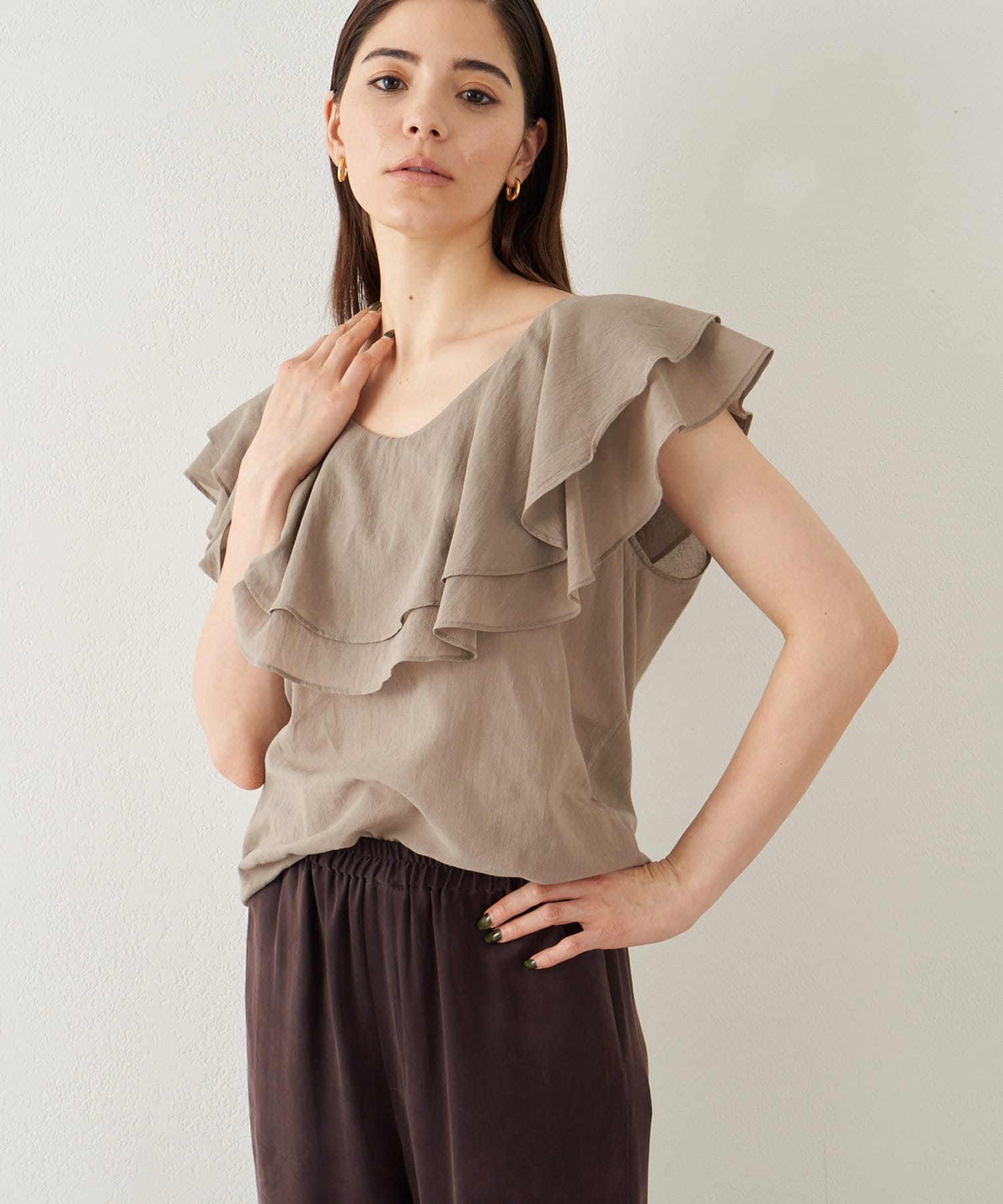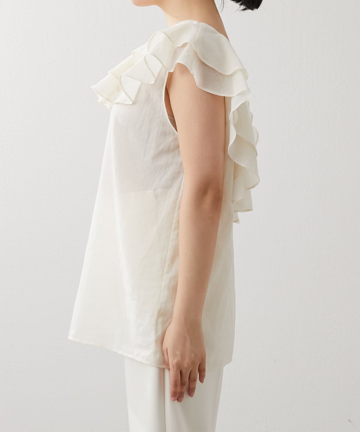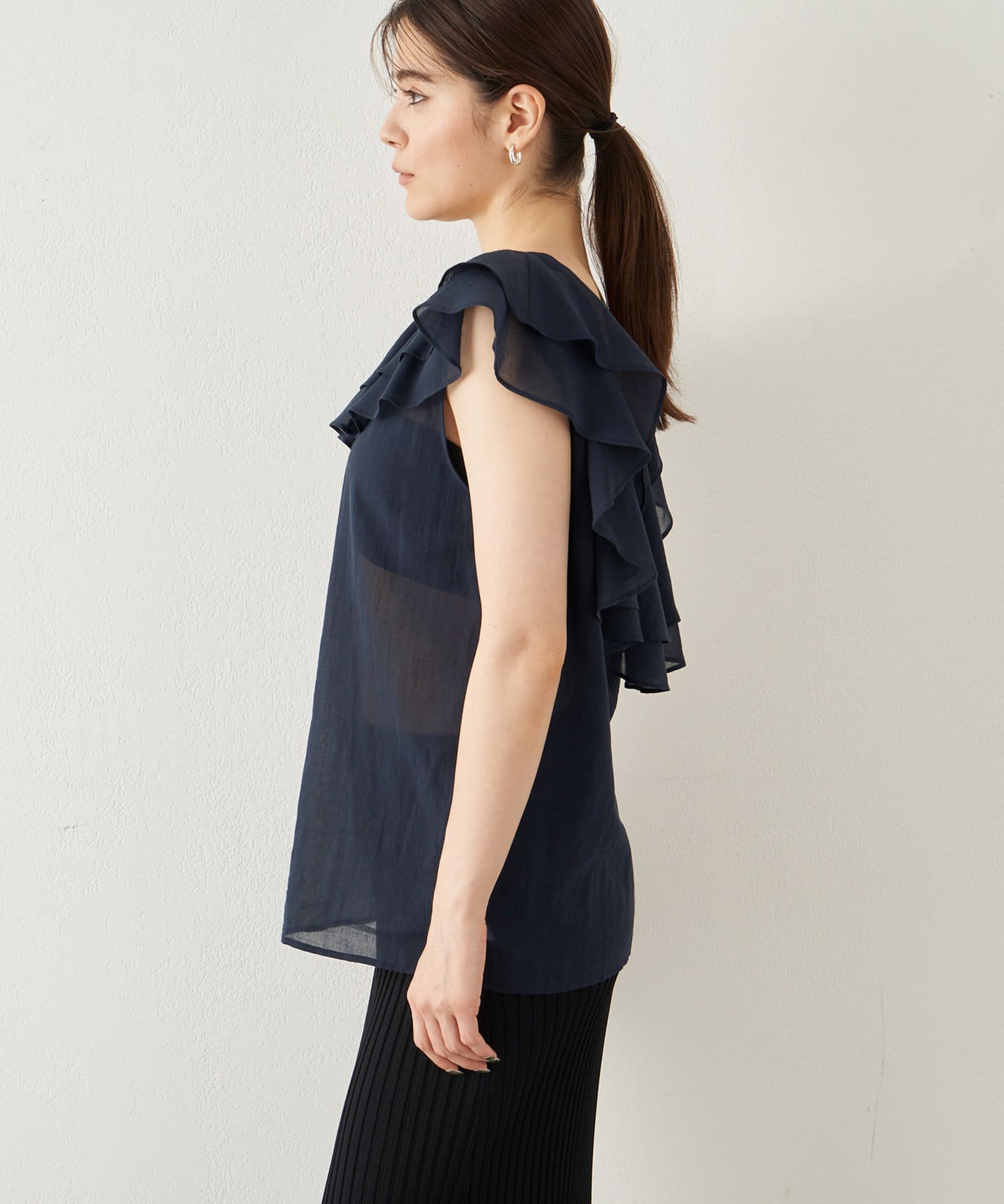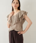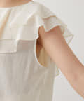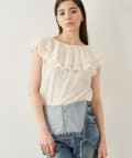 ■タックインでもアウトでもサマになり、一枚でスタイリングが華やぐ大人のフリルトップス。