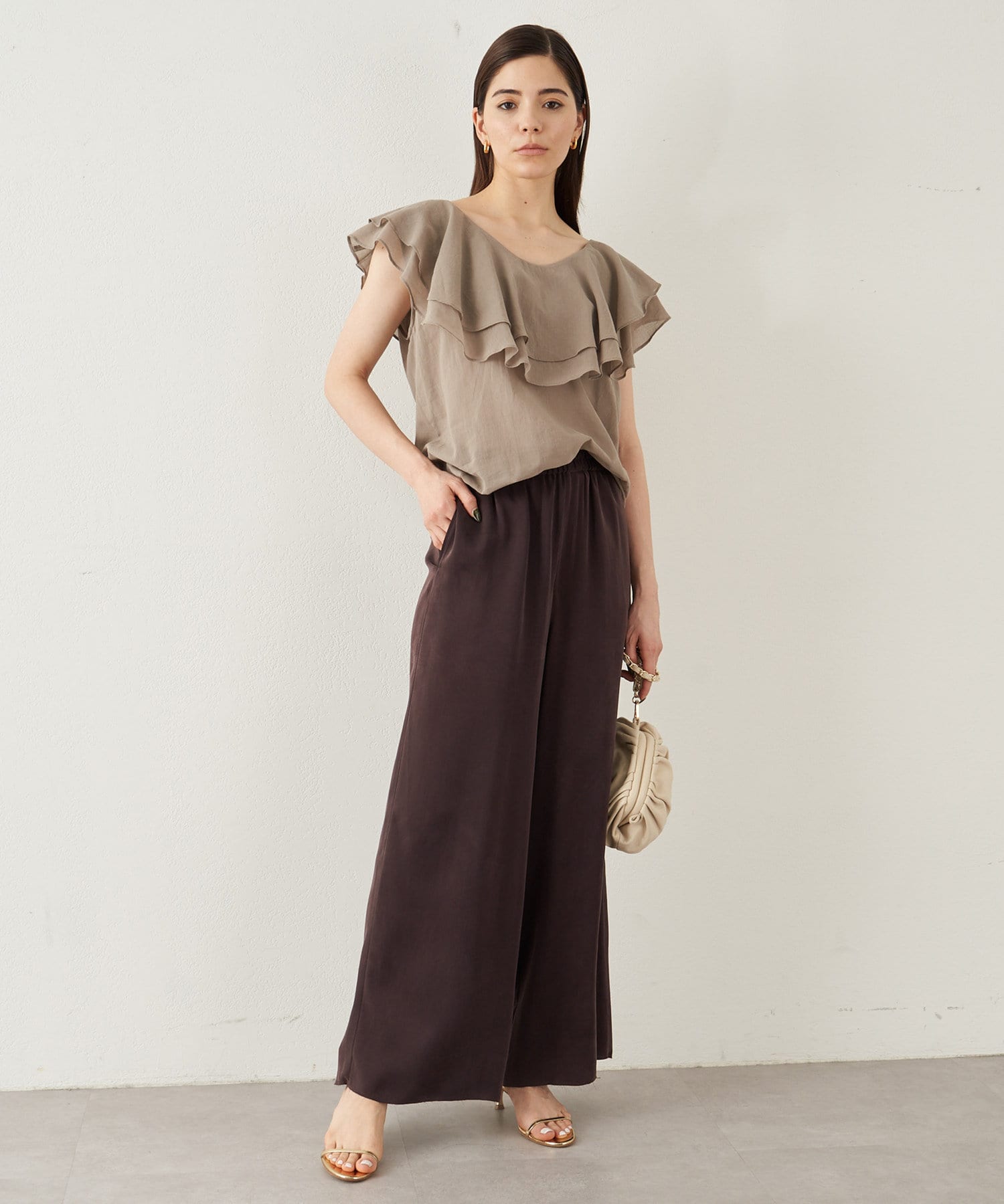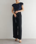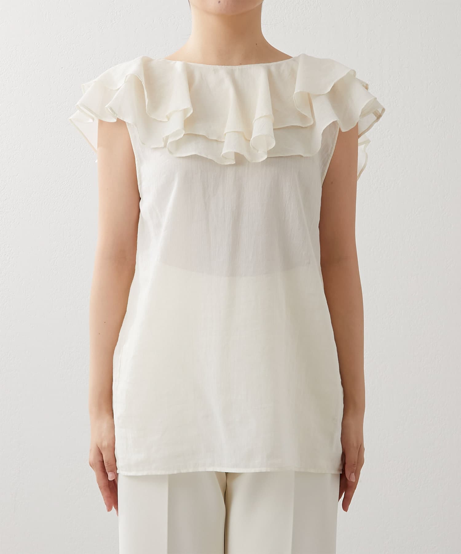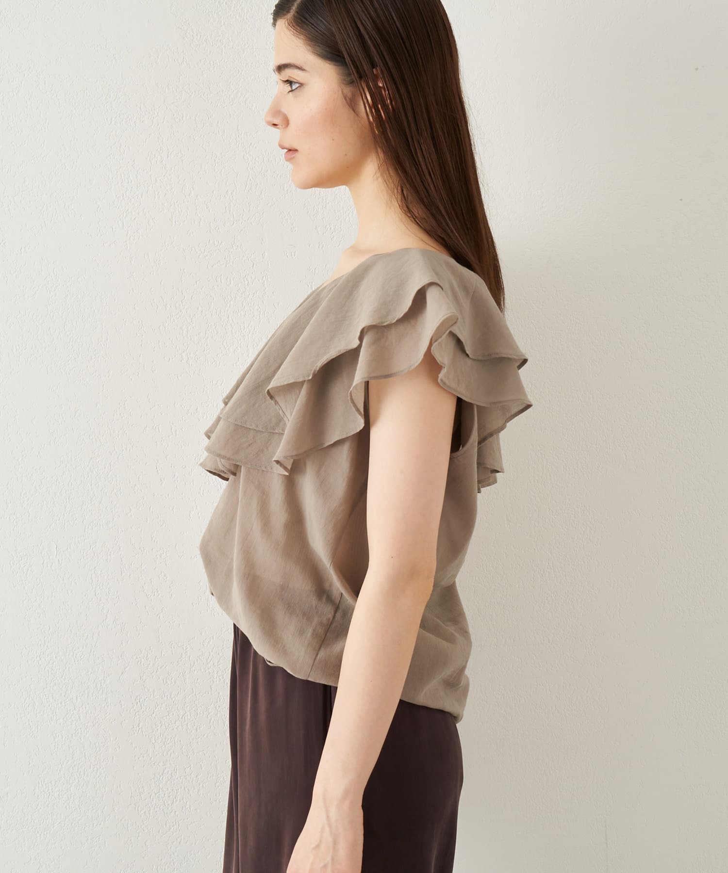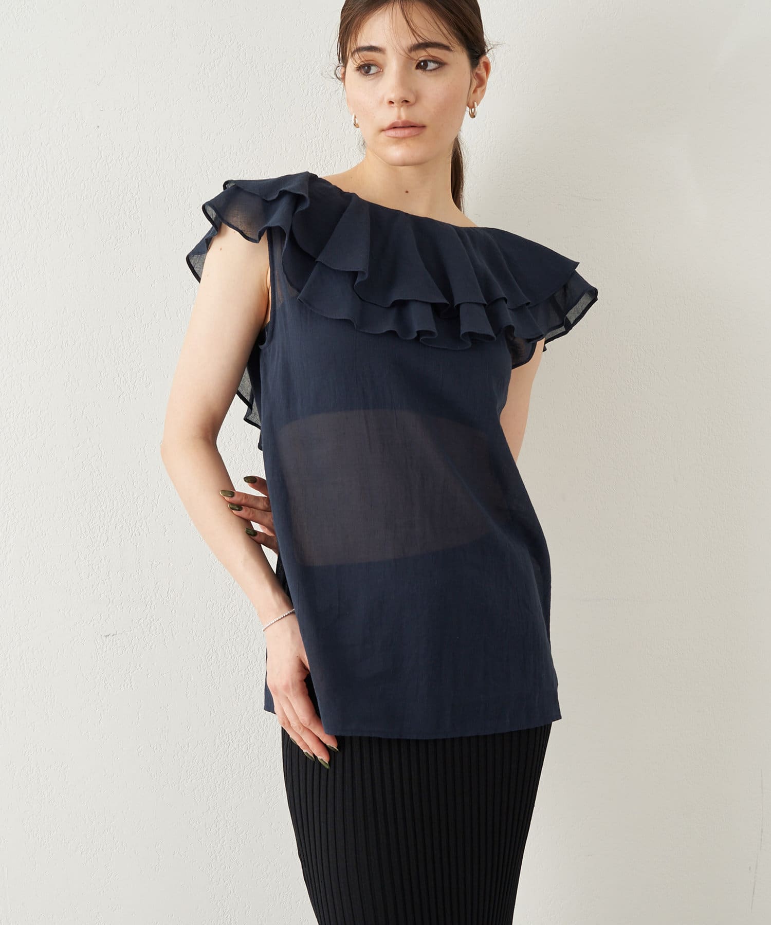 ■タックインでもアウトでもサマになり、一枚でスタイリングが華やぐ大人のフリルトップス。