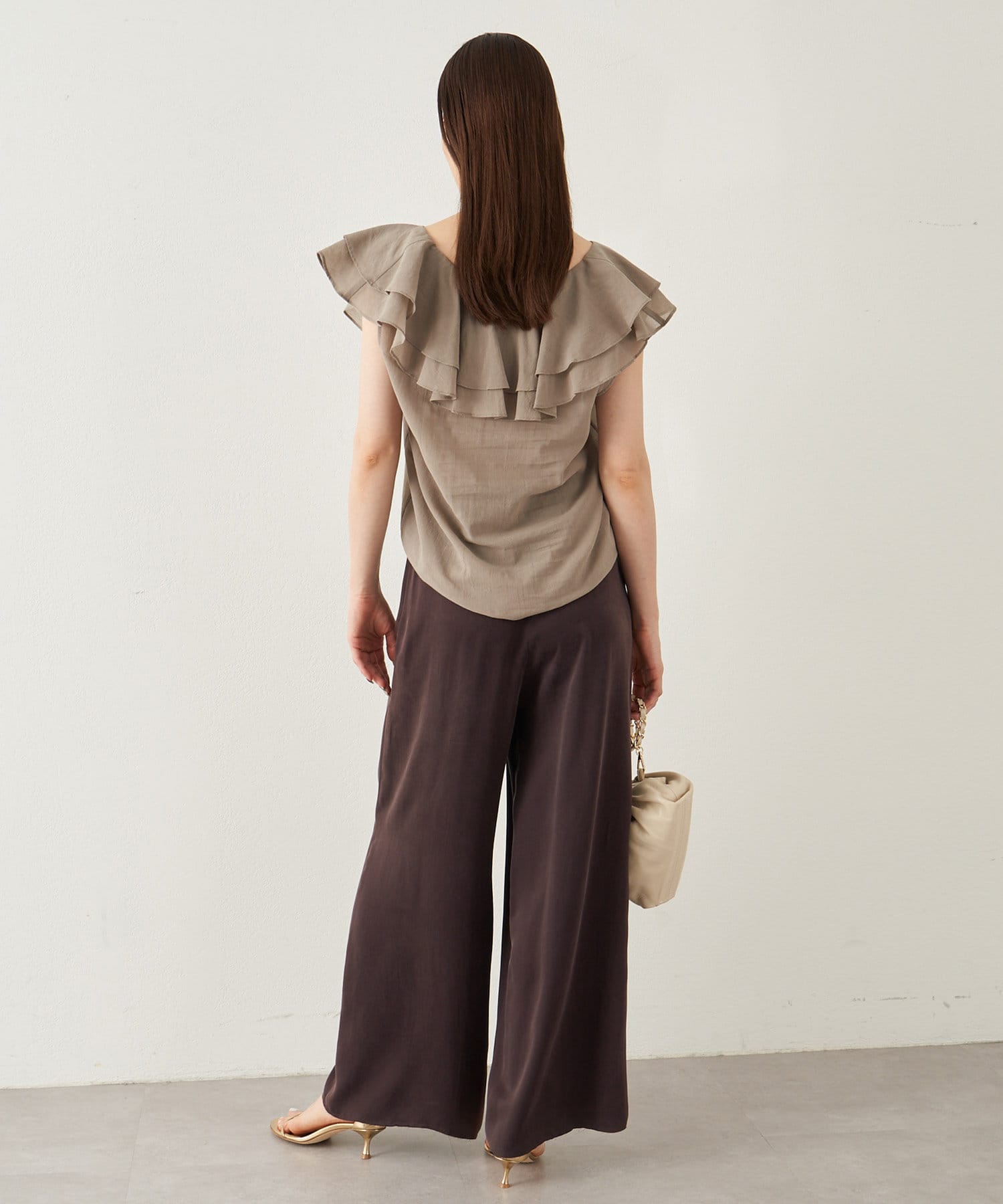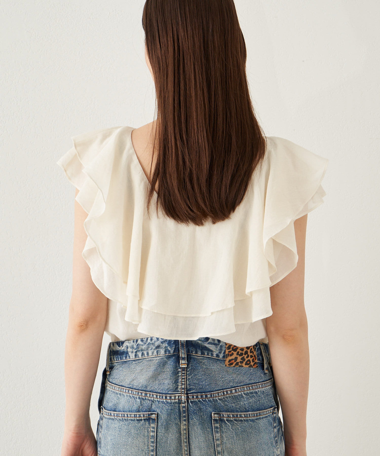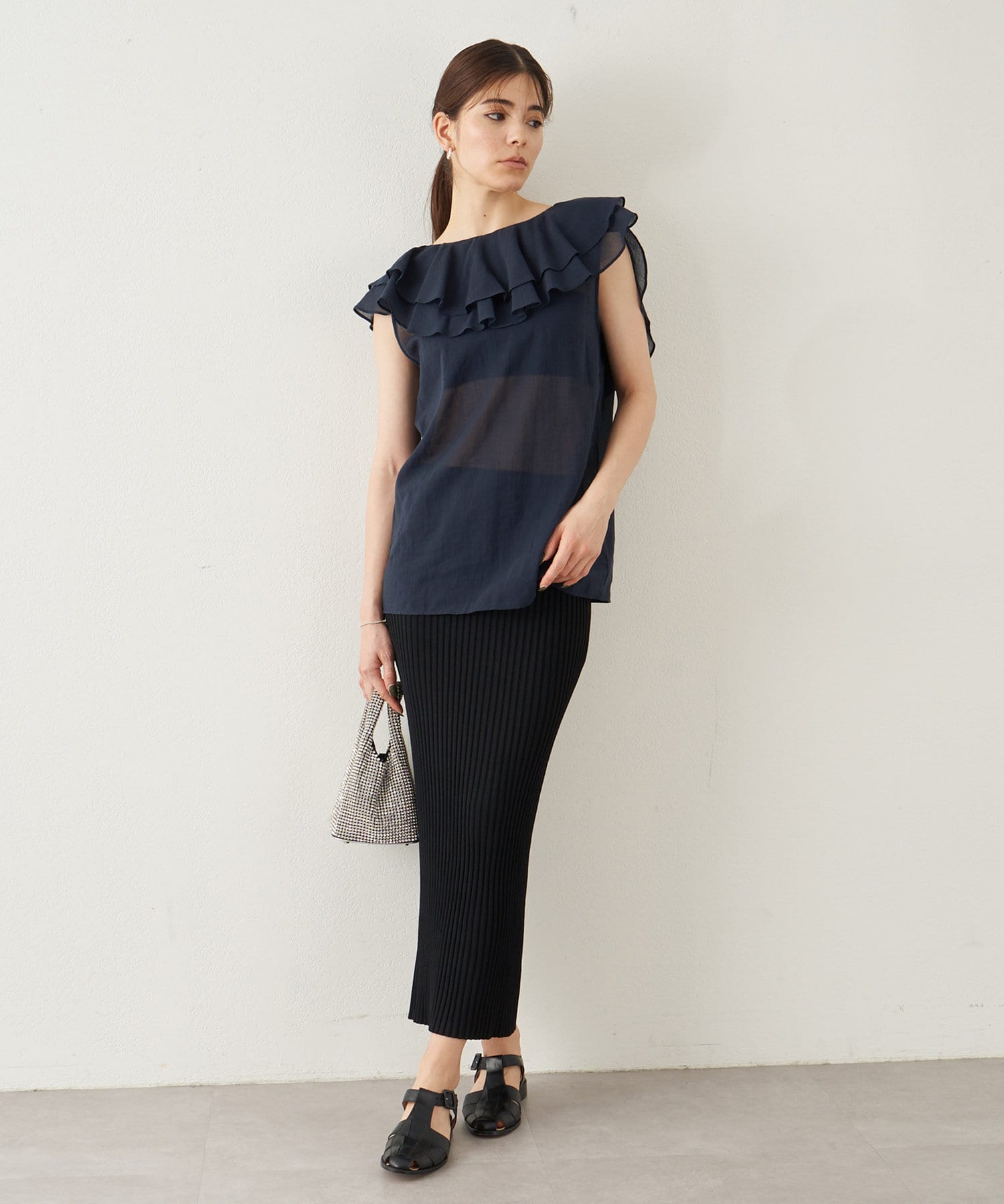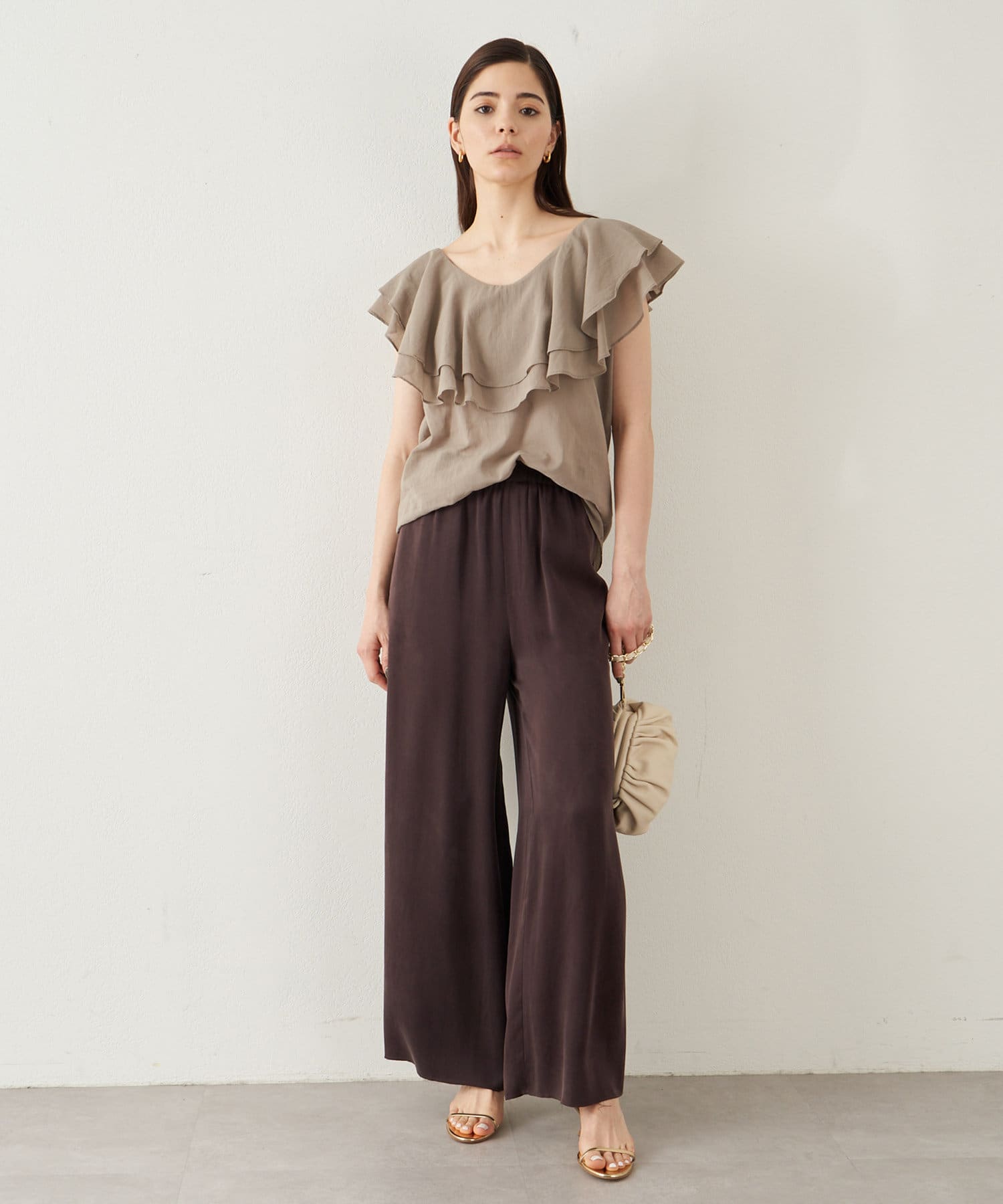 ■タックインでもアウトでもサマになり、一枚でスタイリングが華やぐ大人のフリルトップス。