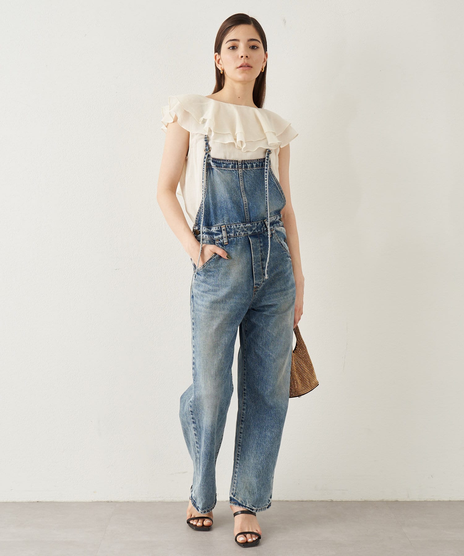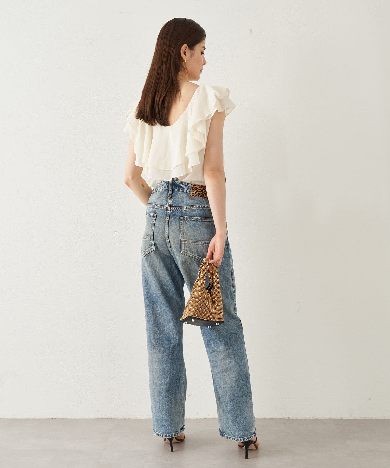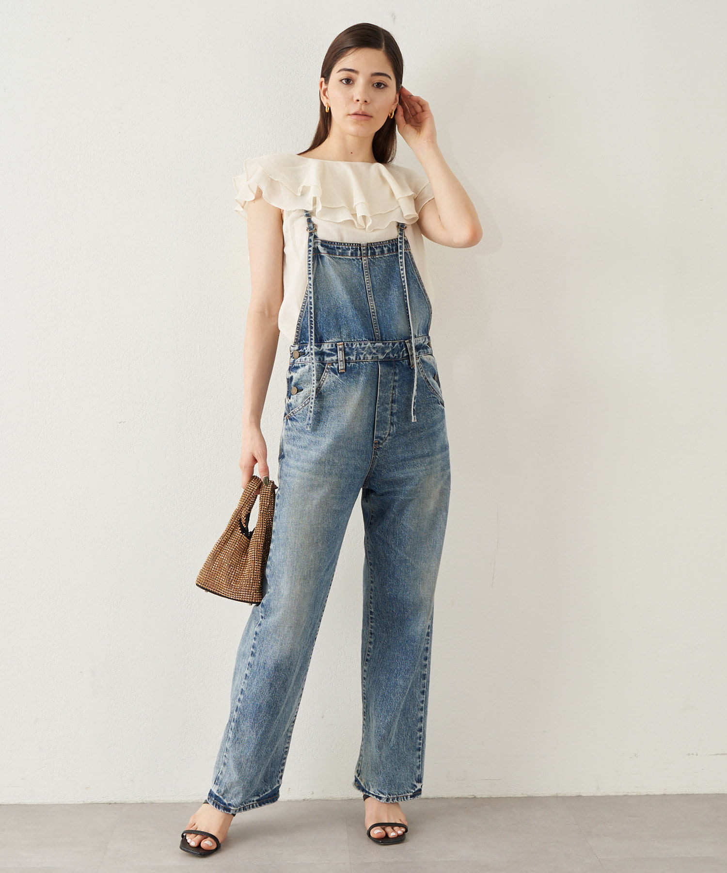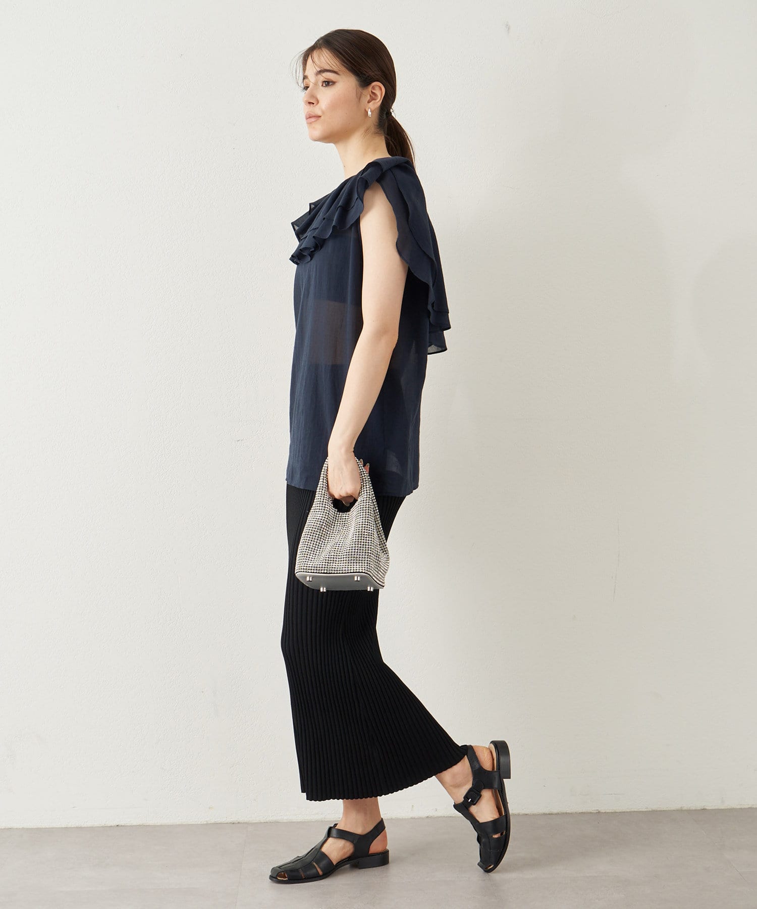 ■タックインでもアウトでもサマになり、一枚でスタイリングが華やぐ大人のフリルトップス。