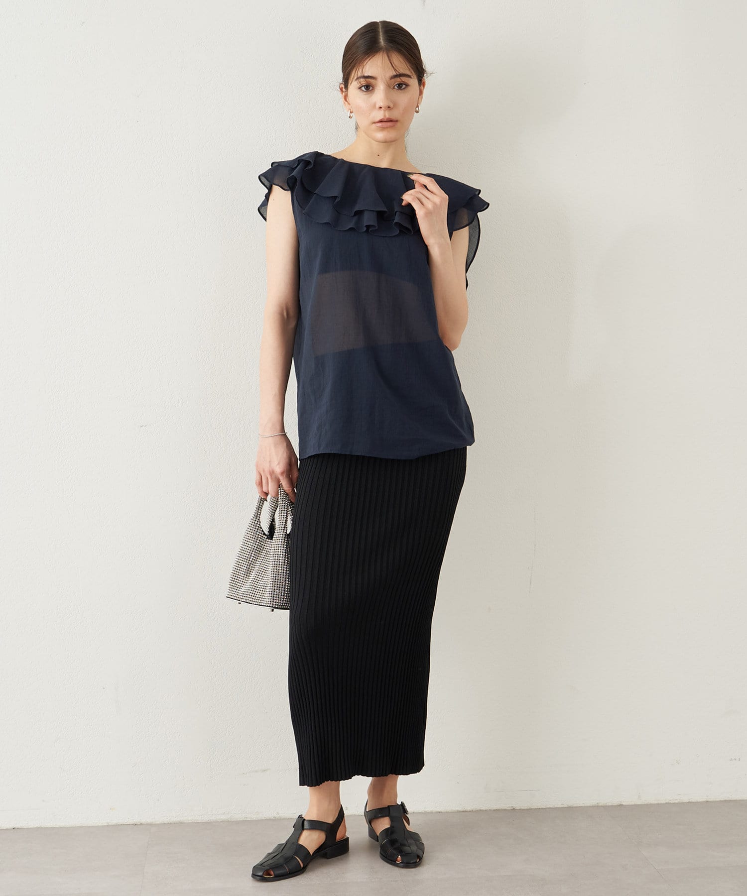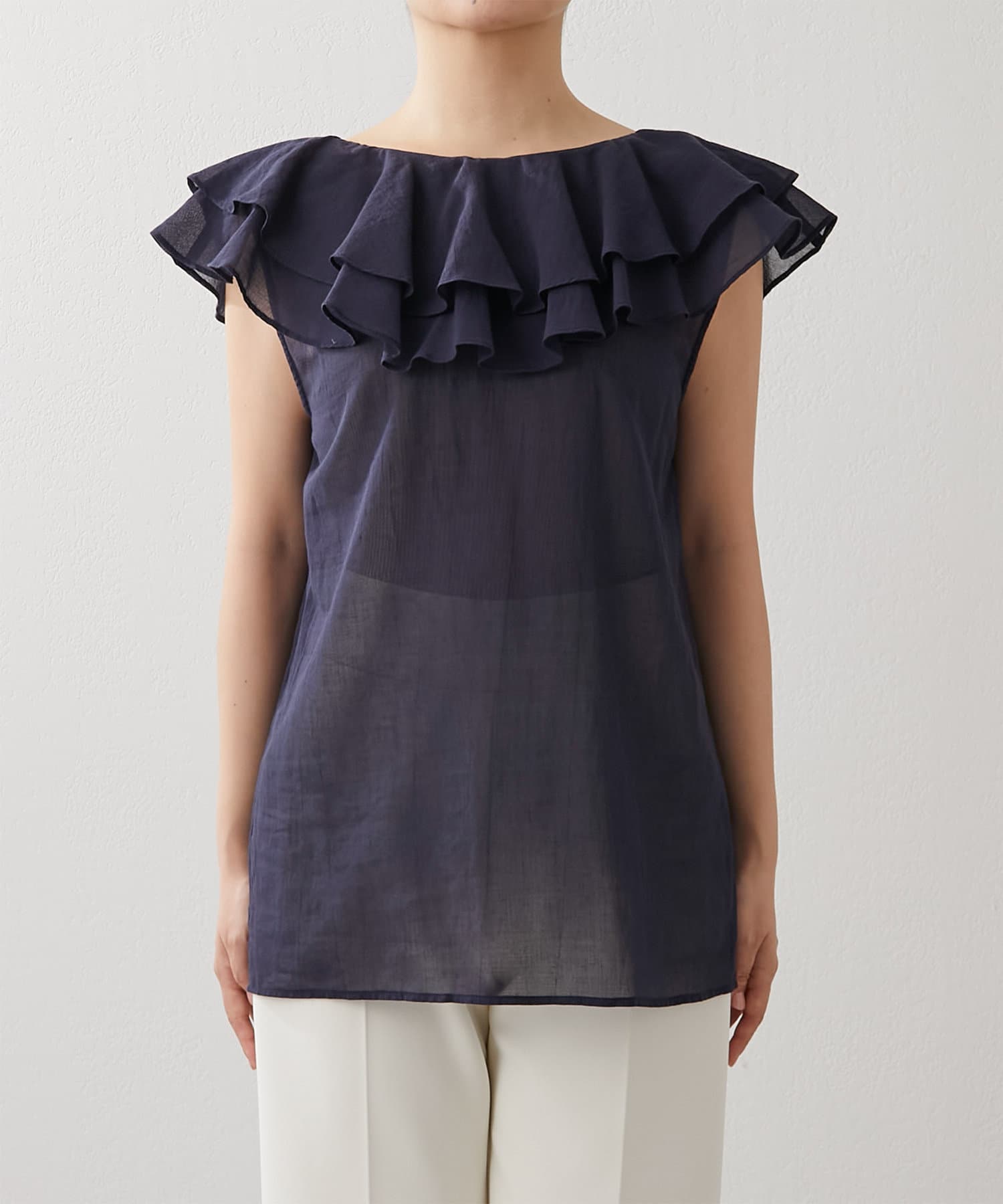 ■美しいフリルを描くビッグカラーが印象的なノースリーブブラウス。