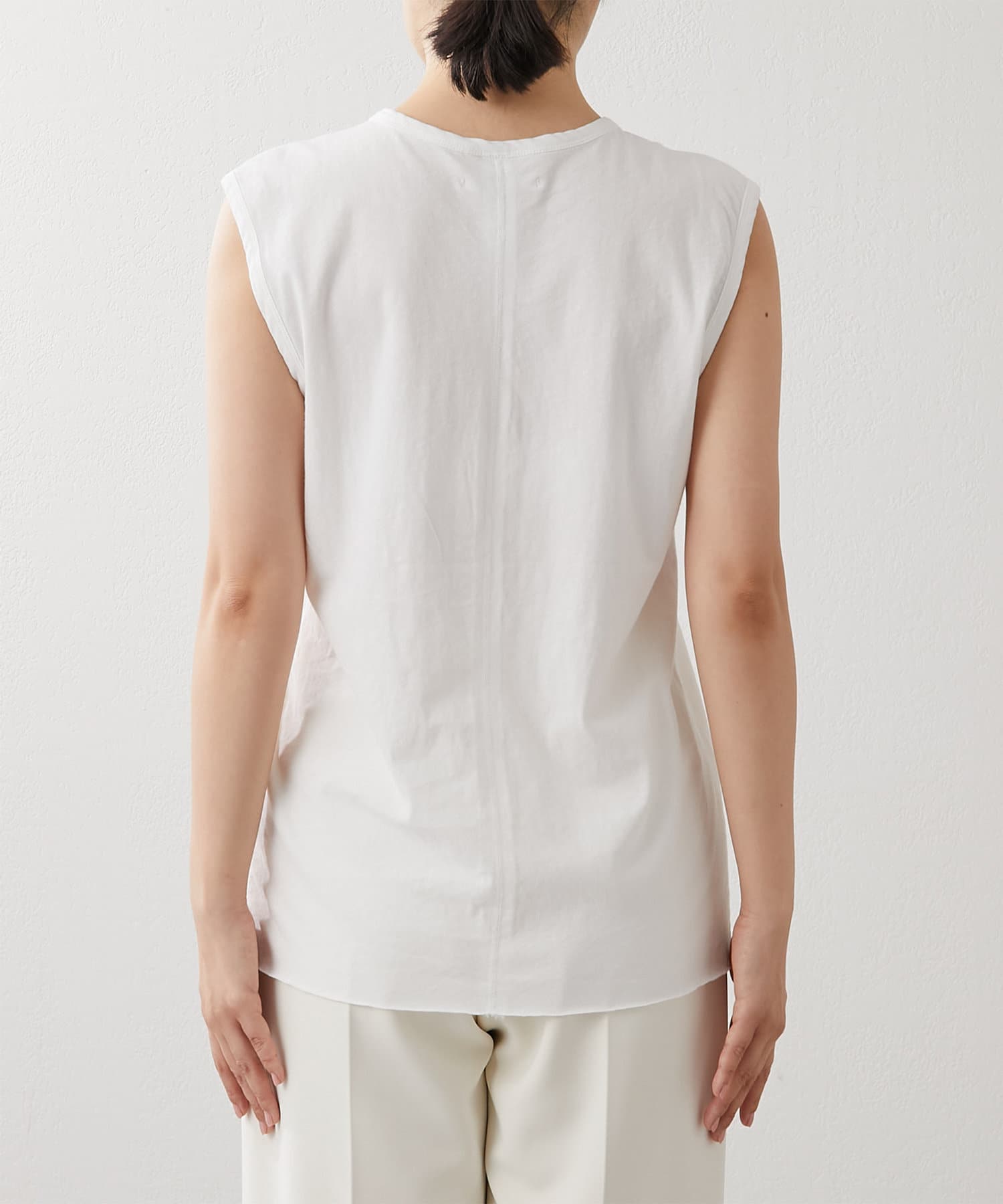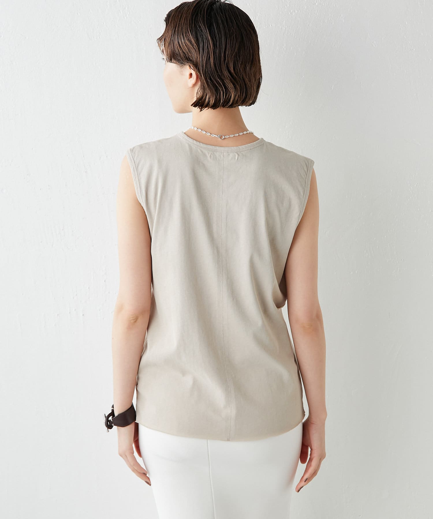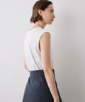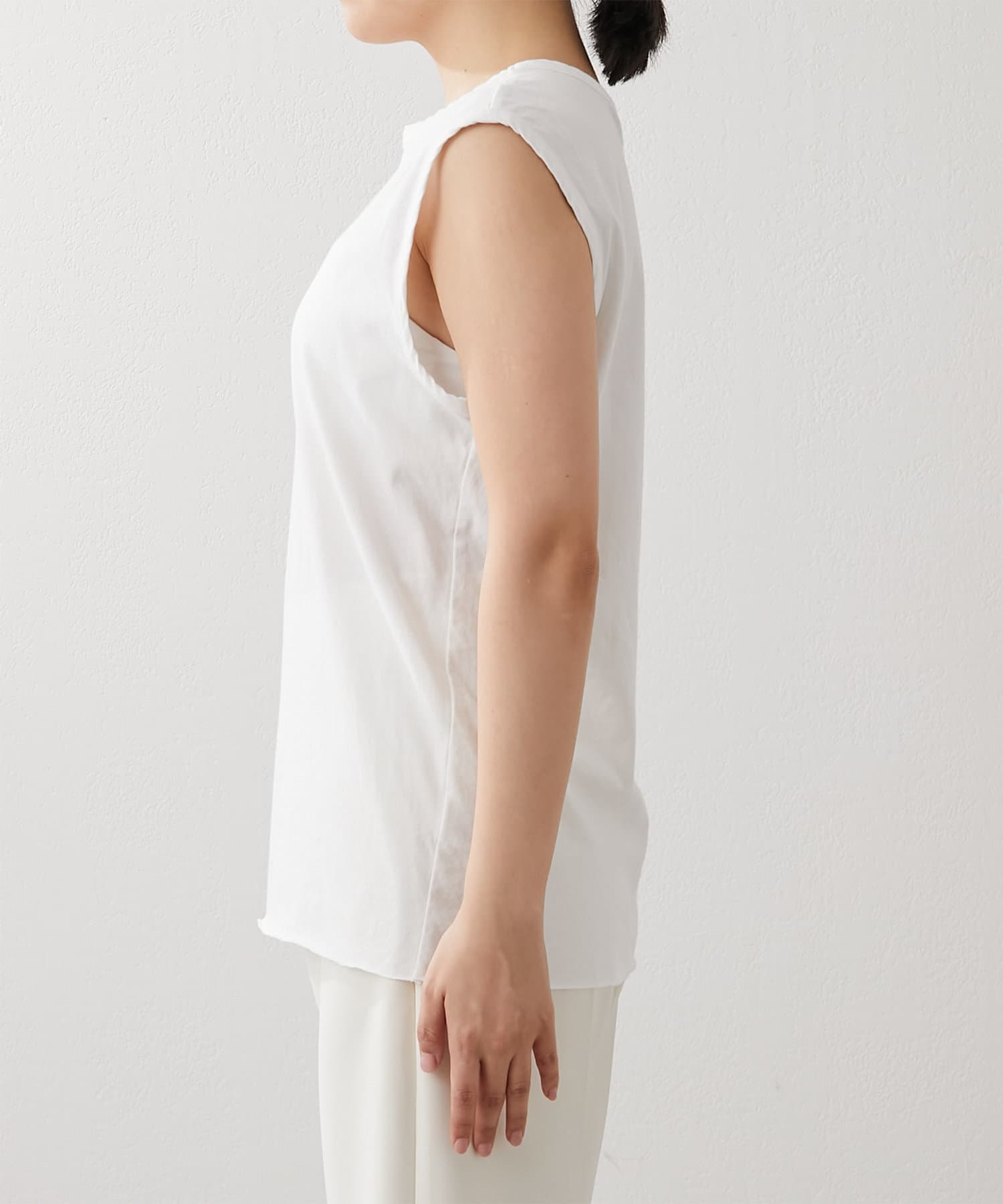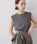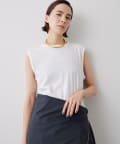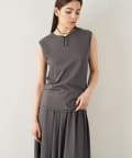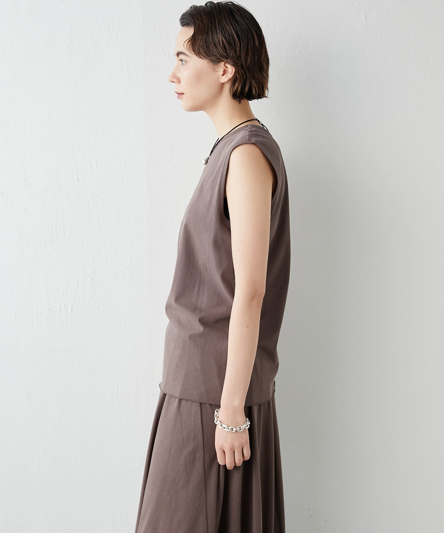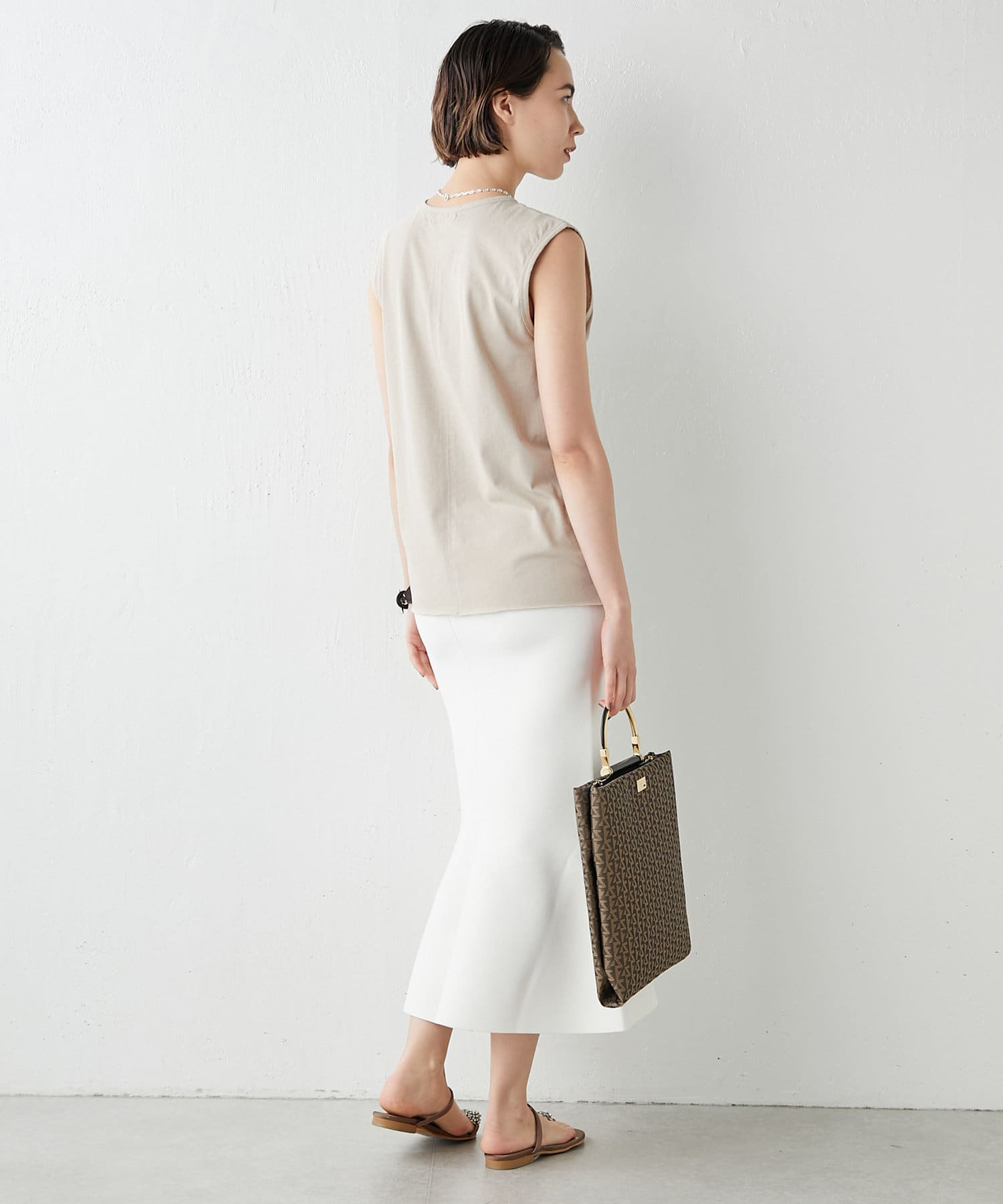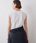 ノースリーブより少し肩先まで隠れるフレンチスリーブになっていて、少しの差ですが、これが腕を細く見せてくれるポイントになっています。同素材でスカートも有りますので、セットアップでワンピのようにも着られます◎