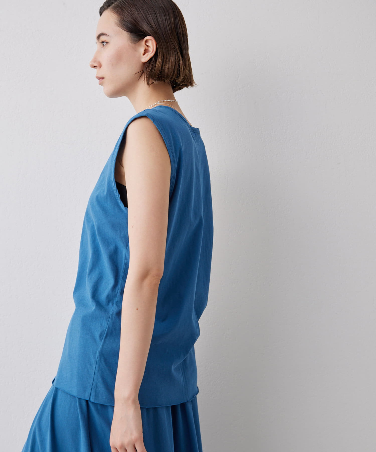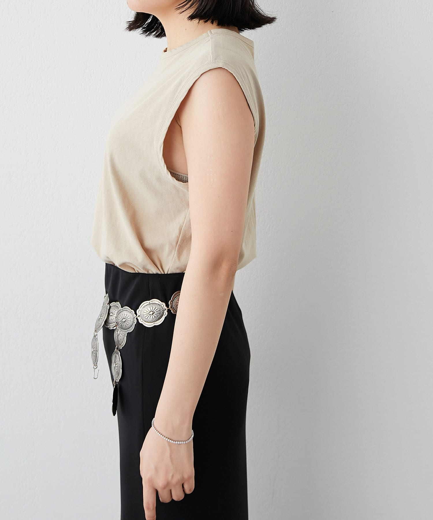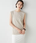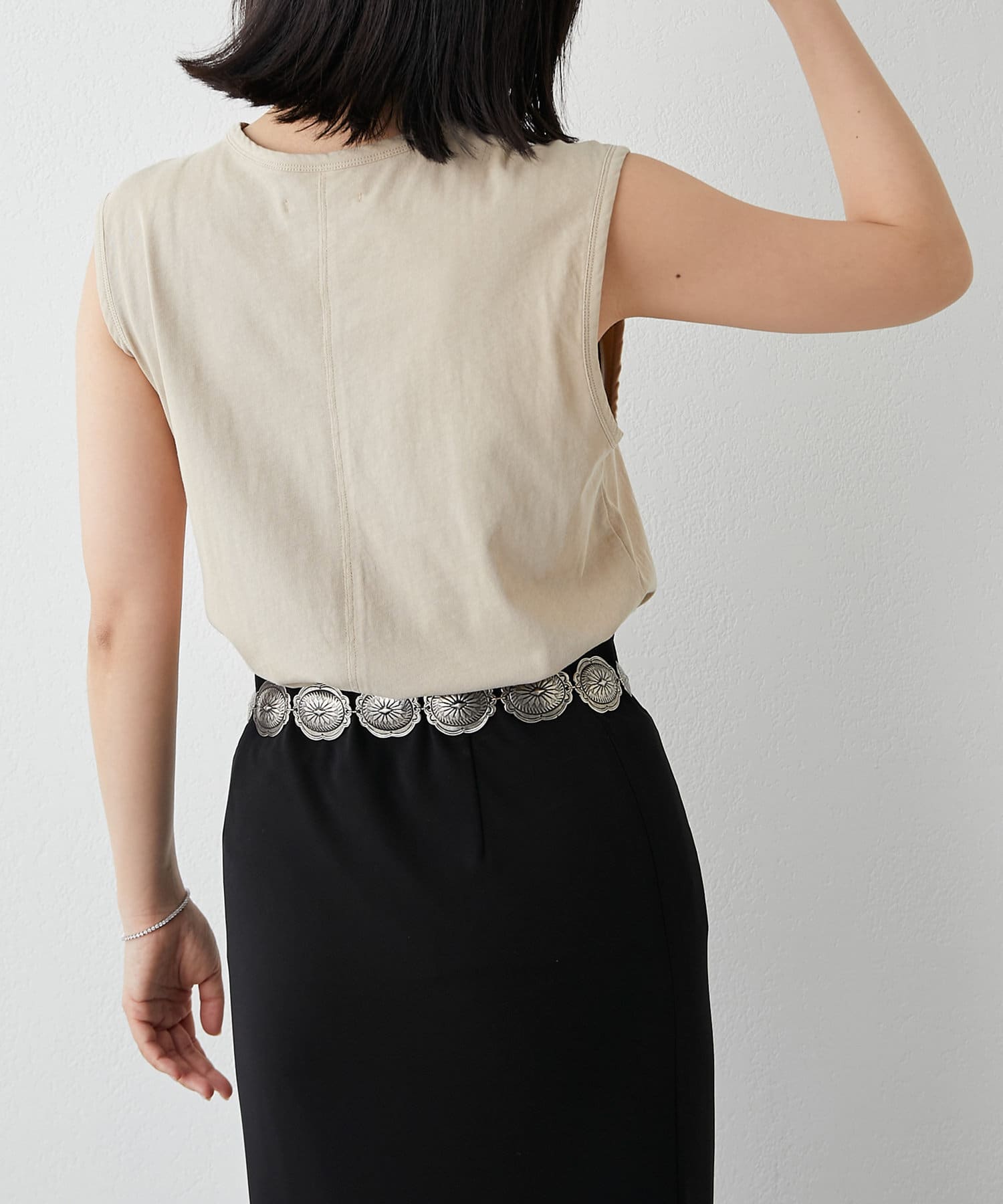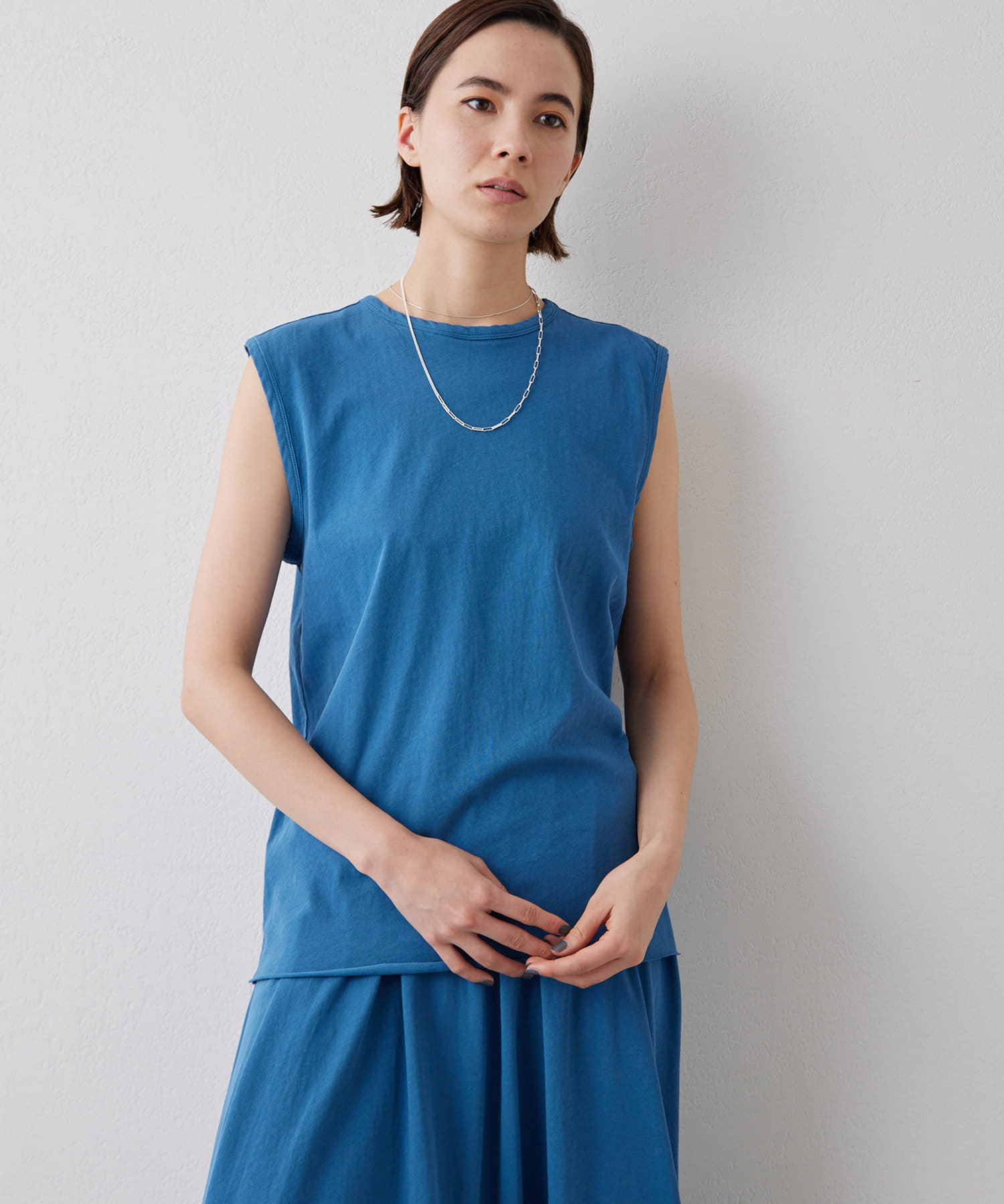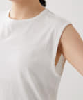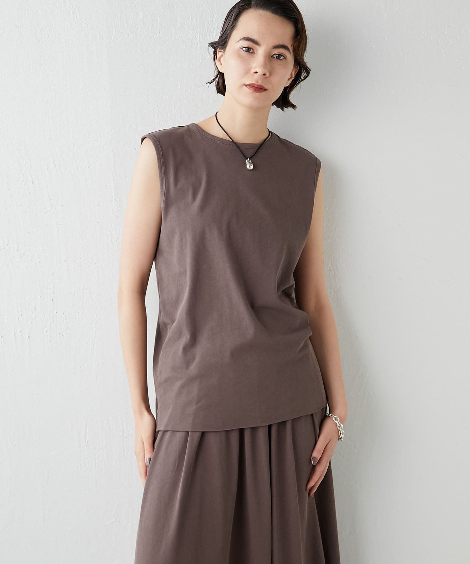 ノースリーブより少し肩先まで隠れるフレンチスリーブになっていて、少しの差ですが、これが腕を細く見せてくれるポイントになっています。同素材でスカートも有りますので、セットアップでワンピのようにも着られます◎