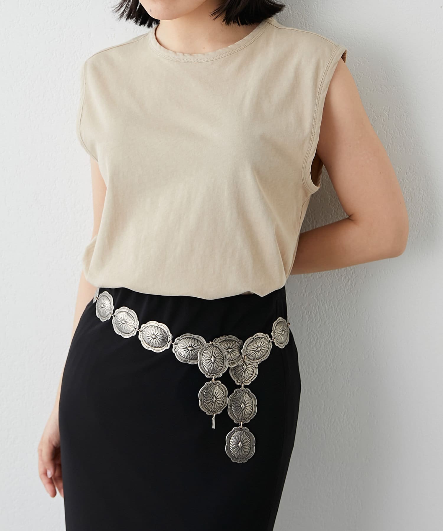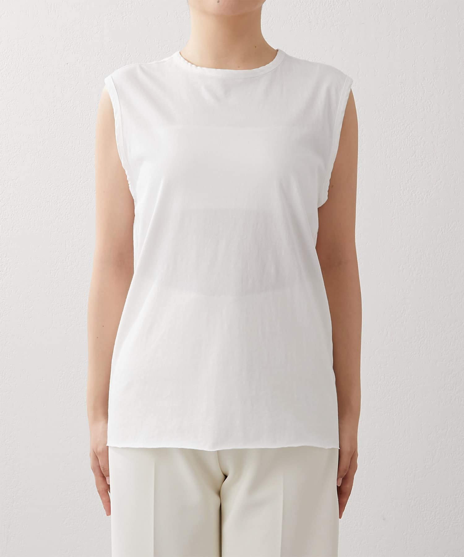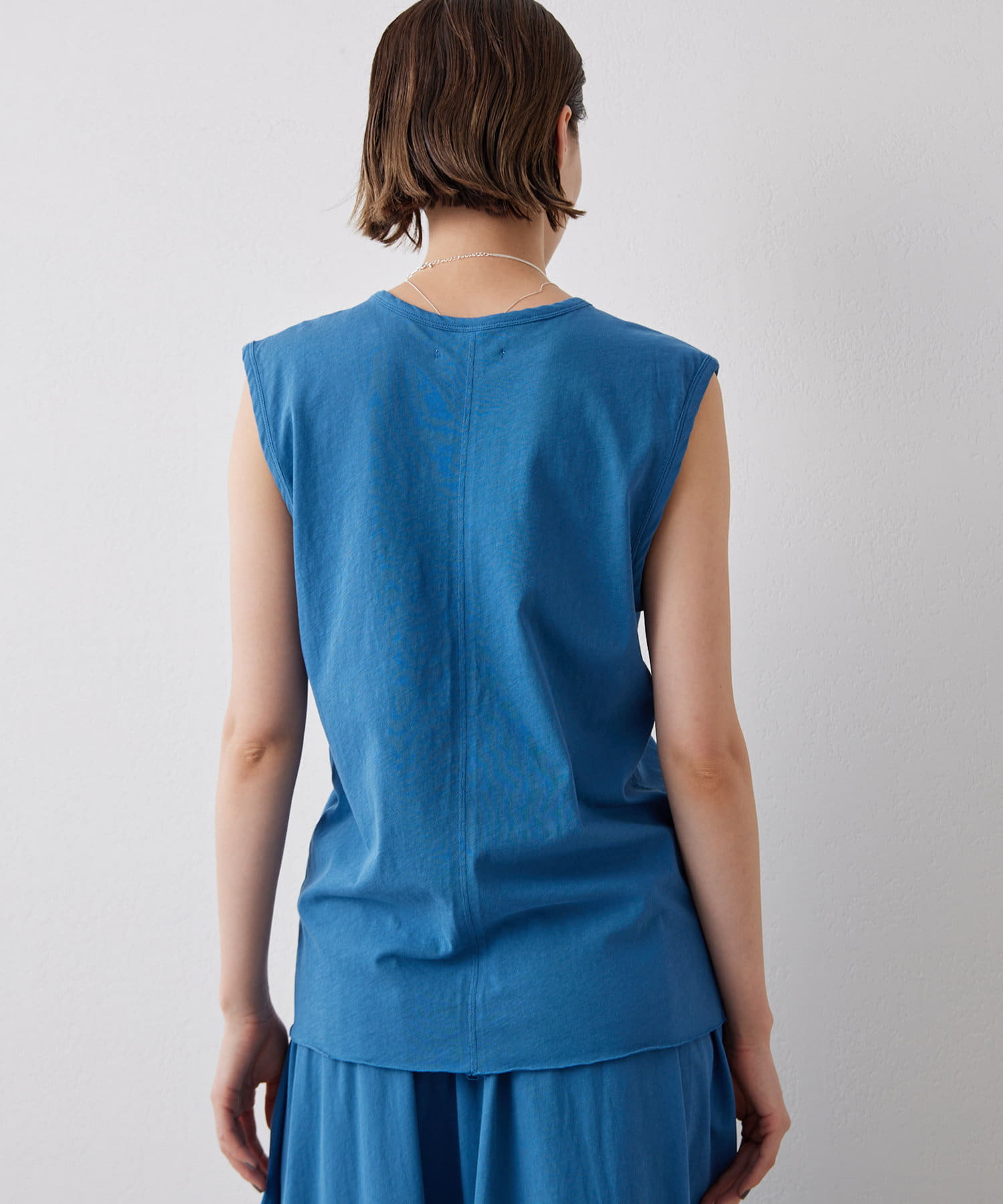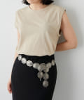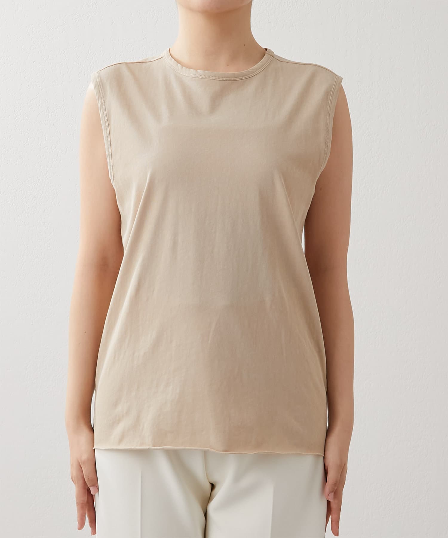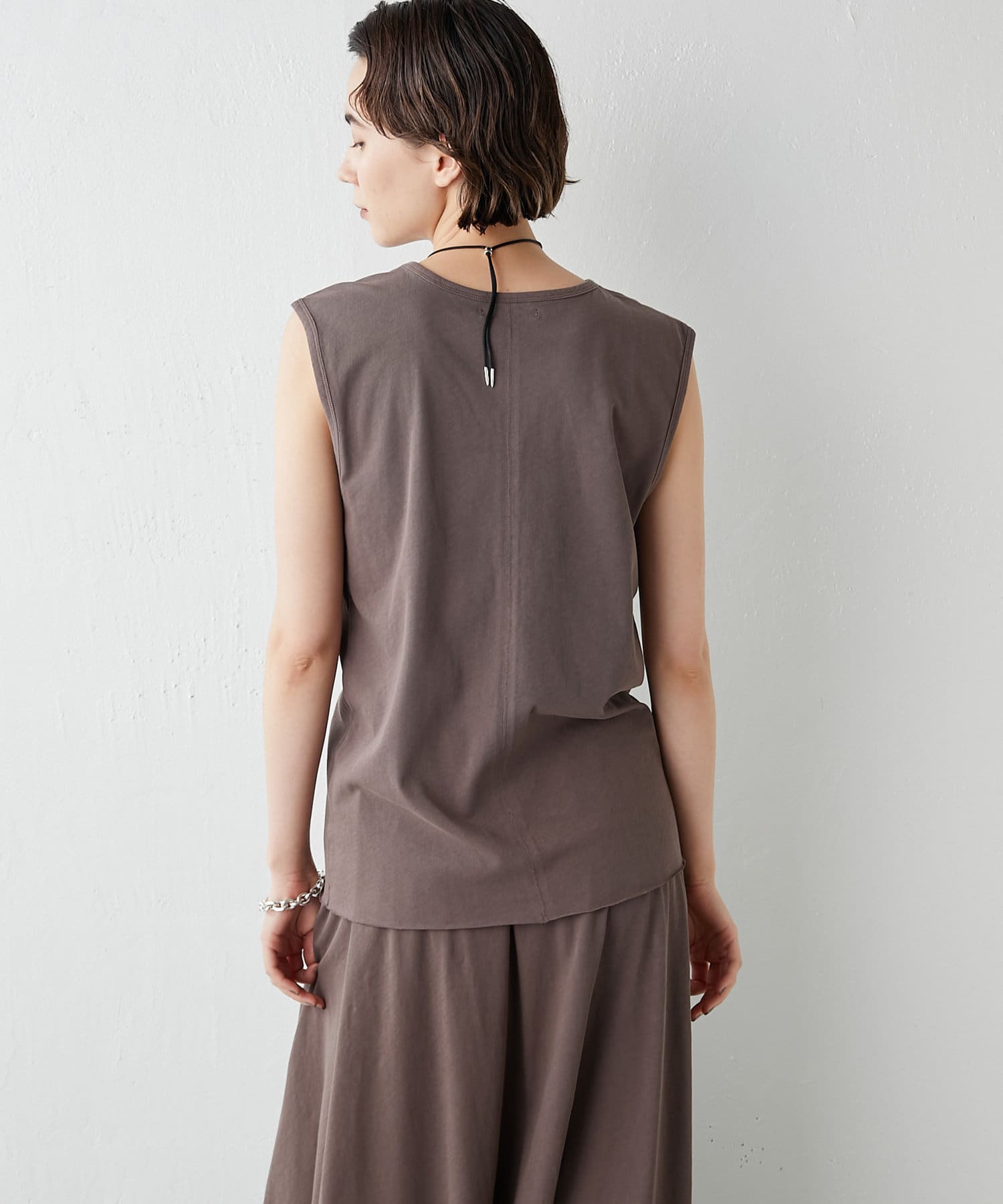 ノースリーブより少し肩先まで隠れるフレンチスリーブになっていて、少しの差ですが、これが腕を細く見せてくれるポイントになっています。同素材でスカートも有りますので、セットアップでワンピのようにも着られます◎