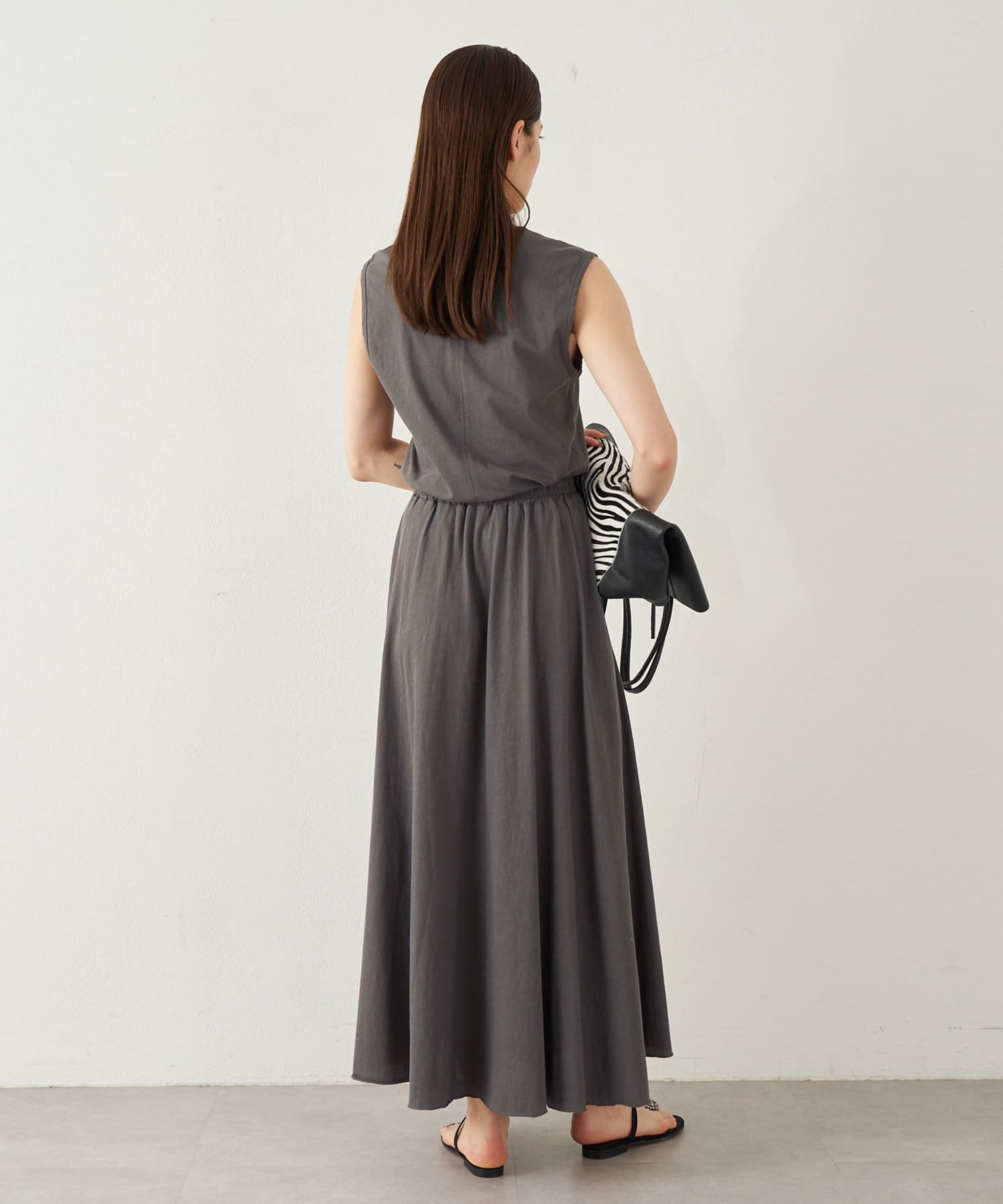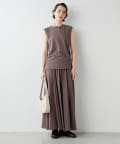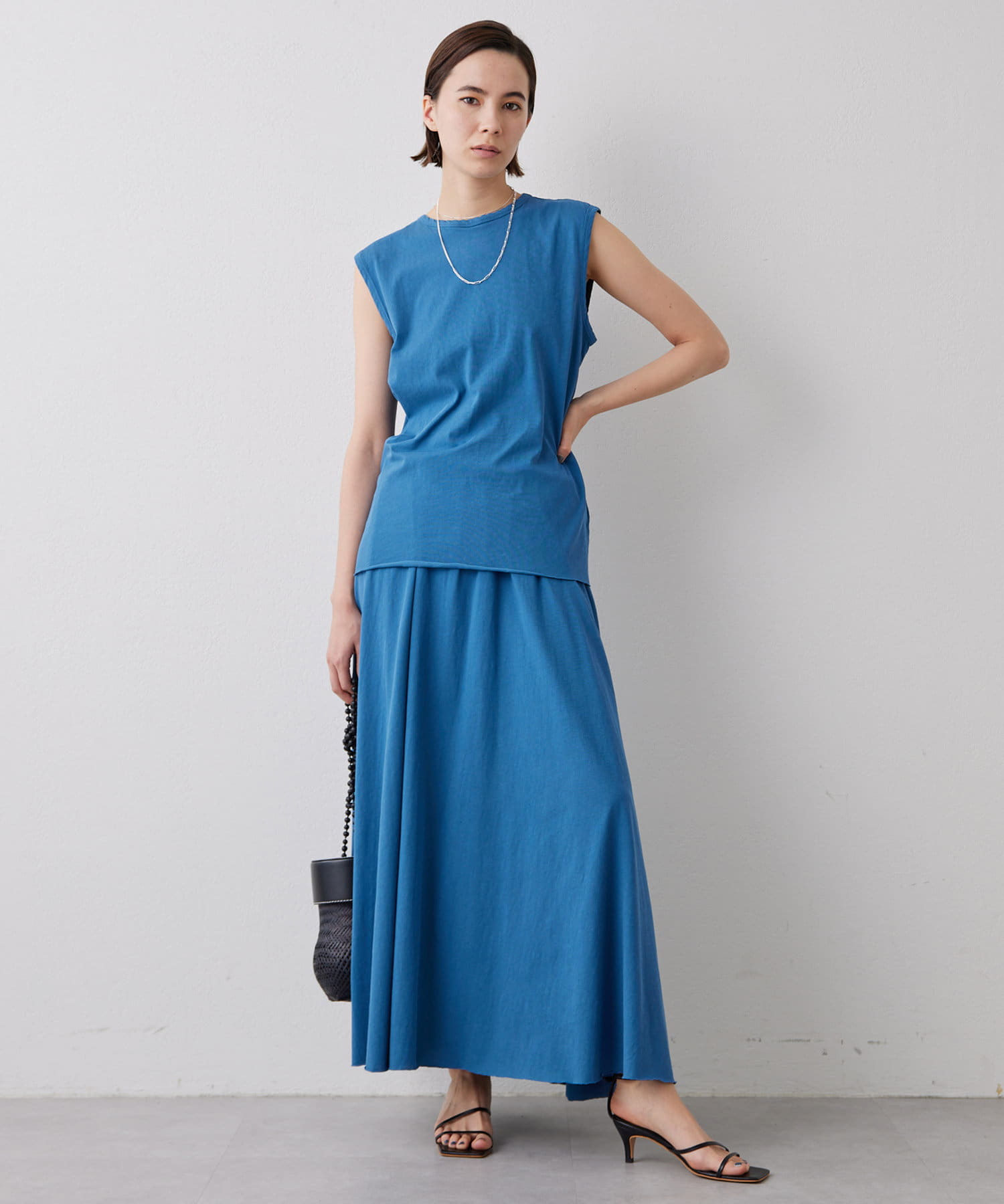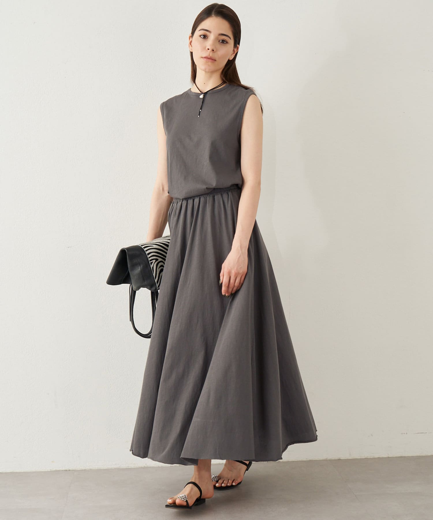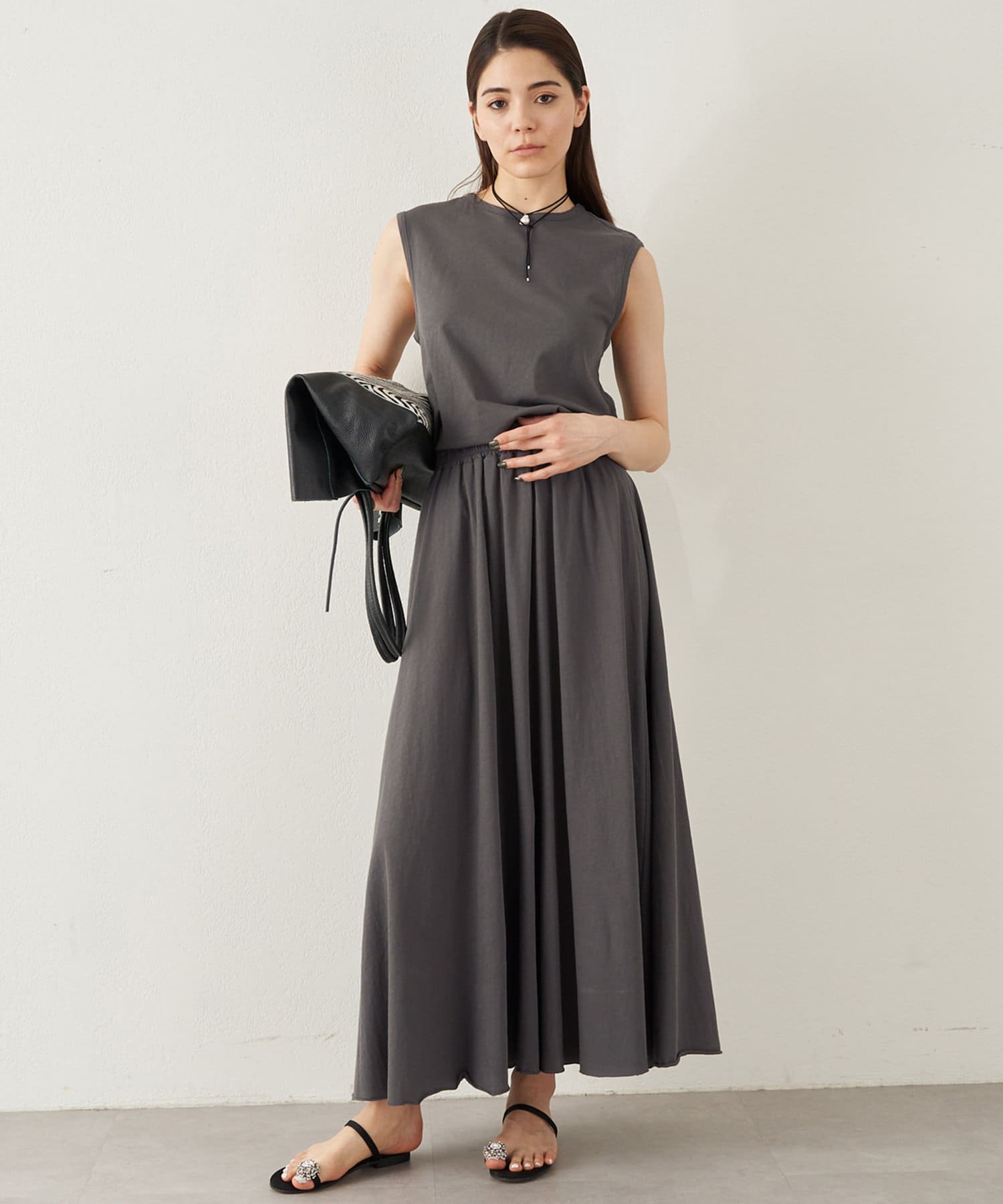 ■同素材のカットフレアスカート(ブランド品番:WGZ1031401A0005)とセットアップでワンピースのように楽しむのもおすすめ。