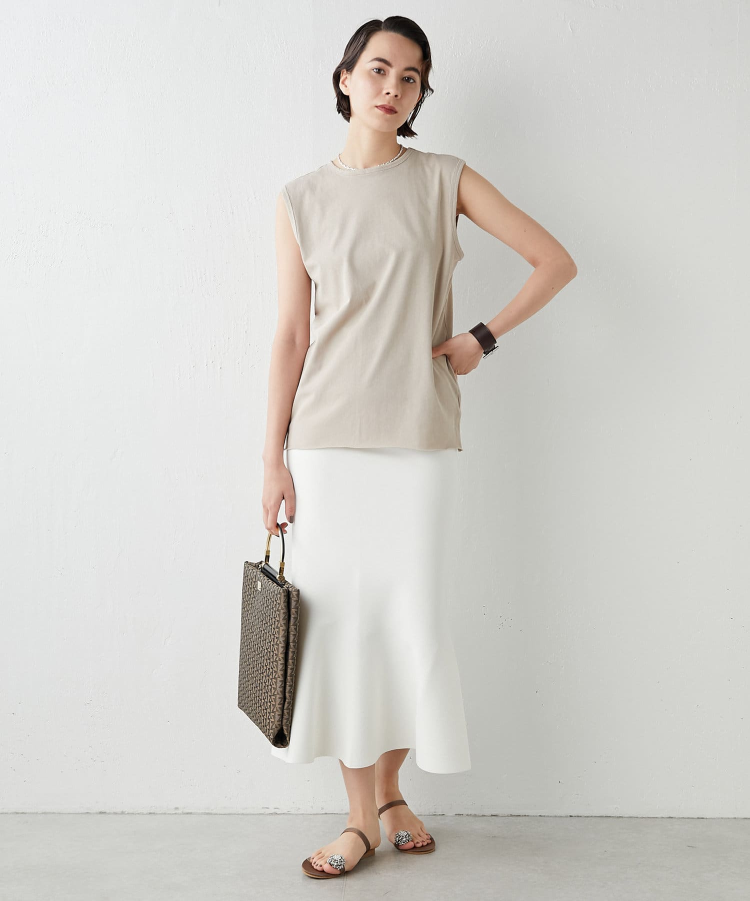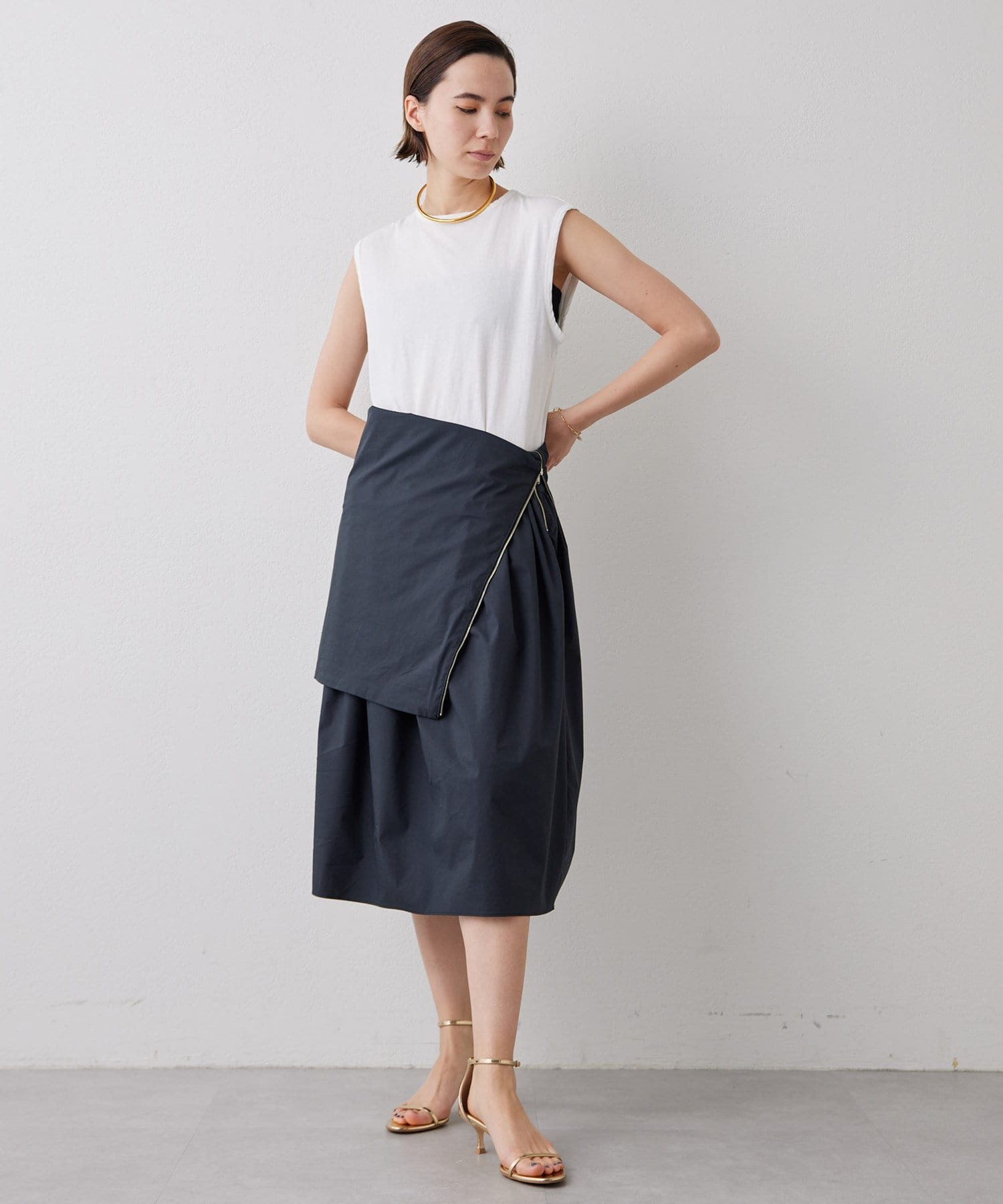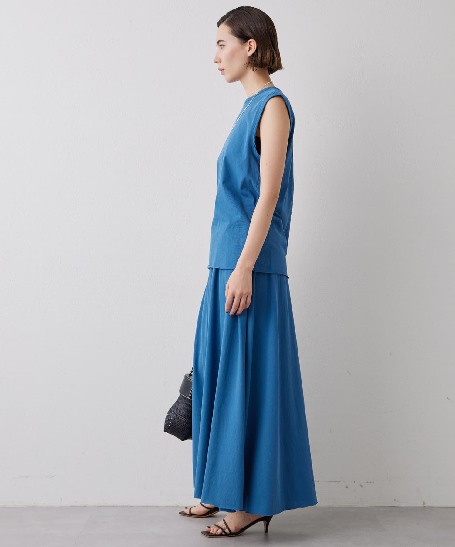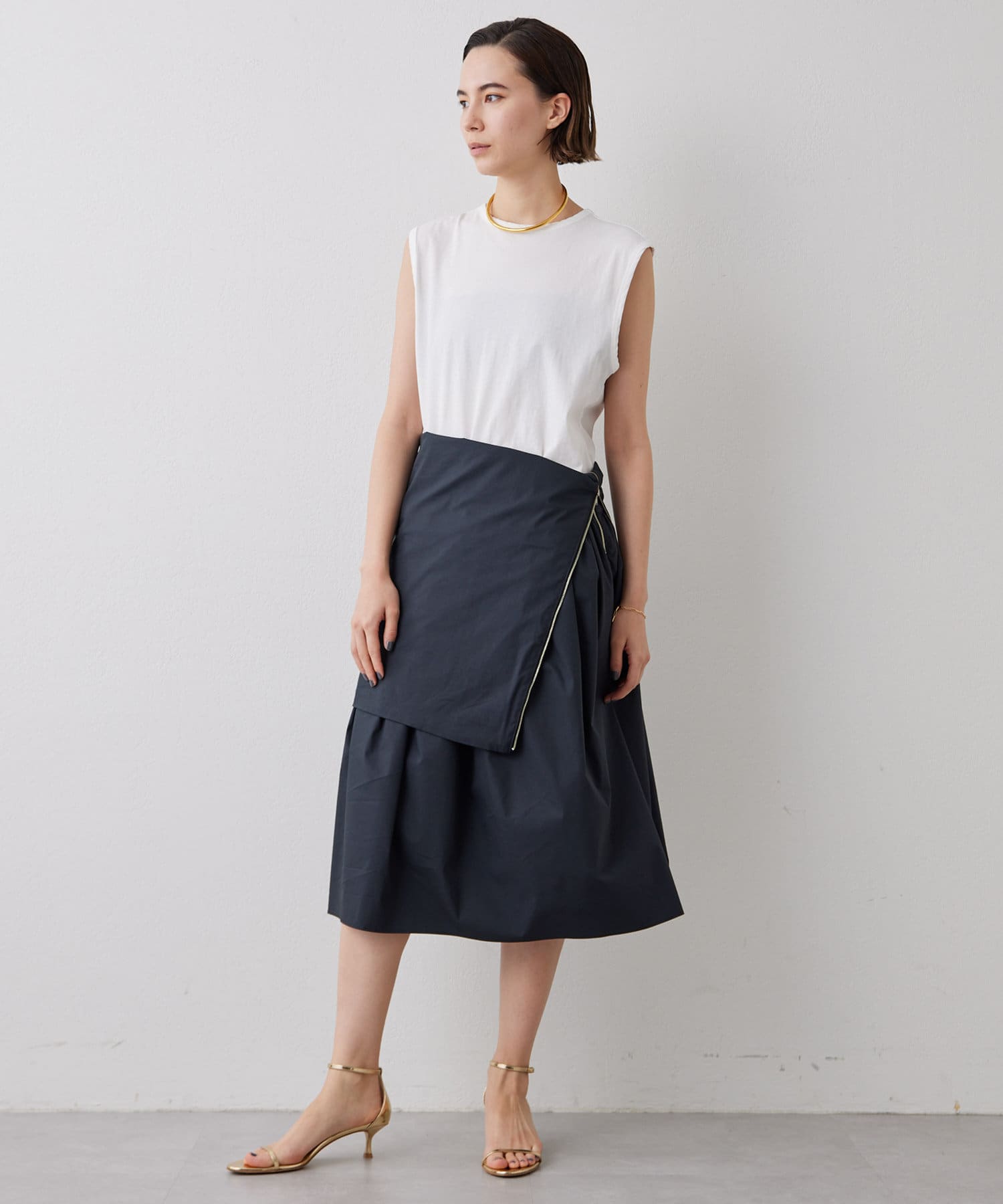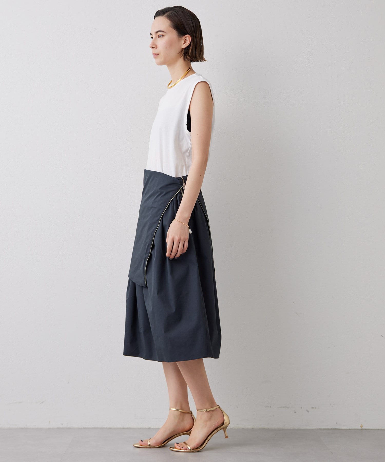■同素材のカットフレアスカート(ブランド品番:WGZ1031401A0005)とセットアップでワンピースのように楽しむのもおすすめ。