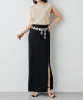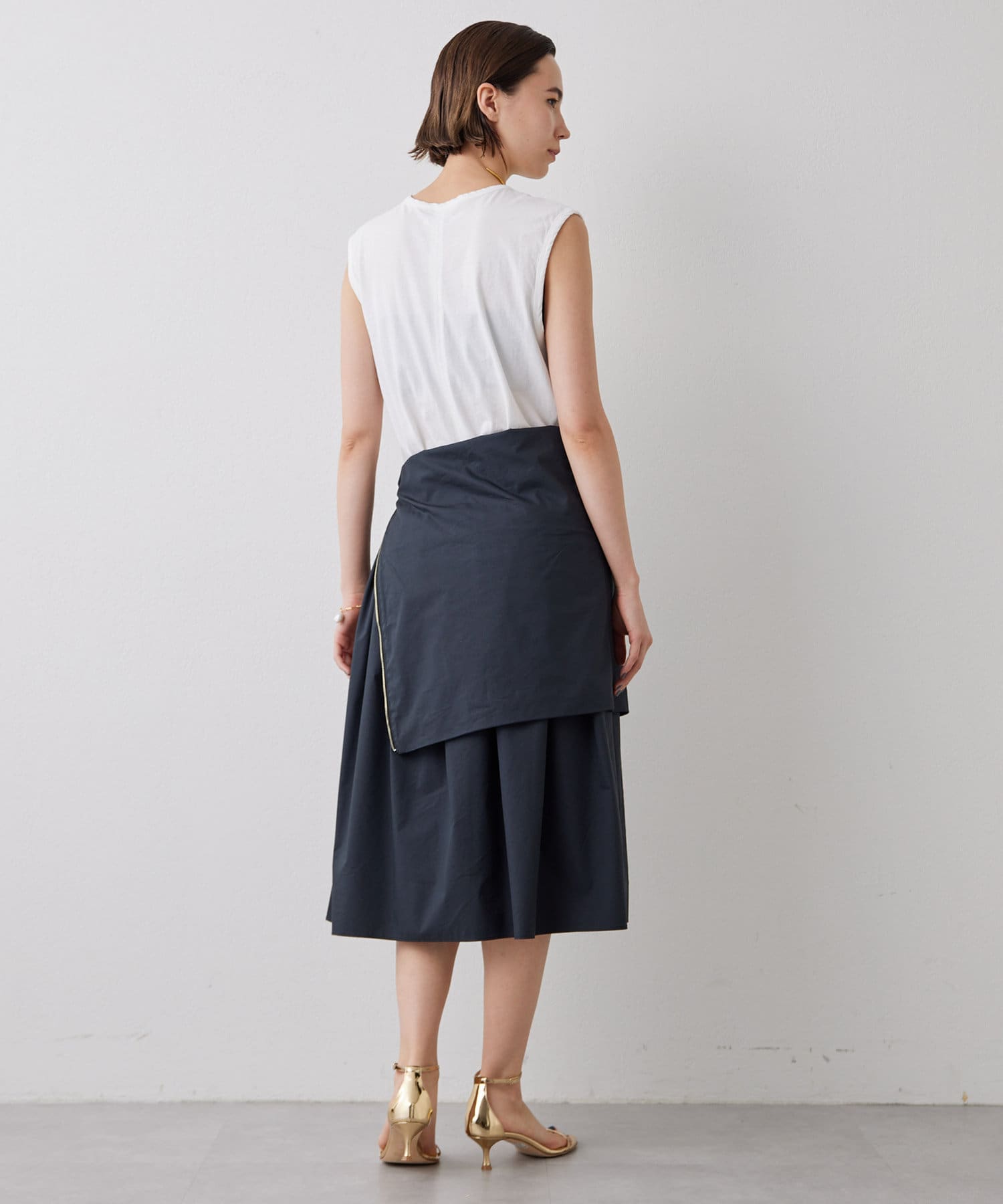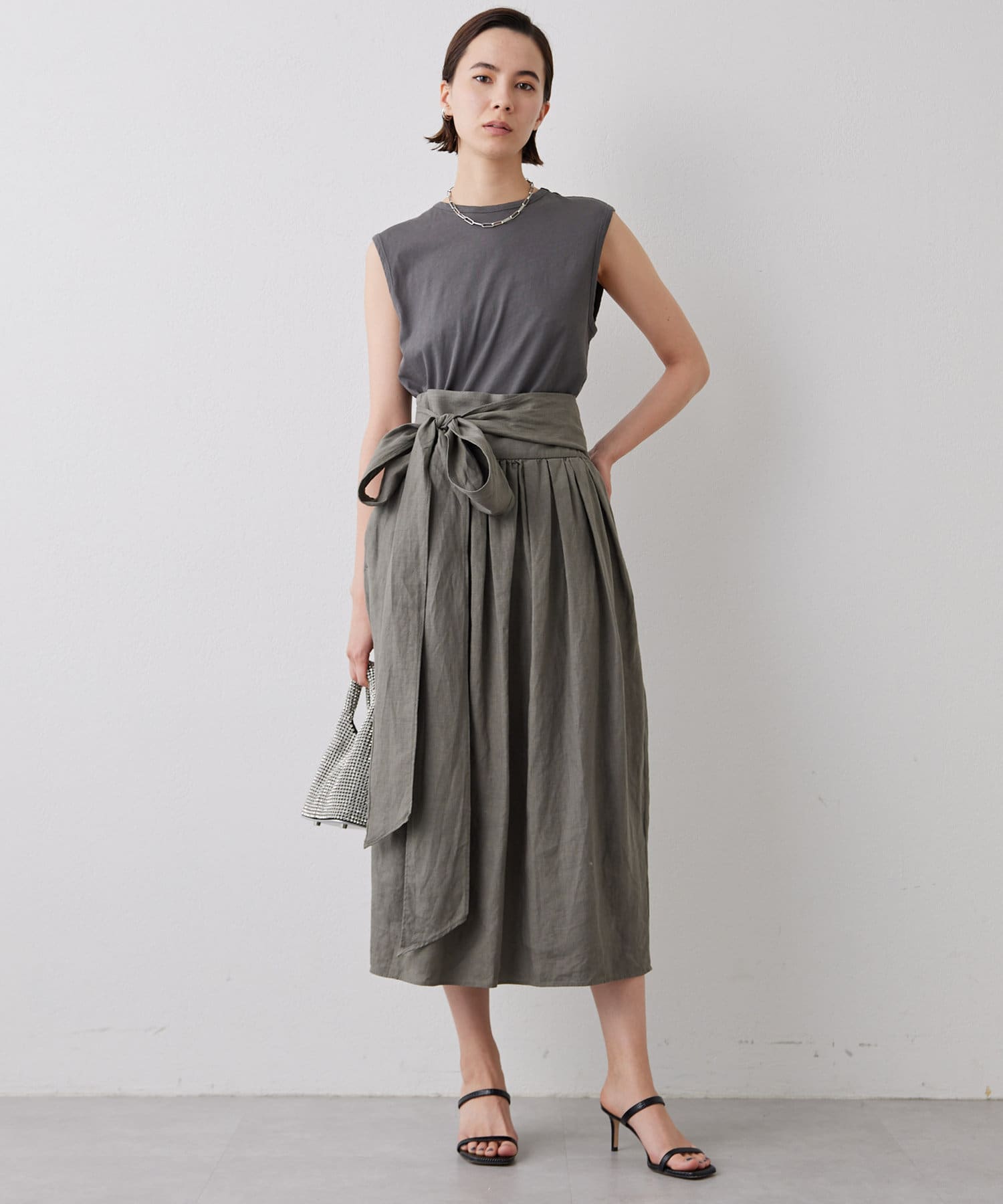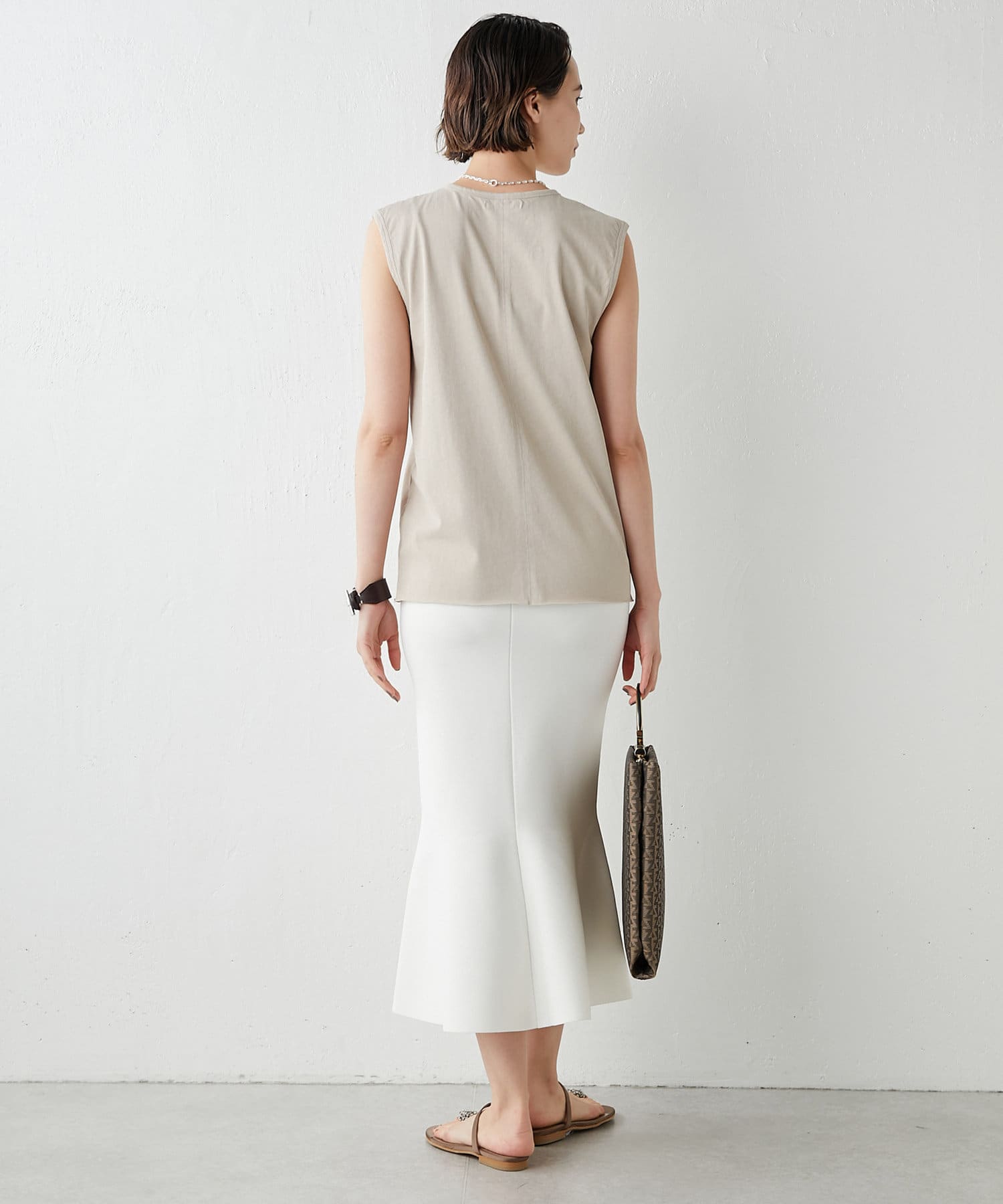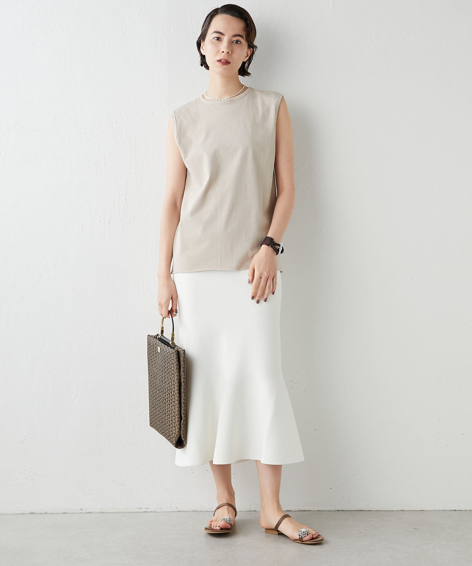 ■同素材のカットフレアスカート(ブランド品番:WGZ1031401A0005)とセットアップでワンピースのように楽しむのもおすすめ。