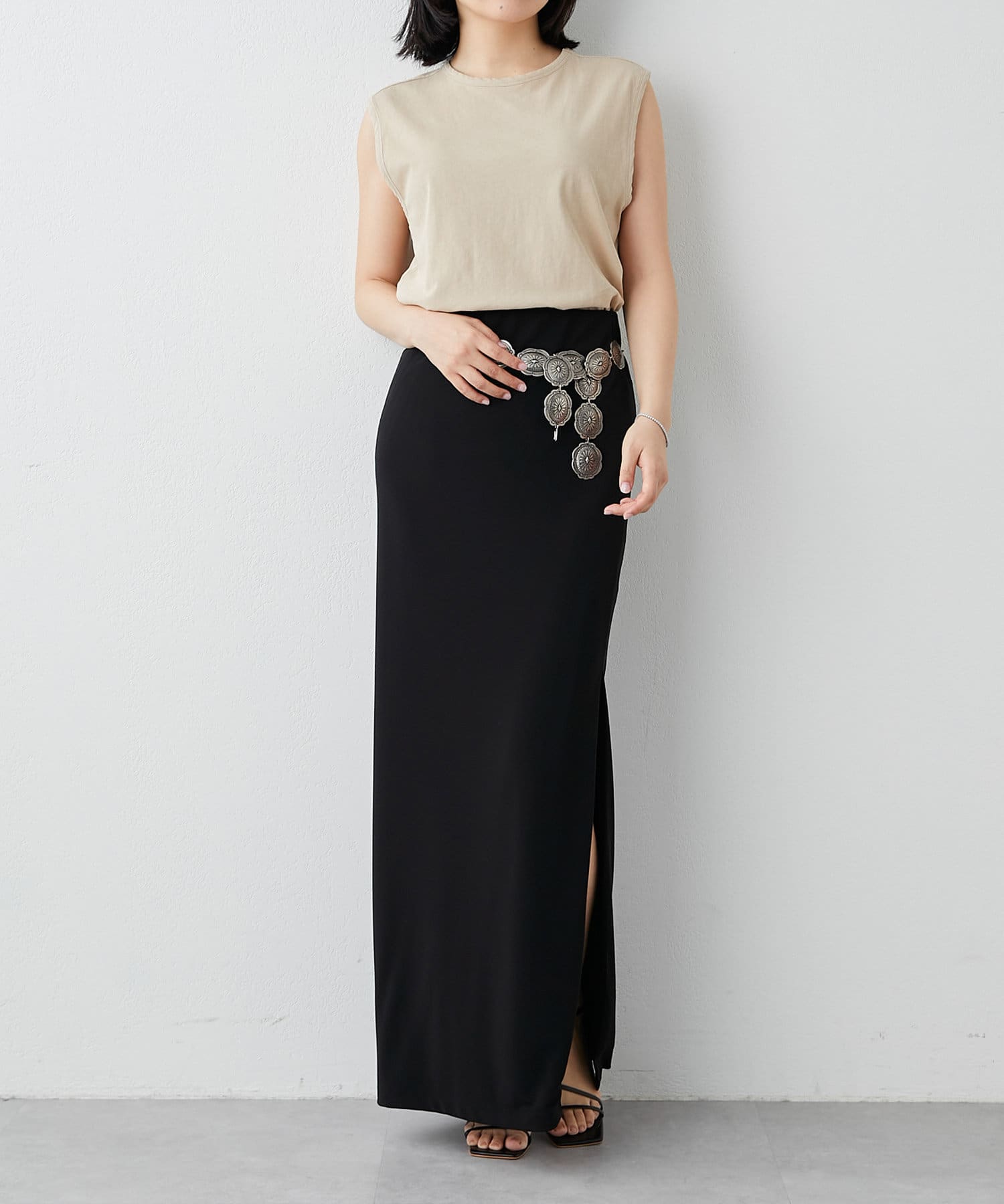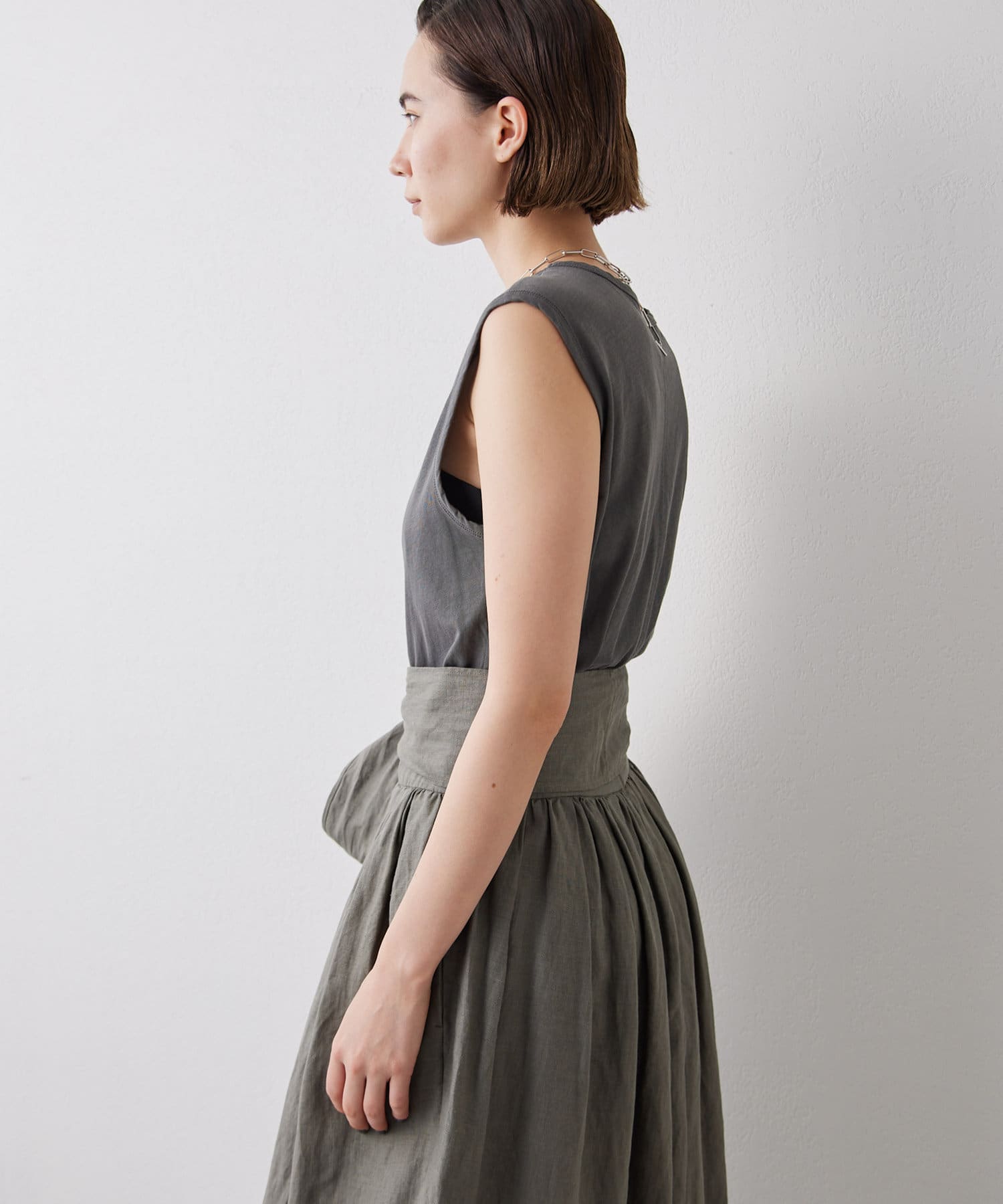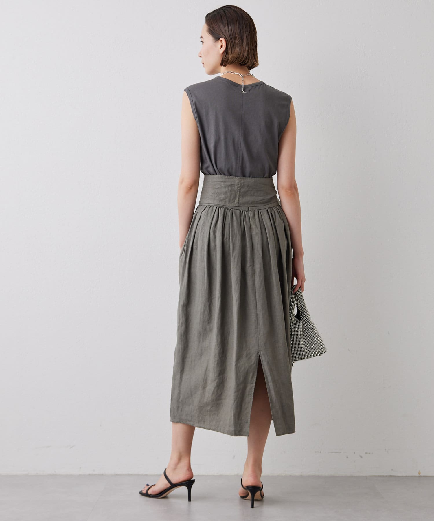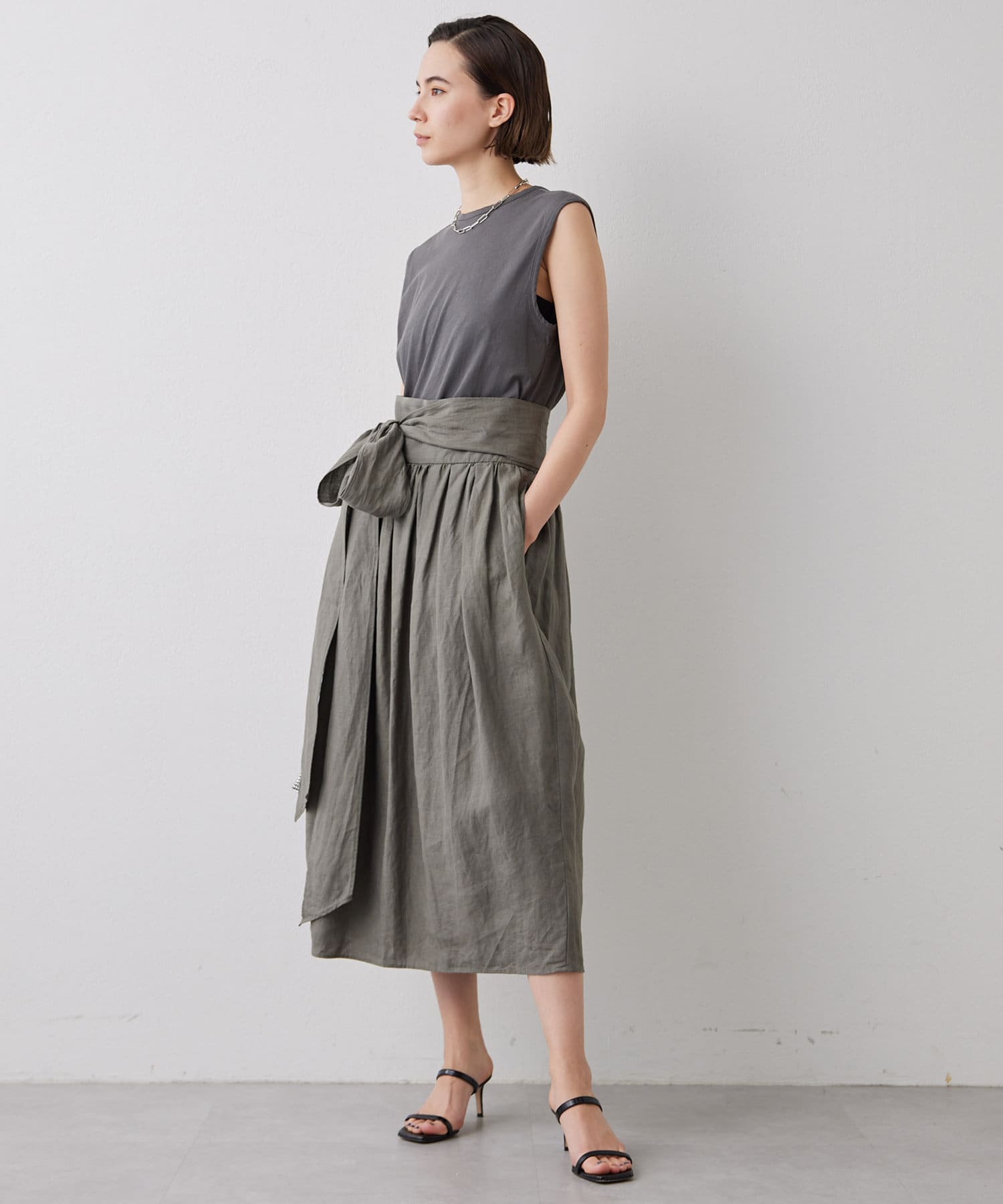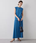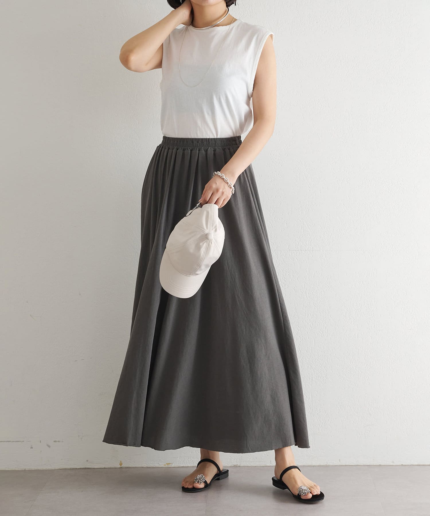 ■同素材のカットフレアスカート(ブランド品番:WGZ1031401A0005)とセットアップでワンピースのように楽しむのもおすすめ。