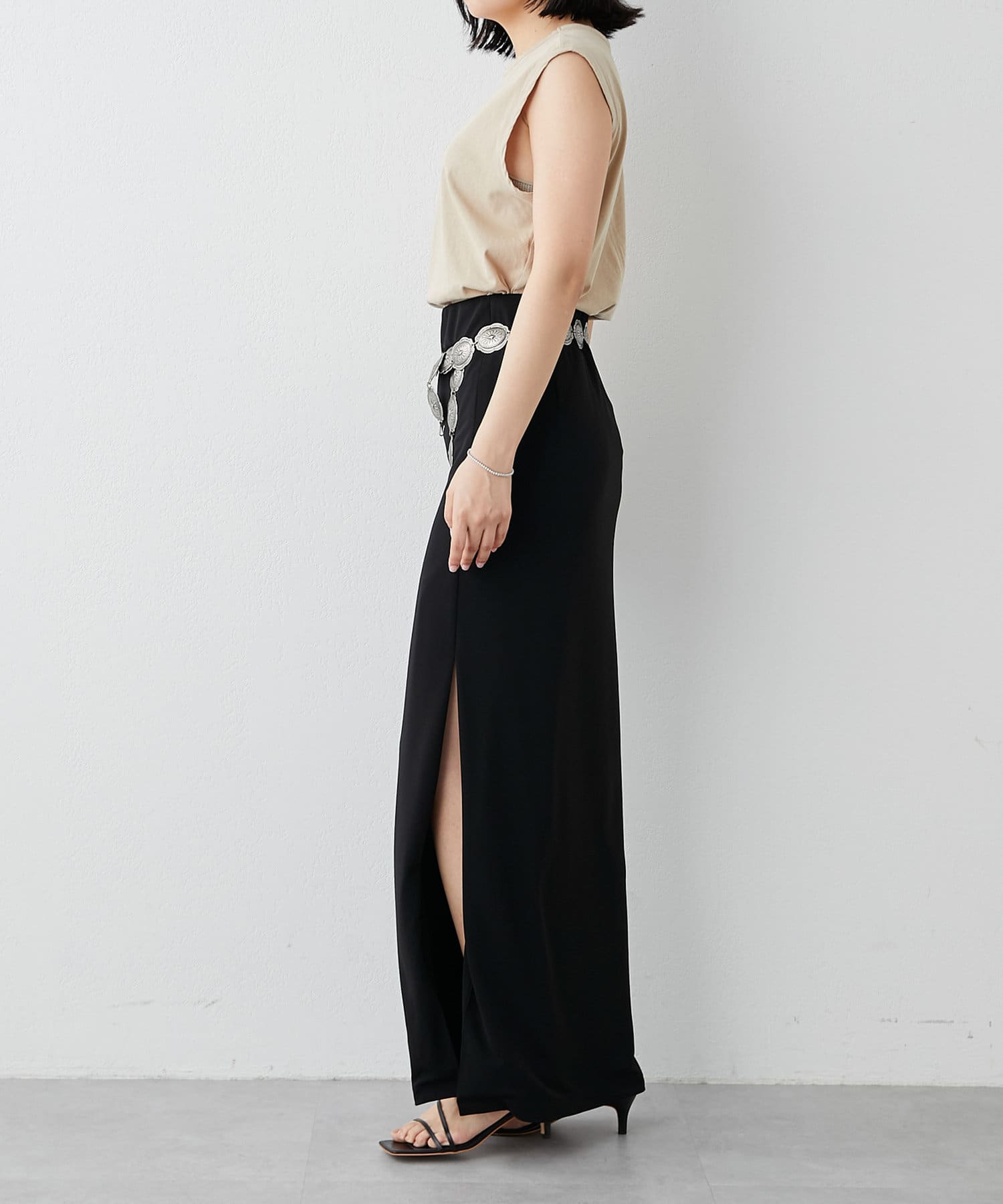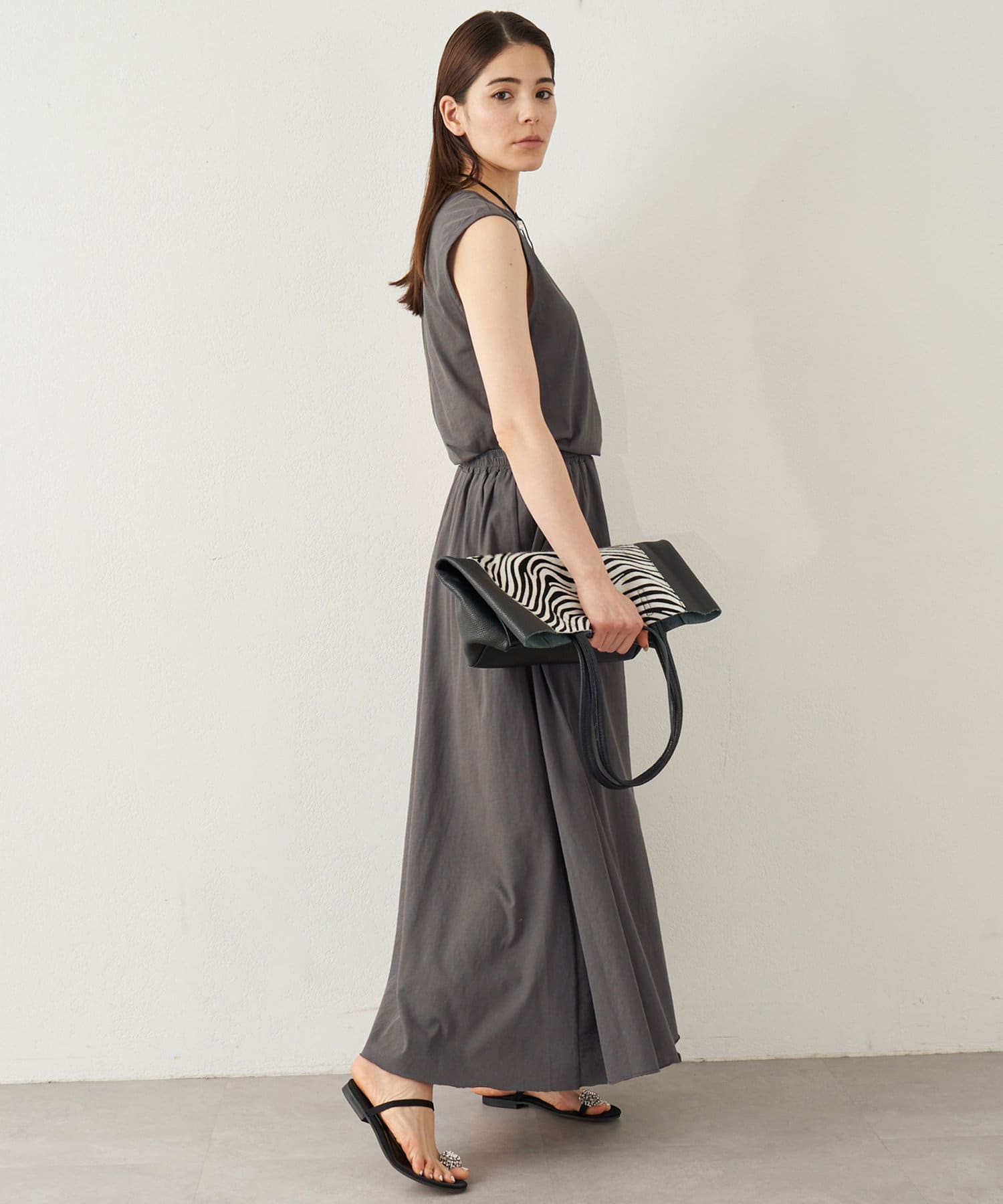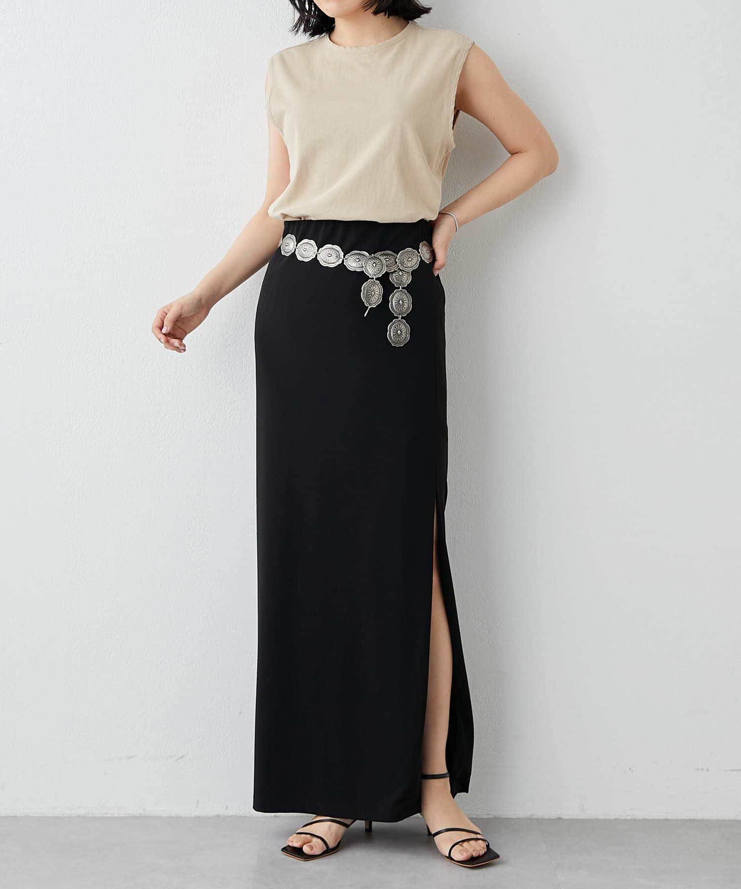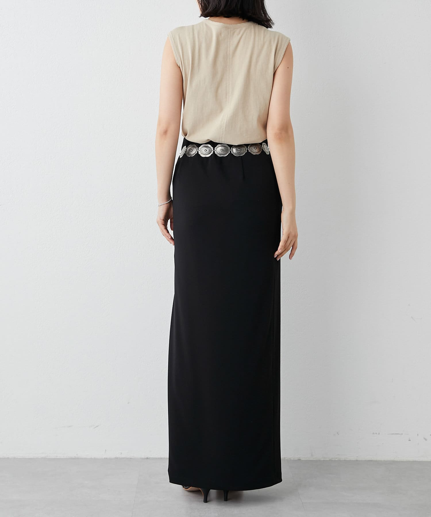■同素材のカットフレアスカート(ブランド品番:WGZ1031401A0005)とセットアップでワンピースのように楽しむのもおすすめ。