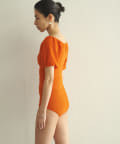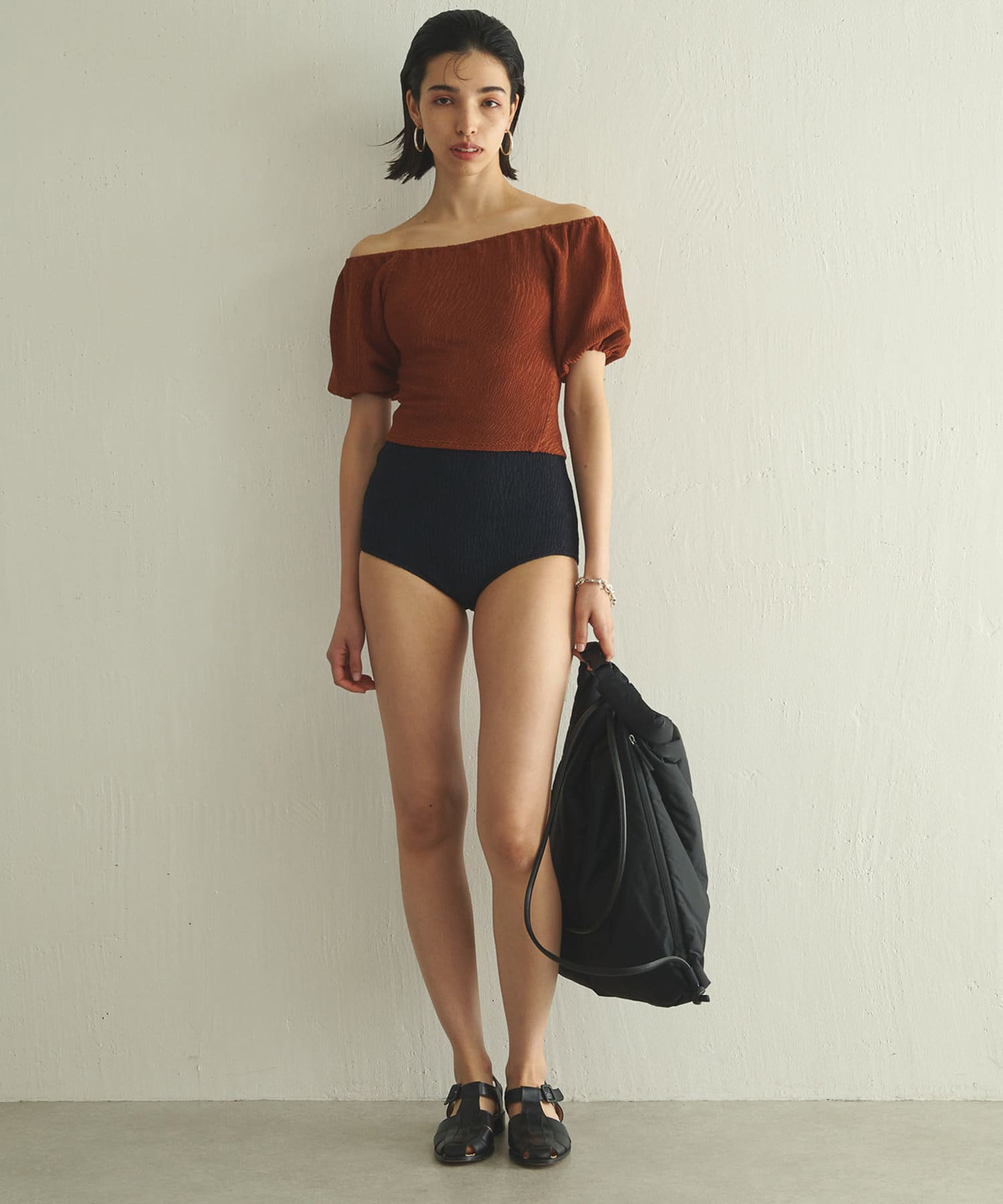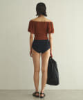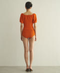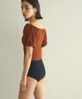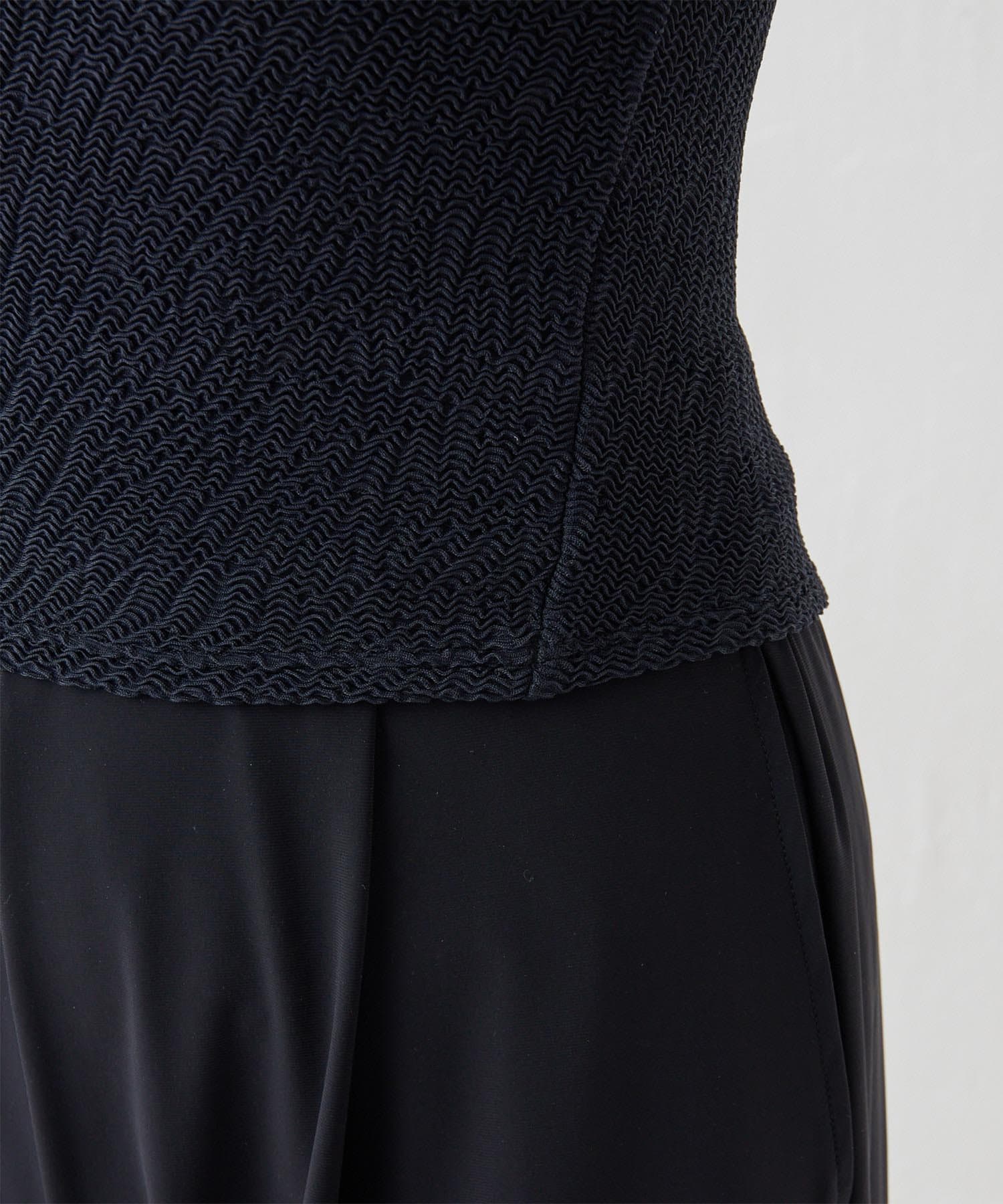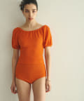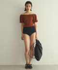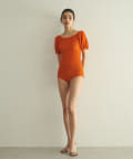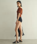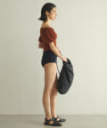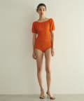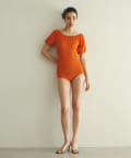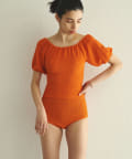 水着とは思えない、デイリーでも使えそうな生地感。凸凹とした素材で表情があります。気になる二の腕もカバーしてくれる大人の水着です。
