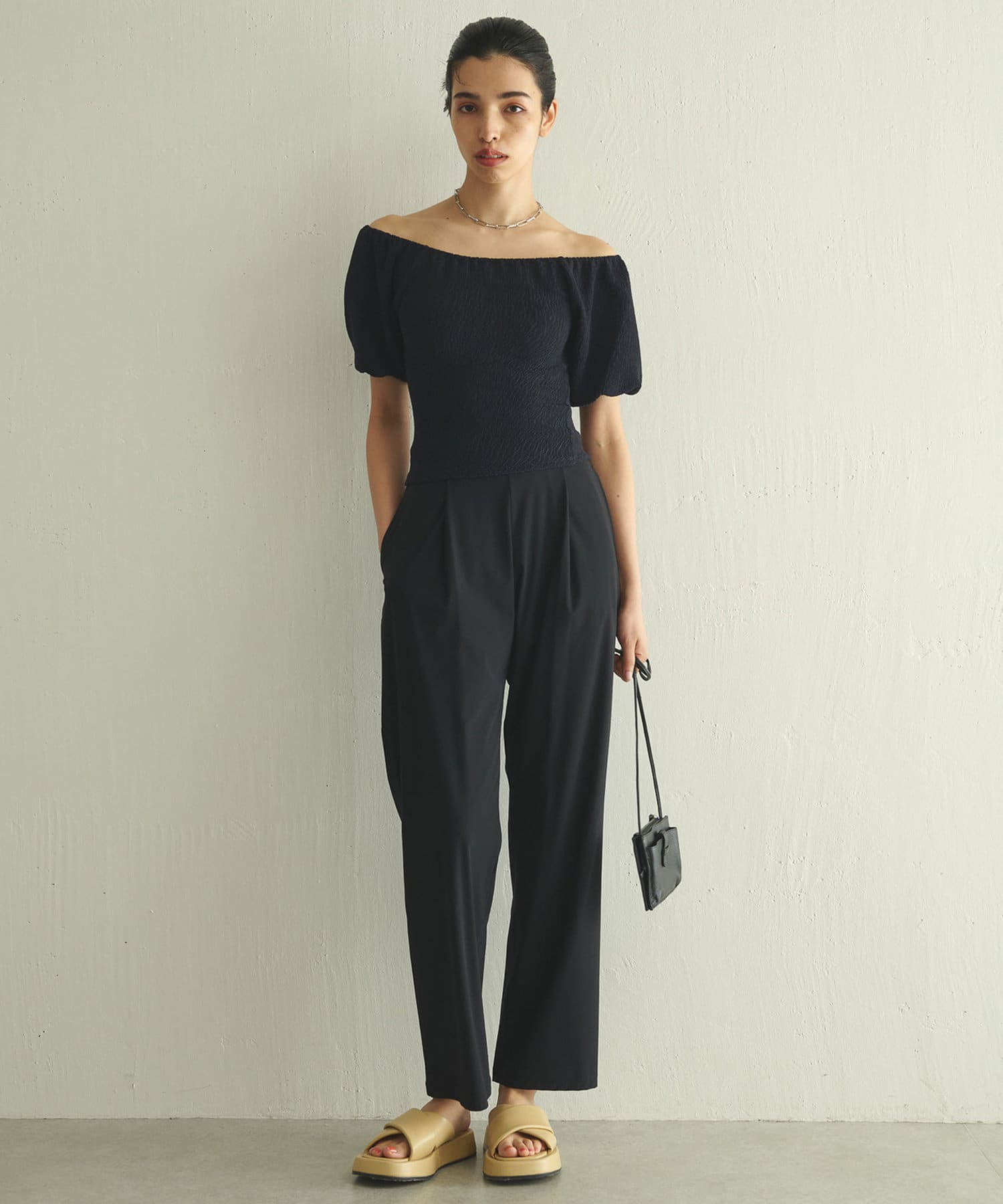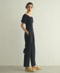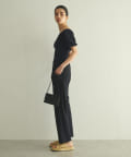 タイトなシルエットなので、ボトムはワイドシルエットなものがオススメ。ハイウエストなデザインを選ぶと、お腹周りもカバーでき気になりません。