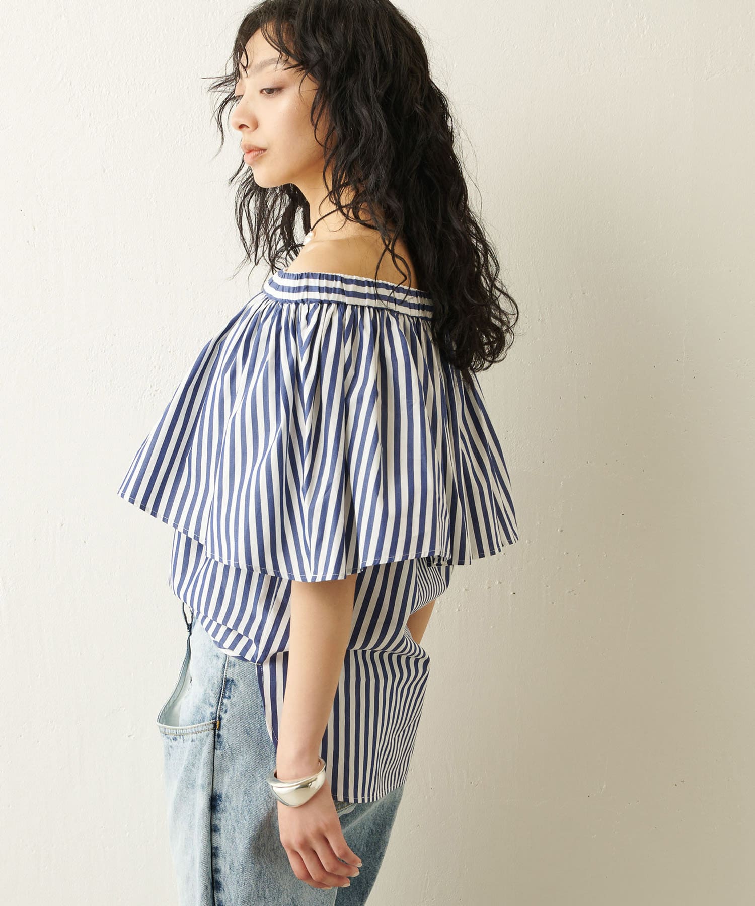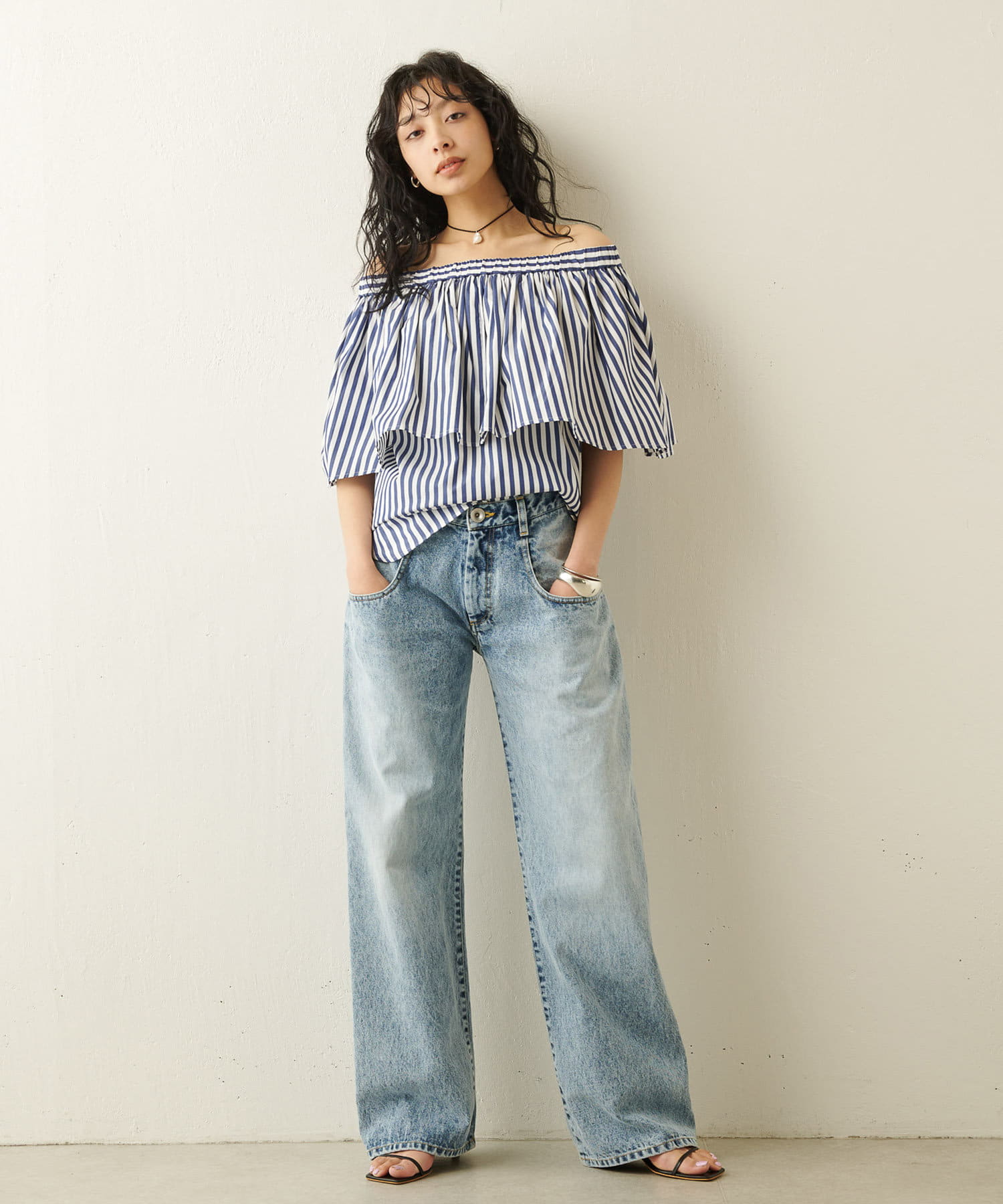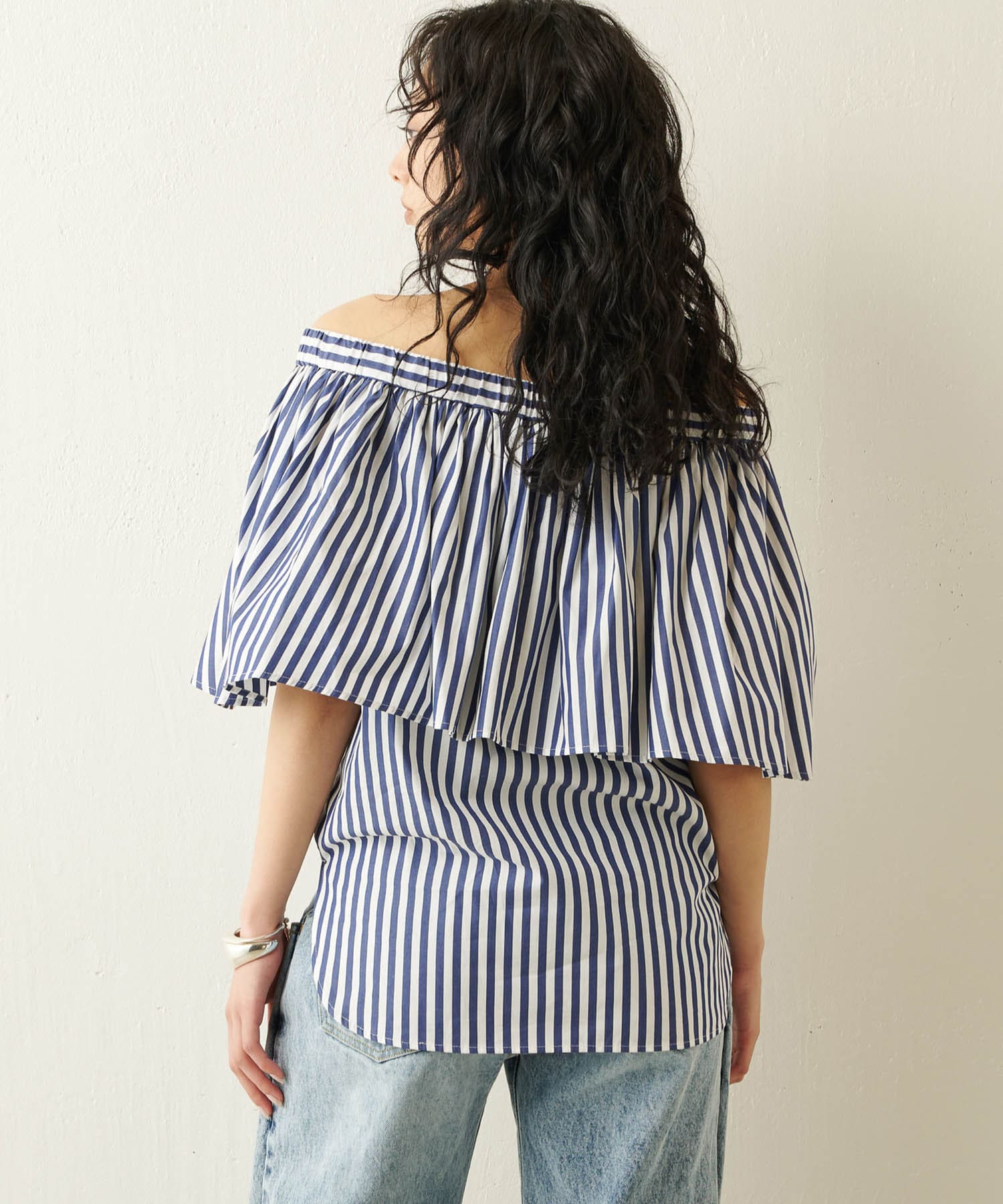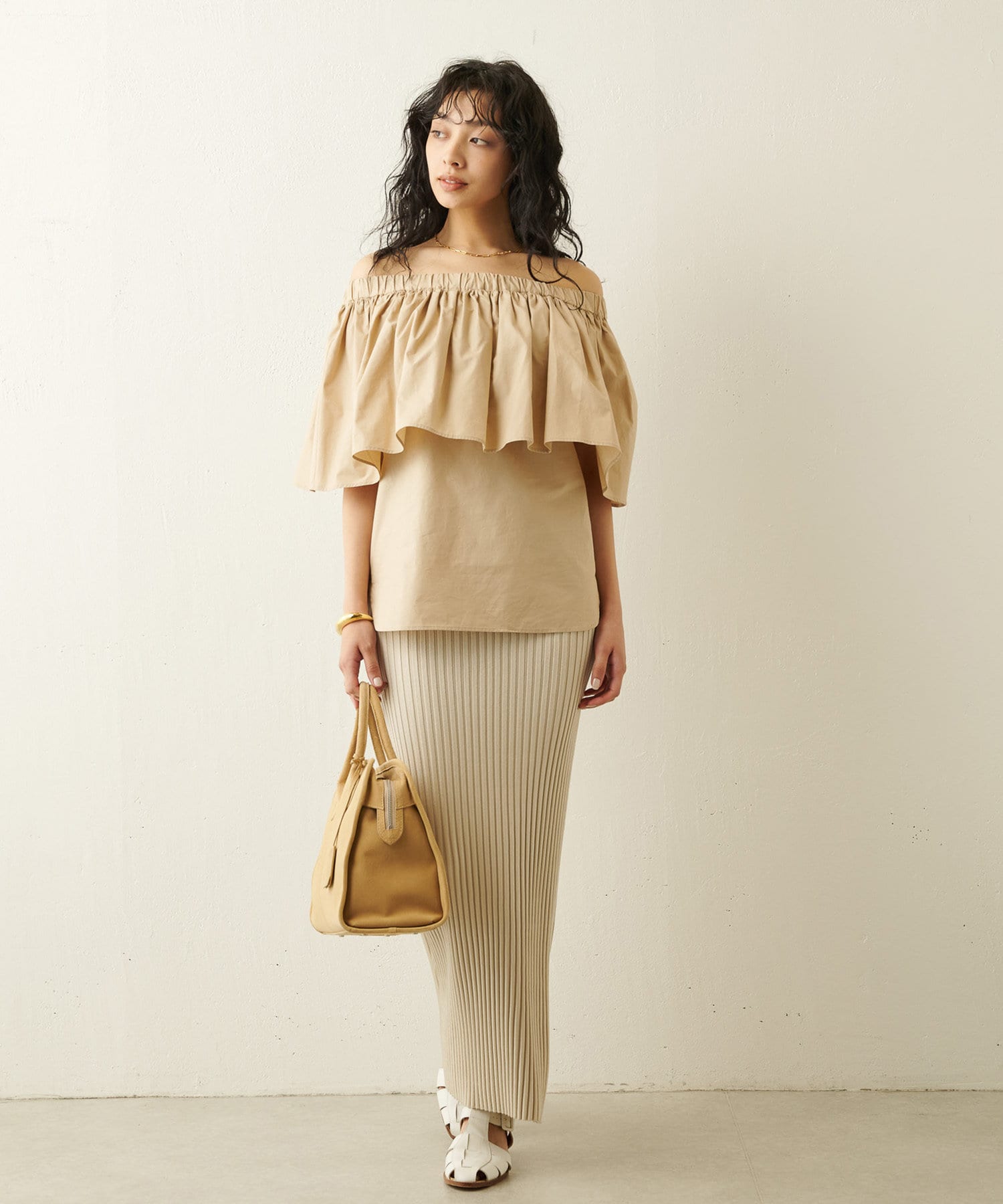 ■着こなしの幅を楽しめるオフショルダーデザインのブラウス。