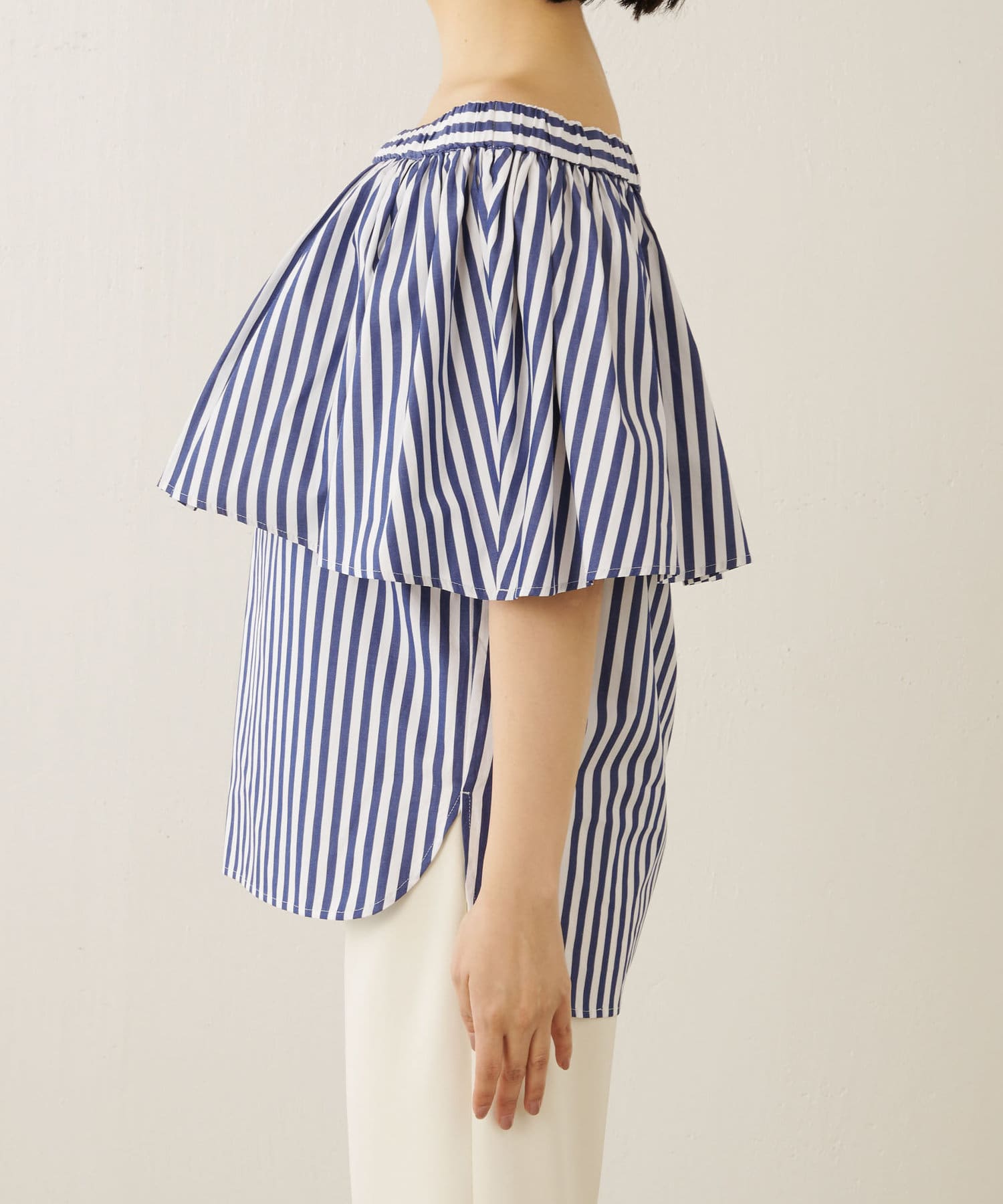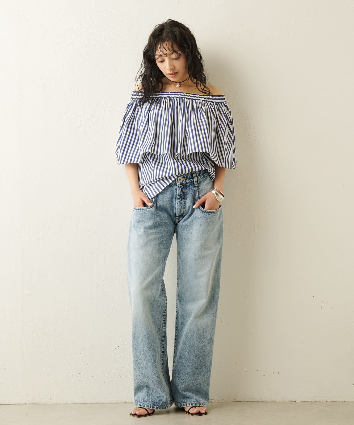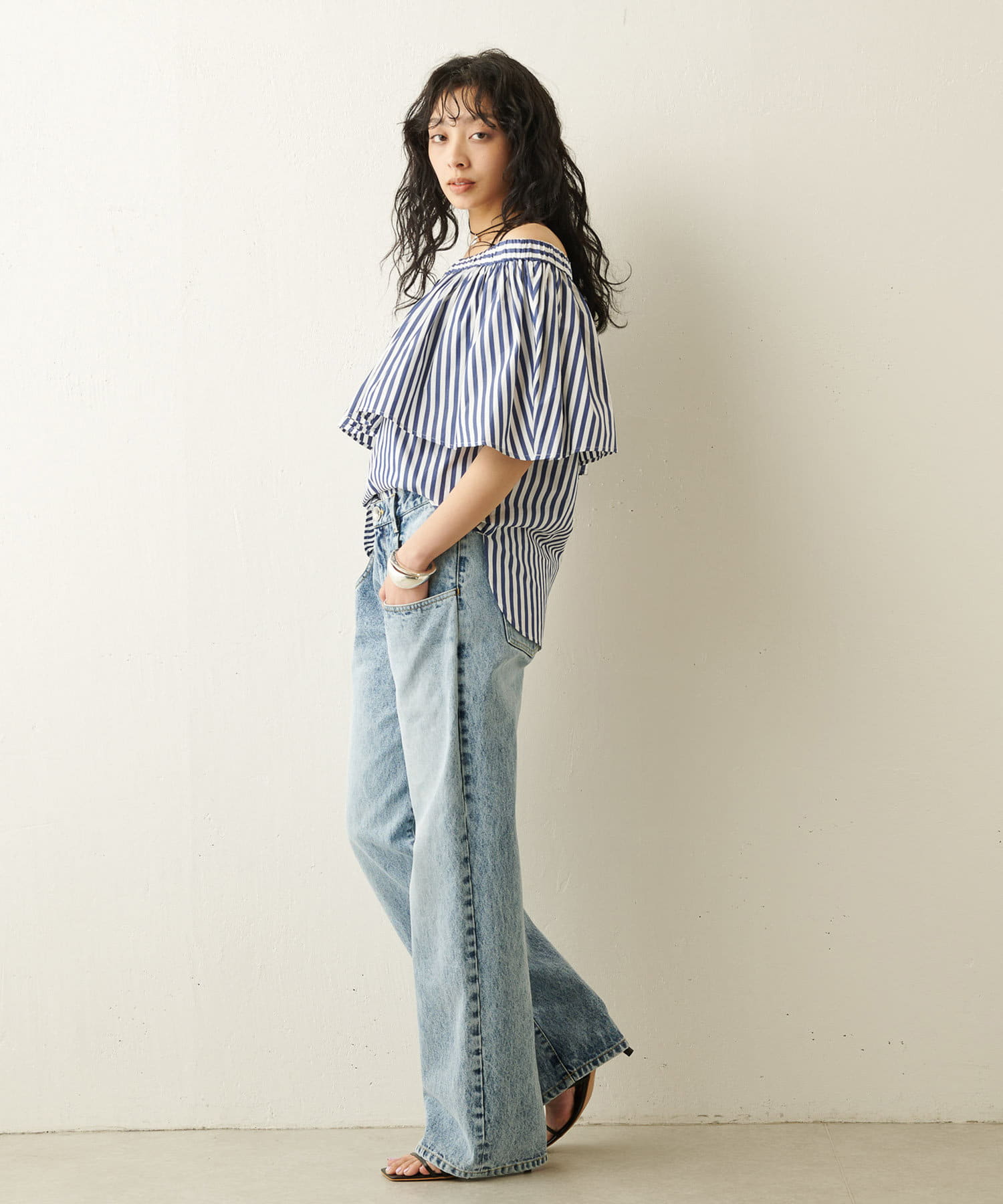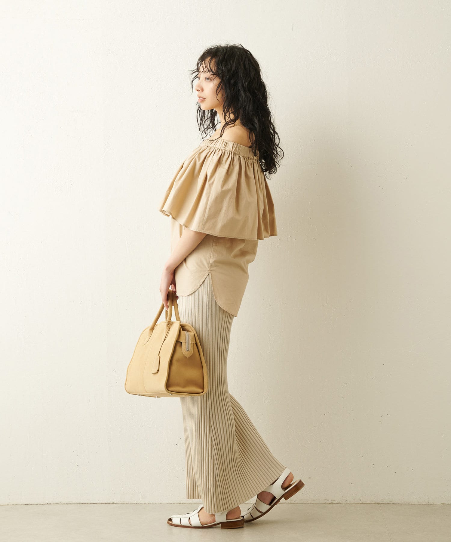 ■着こなしの幅を楽しめるオフショルダーデザインのブラウス。