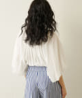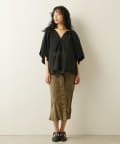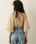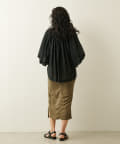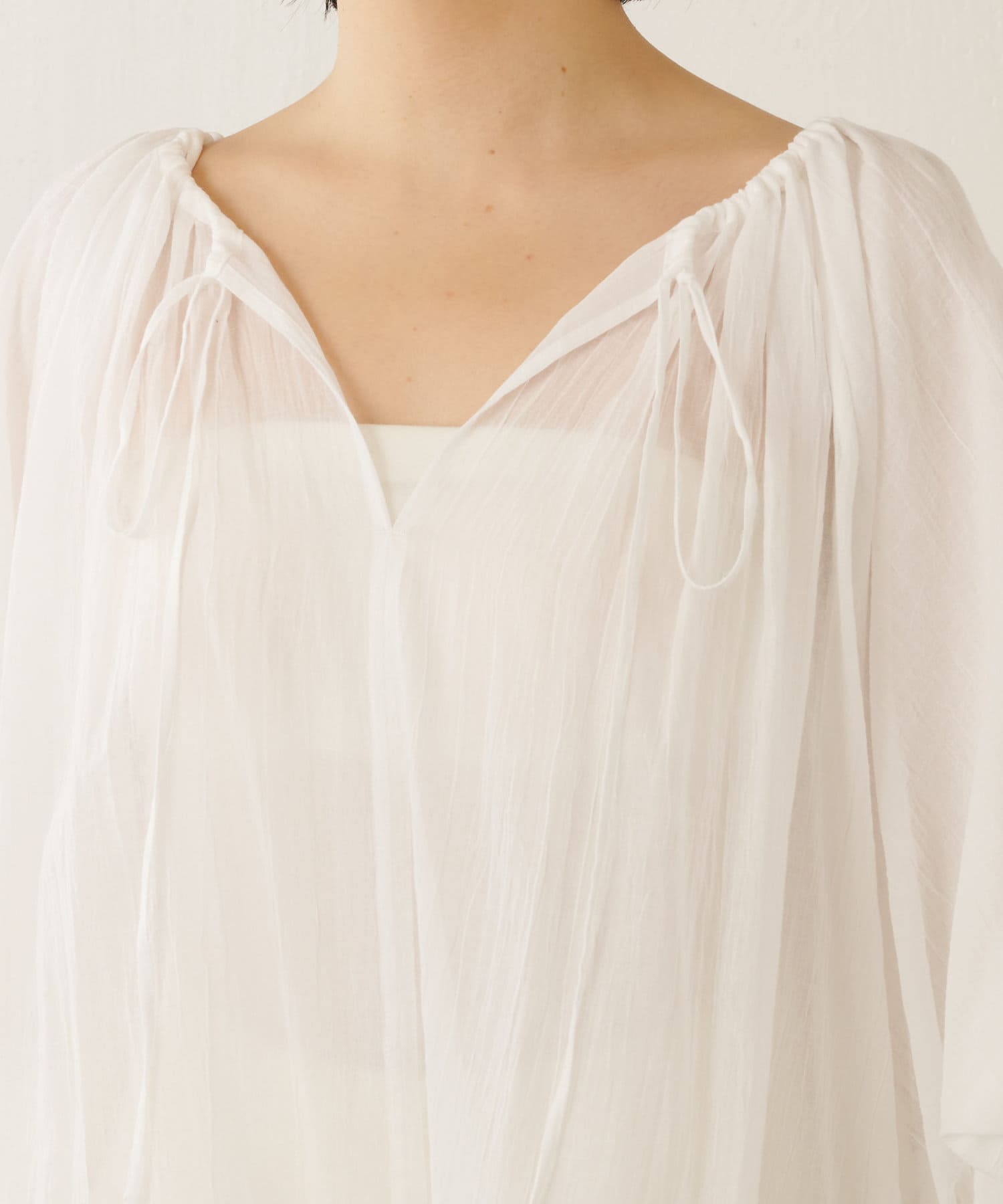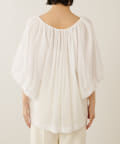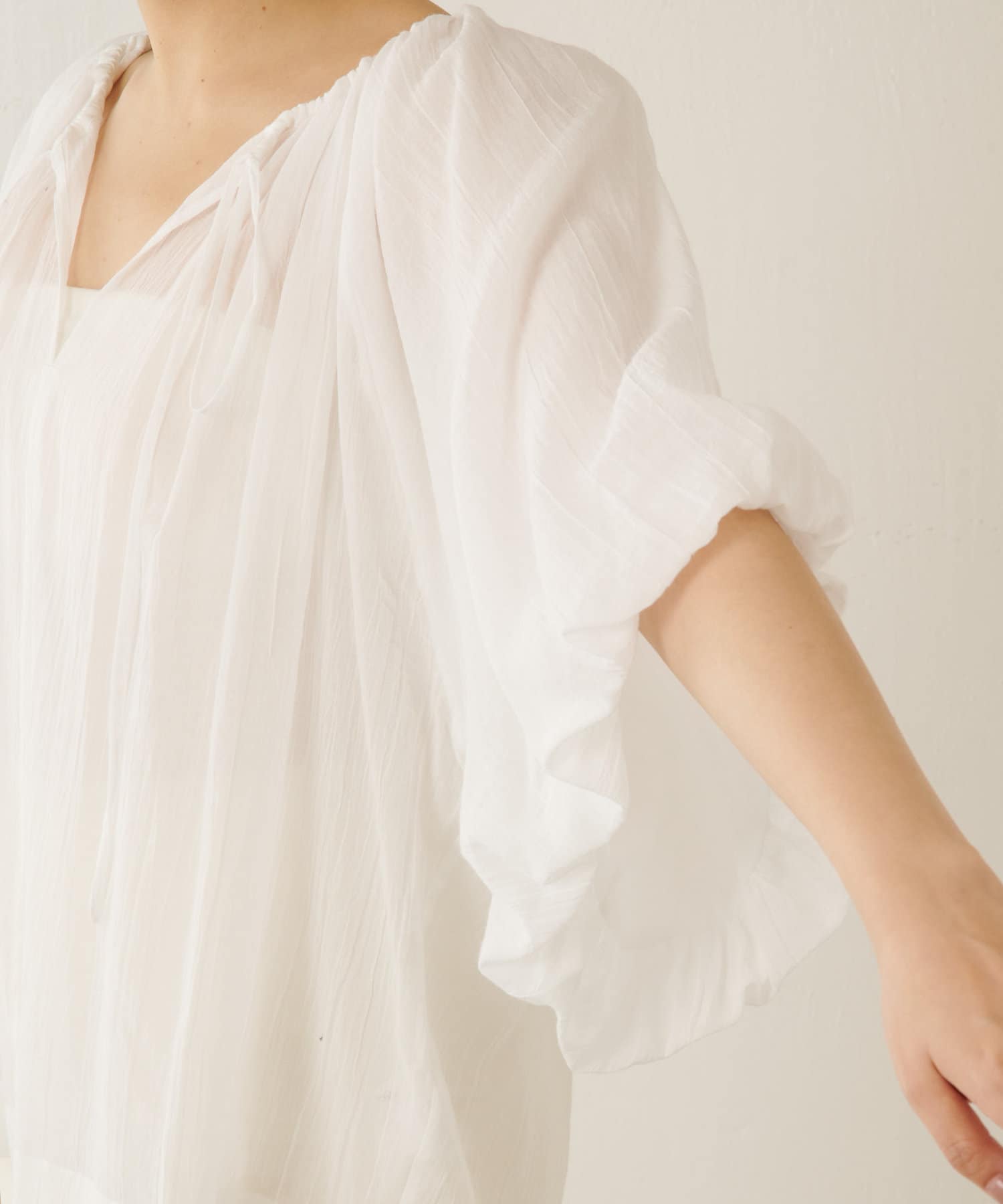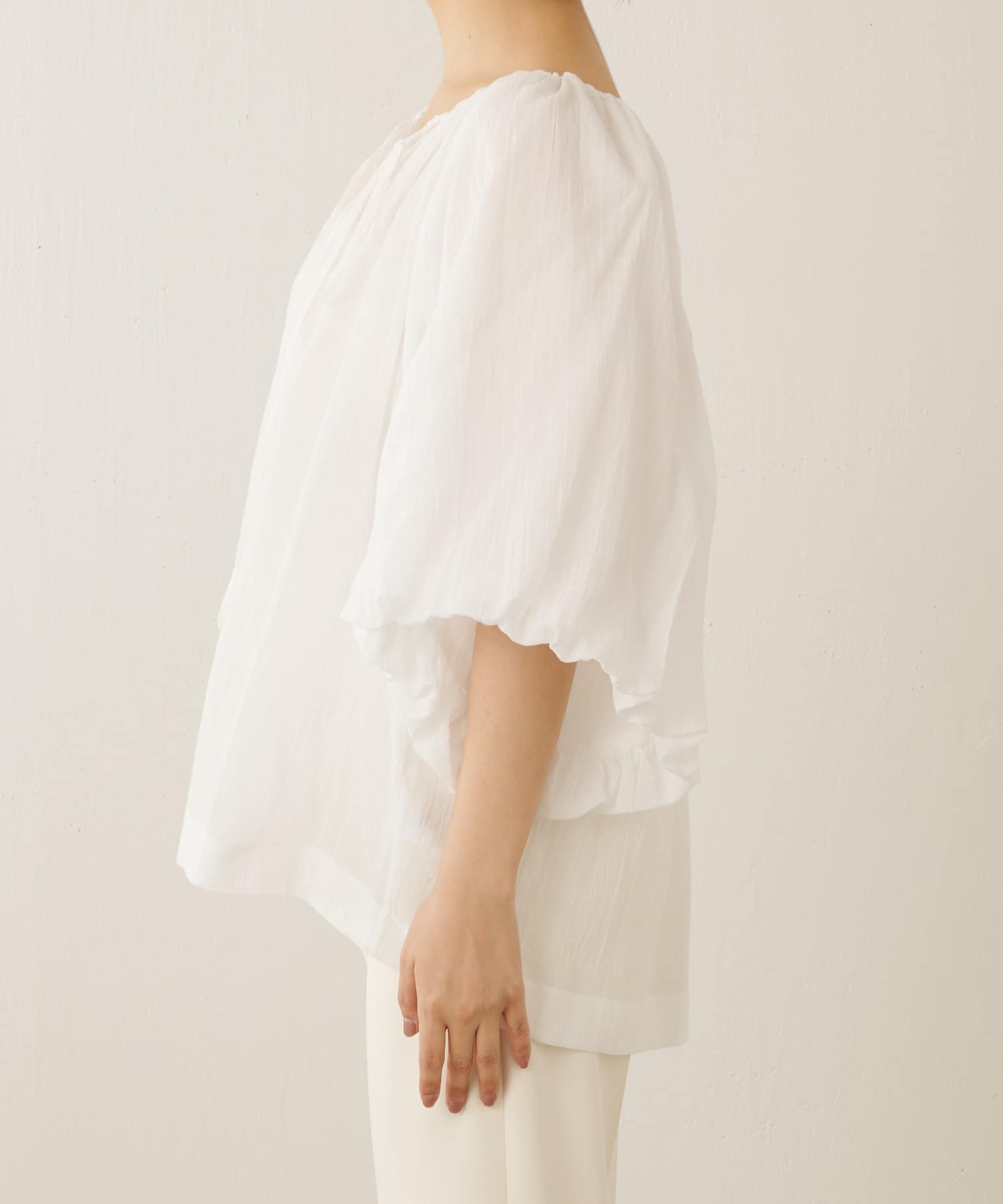 ■襟ぐりにギャザーを入れ、袖はバルーンシルエットに仕上げた女性らしいデザイン。