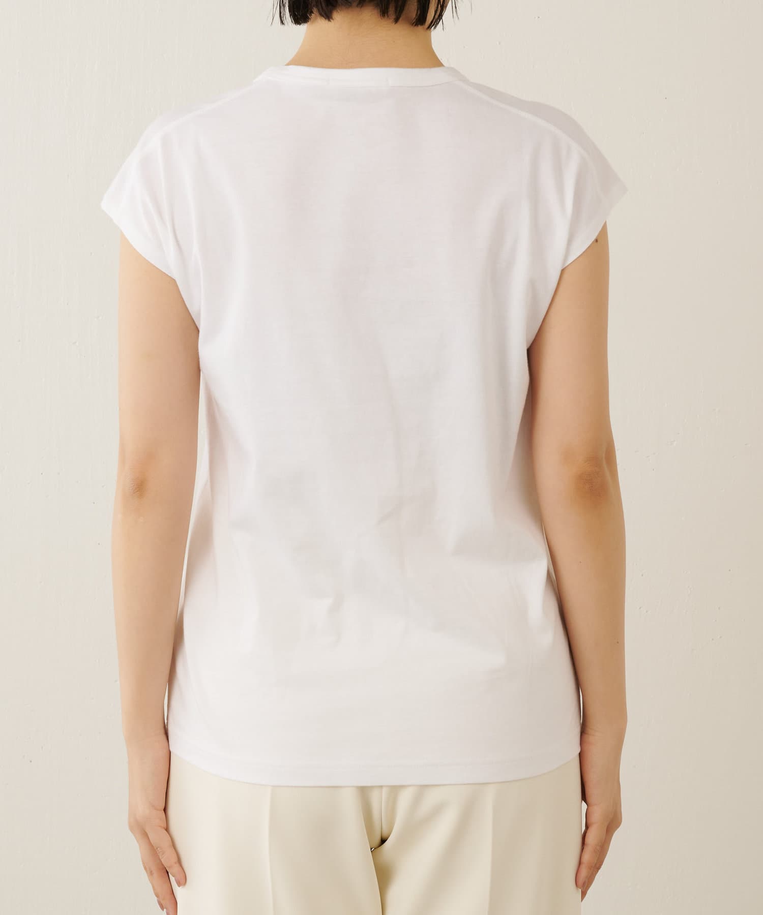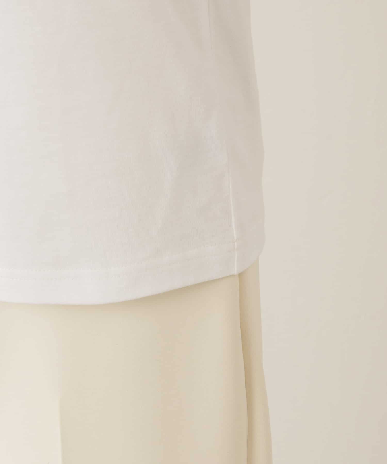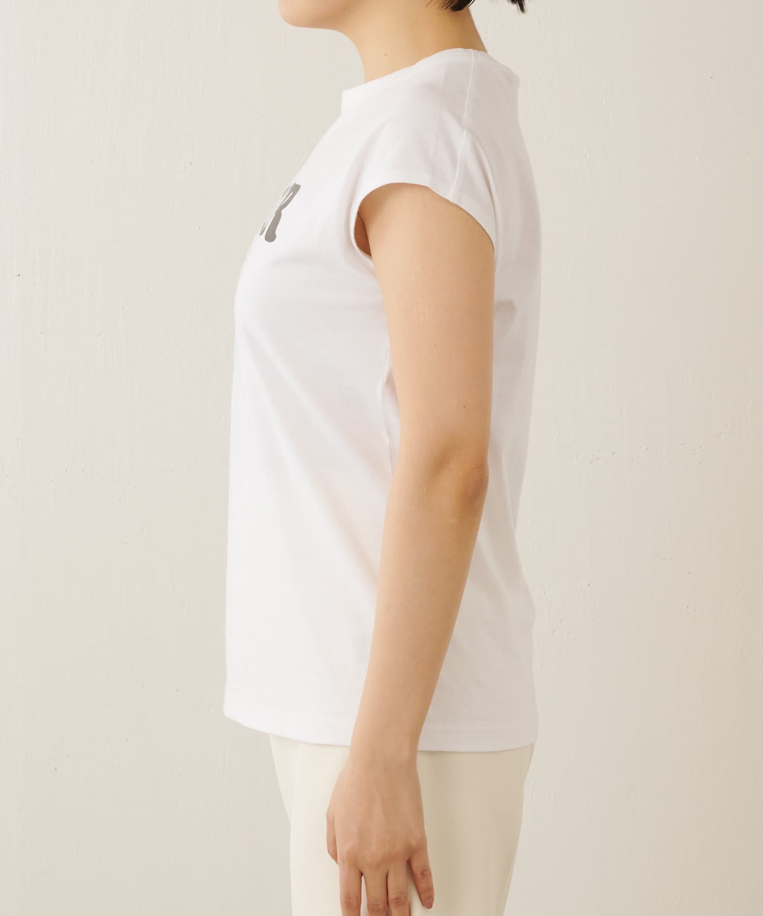 すっきりとした上半身になるカットソー。胸元のロゴがアクセントに。気になる二の腕もカバーしてくれるデザインです。
