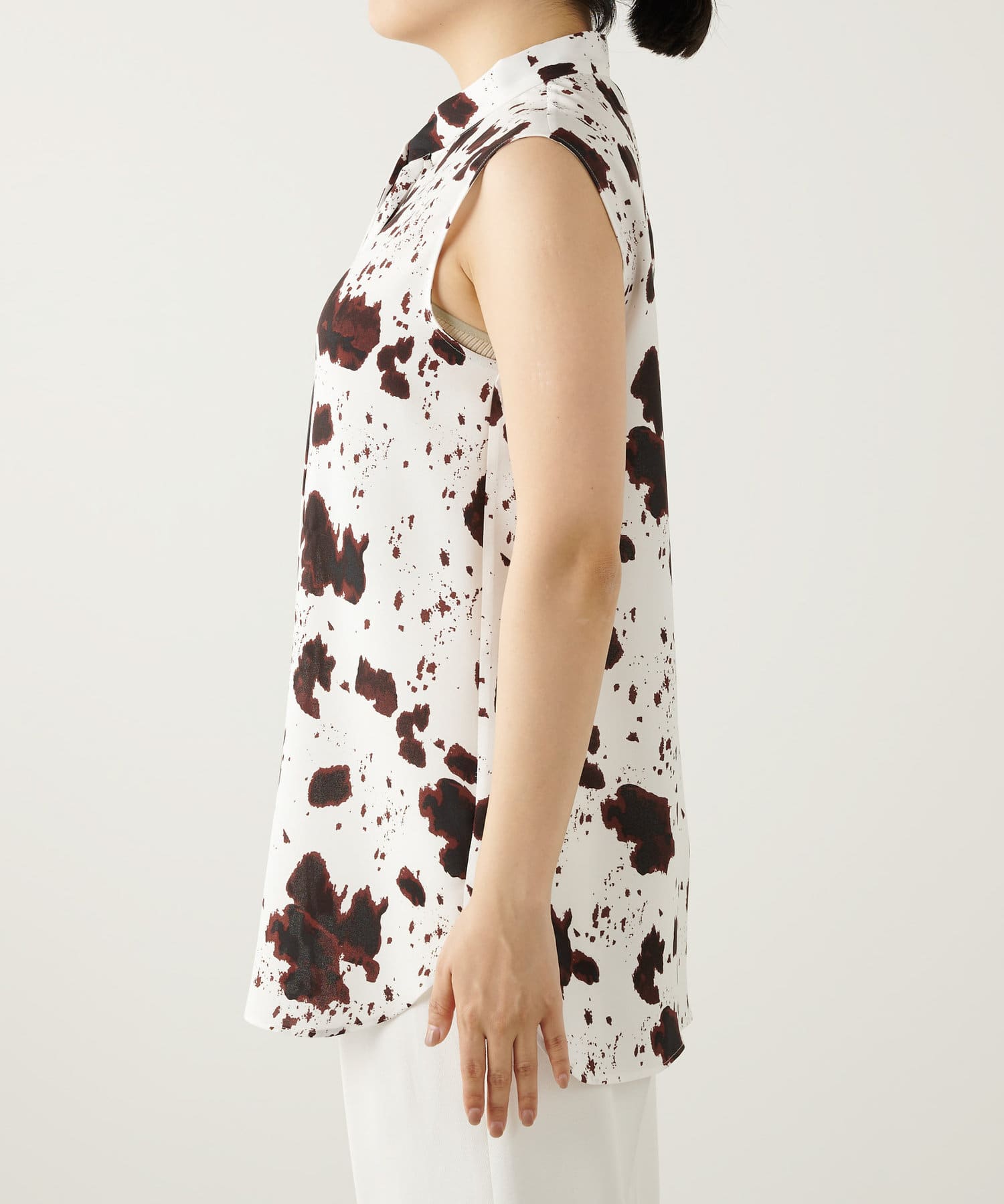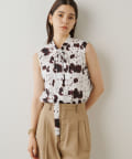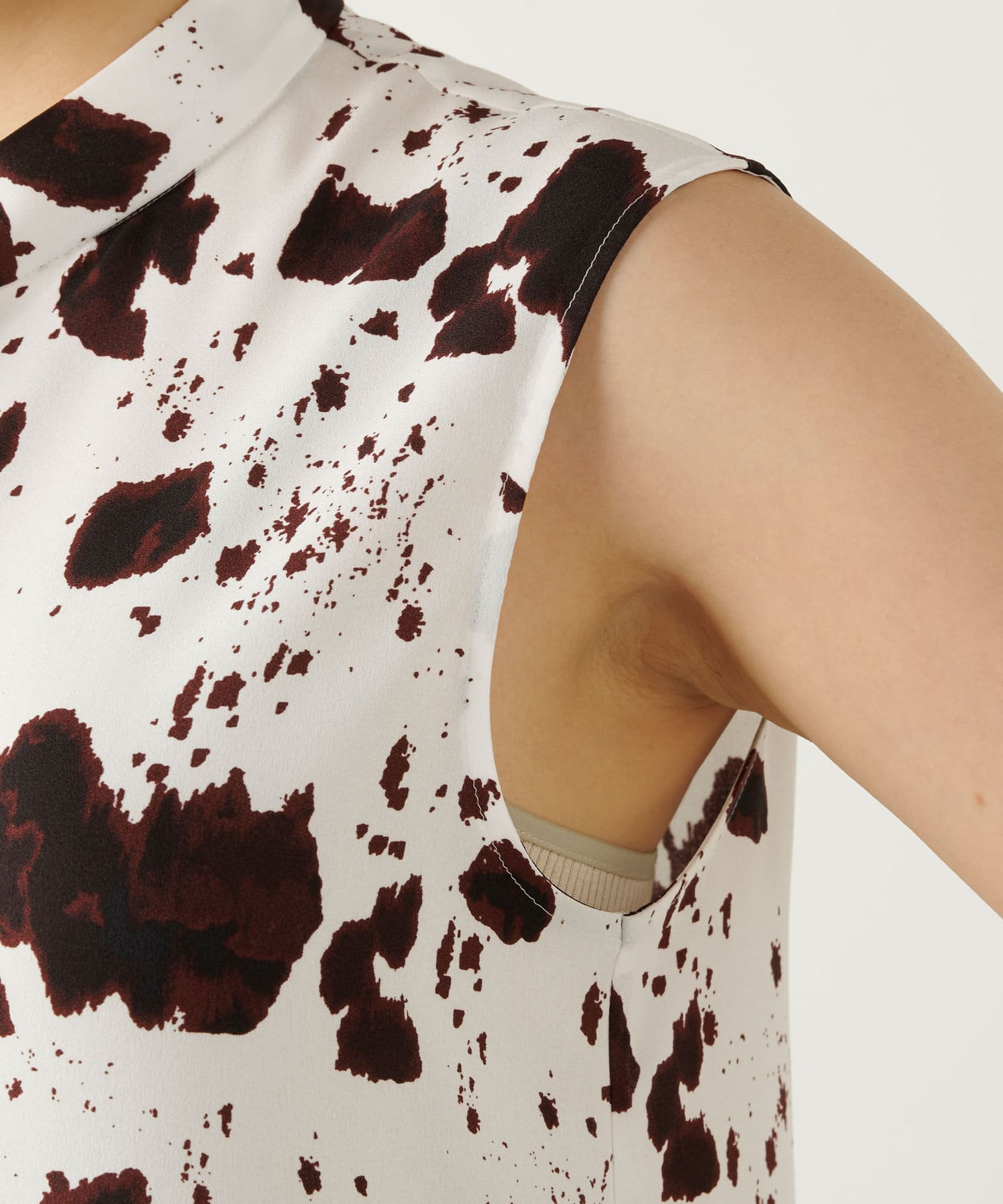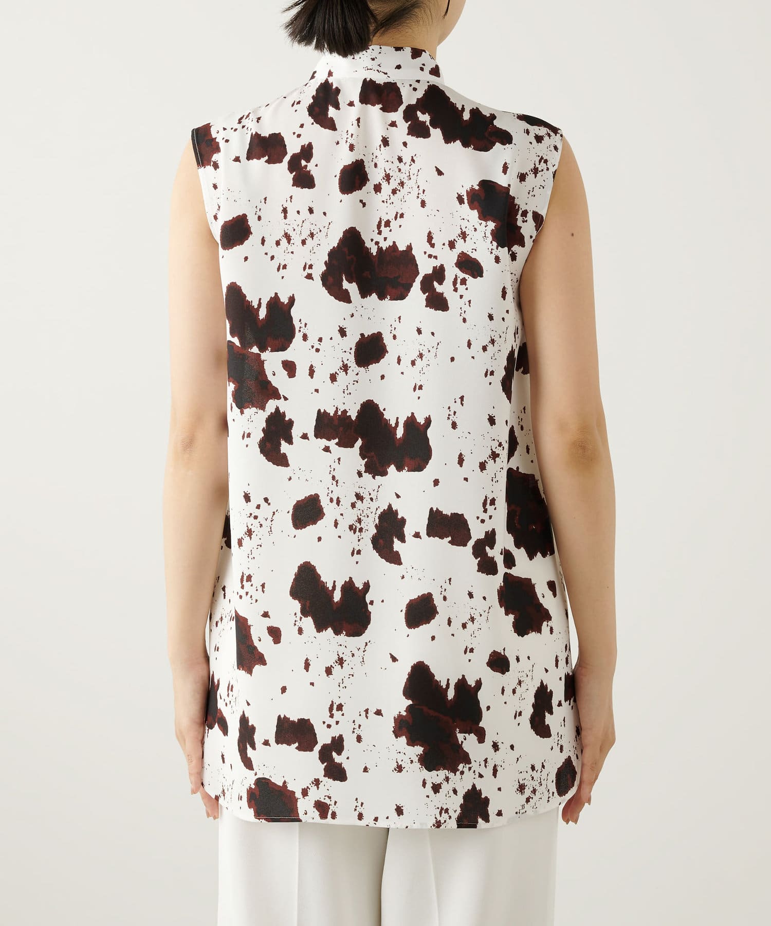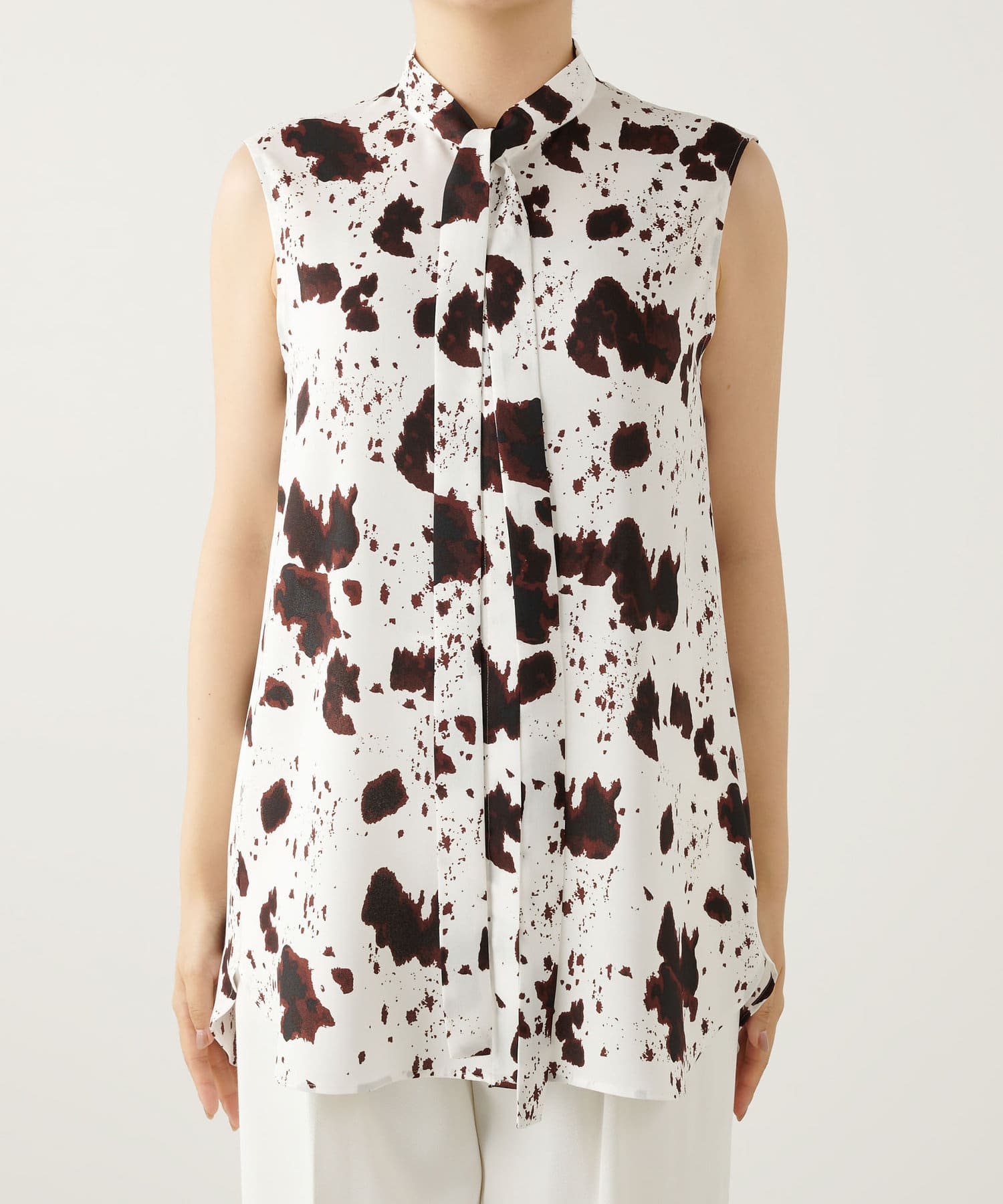 ■牛柄のプリントが目を惹くノースリーブのボータイブラウス。