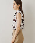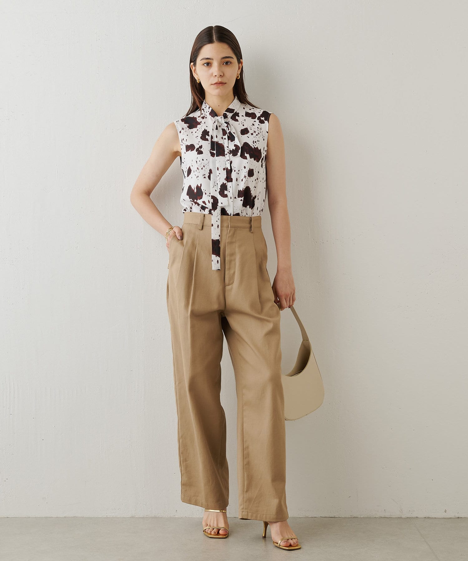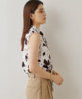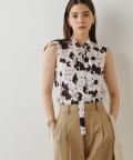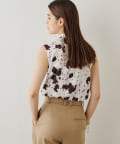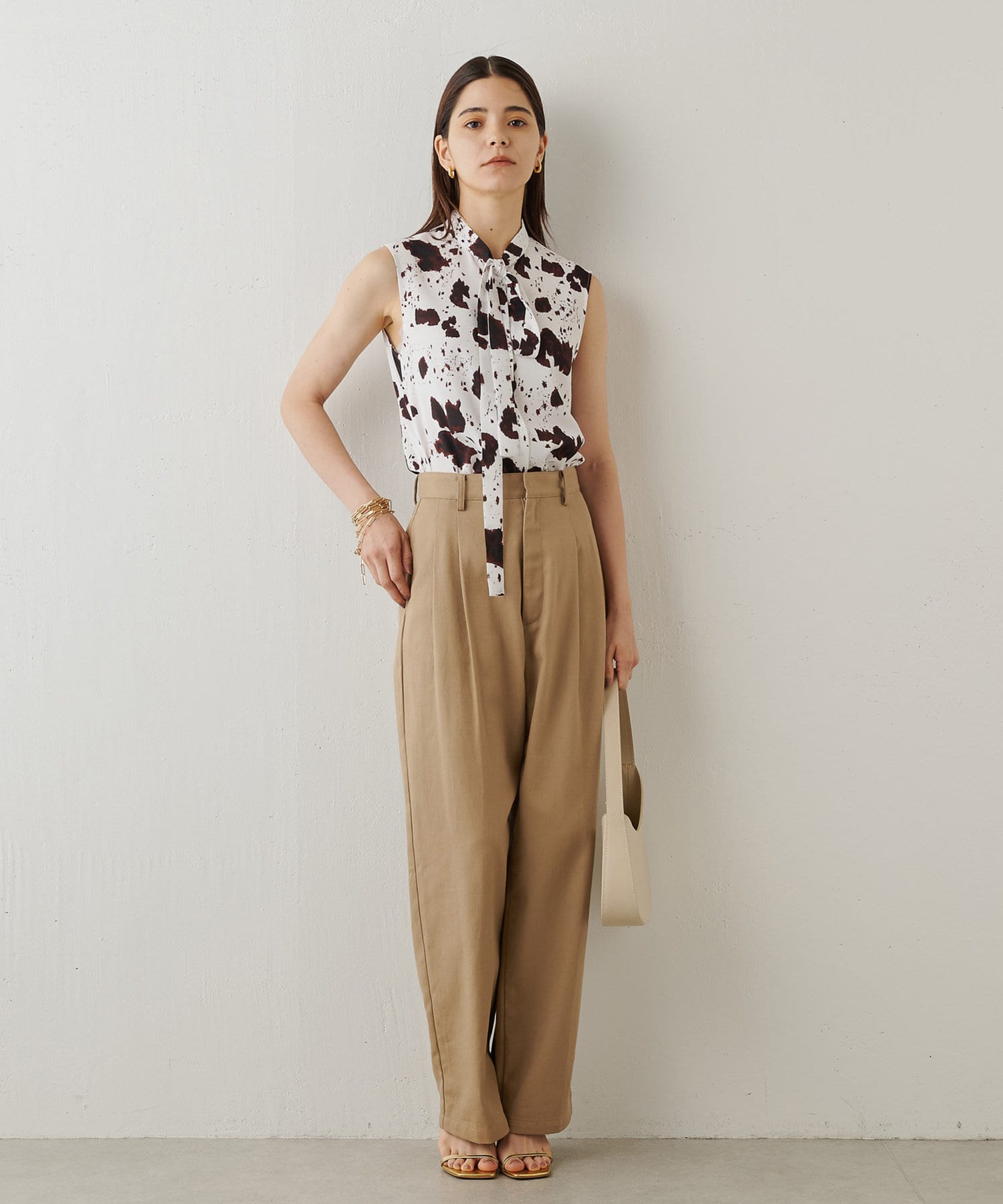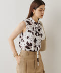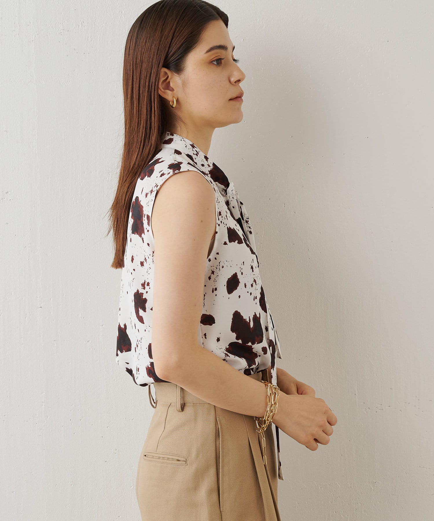 ■牛柄のプリントが目を惹くノースリーブのボータイブラウス。