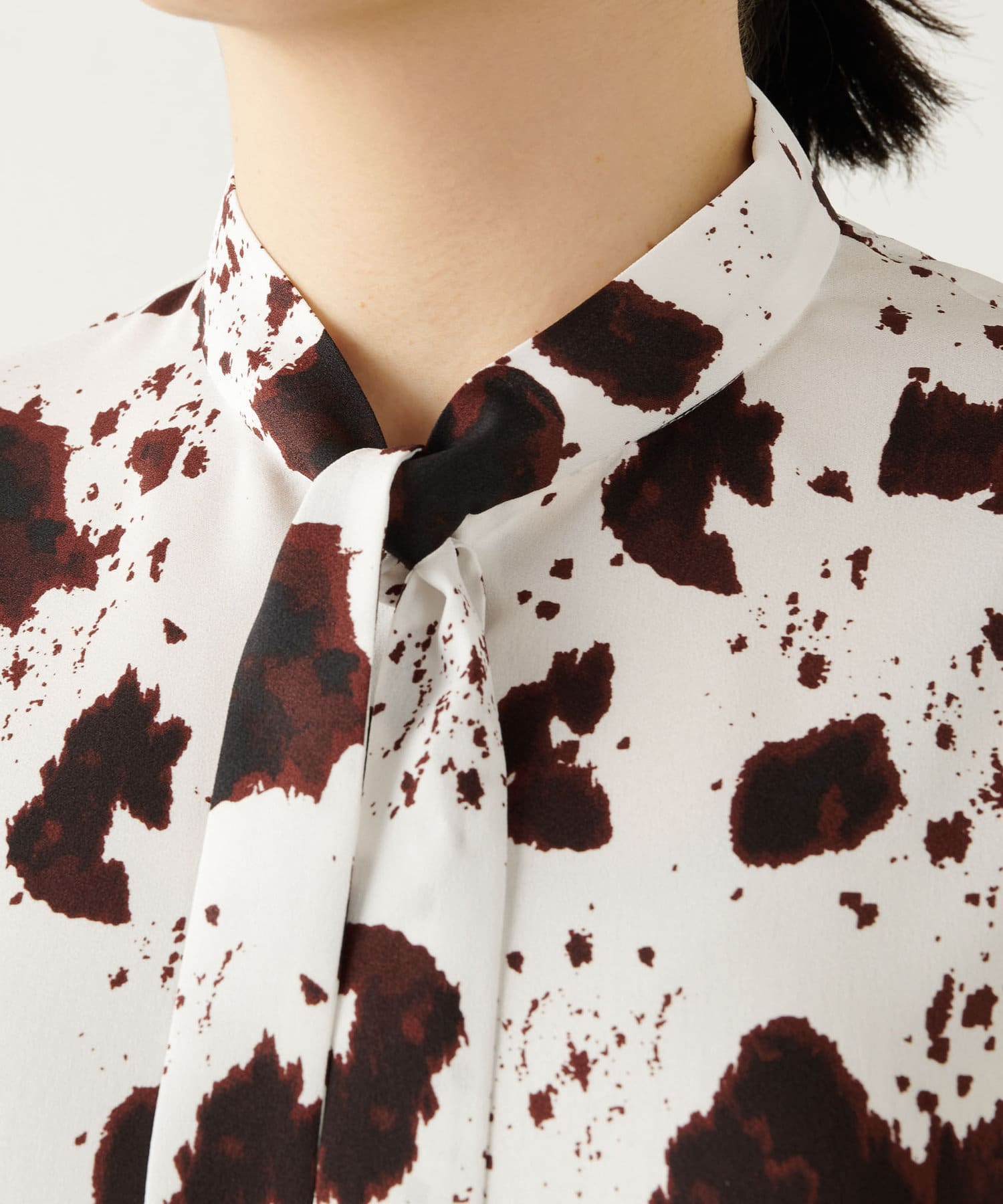 デザインが他には無いブラウス。カジュアル感のある絵柄ですが、長めのタイと、ツルっとした素材が上品です。ジャケットのインナーにもおすすめです。