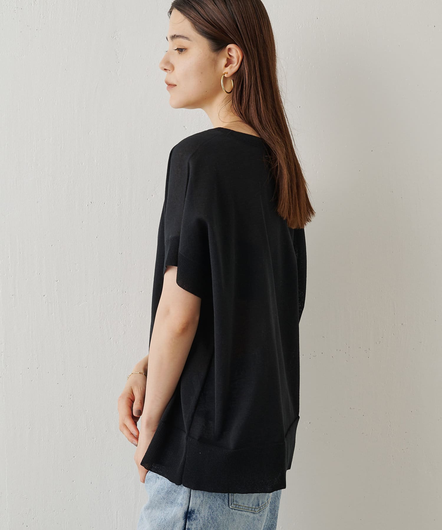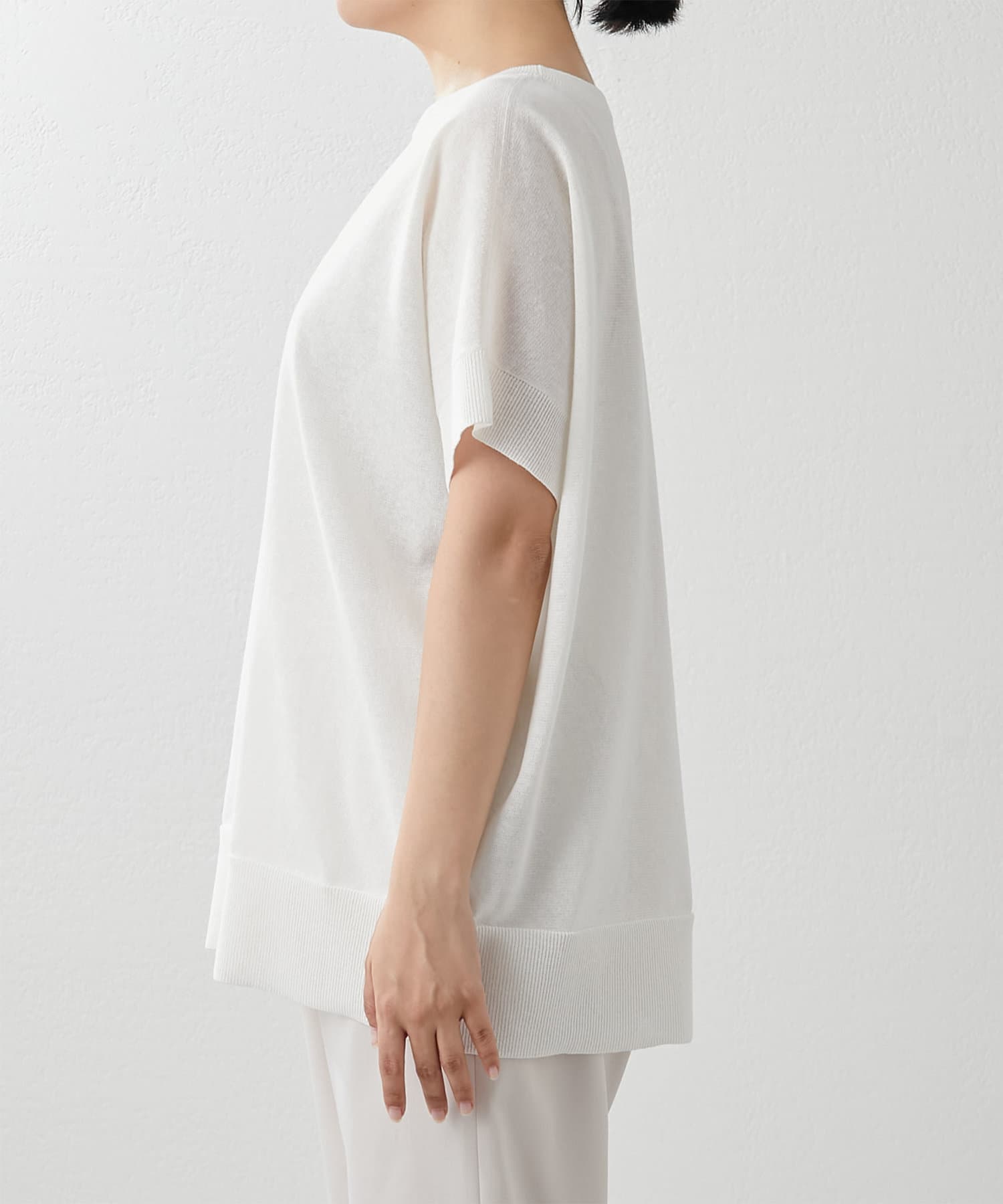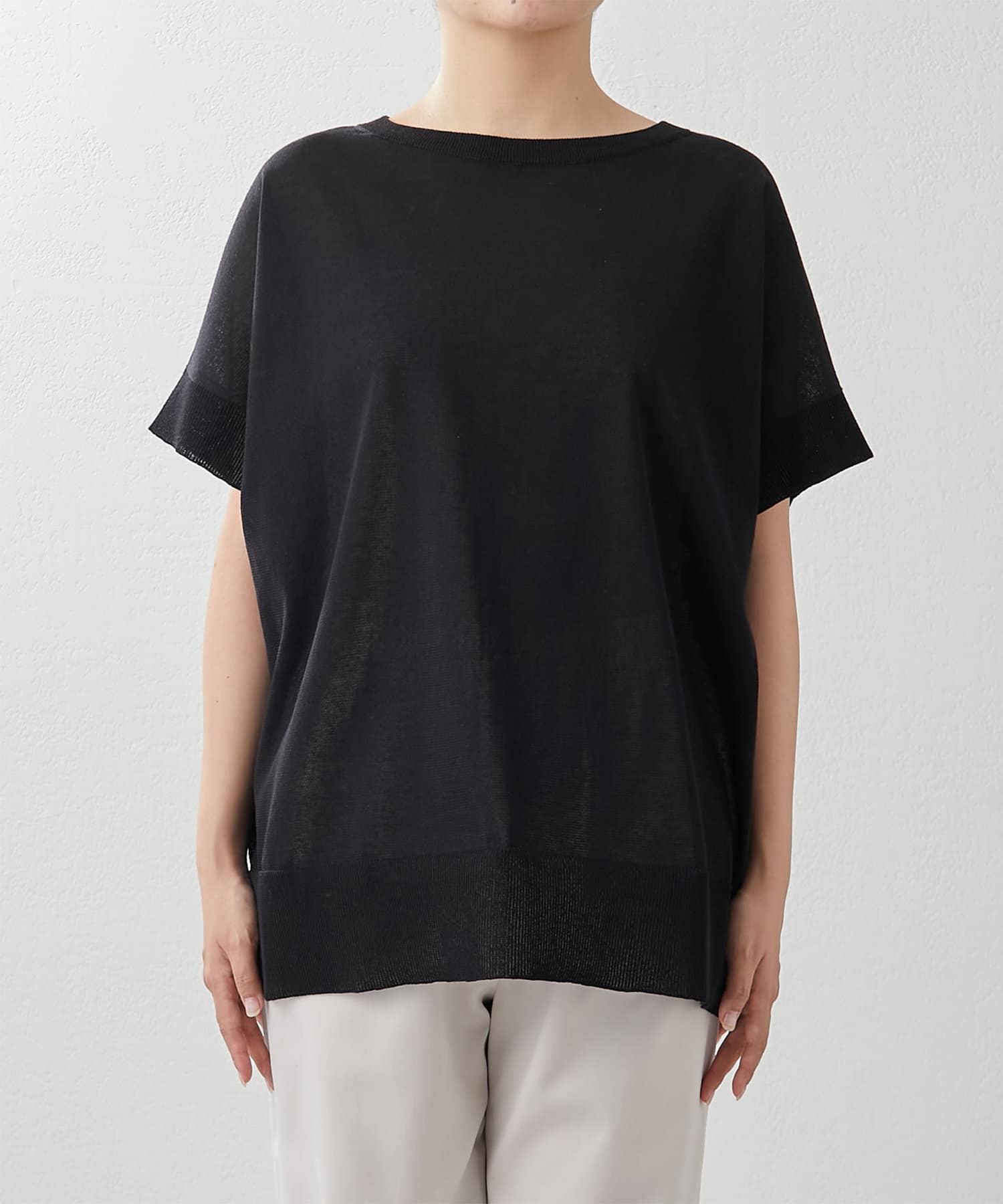 程よく透け感があり夏に涼しいプルオーバー。半袖なので、気になる二の腕をカバーできる嬉しい1枚です。丈感もヒップまで隠れるので、細身のボトムスとも相性抜群です。