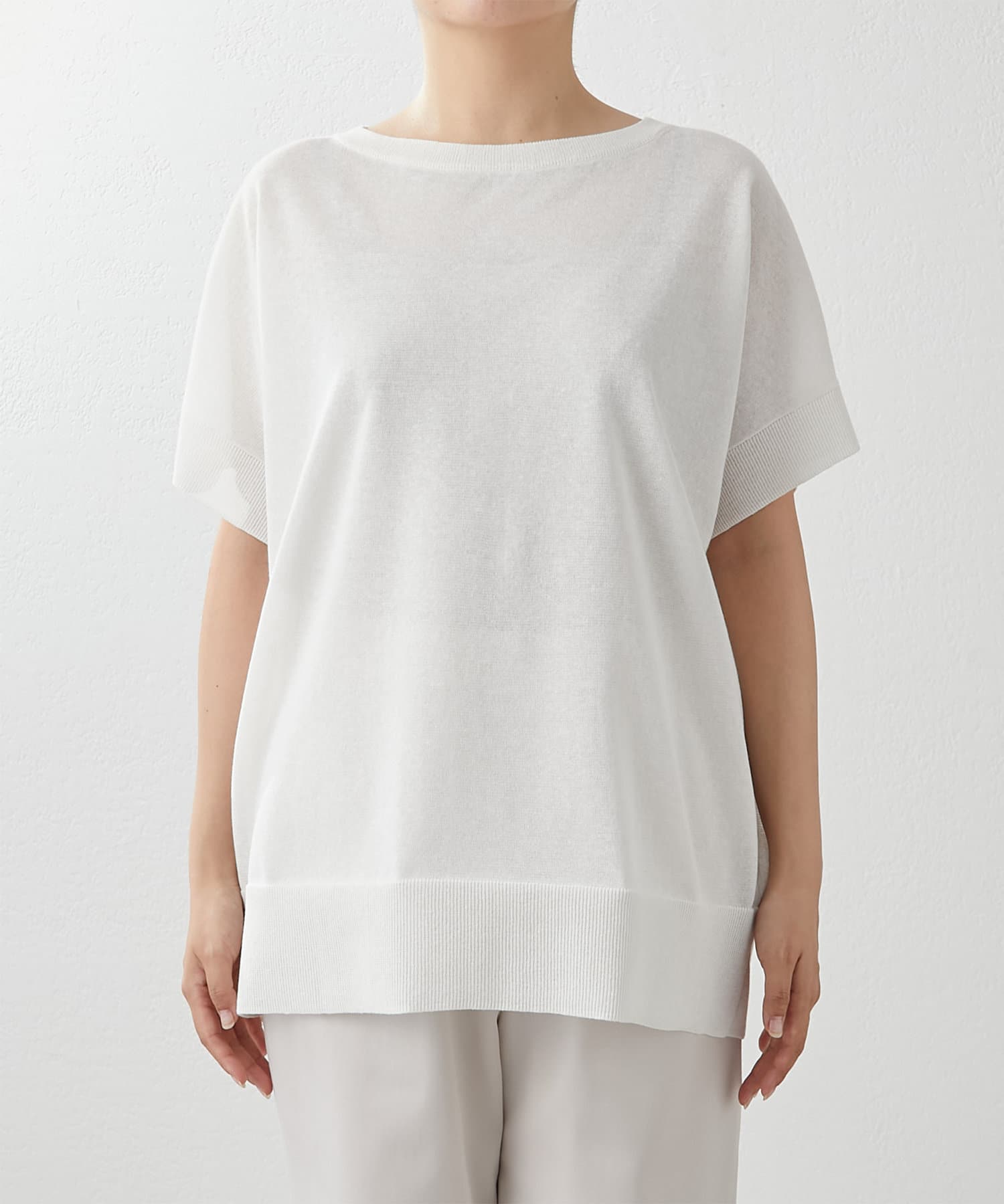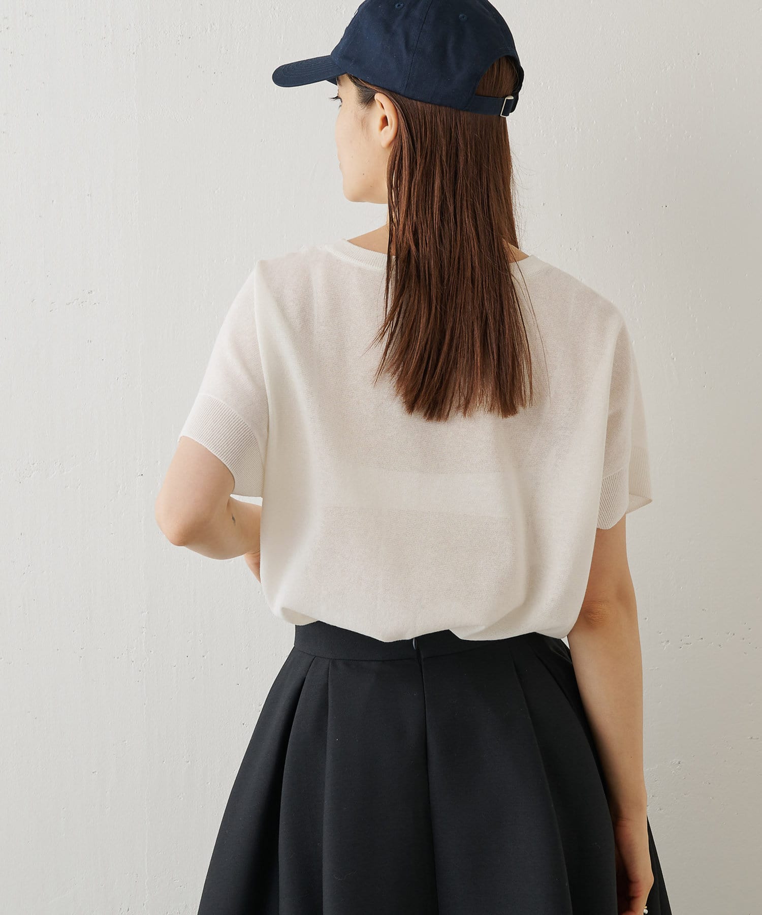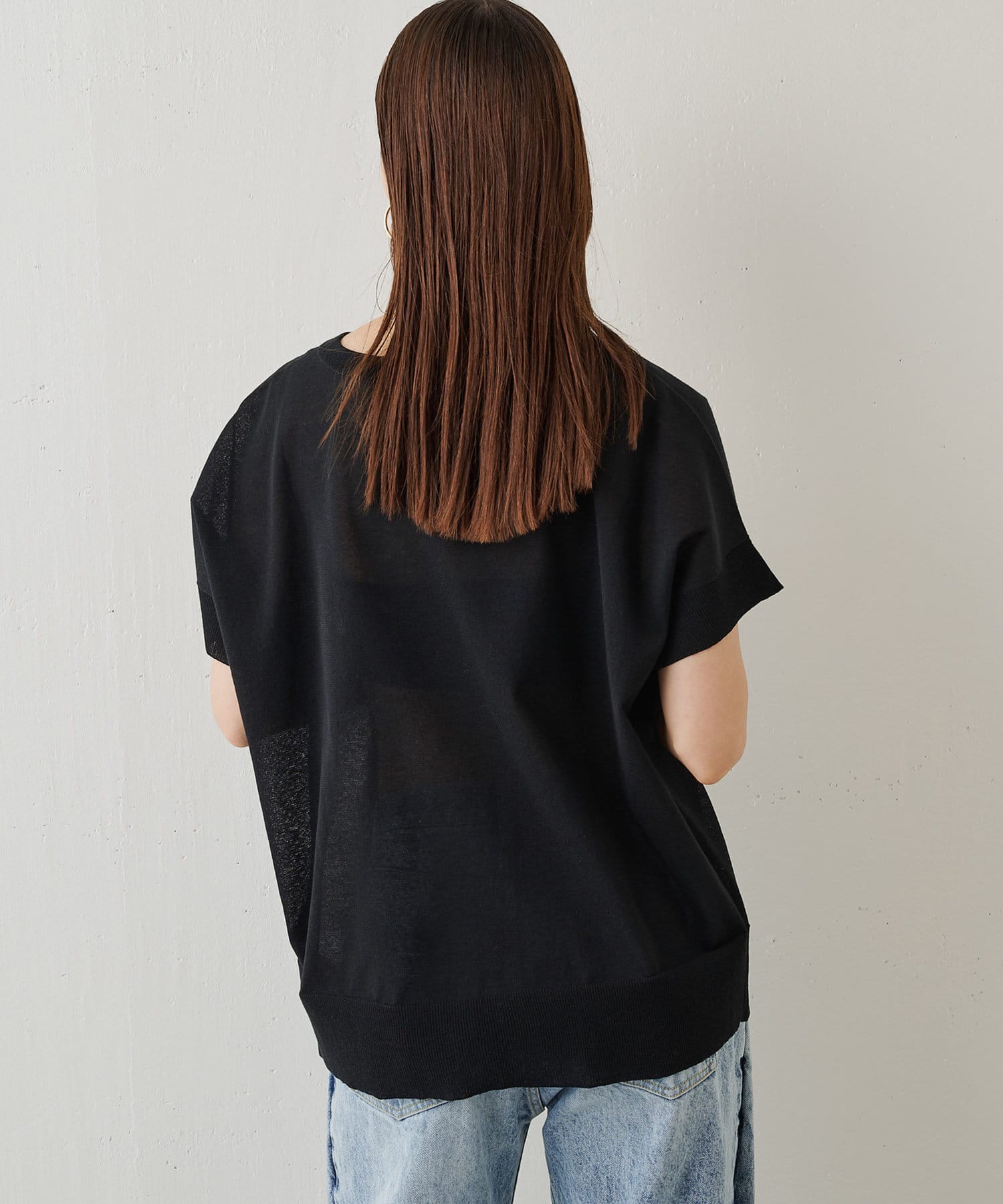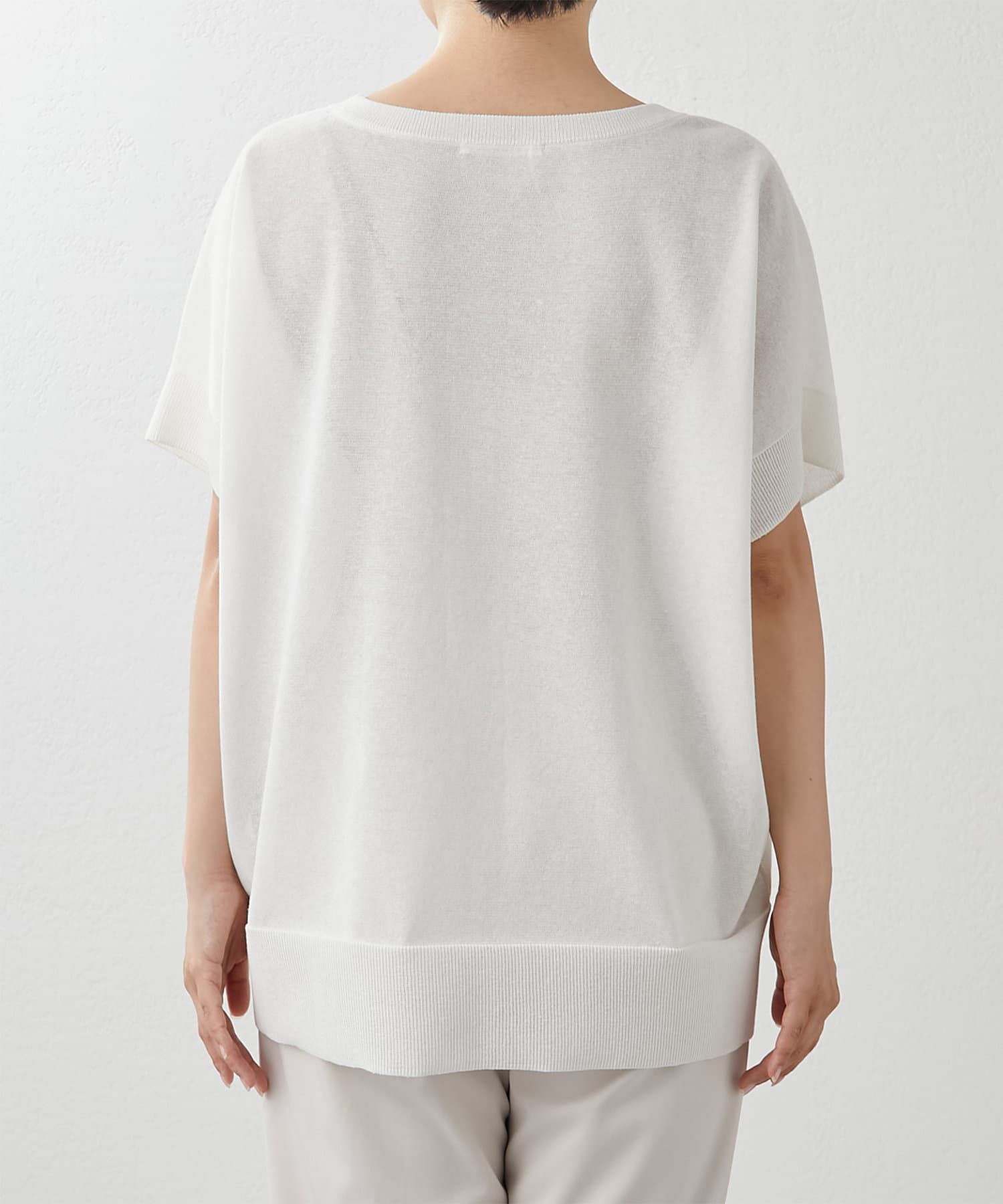 程よく透け感があり夏に涼しいプルオーバー。半袖なので、気になる二の腕をカバーできる嬉しい1枚です。丈感もヒップまで隠れるので、細身のボトムスとも相性抜群です。