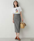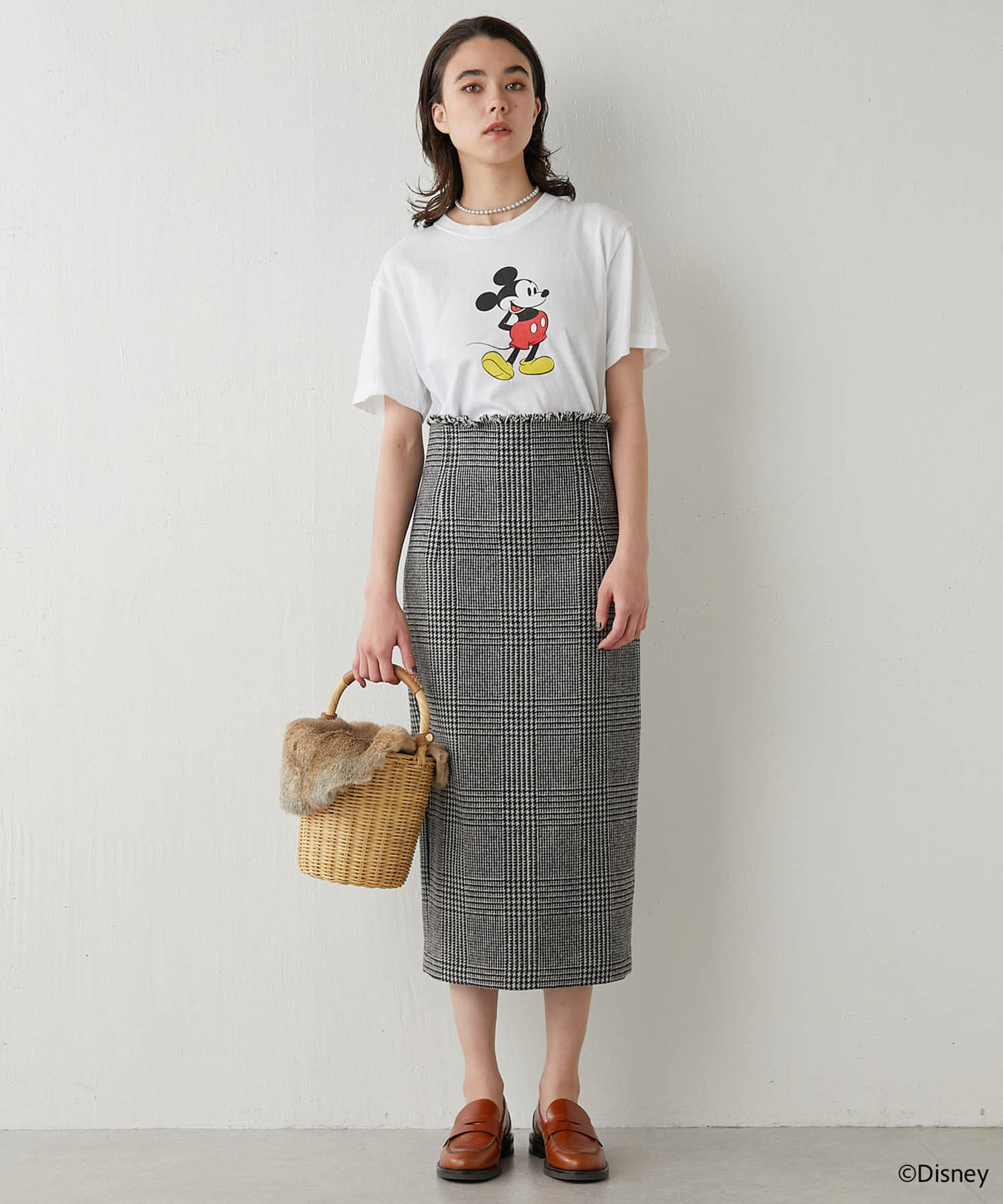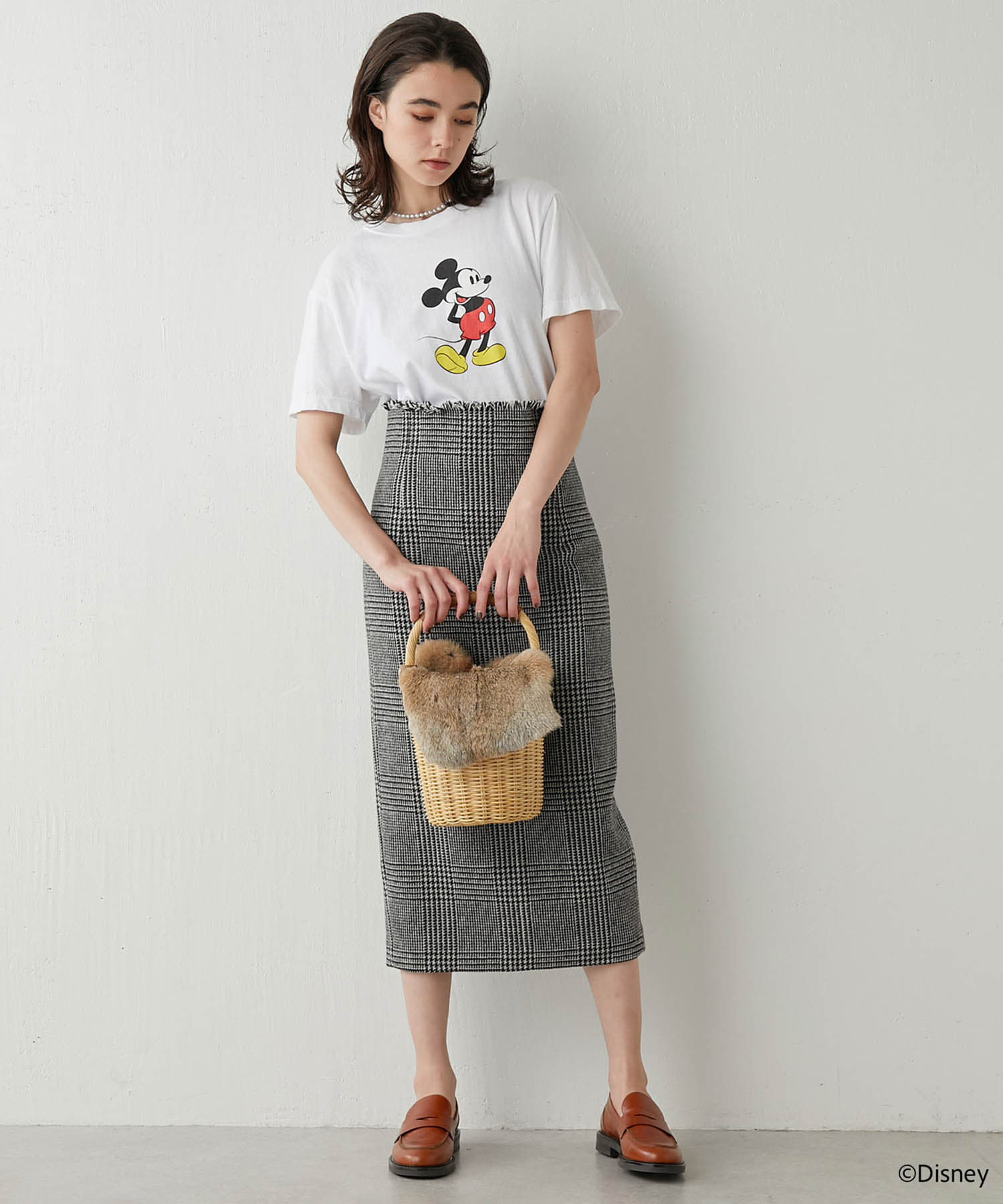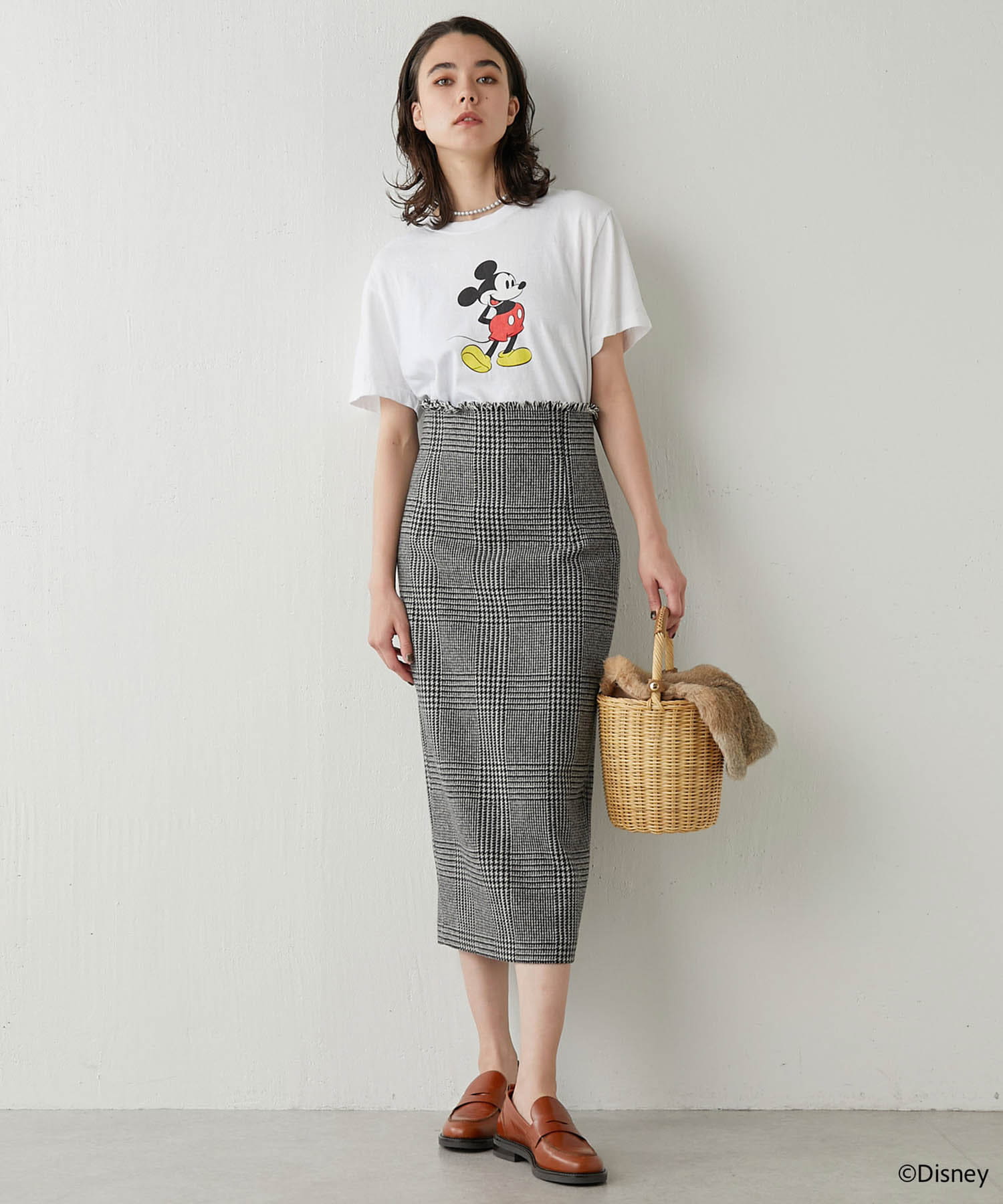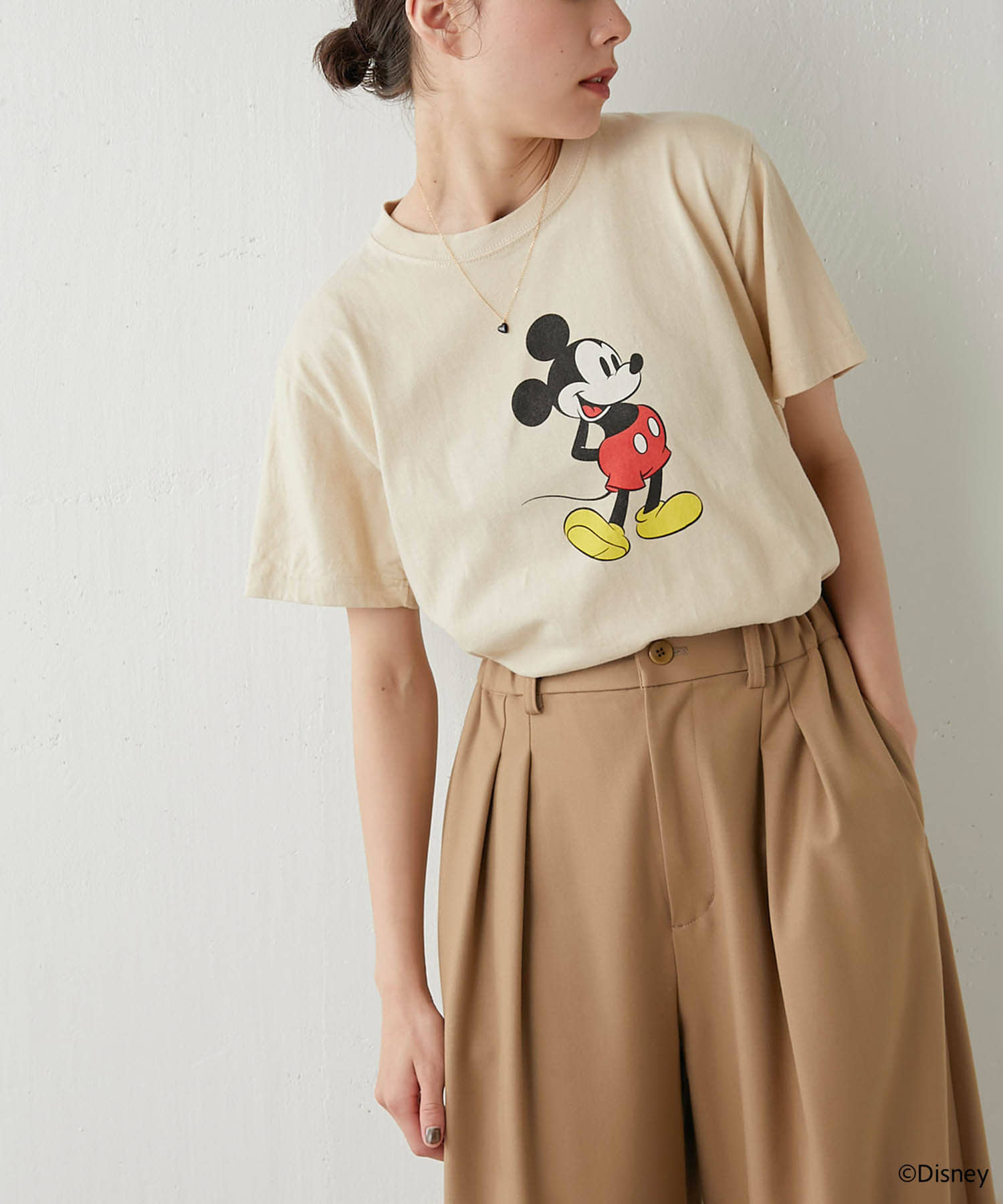 コーディネートのポイントになるミッキーTシャツ。短過ぎない丈感で、大人の女性に嬉しいサイズ感。シルエットも大き過ぎず小さ過ぎず、程よいので使いやすいです。肌のあたりも柔らかいですよ。