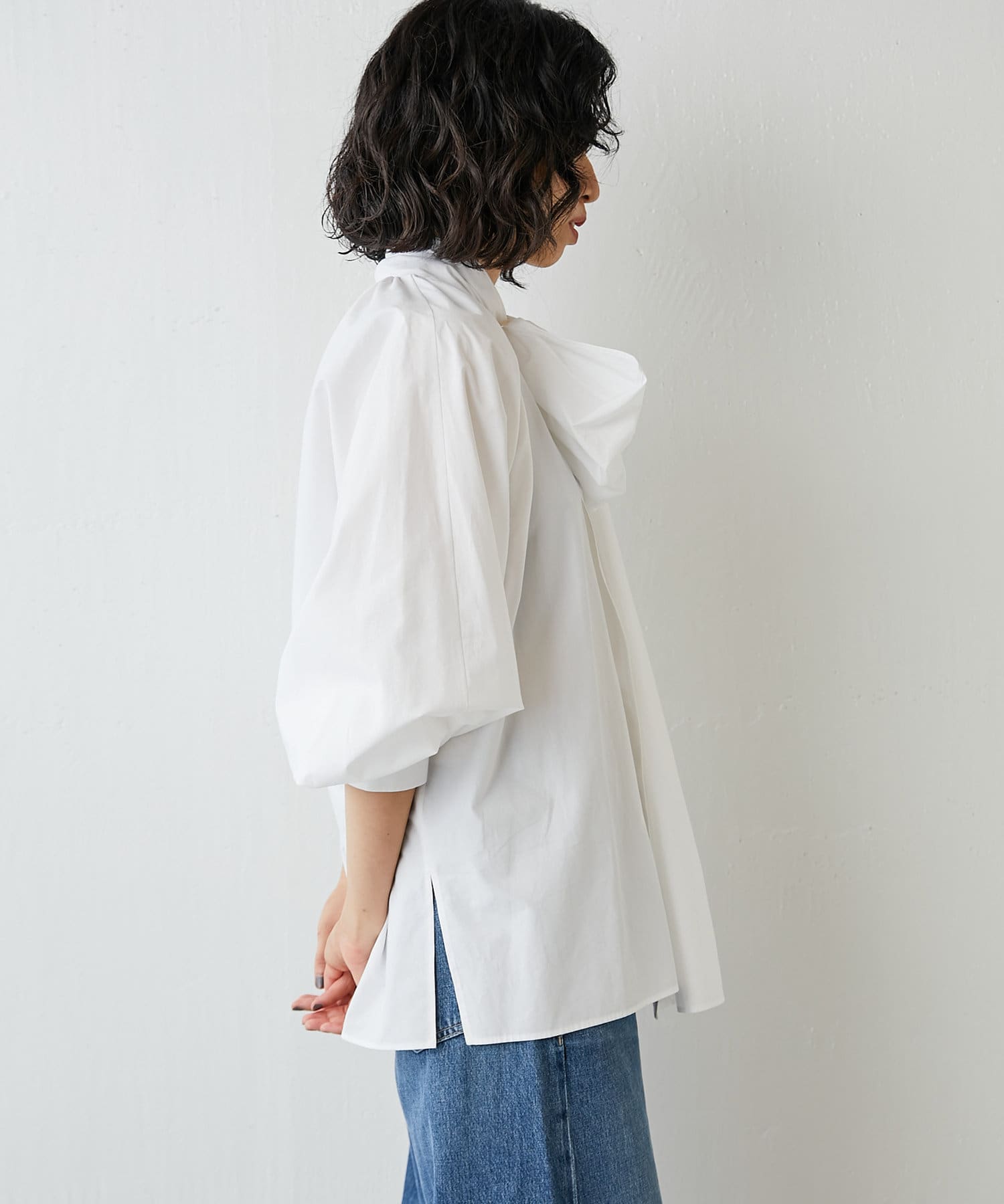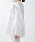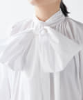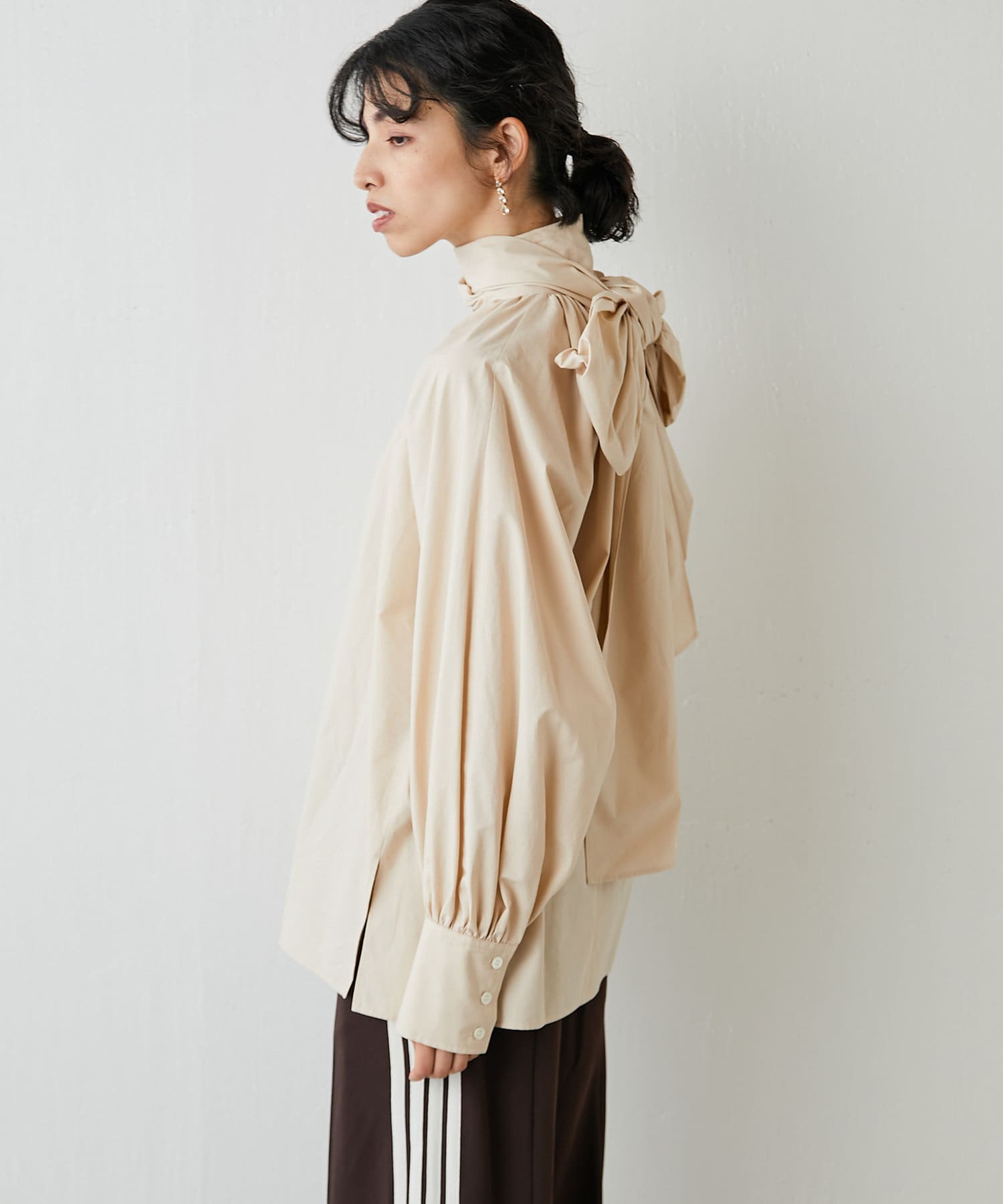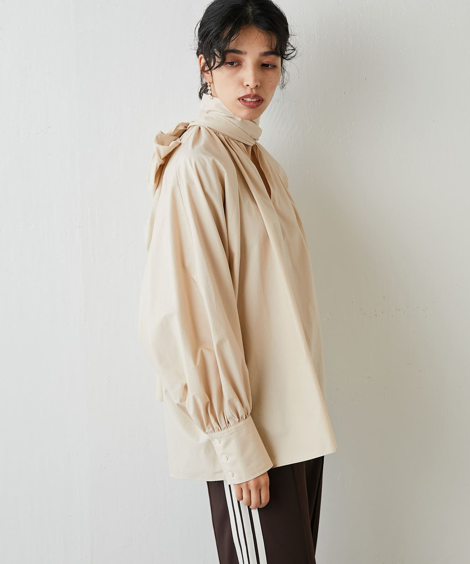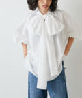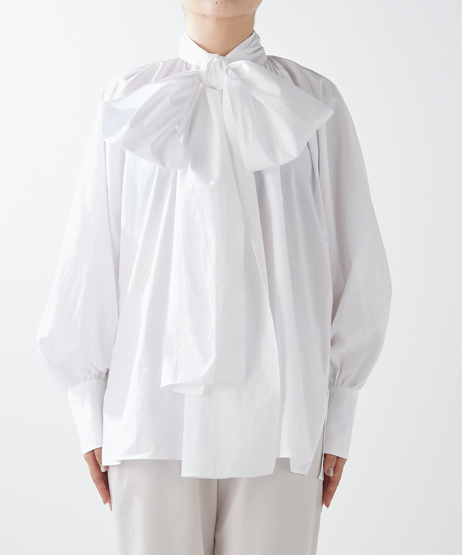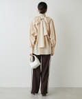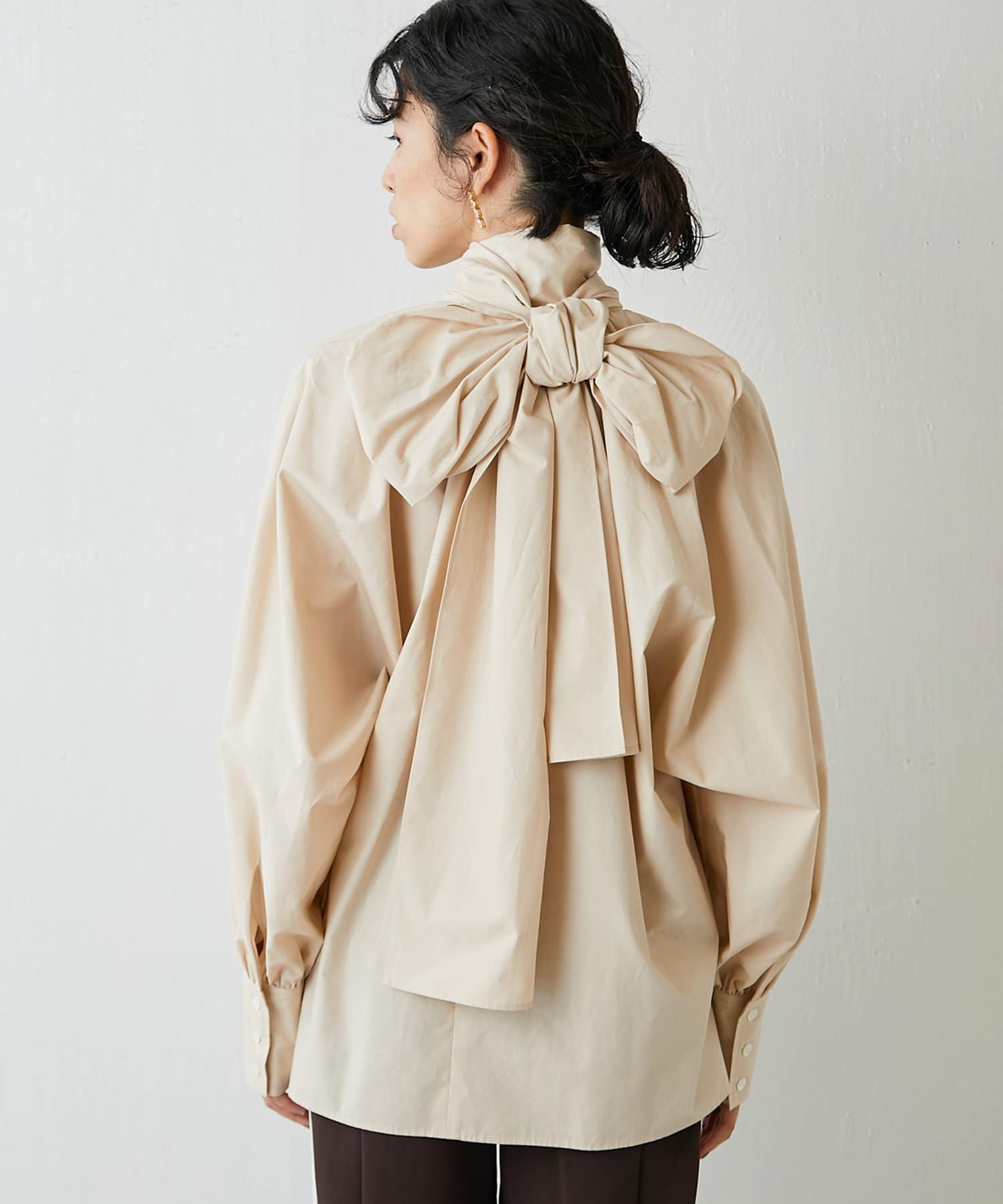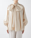 ボウタイのボリューム感が差をつけます。ハリとギャザーにより、シルエットがキープされ、着映える一枚。季節を問わず、投入できるのが嬉しいですよね。タイの結び方で雰囲気を変えられます。