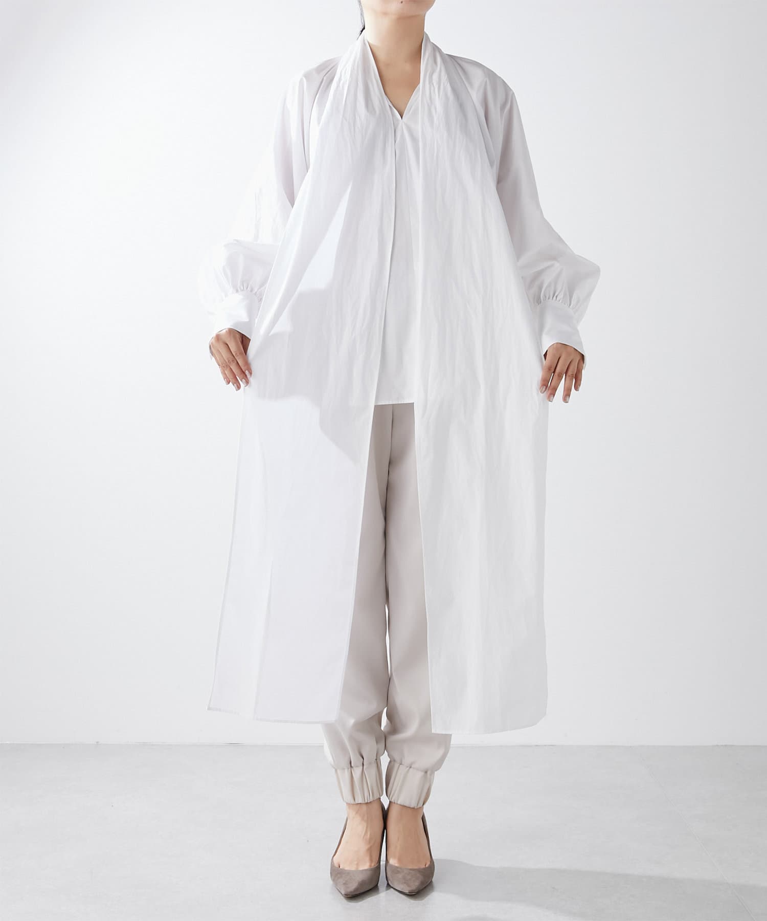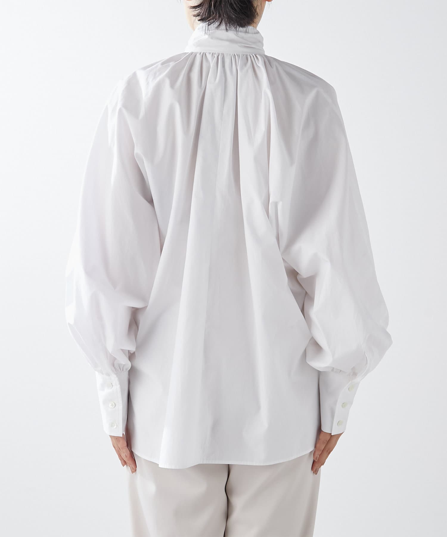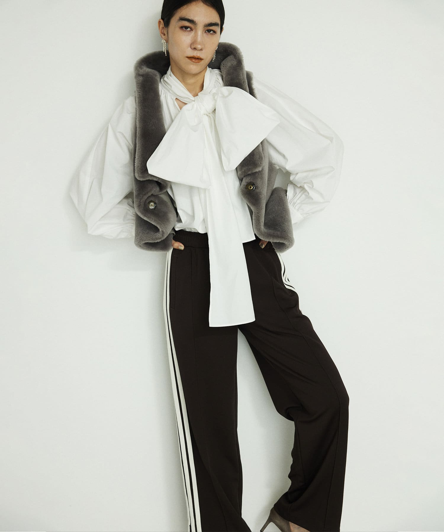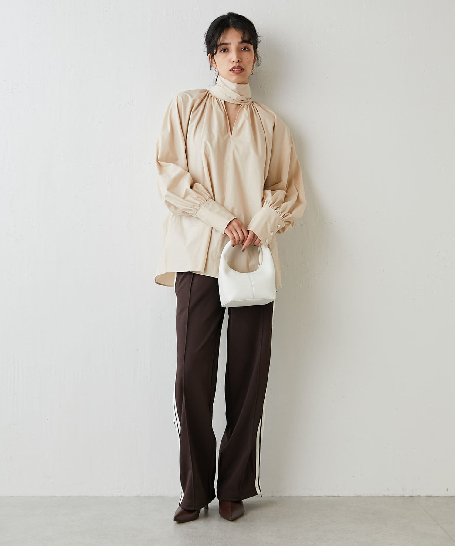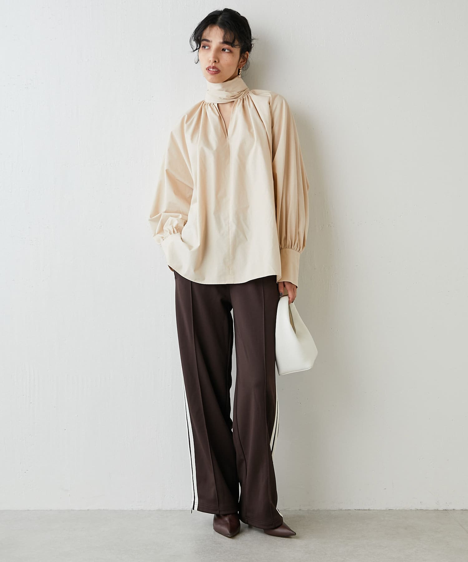 ボウタイのボリューム感が差をつけます。ハリとギャザーにより、シルエットがキープされ、着映える一枚。季節を問わず、投入できるのが嬉しいですよね。タイの結び方で雰囲気を変えられます。
