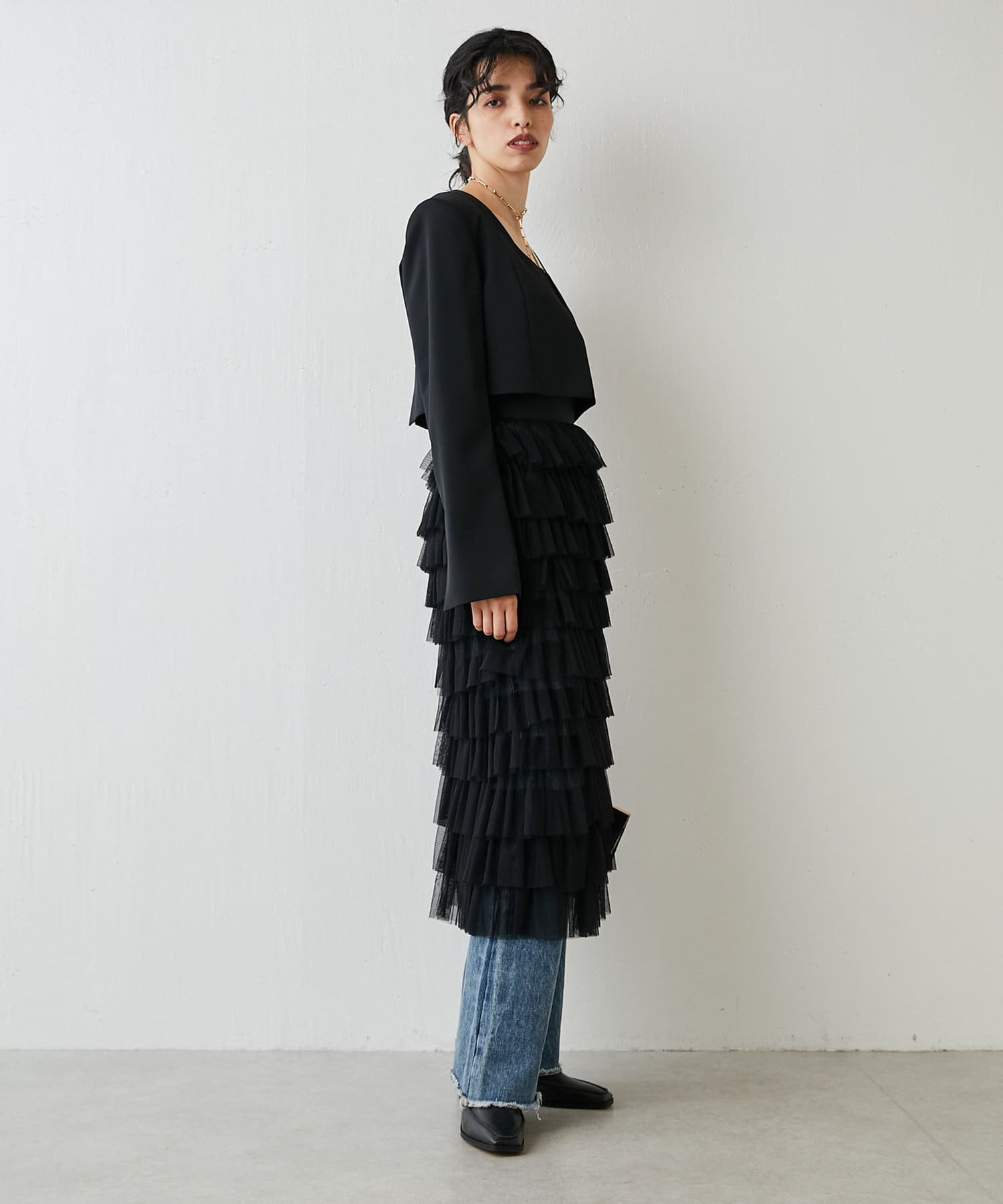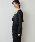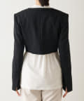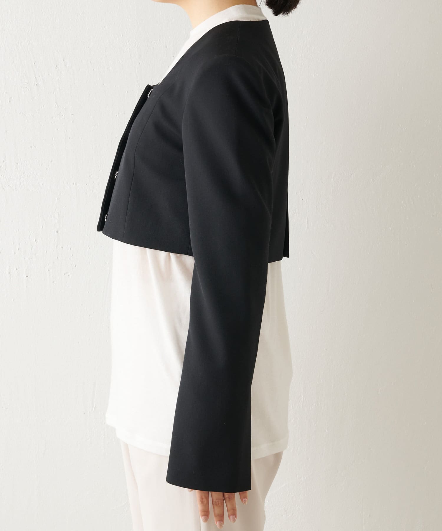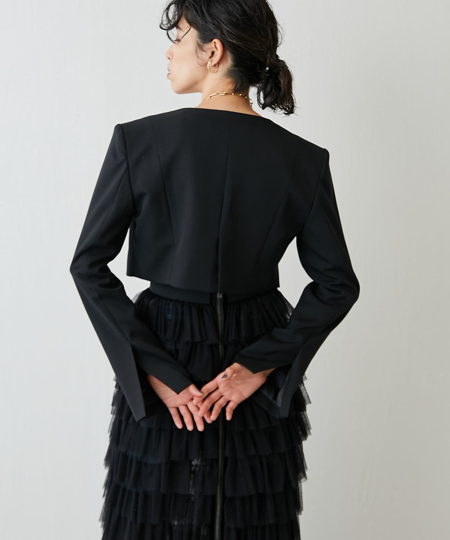 ショート丈がスタイルを良く見せてくれます。張りのある素材感とシルエットが美しいため羽織るだけできちんと見えします。イベントや結婚式の羽織にもおすすめです。ショート丈なのでロングのワンピースやサロペットなどと合わせるとバランスよく着こなせますよ。