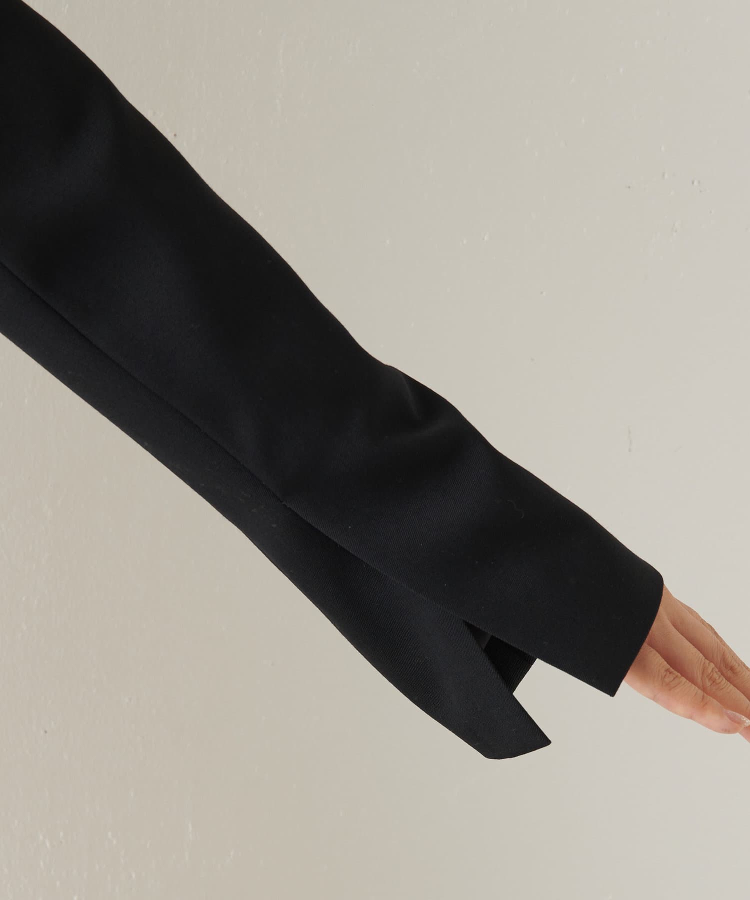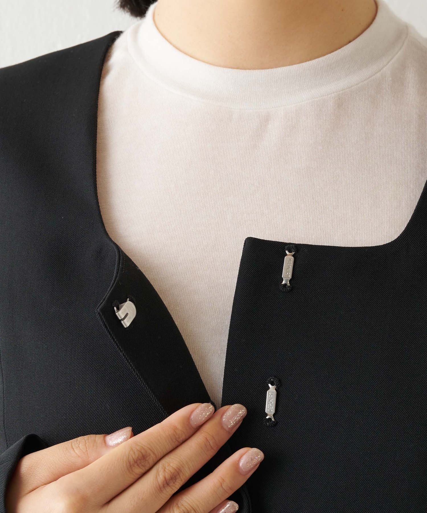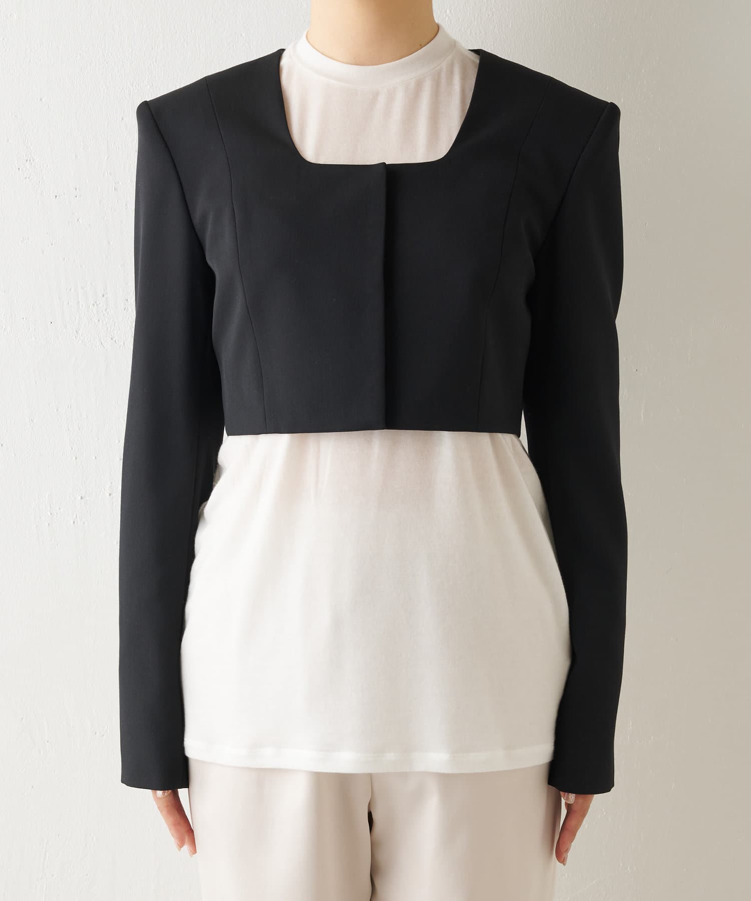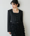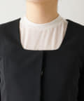 ■すっきりとしたスクエア開きのノーカラーデザインで、スタイリッシュな中にも女性らしさを感じる一着。